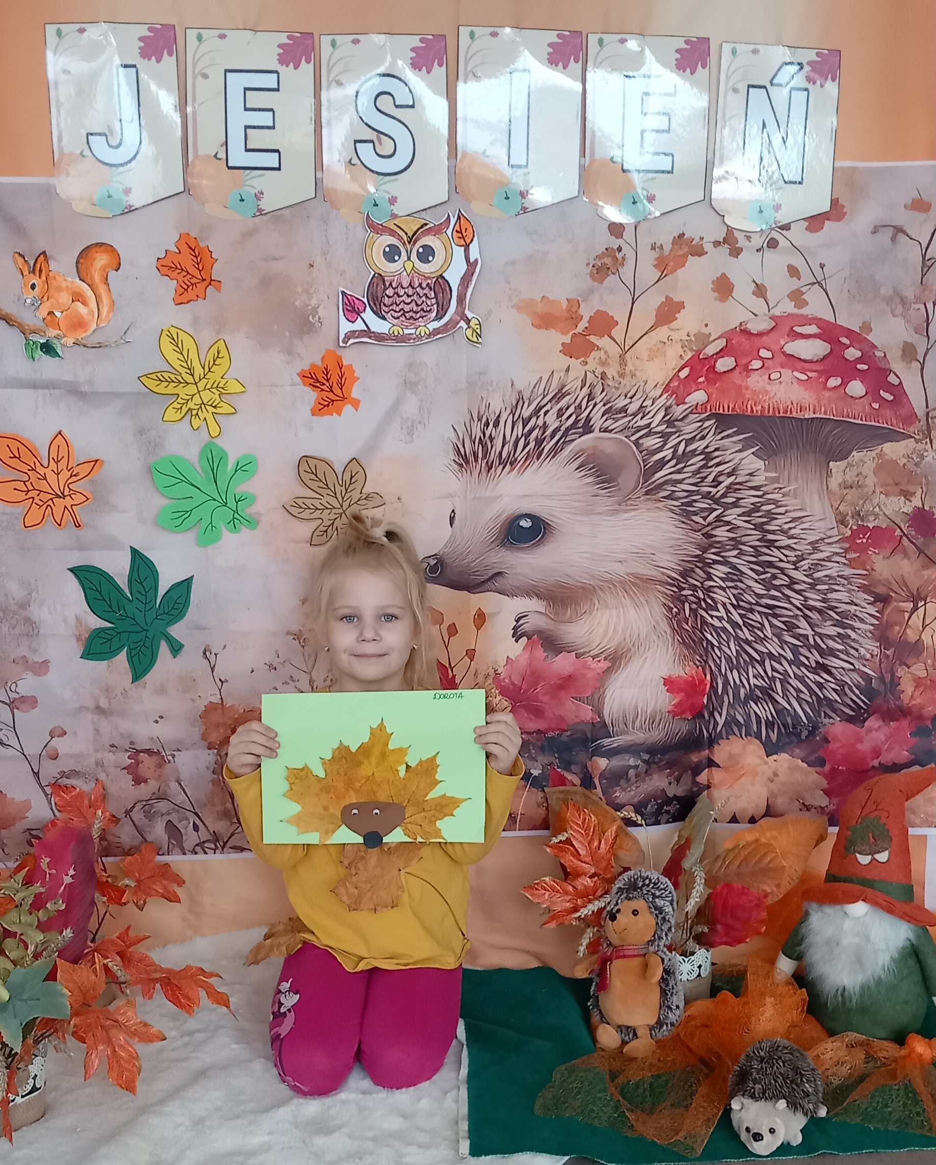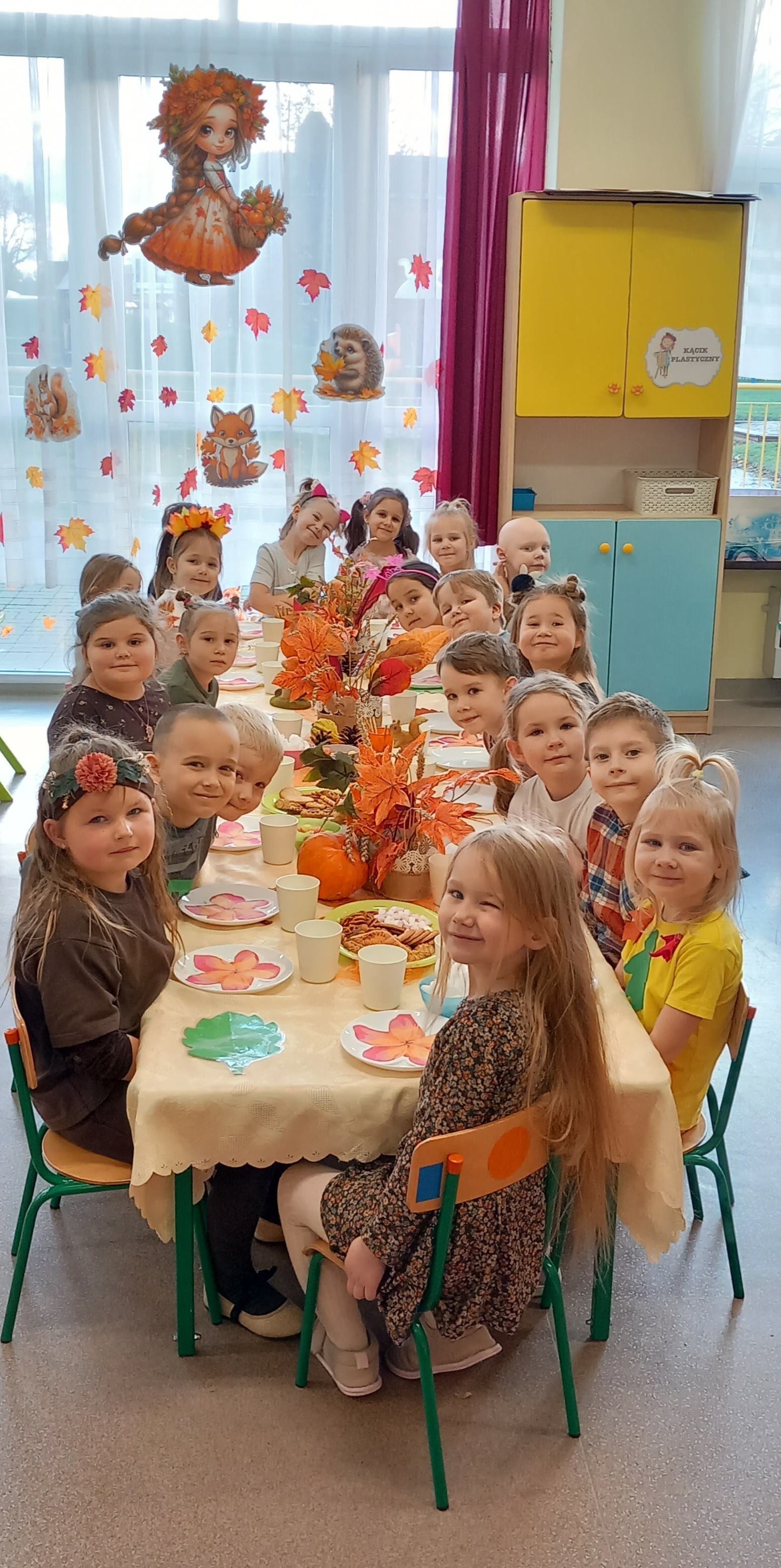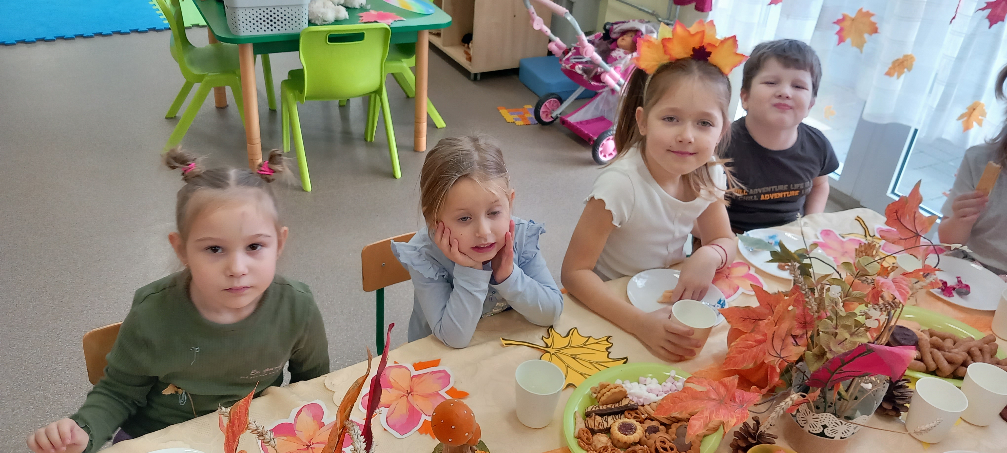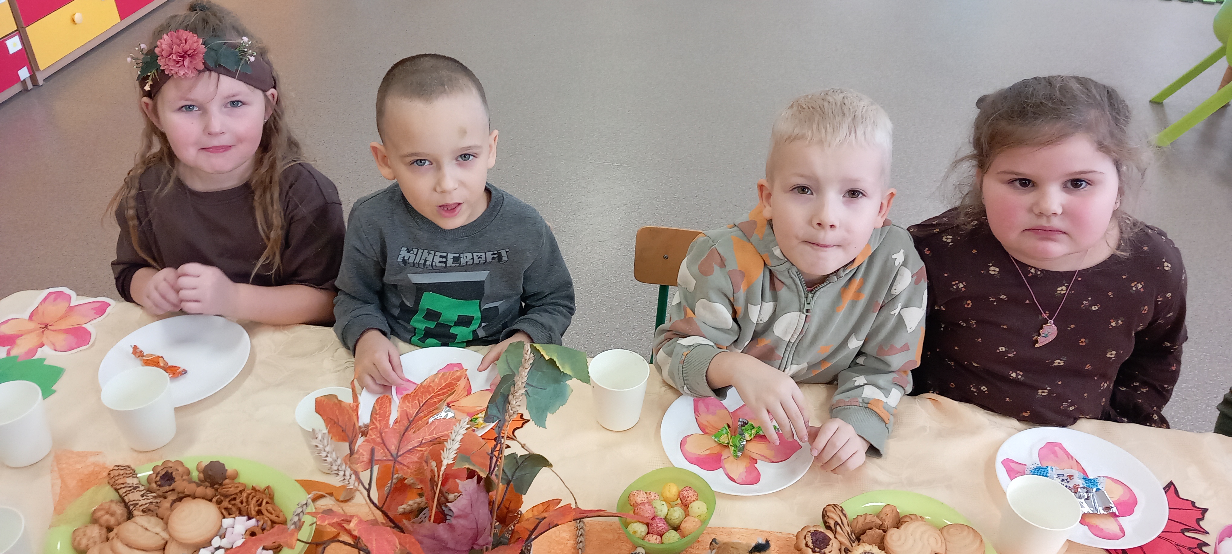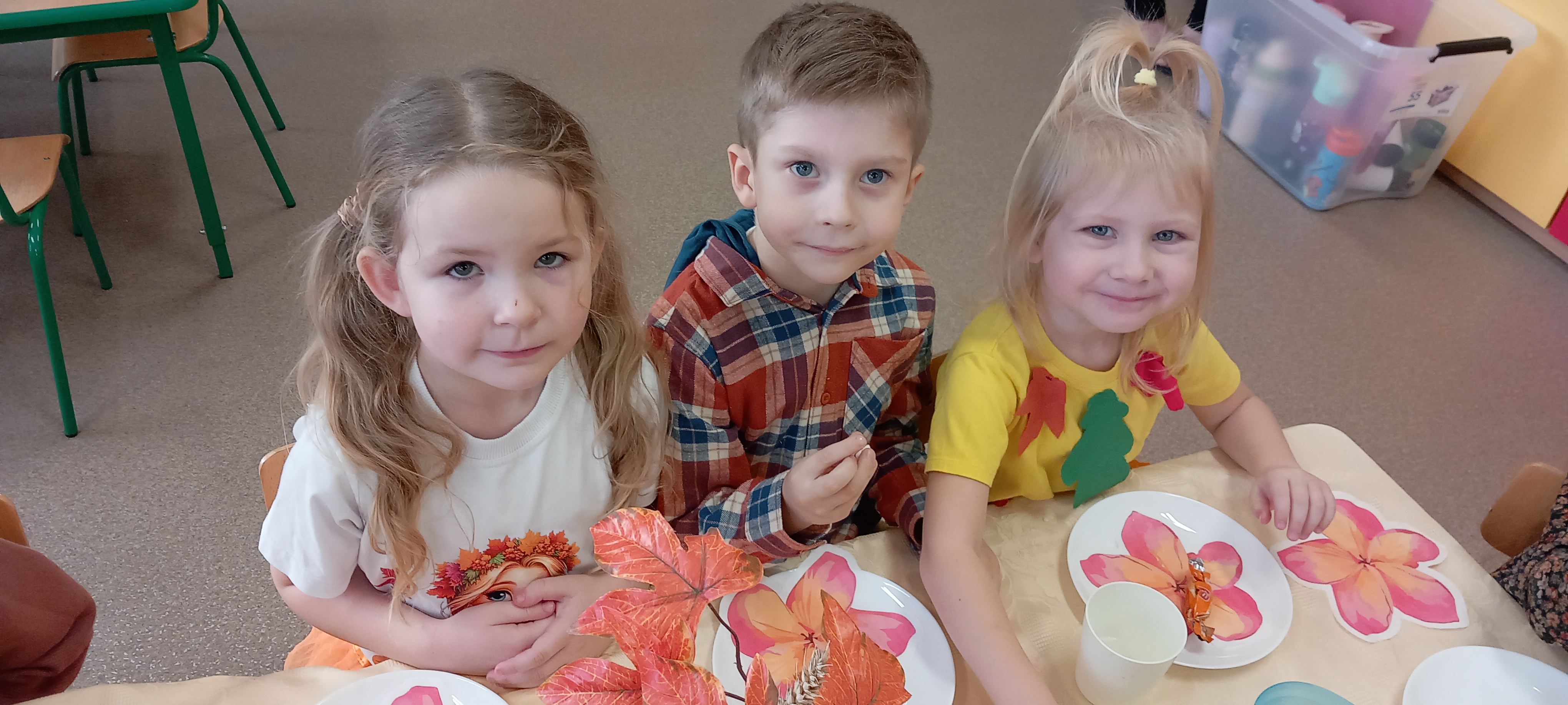 Wspólnie ułożyliśmy opowiadanie do historyjki obrazkowej ,,O tym jak krasnal się do zimy szykował ", były zabawy ruchowe, jesienna gimnastyka buzi i języka, konkursy, słodki poczęstunek oraz sesja zdjęciowa na pamiątkę.