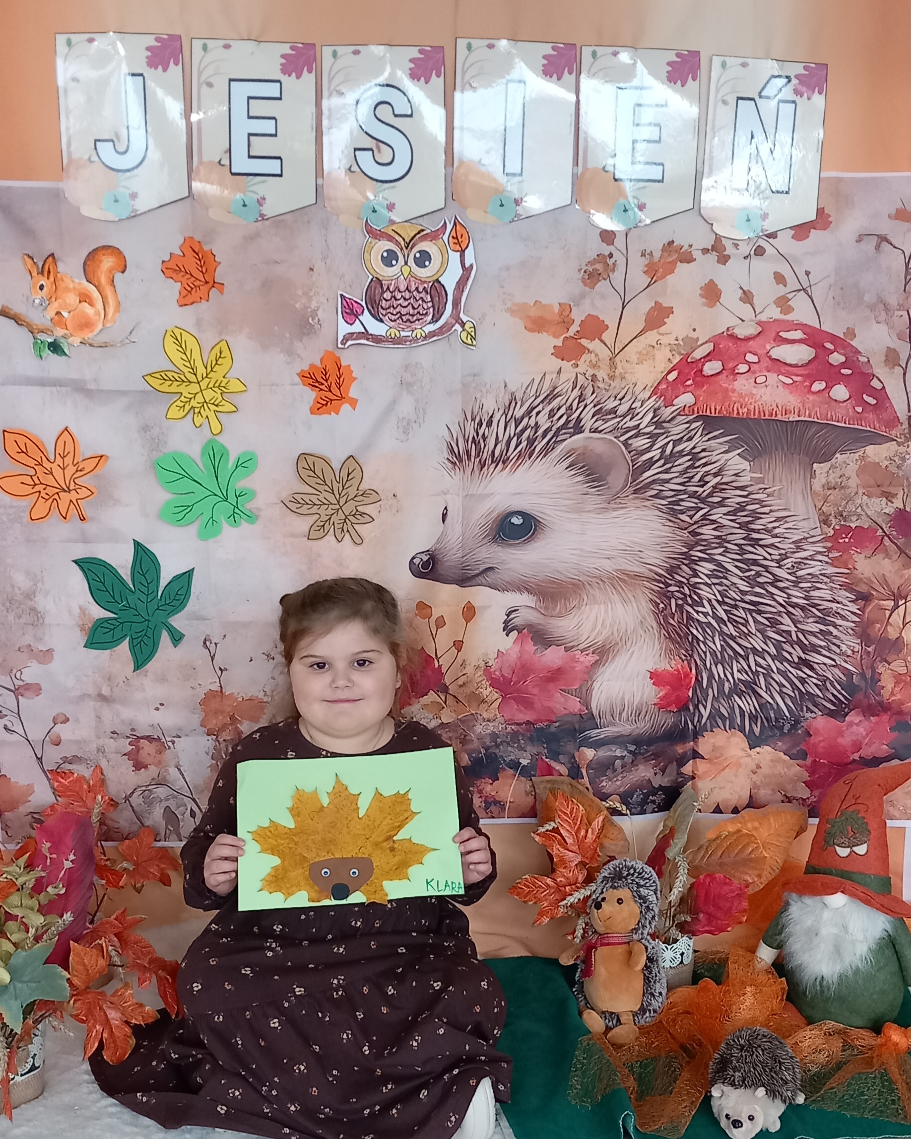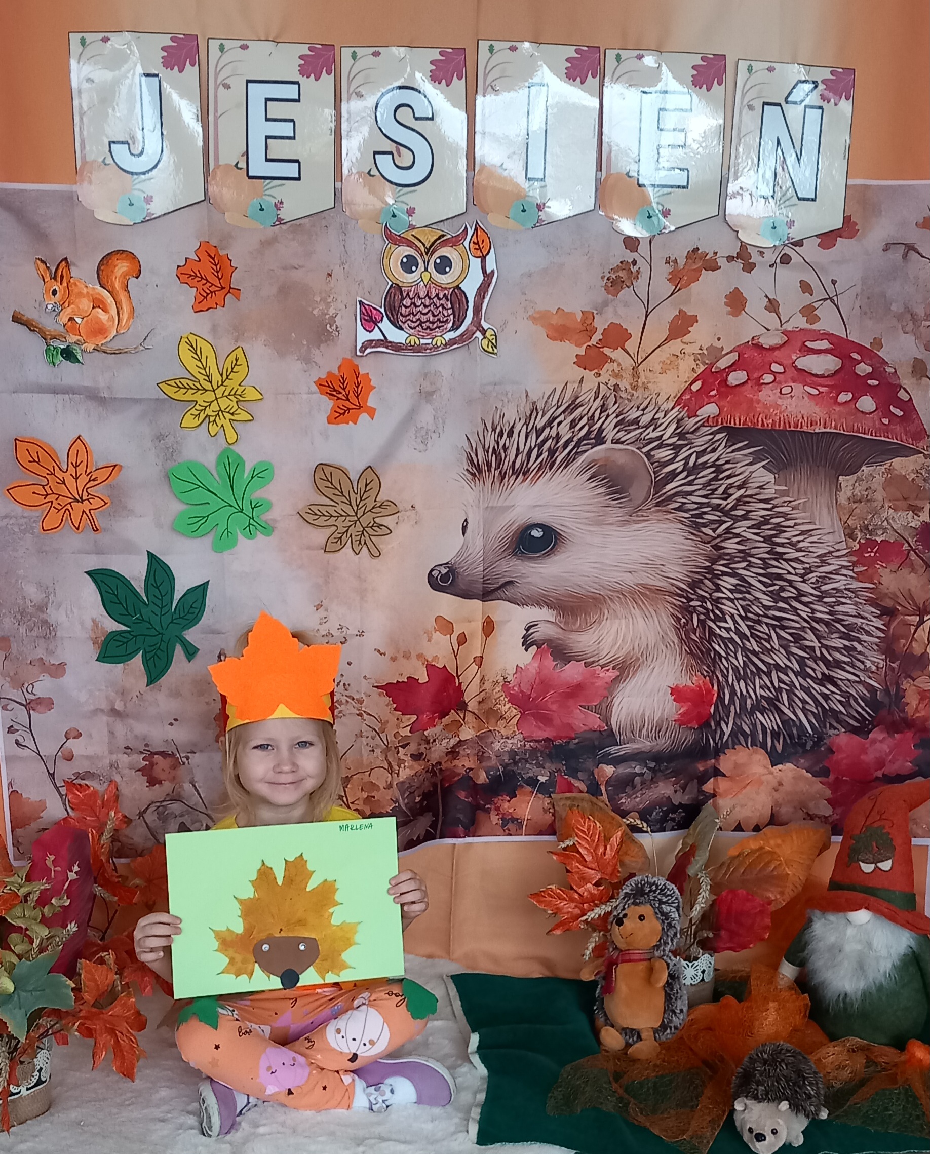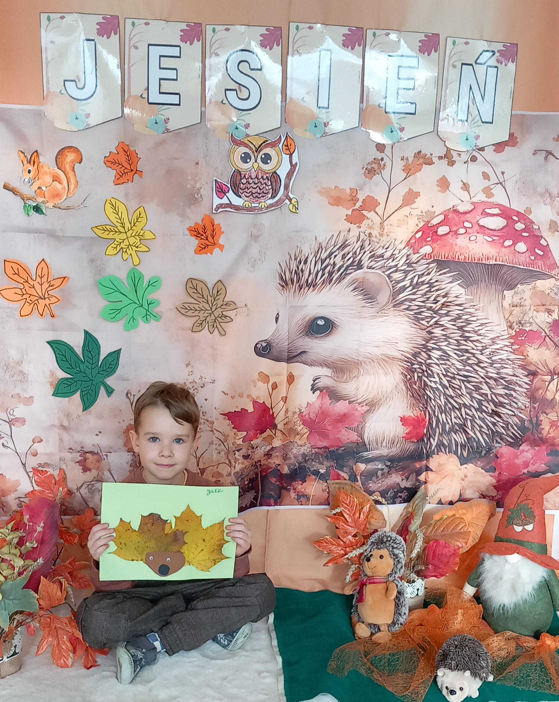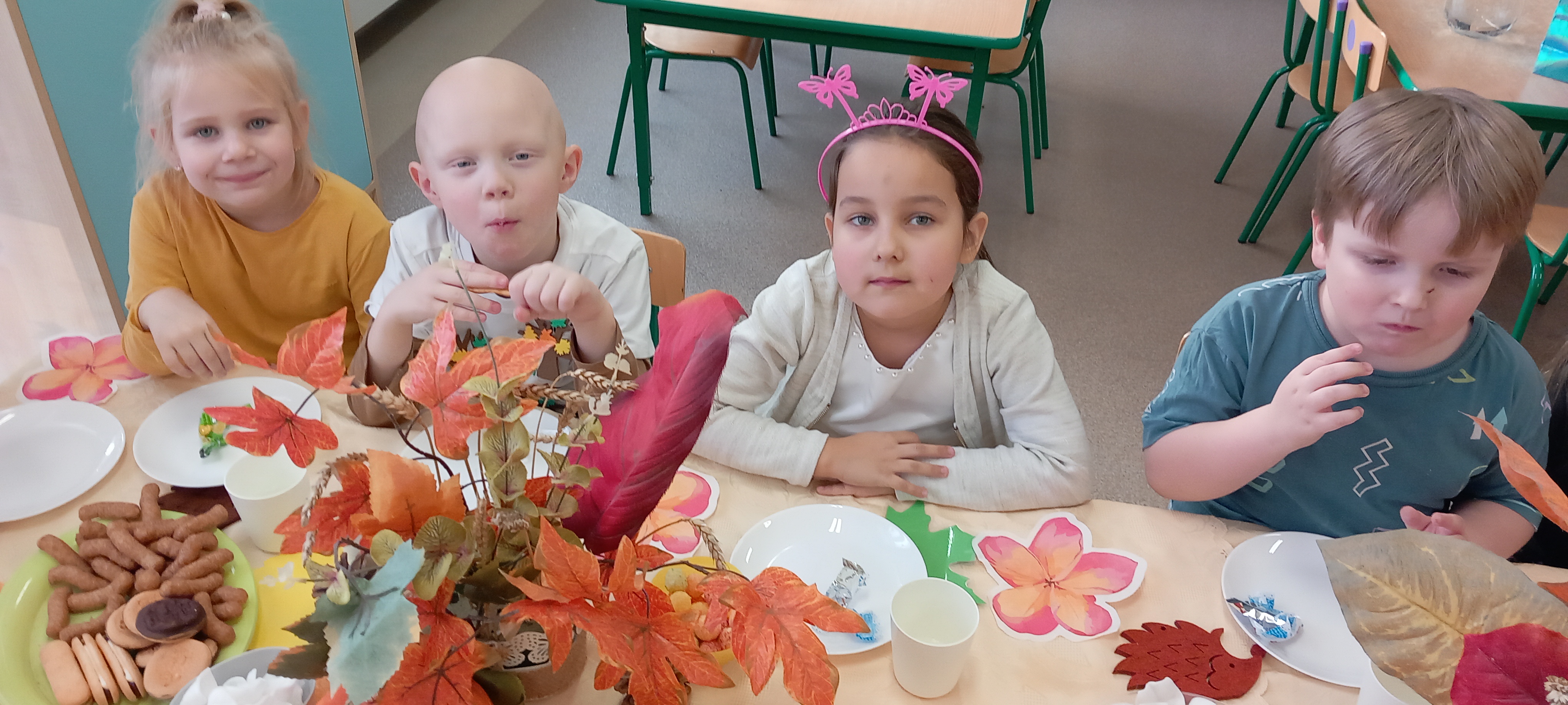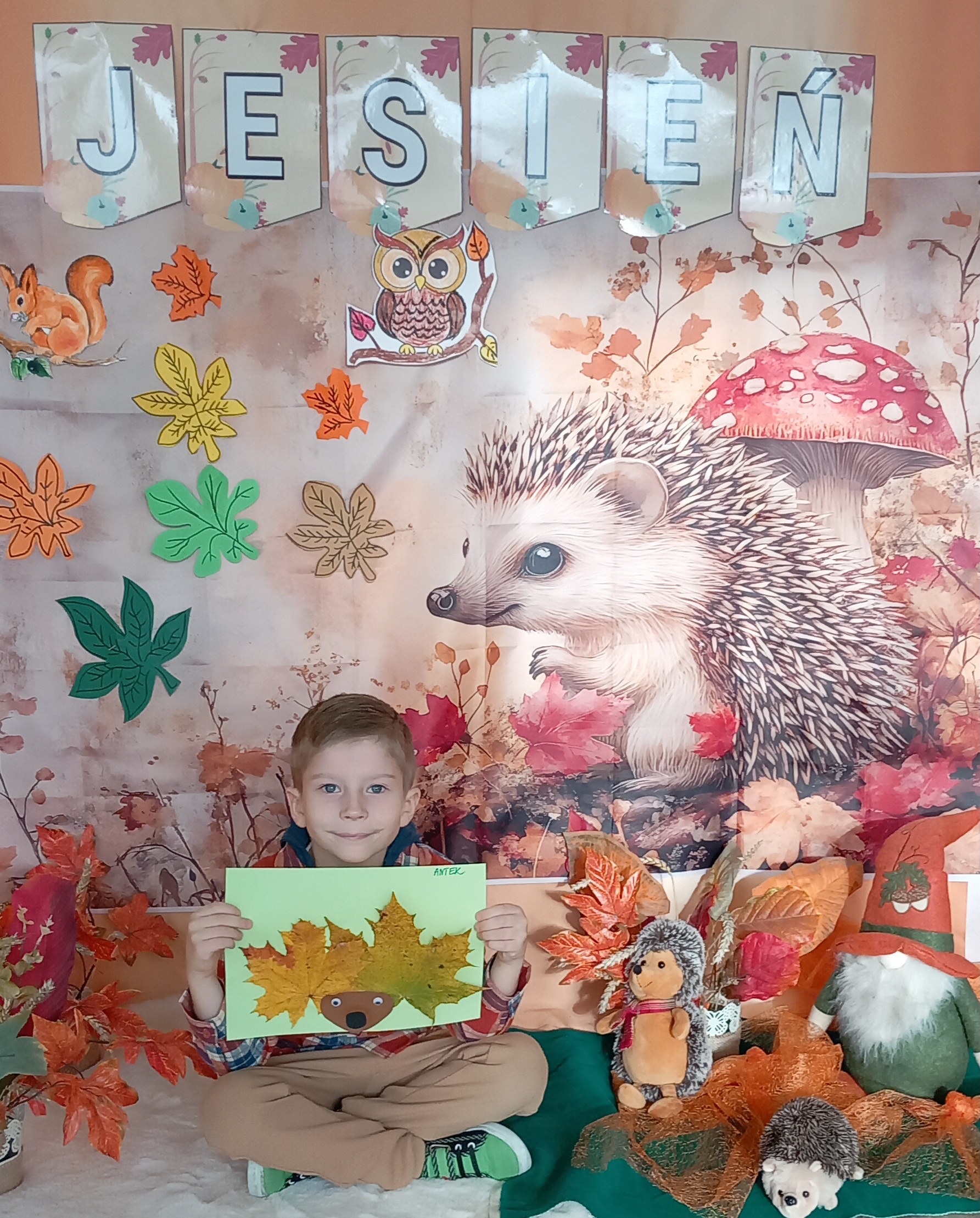 Wspólnie ułożyliśmy opowiadanie do historyjki obrazkowej ,,O tym jak krasnal się do zimy szykował ", były zabawy ruchowe, jesienna gimnastyka buzi i języka, konkursy, słodki poczęstunek oraz sesja zdjęciowa na pamiątkę.