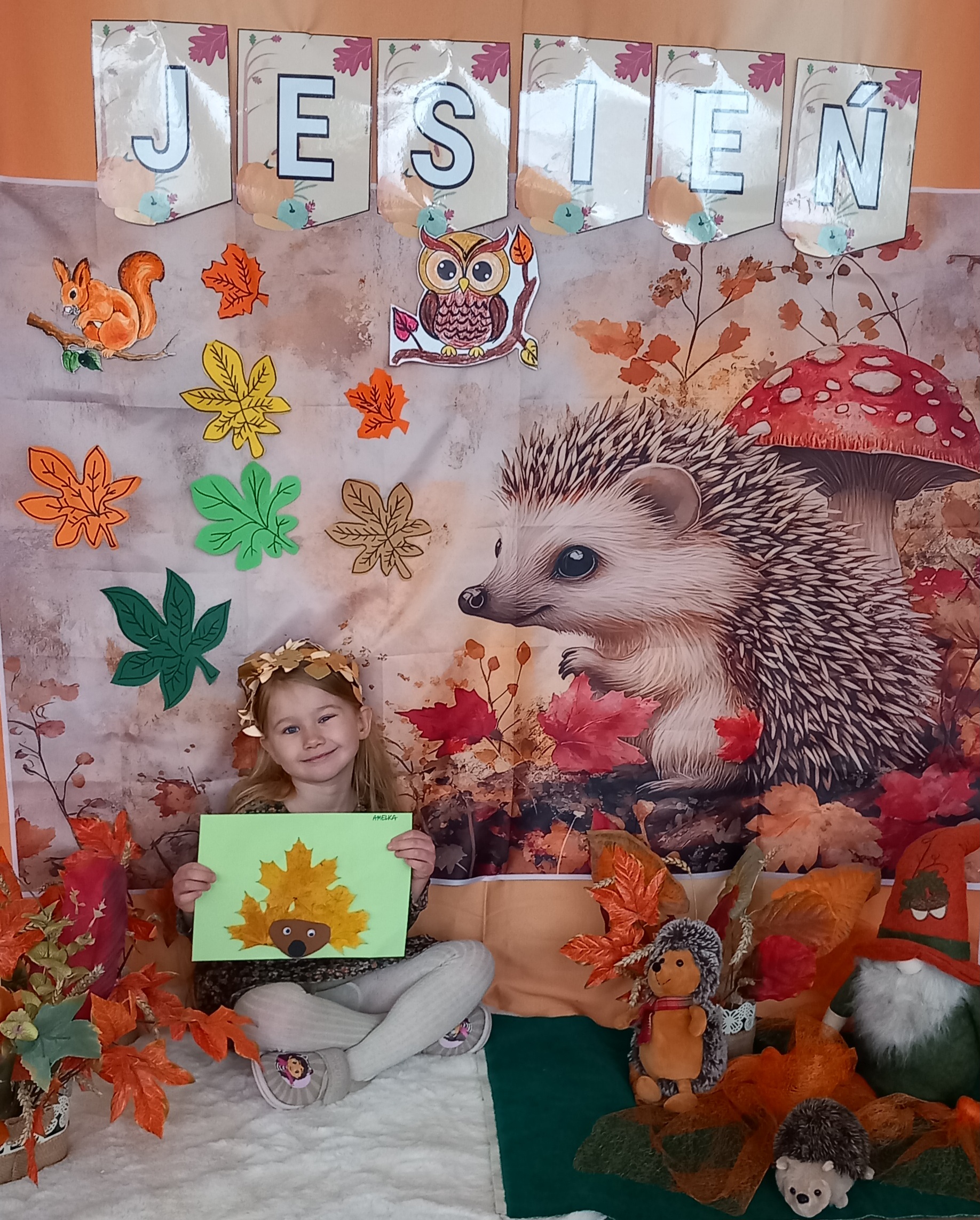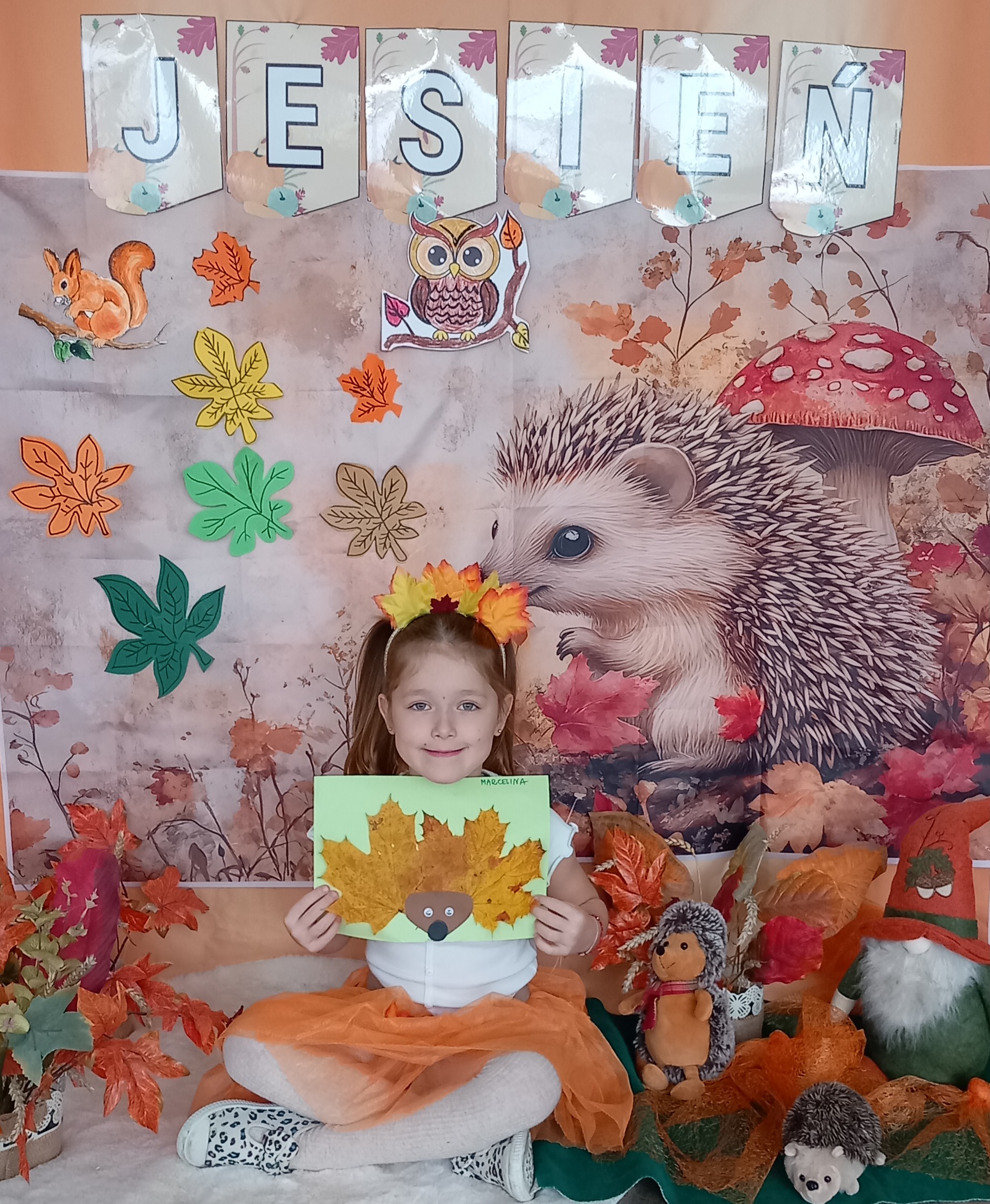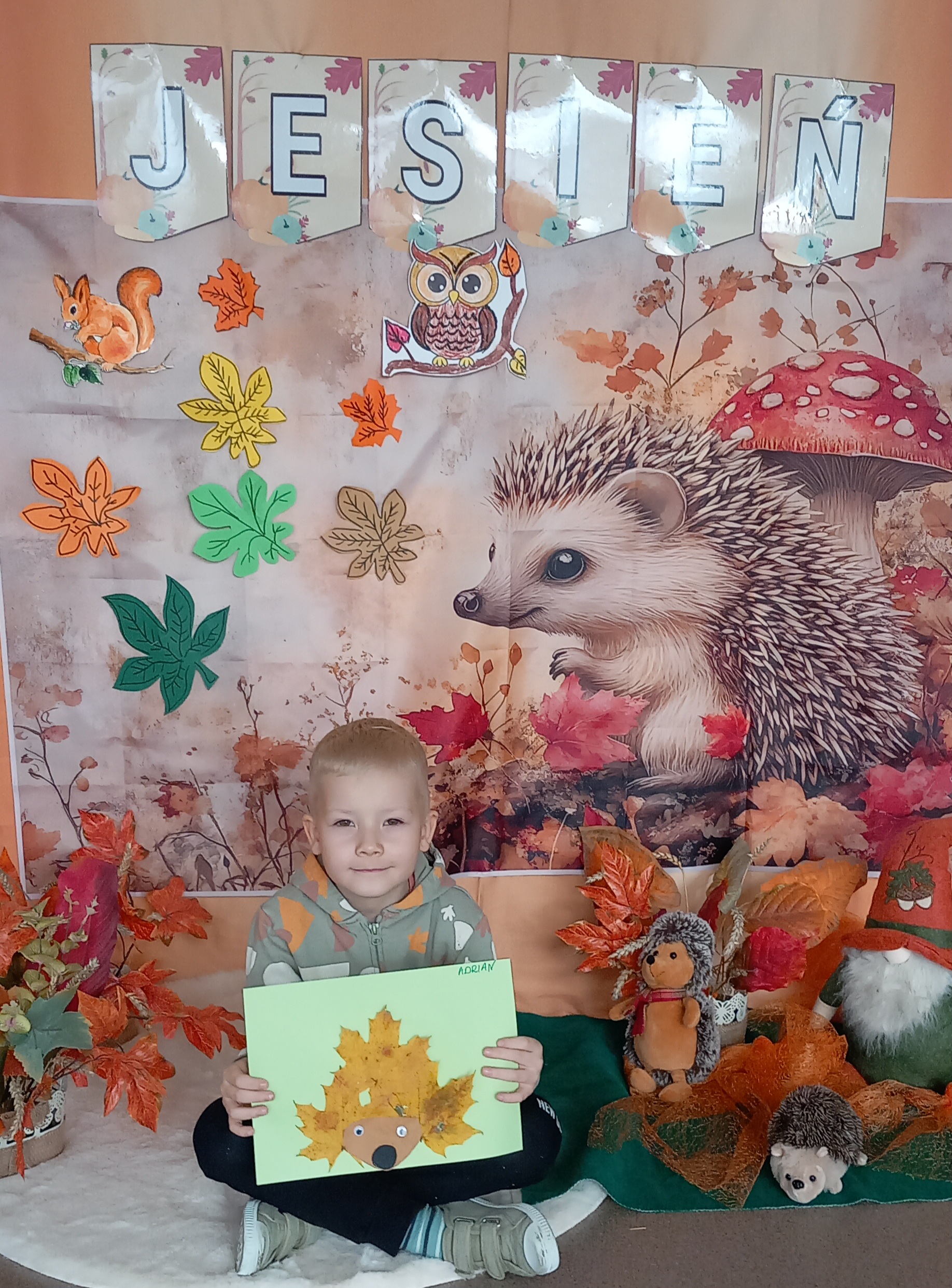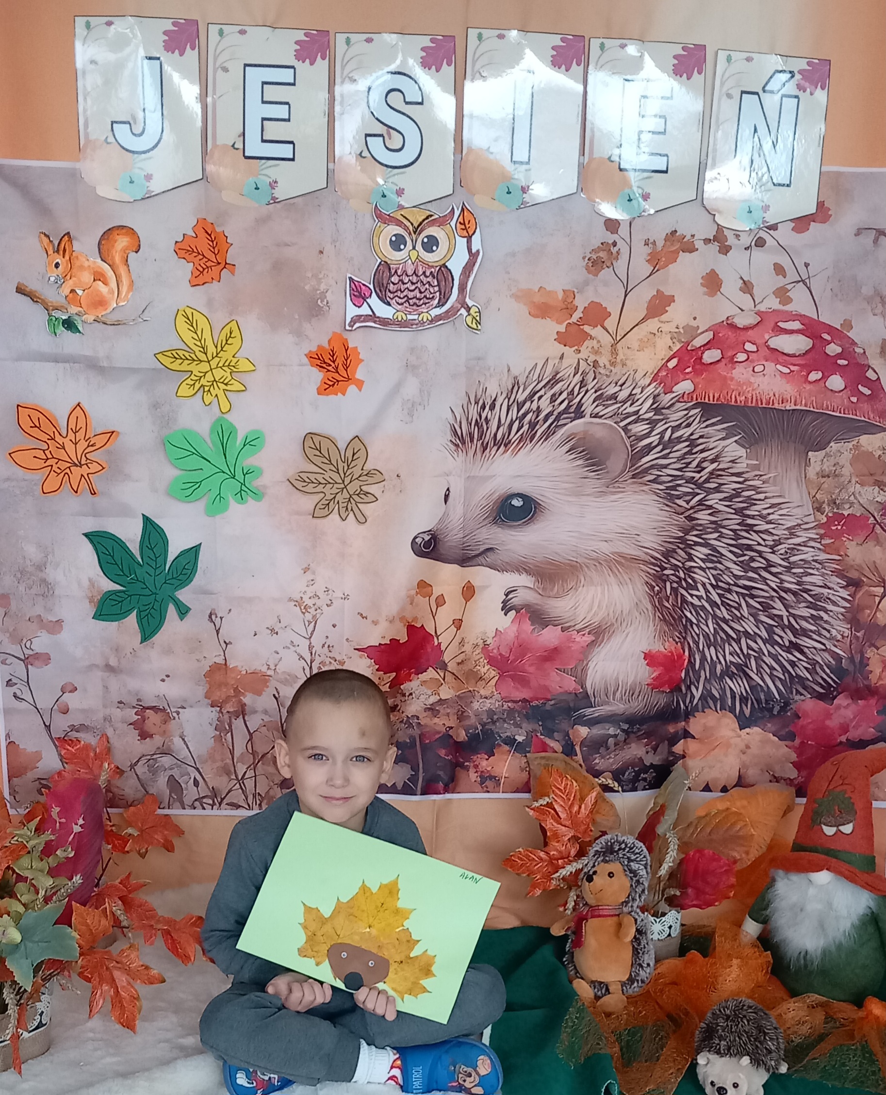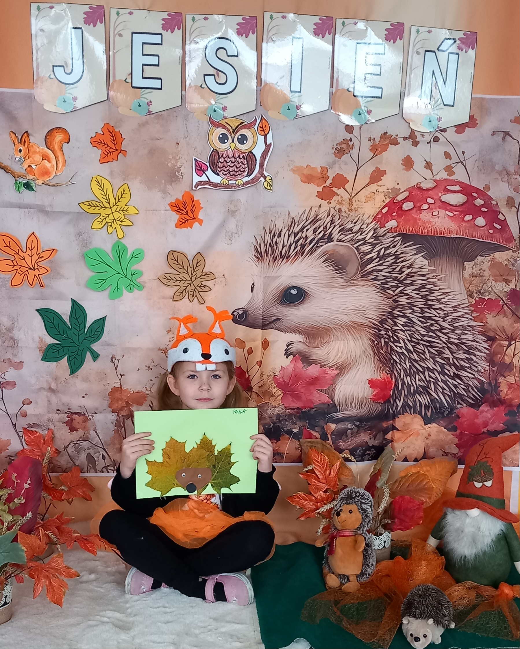 Wspólnie ułożyliśmy opowiadanie do historyjki obrazkowej ,,O tym jak krasnal się do zimy szykował ", były zabawy ruchowe, jesienna gimnastyka buzi i języka, konkursy, słodki poczęstunek oraz sesja zdjęciowa na pamiątkę.