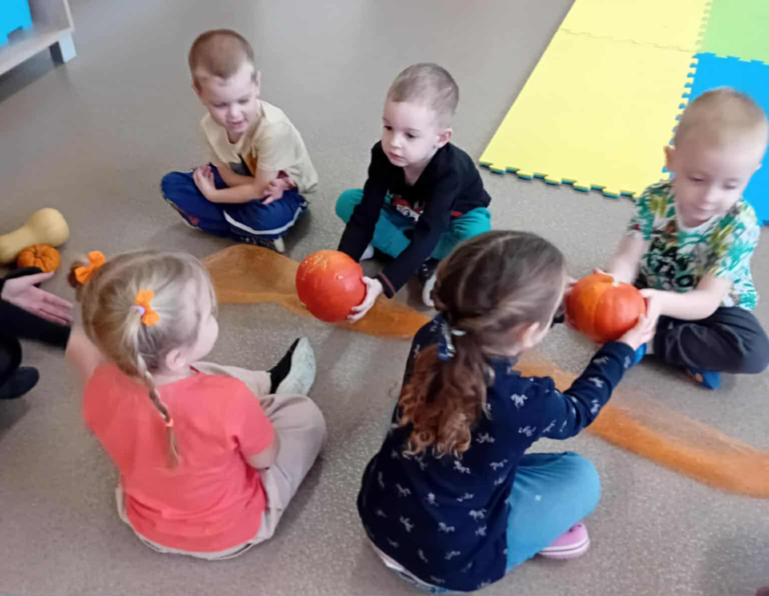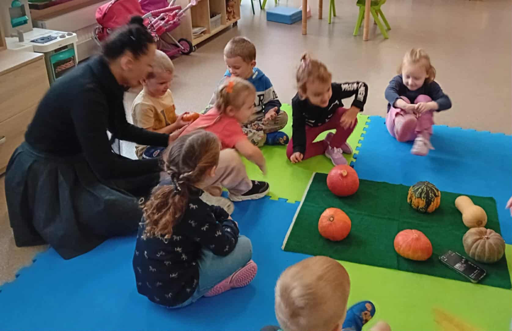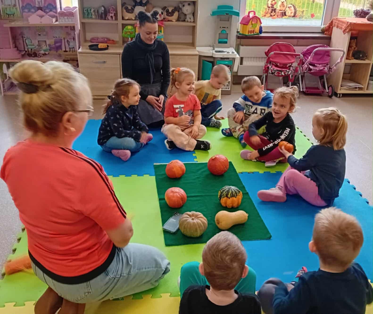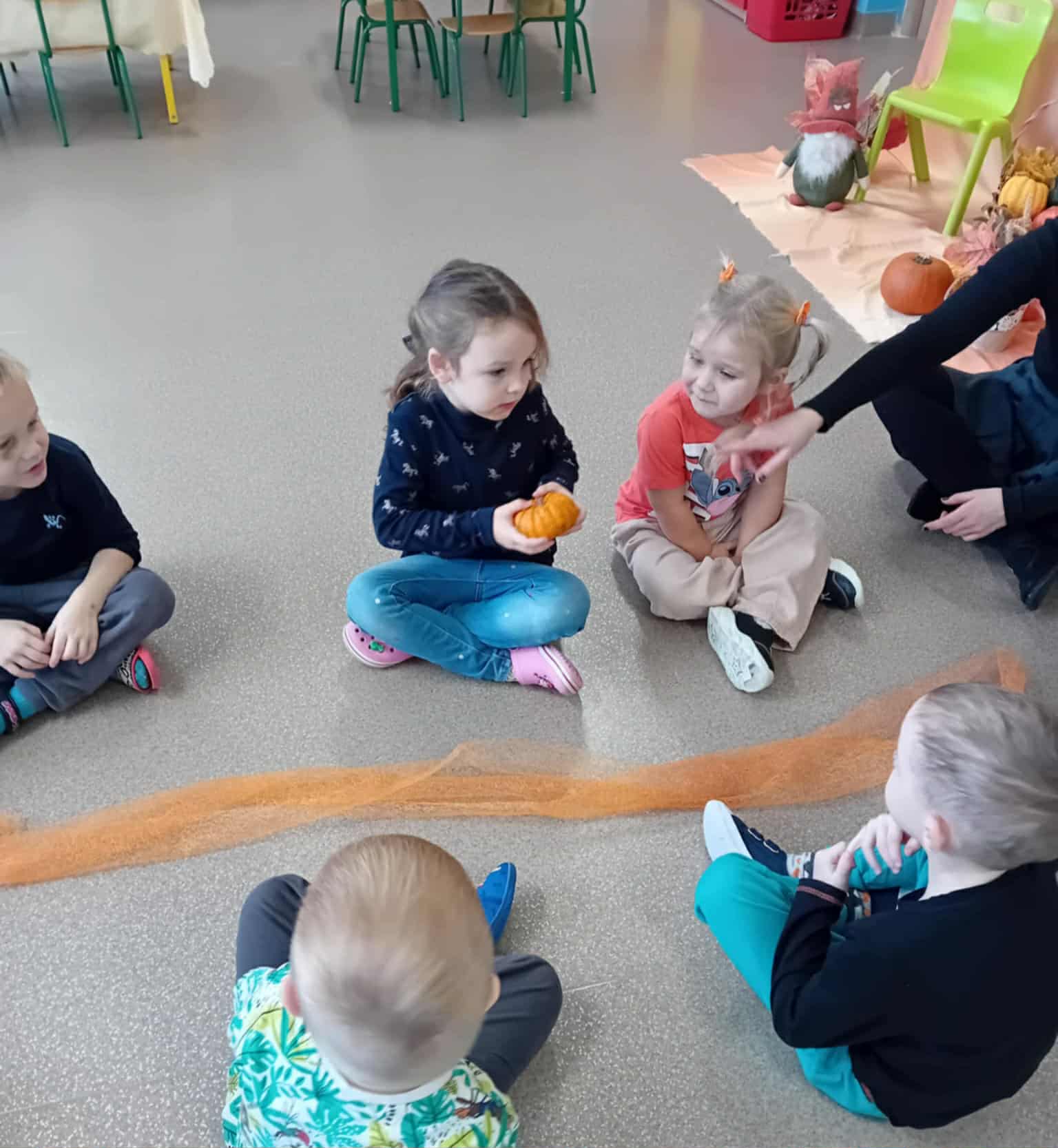W dniu 30.10.2025 r. w grupie Zajączki bawiliśmy się z okazji Dnia dyni. Wspólnie oglądaliśmy przyniesione okazy, porównywaliśmy je pod względem wyglądu i kształtu, przeliczaliśmy je i "ważyliśmy" w rękach. Wykorzystaliśmy je do turlania, podawania sobie, a także do dekoracji stołów podczas uroczystego poczęstunku. Dynie były również inspiracją do przestrzennych prac plastycznych. To był dla przedszkolaków wesoły i ciekawy dzień.