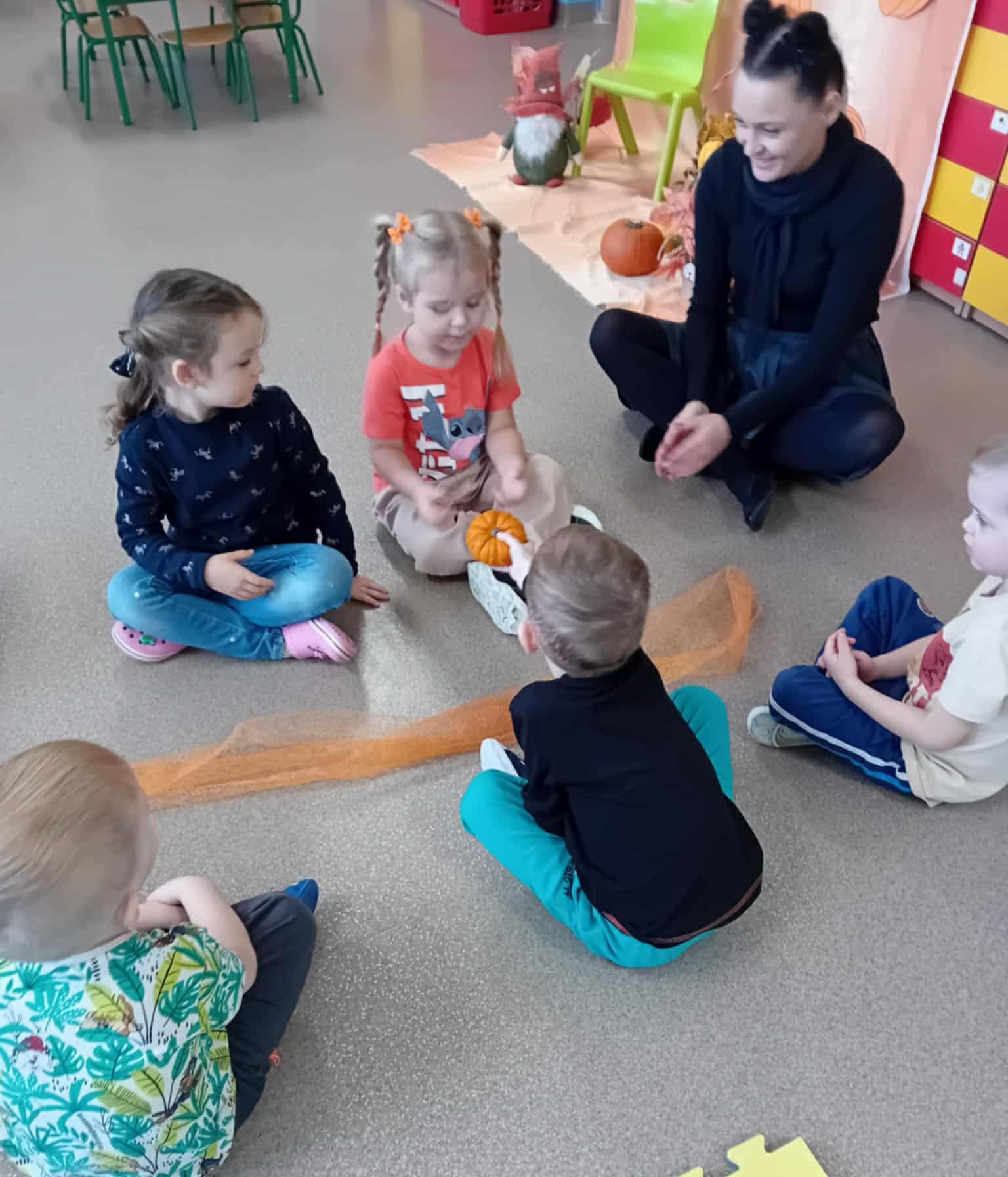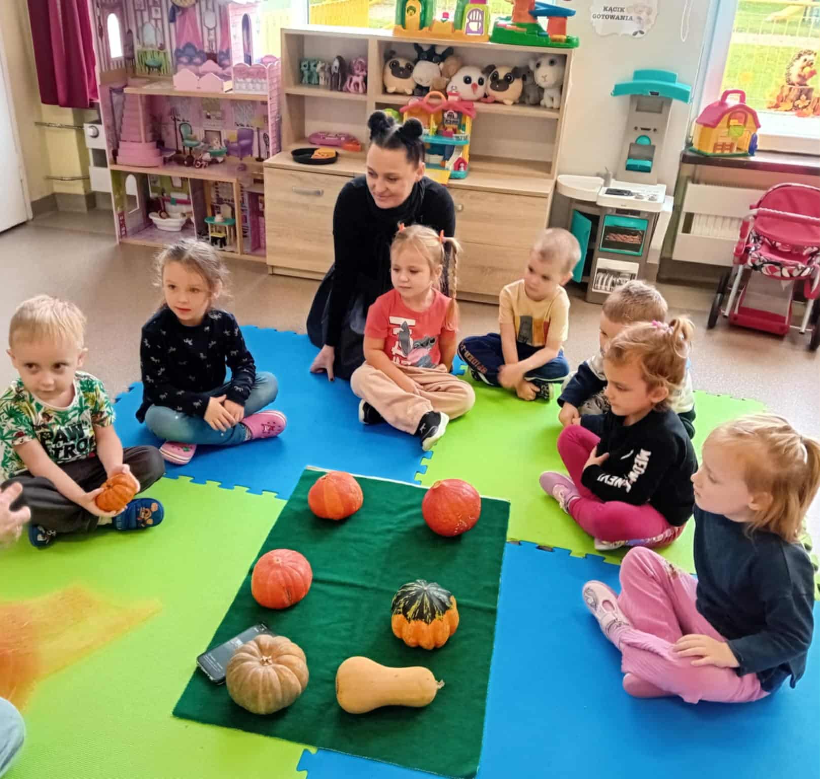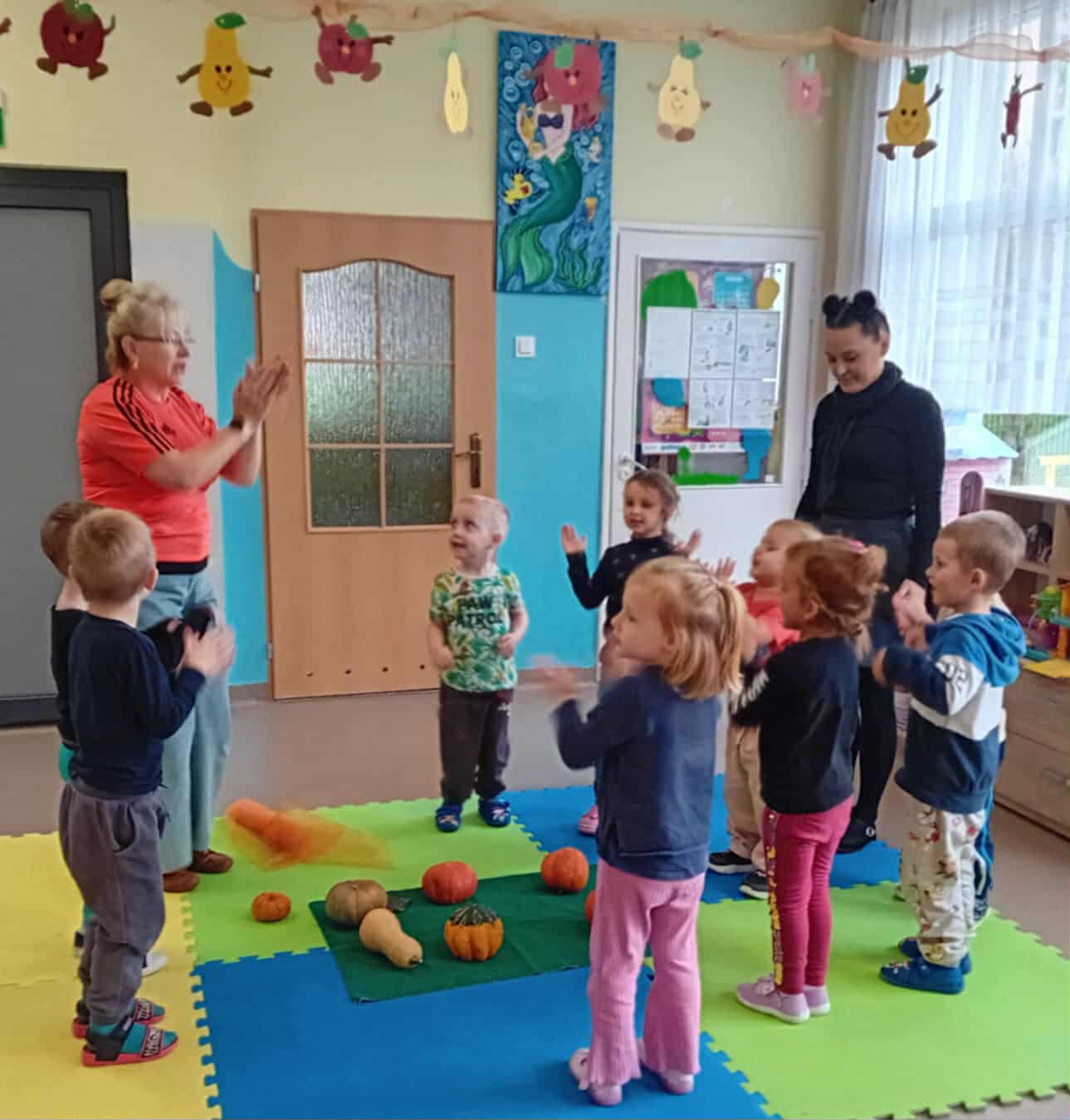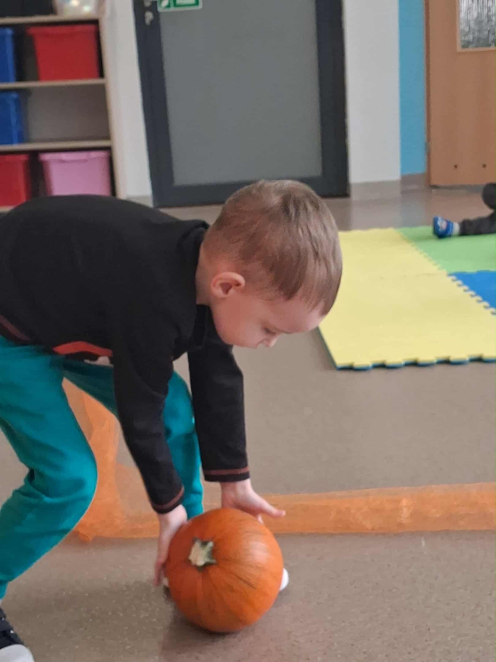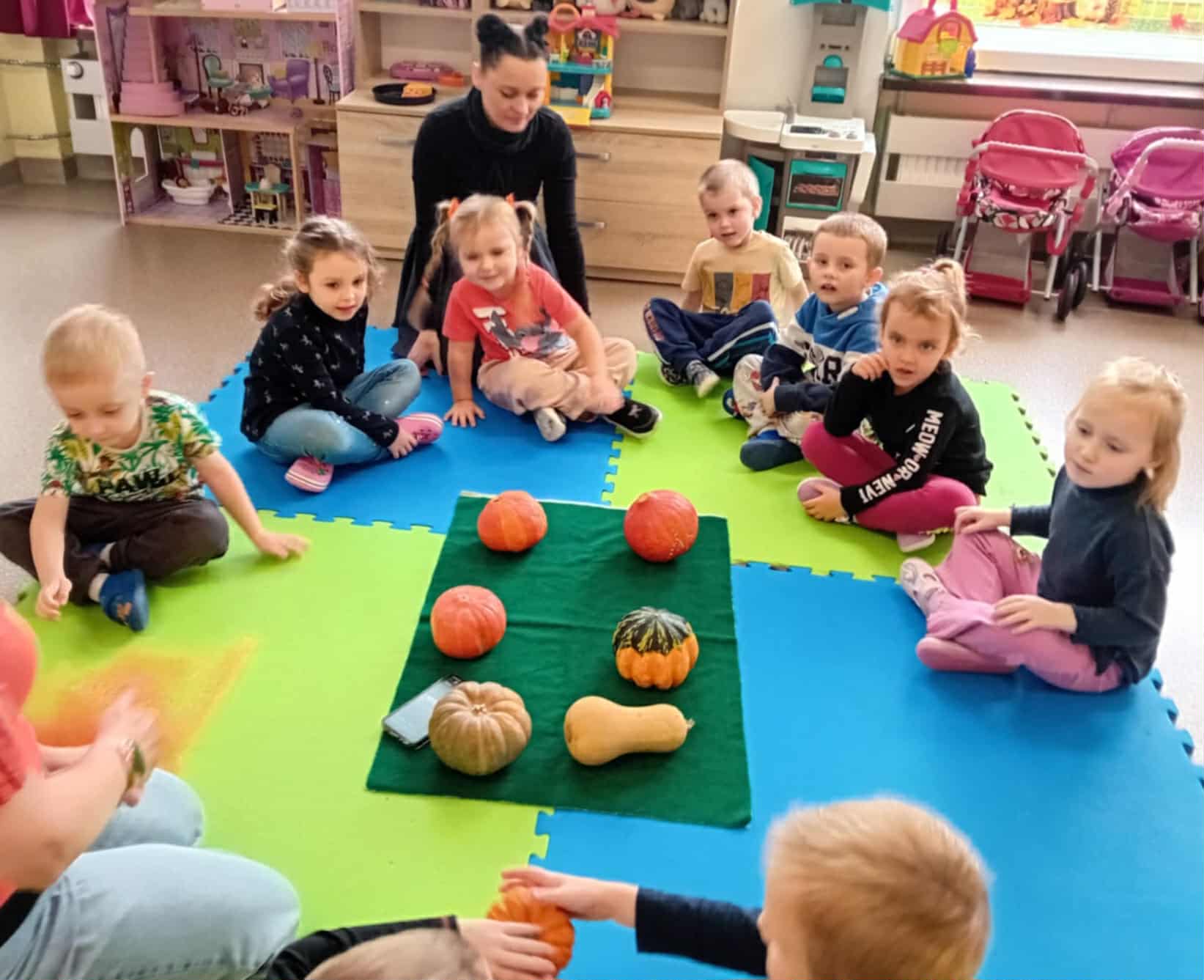 W dniu 30.10.2025 r. w grupie Zajączki bawiliśmy się z okazji Dnia dyni. Wspólnie oglądaliśmy przyniesione okazy, porównywaliśmy je pod względem wyglądu i kształtu, przeliczaliśmy je i "ważyliśmy" w rękach. Wykorzystaliśmy je do turlania, podawania sobie, a także do dekoracji stołów podczas uroczystego poczęstunku. Dynie były również inspiracją do przestrzennych prac plastycznych. To był dla przedszkolaków wesoły i ciekawy dzień.