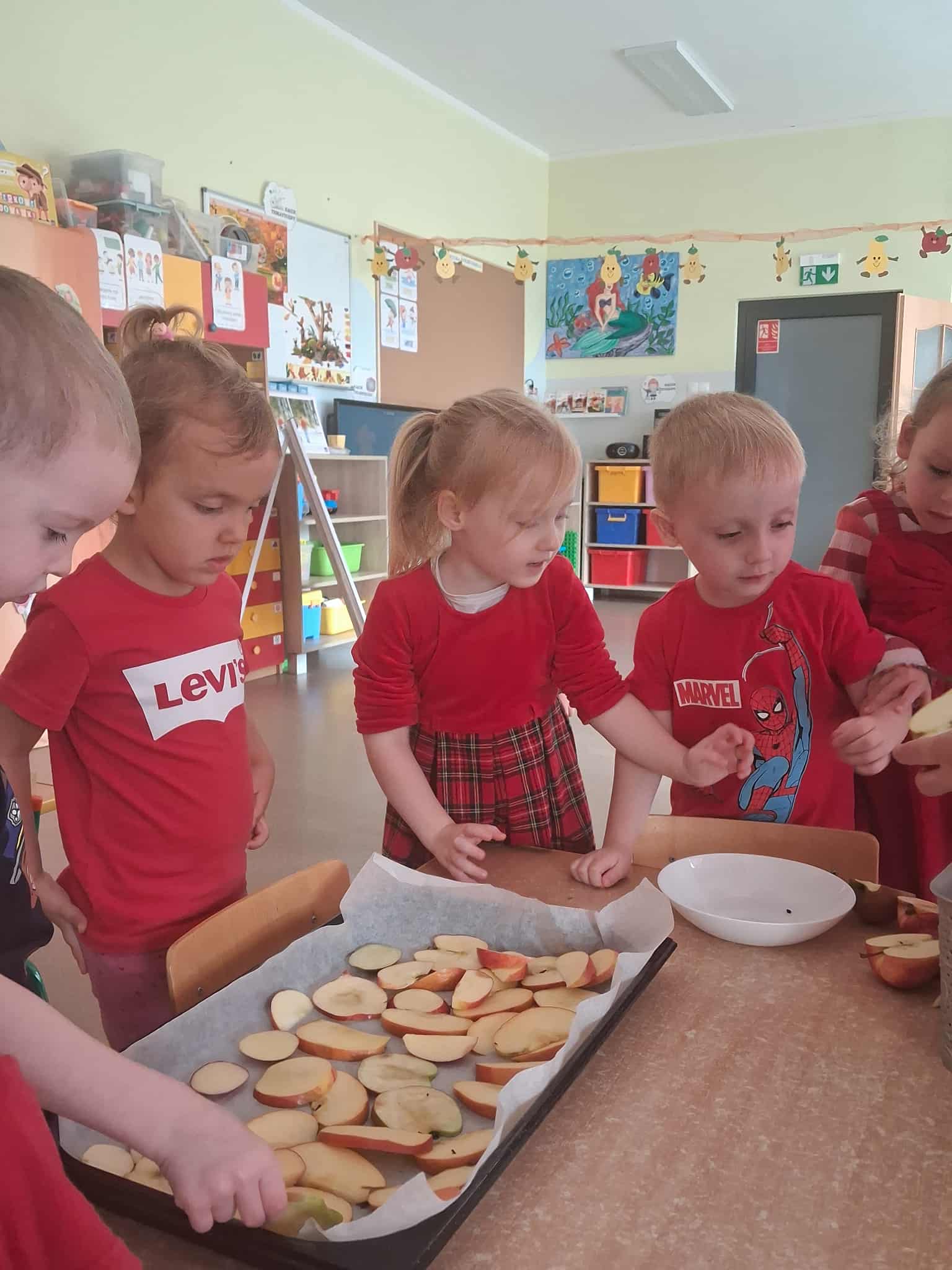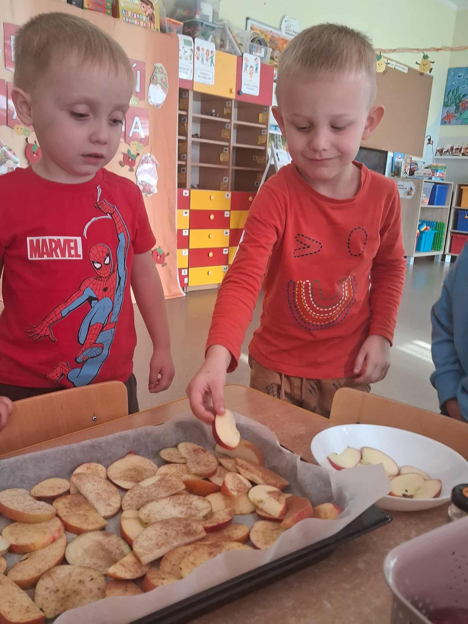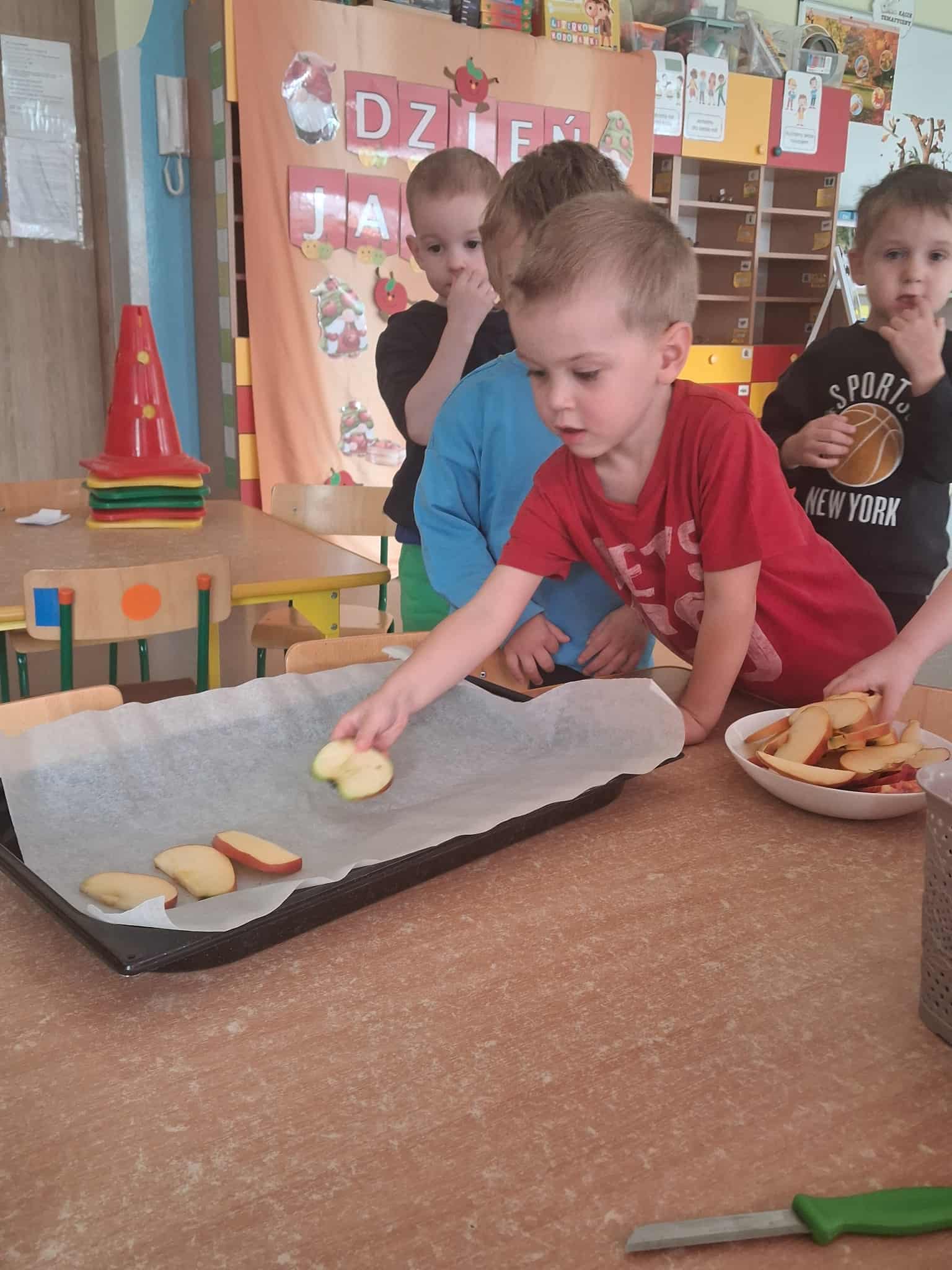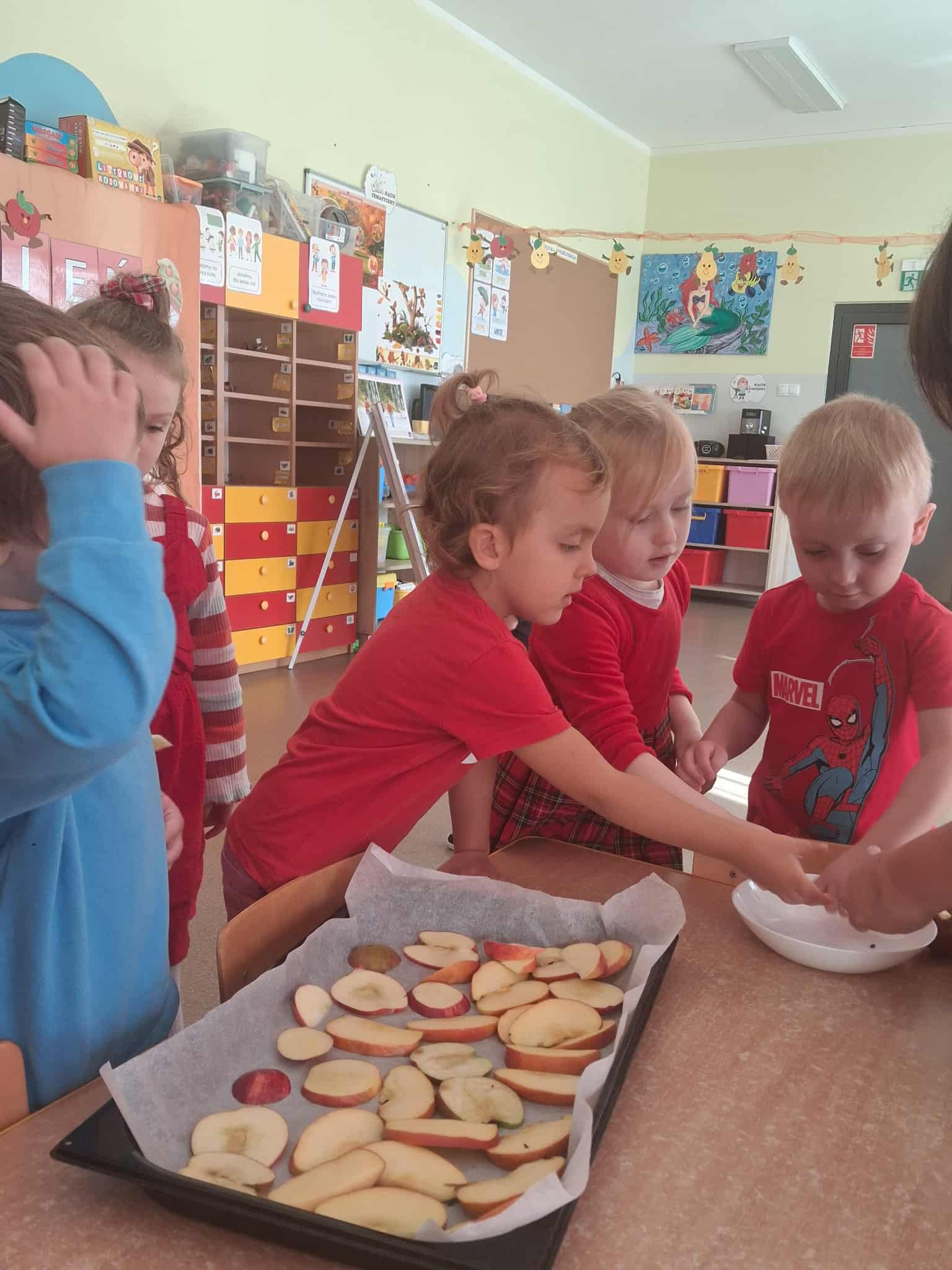 Tego dnia po zajęciach dydaktycznych oraz zabawach ruchowych ,,Zajączki "przygotowały zdrowe chipsy jabłkowe oraz smakowały przepyszną szarlotkę.