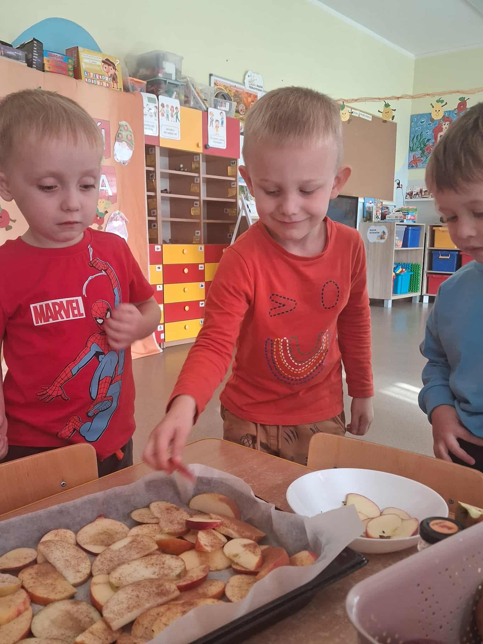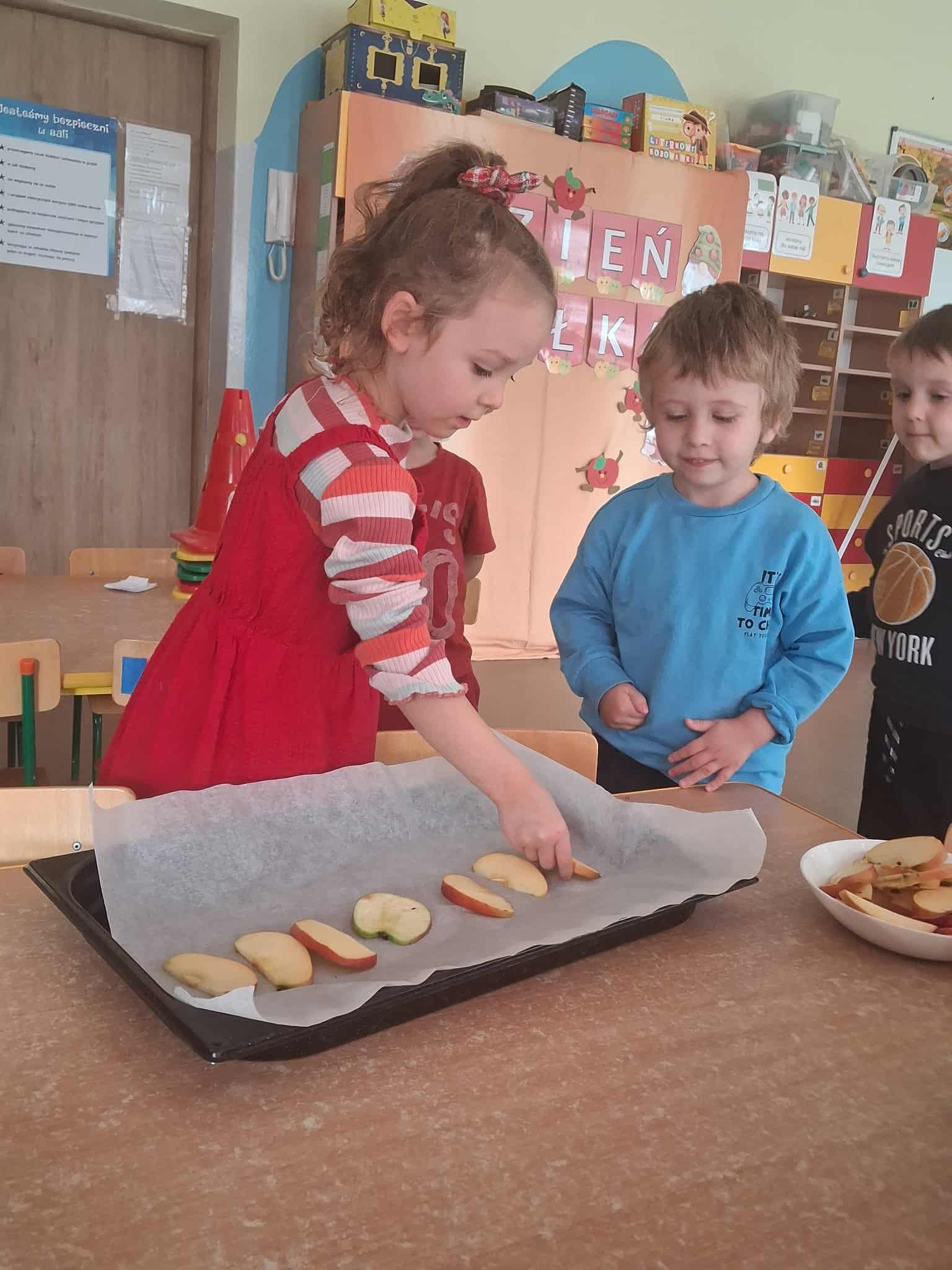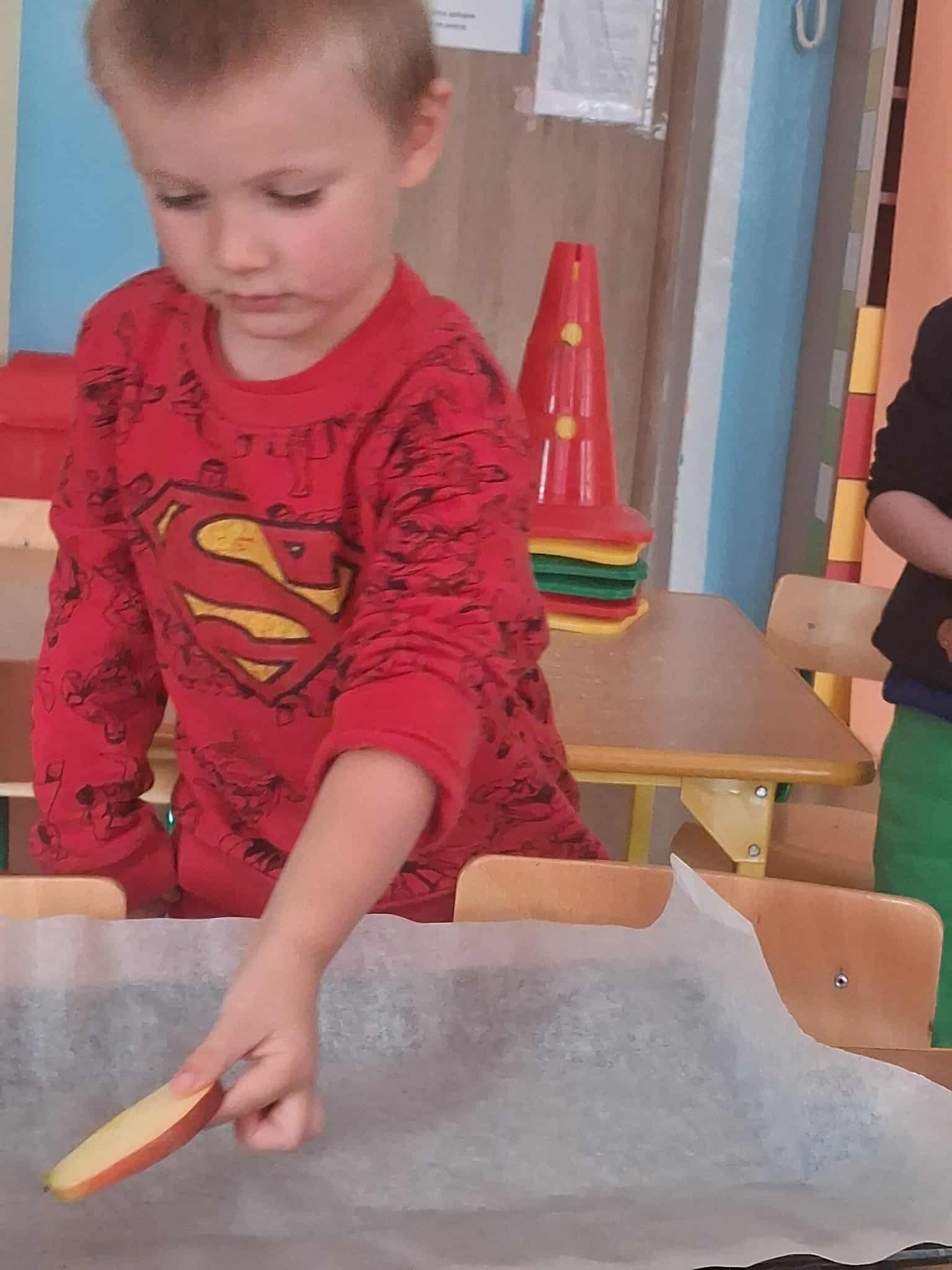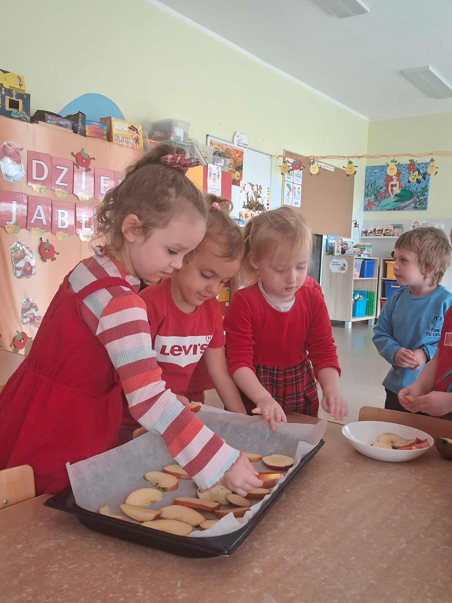 Tego dnia po zajęciach dydaktycznych oraz zabawach ruchowych ,,Zajączki "przygotowały zdrowe chipsy jabłkowe oraz smakowały przepyszną szarlotkę.