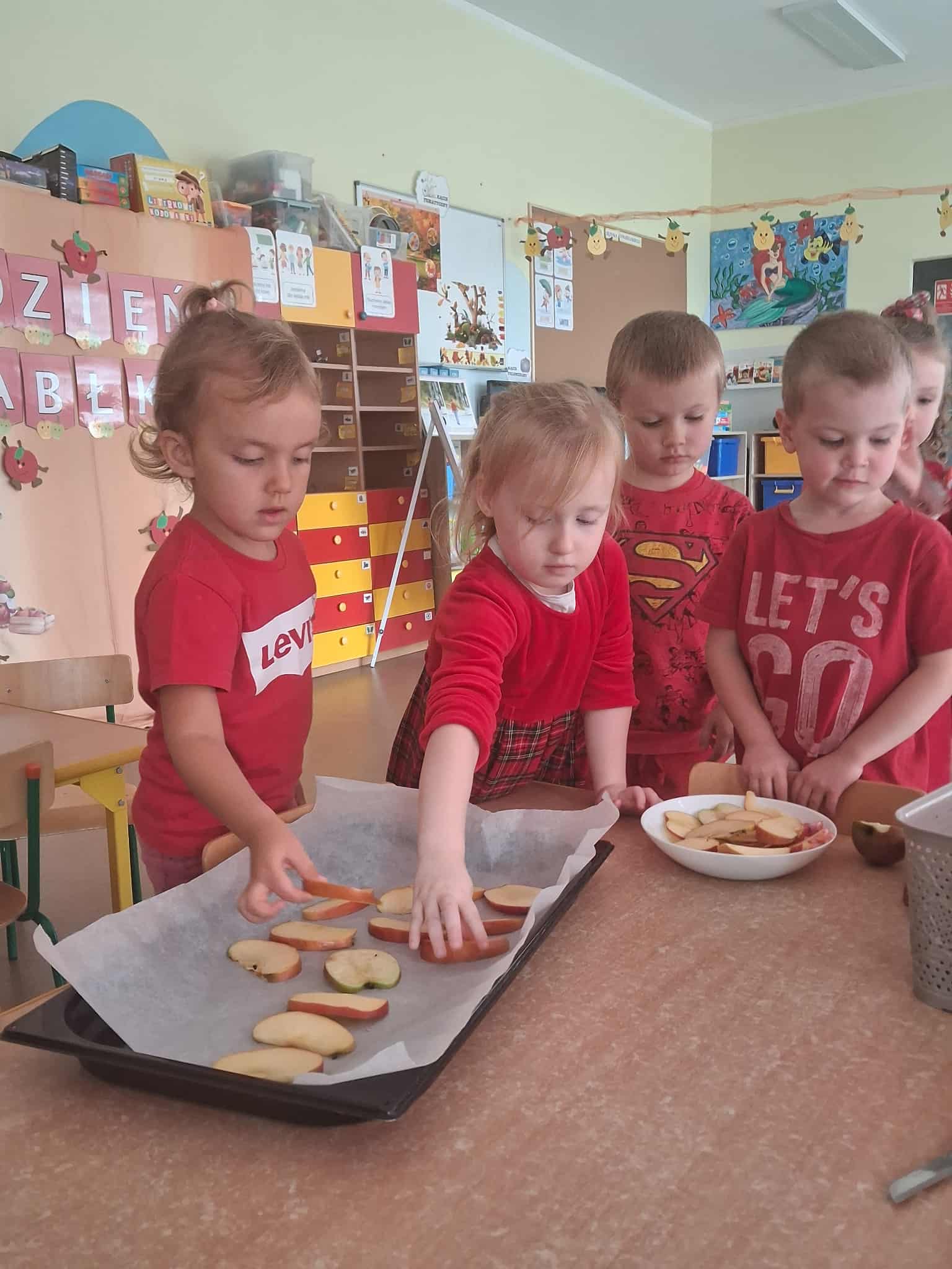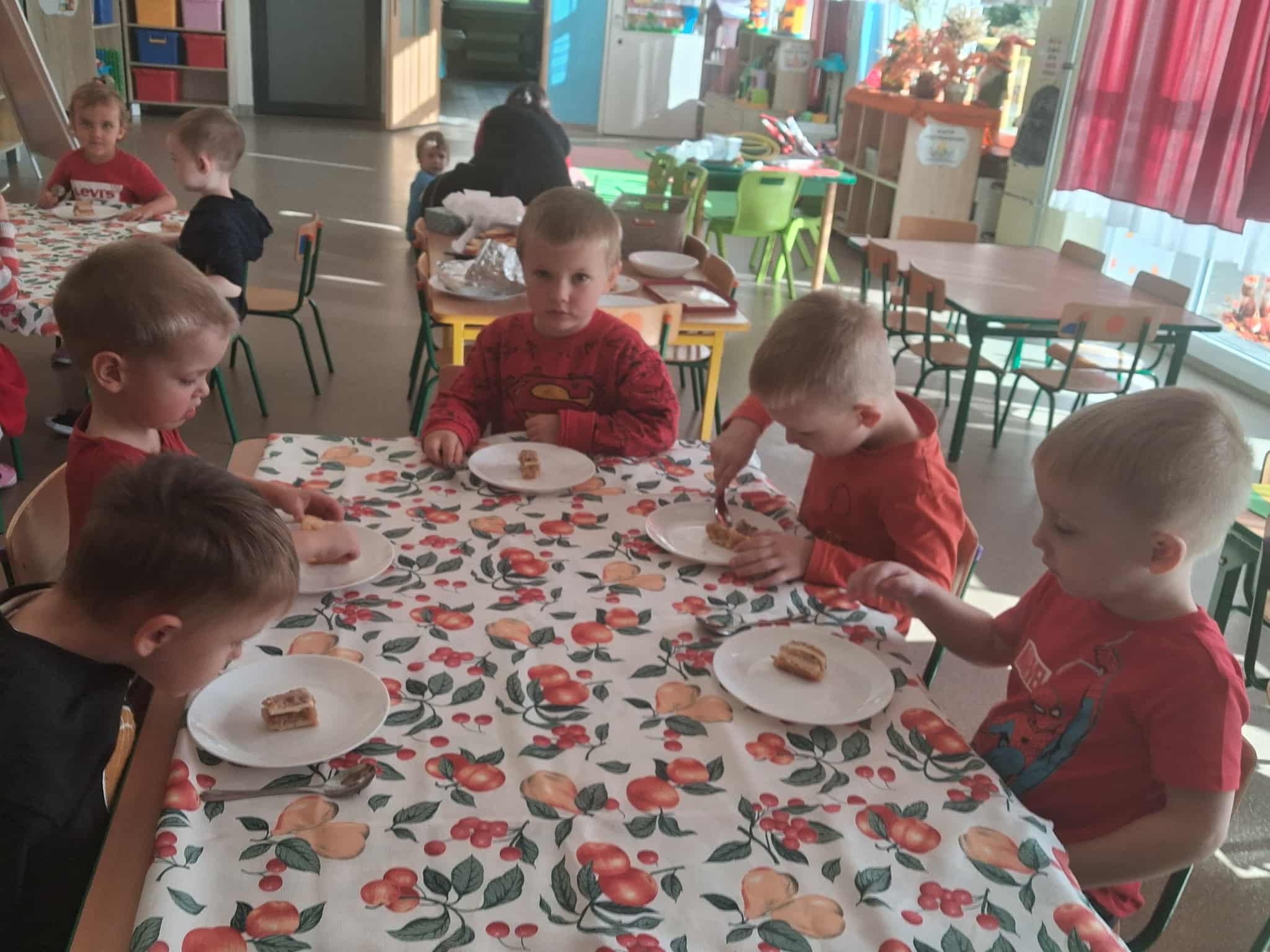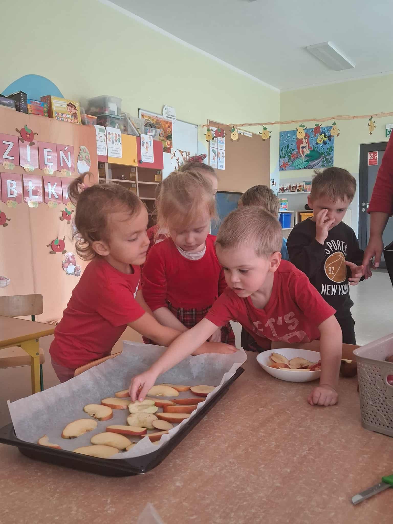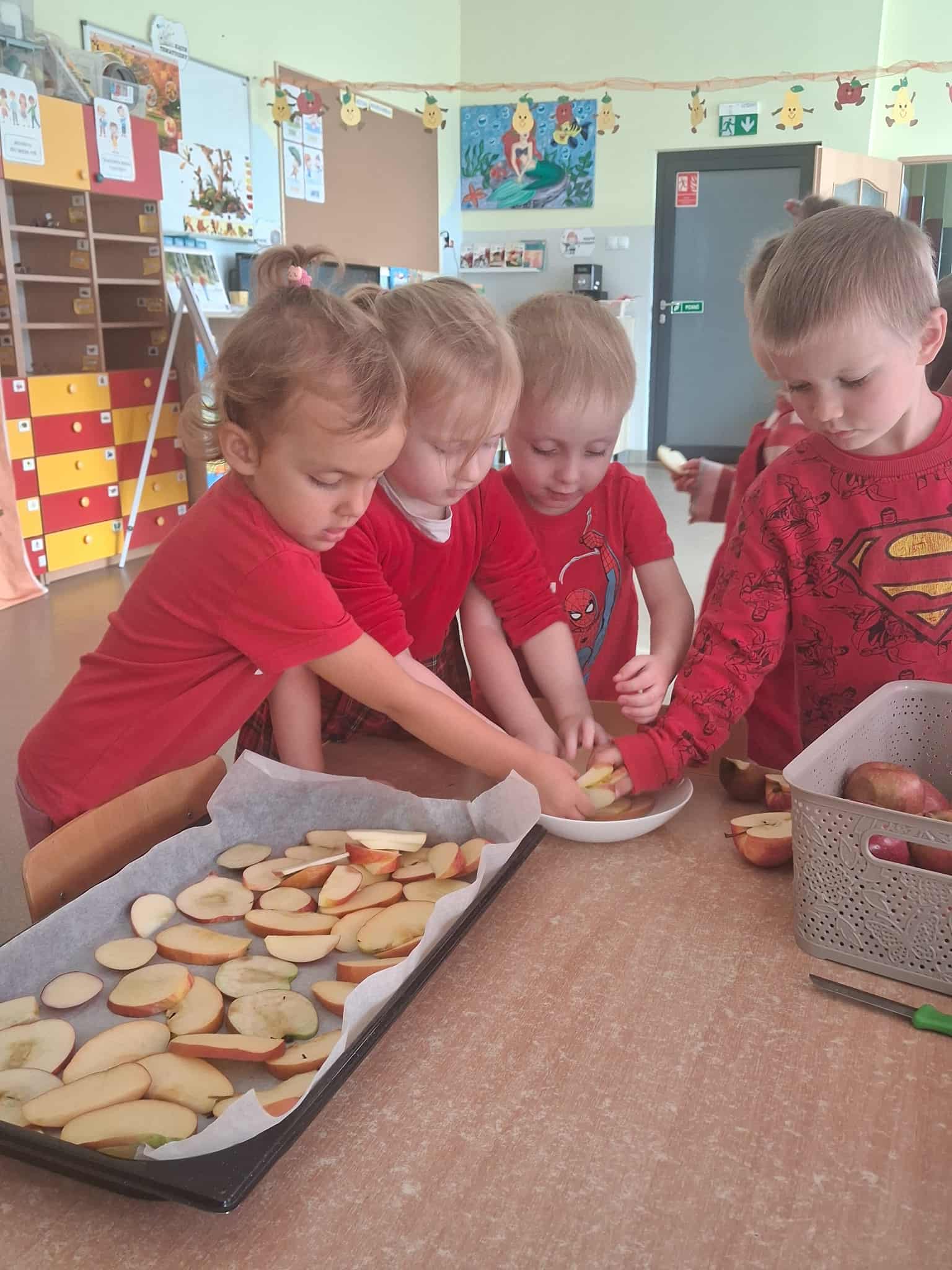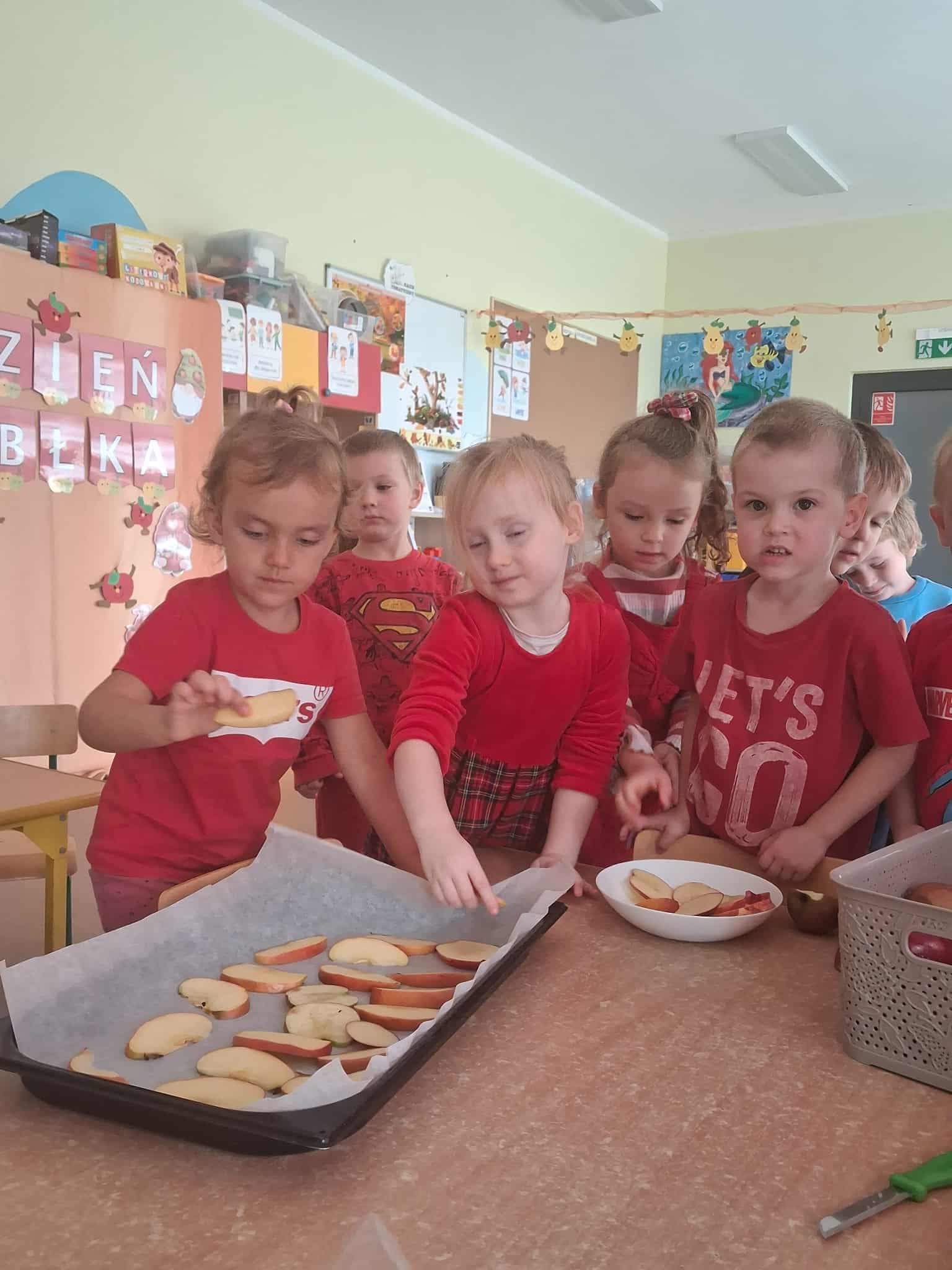 Tego dnia po zajęciach dydaktycznych oraz zabawach ruchowych ,,Zajączki "przygotowały zdrowe chipsy jabłkowe oraz smakowały przepyszną szarlotkę.