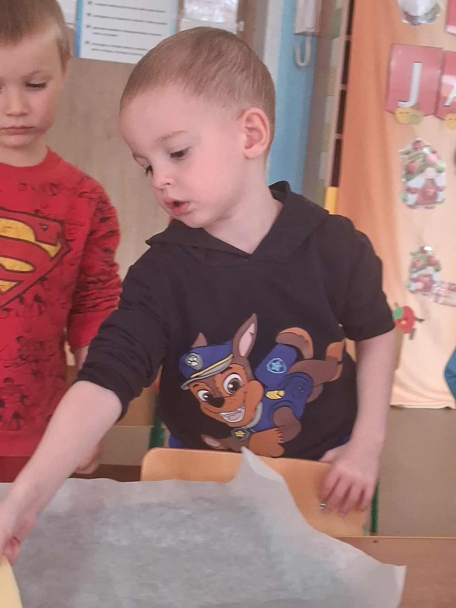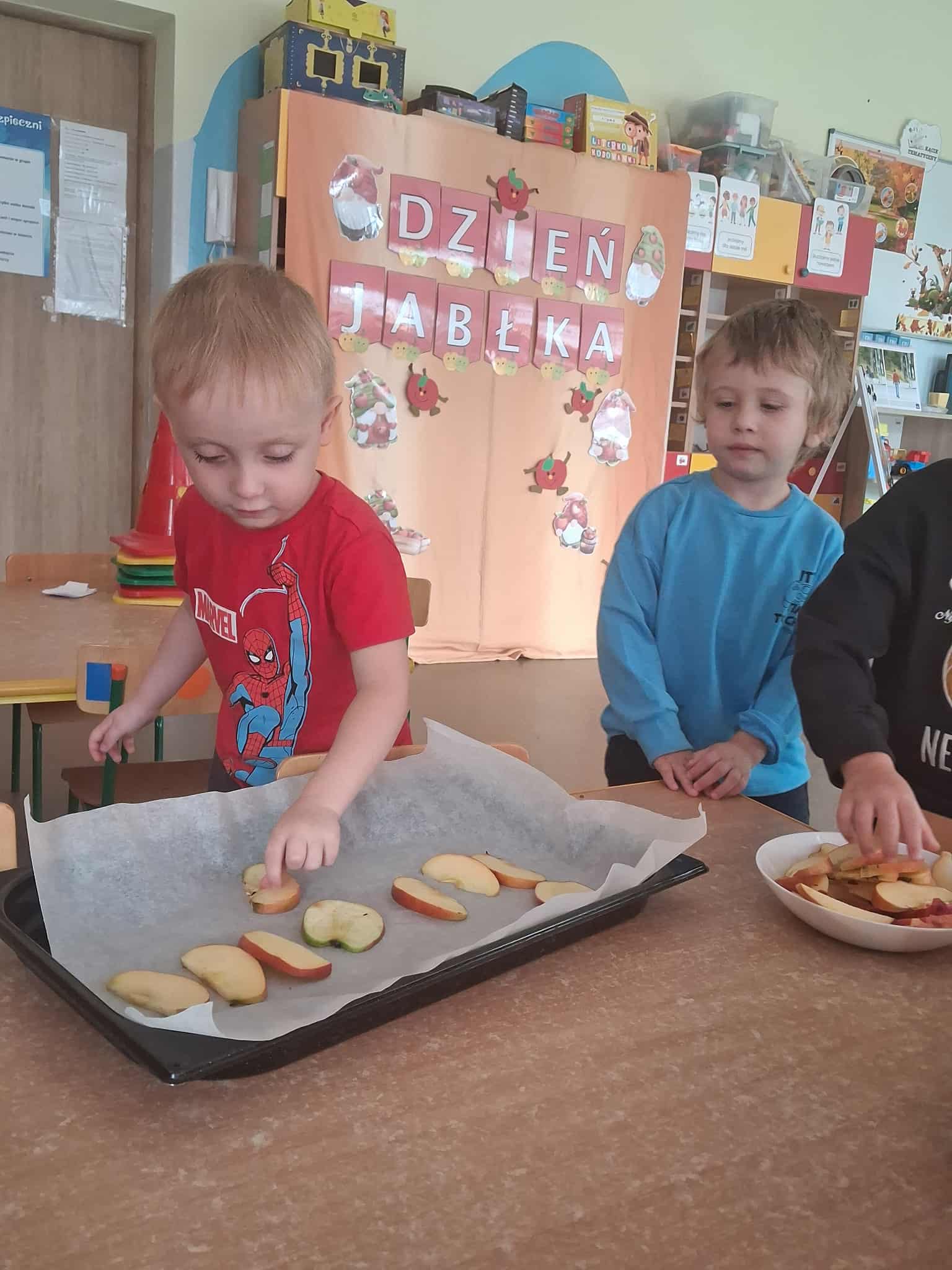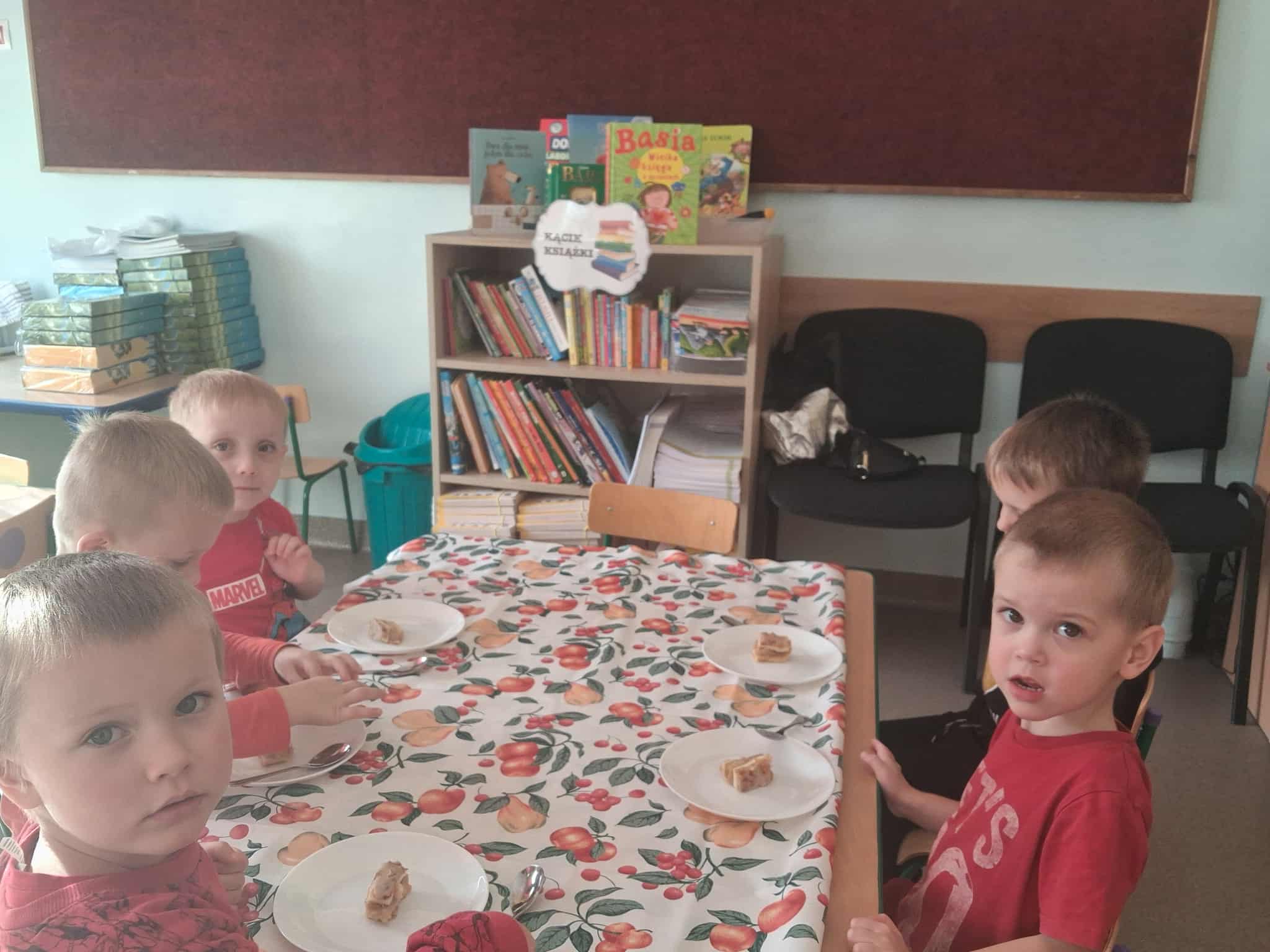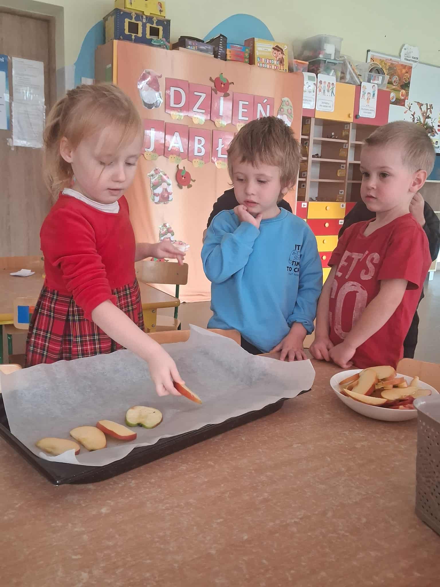 Tego dnia po zajęciach dydaktycznych oraz zabawach ruchowych ,,Zajączki "przygotowały zdrowe chipsy jabłkowe oraz smakowały przepyszną szarlotkę.