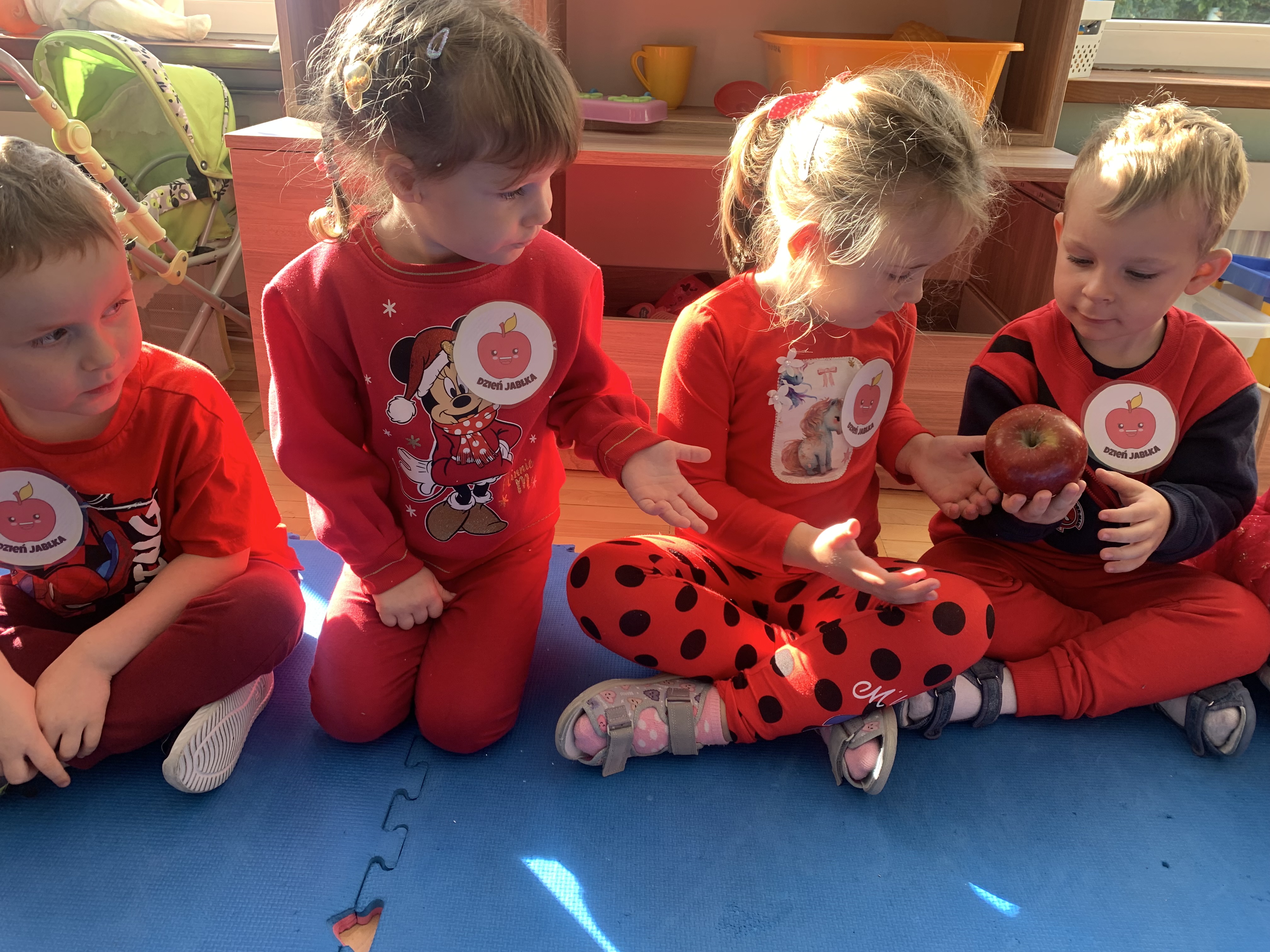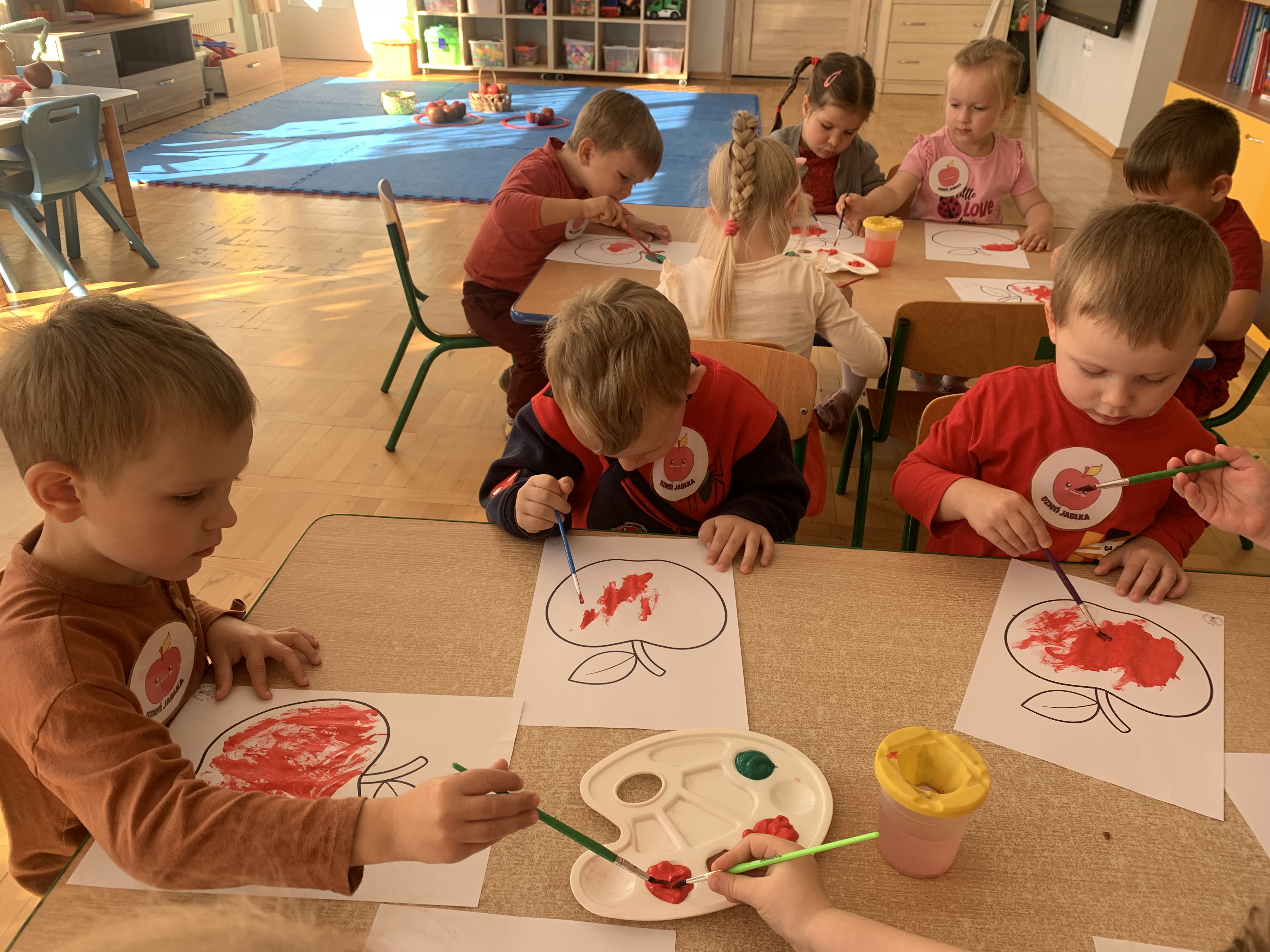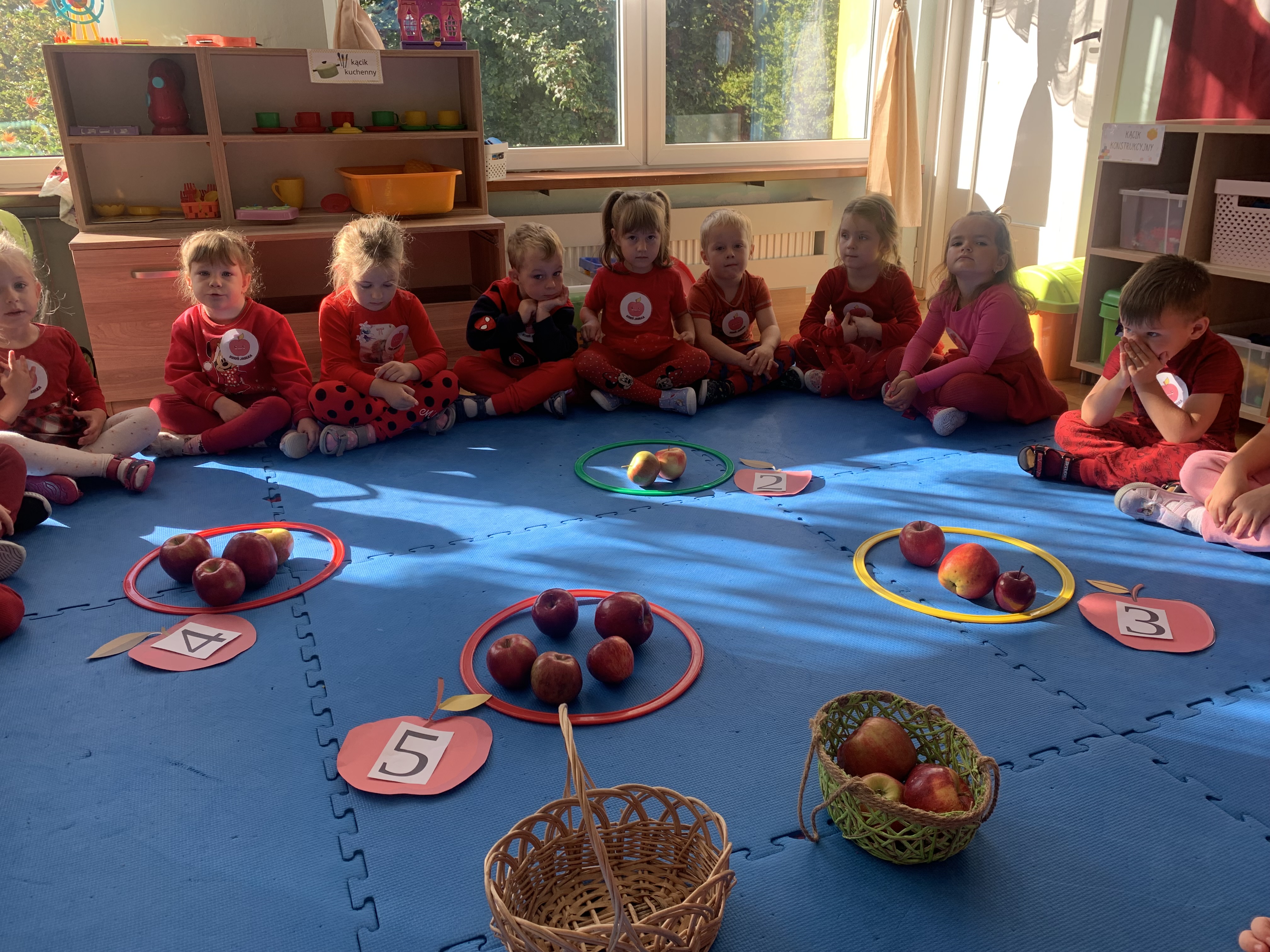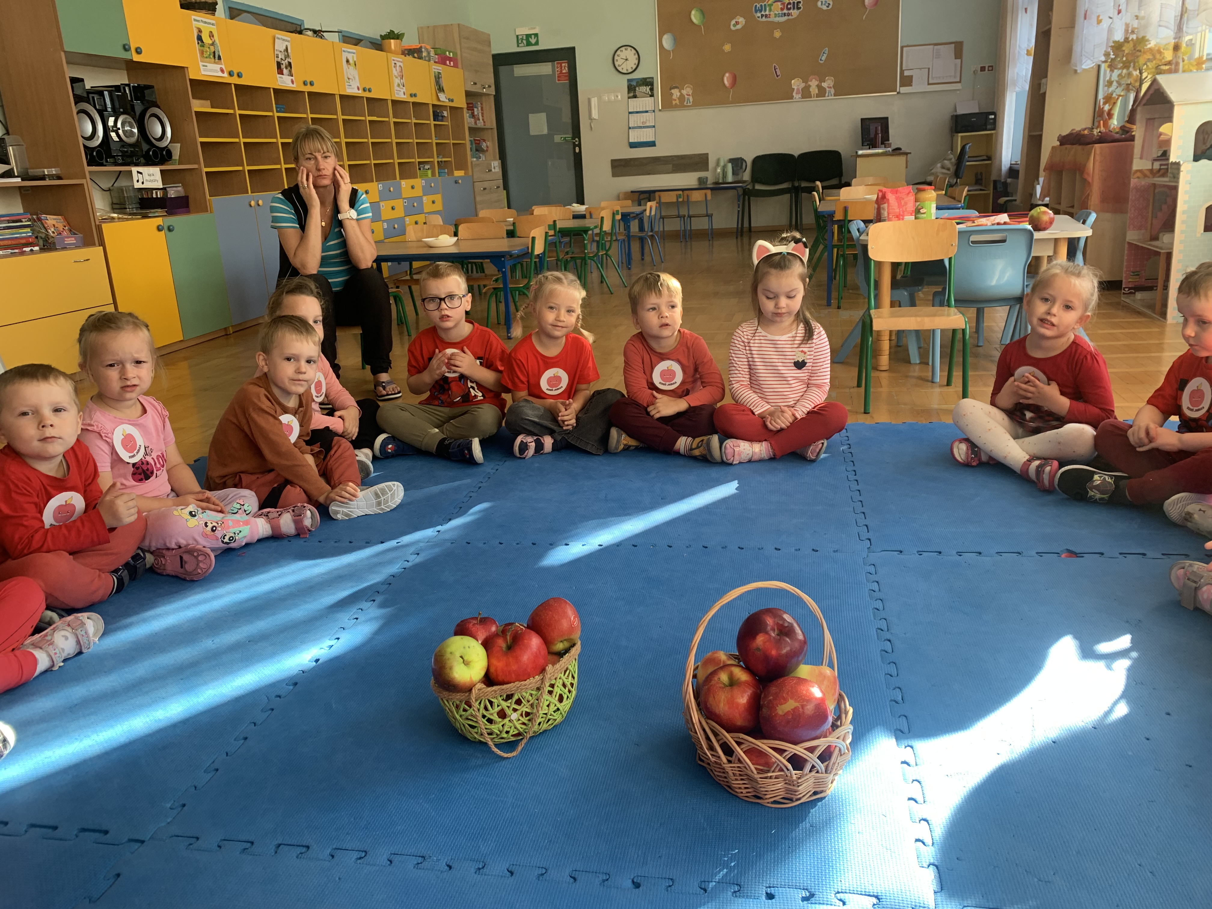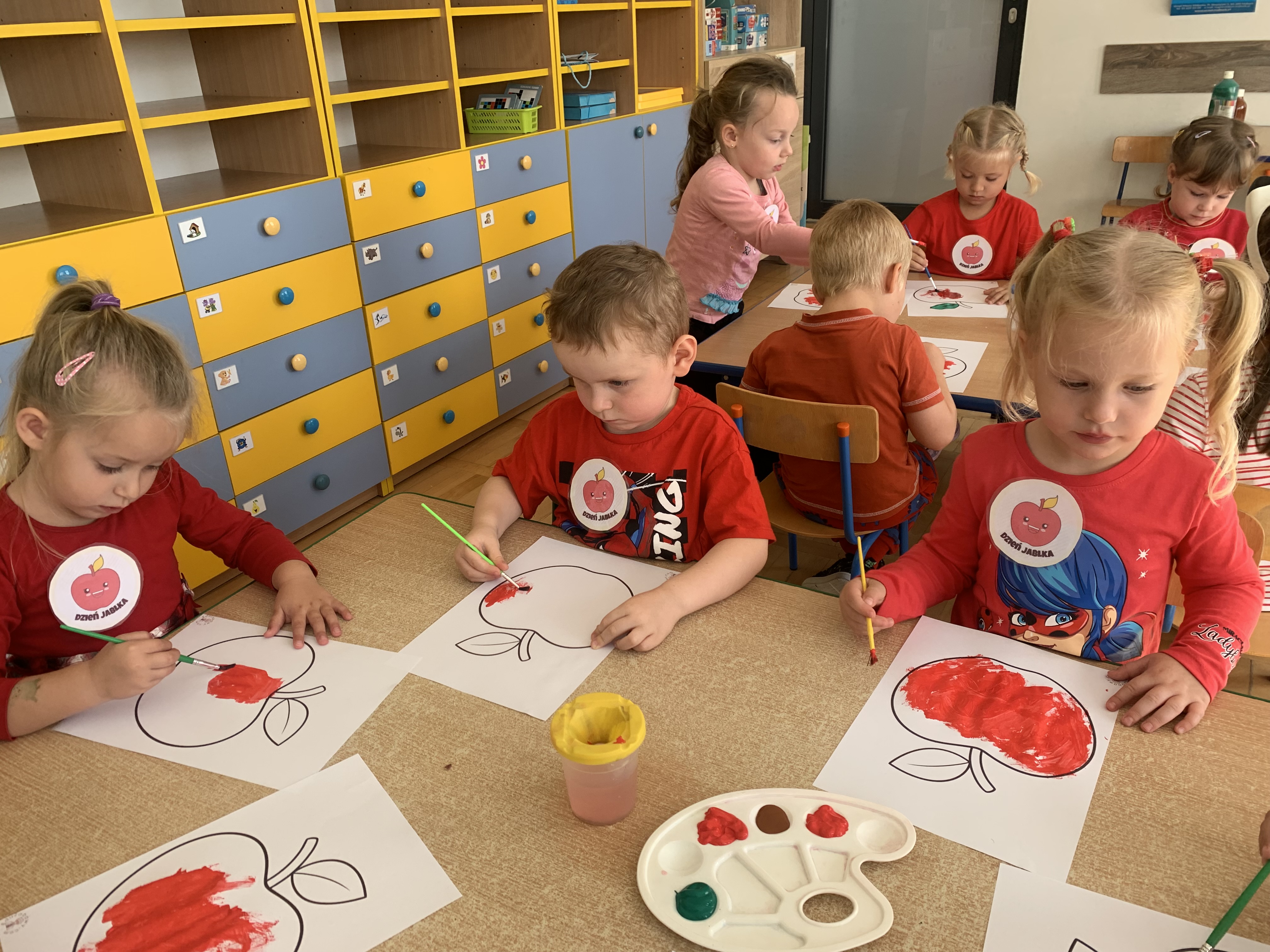 26 września w naszej grupie świętowaliśmy Dzień Jabłka. Podczas zajęć dzieci poznały budowę jabłka, dowiedziały się jakie przetwory można z niego przygotować oraz degustowały różne odmiany jabłek. Spróbowały także suszonych owoców,odkrywając ich wyjątkowy smak. Nie zabrakło również zabaw matematycznych - przeliczaliśmy jabłka oraz układaliśmy owocowe rytmy. Na zakończenie dzieci malowały farbami sylwetę jabłka, rozwijając swoją kreatywność i sprawność manualną. Był to dzień pełen wiedzy, zabawy i smaków!