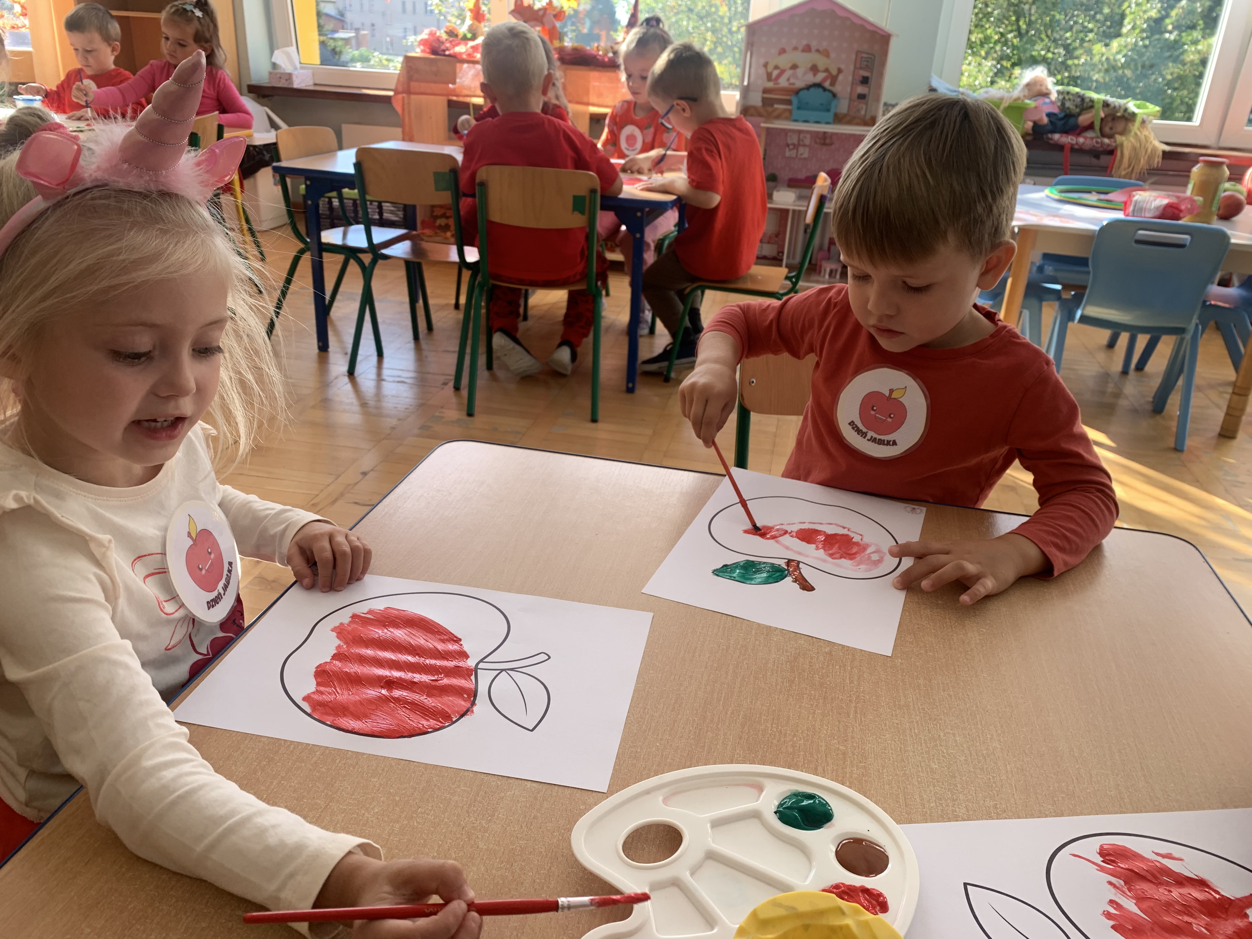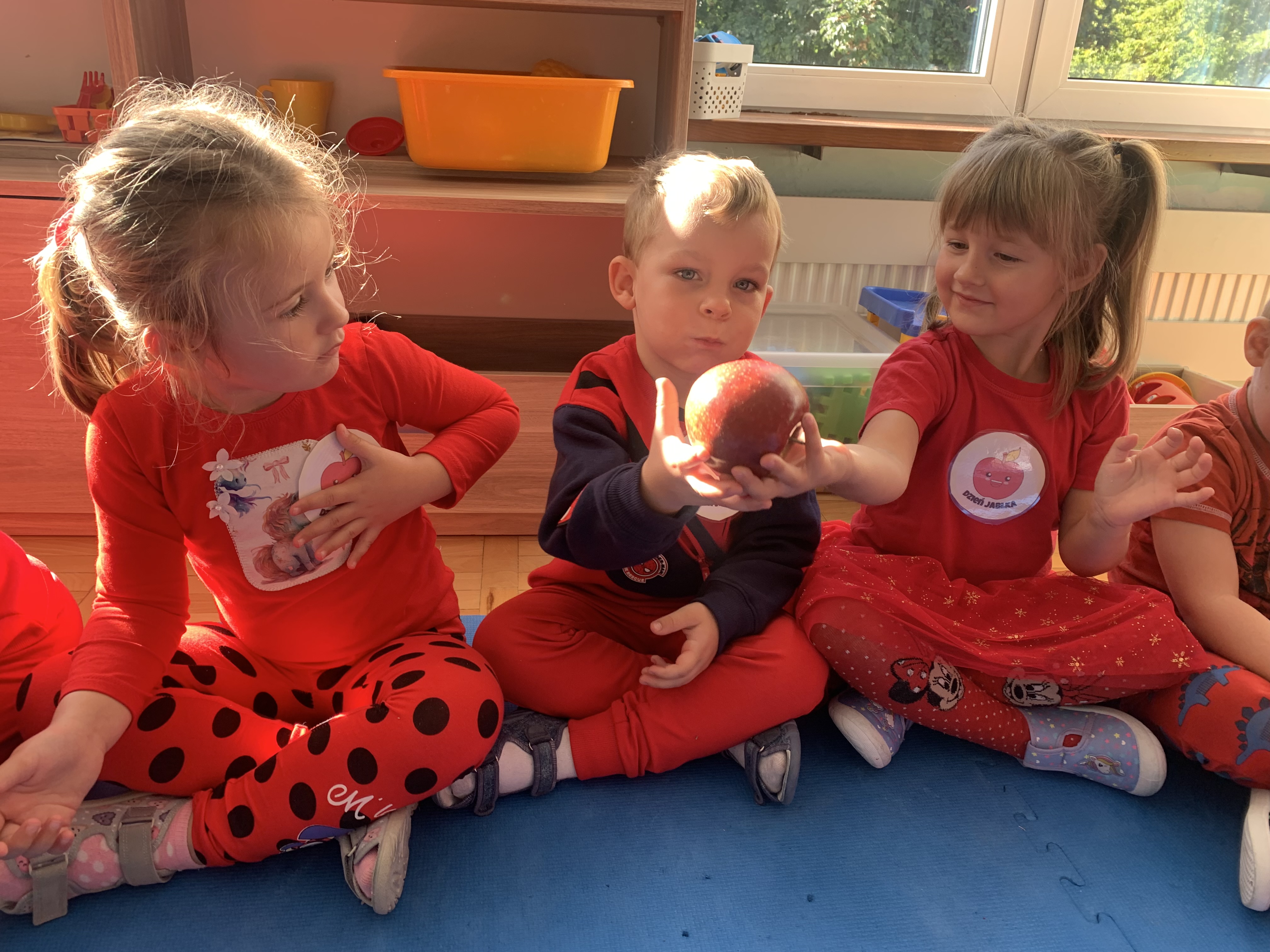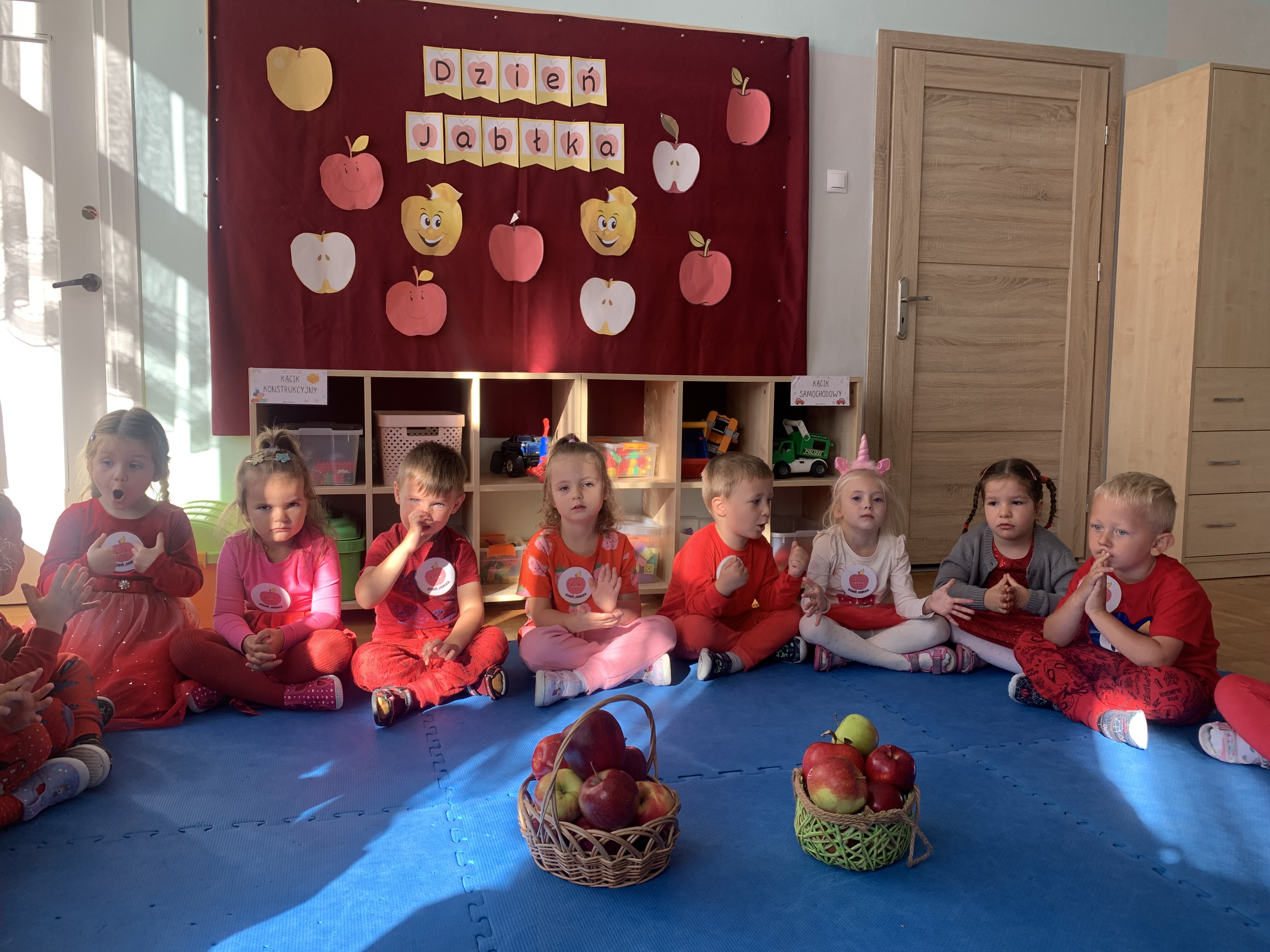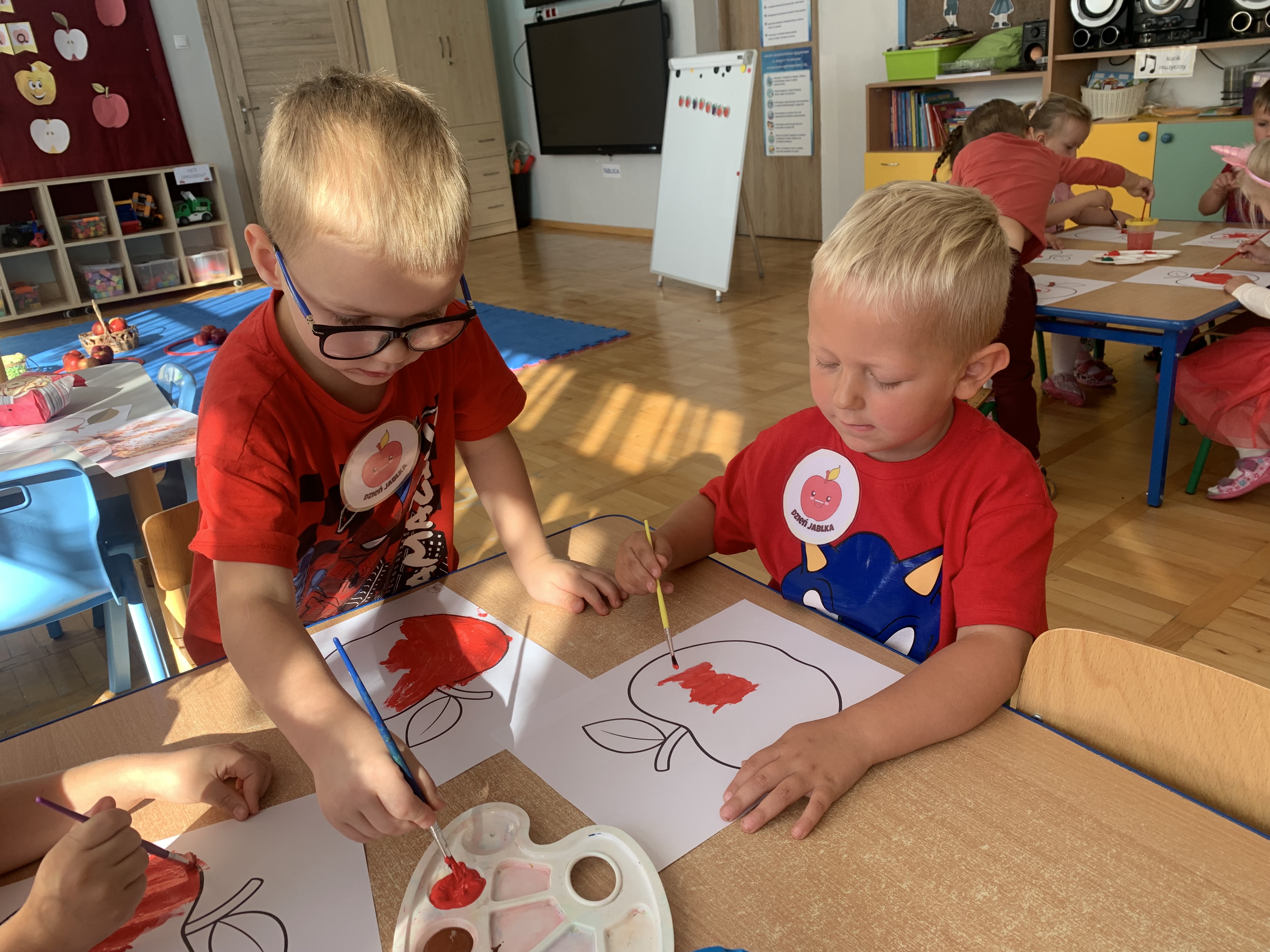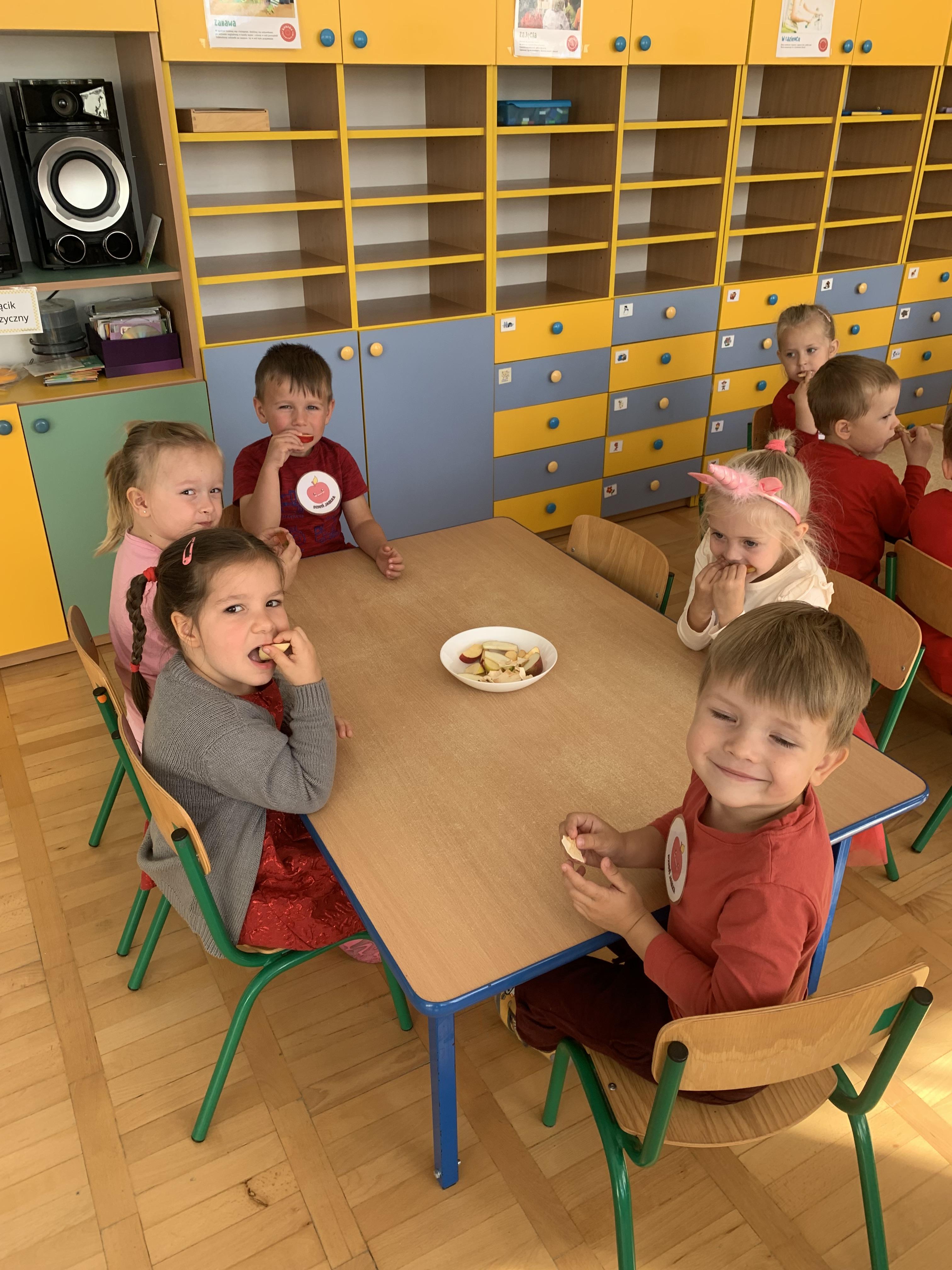 26 września w naszej grupie świętowaliśmy Dzień Jabłka. Podczas zajęć dzieci poznały budowę jabłka, dowiedziały się jakie przetwory można z niego przygotować oraz degustowały różne odmiany jabłek. Spróbowały także suszonych owoców,odkrywając ich wyjątkowy smak. Nie zabrakło również zabaw matematycznych - przeliczaliśmy jabłka oraz układaliśmy owocowe rytmy. Na zakończenie dzieci malowały farbami sylwetę jabłka, rozwijając swoją kreatywność i sprawność manualną. Był to dzień pełen wiedzy, zabawy i smaków!