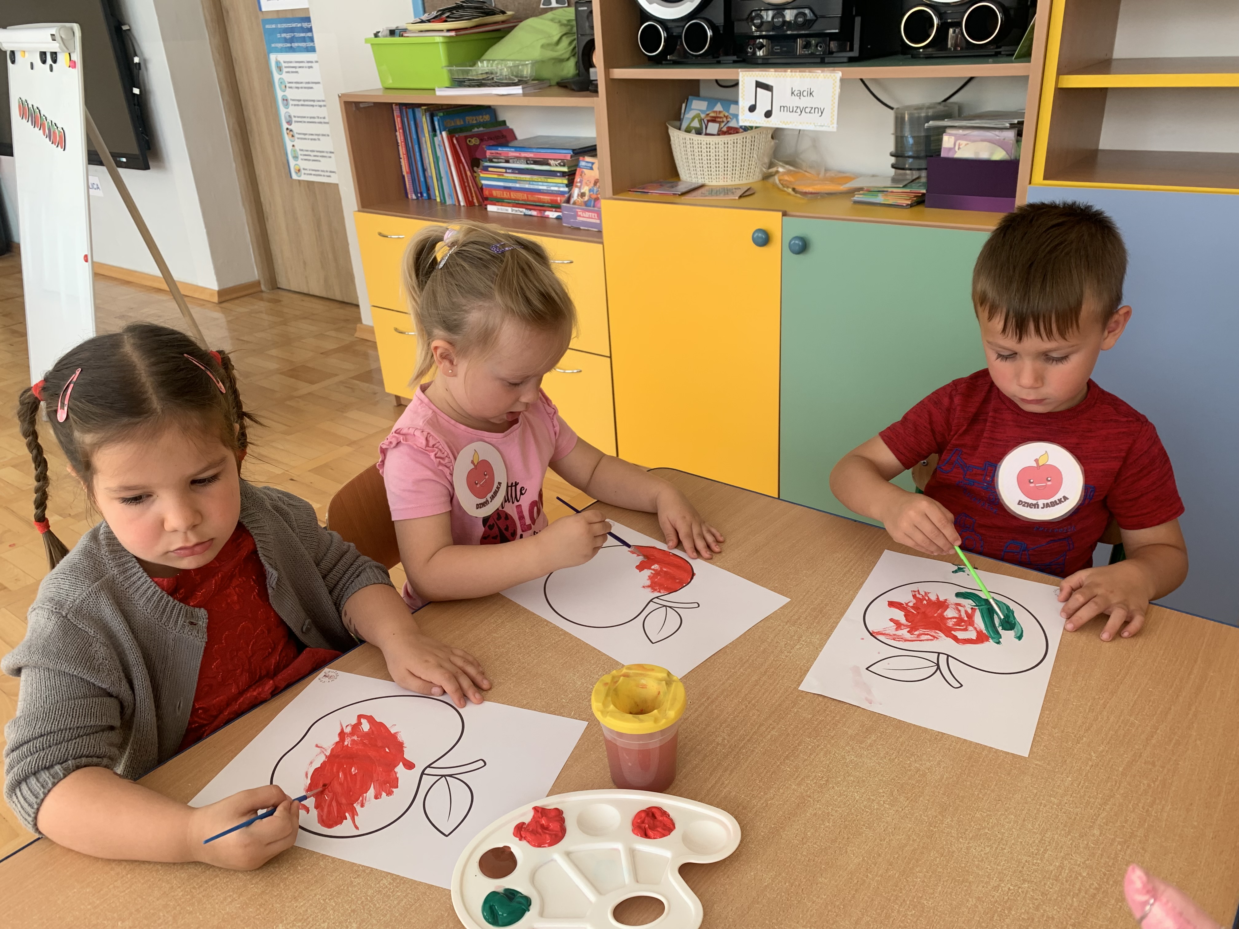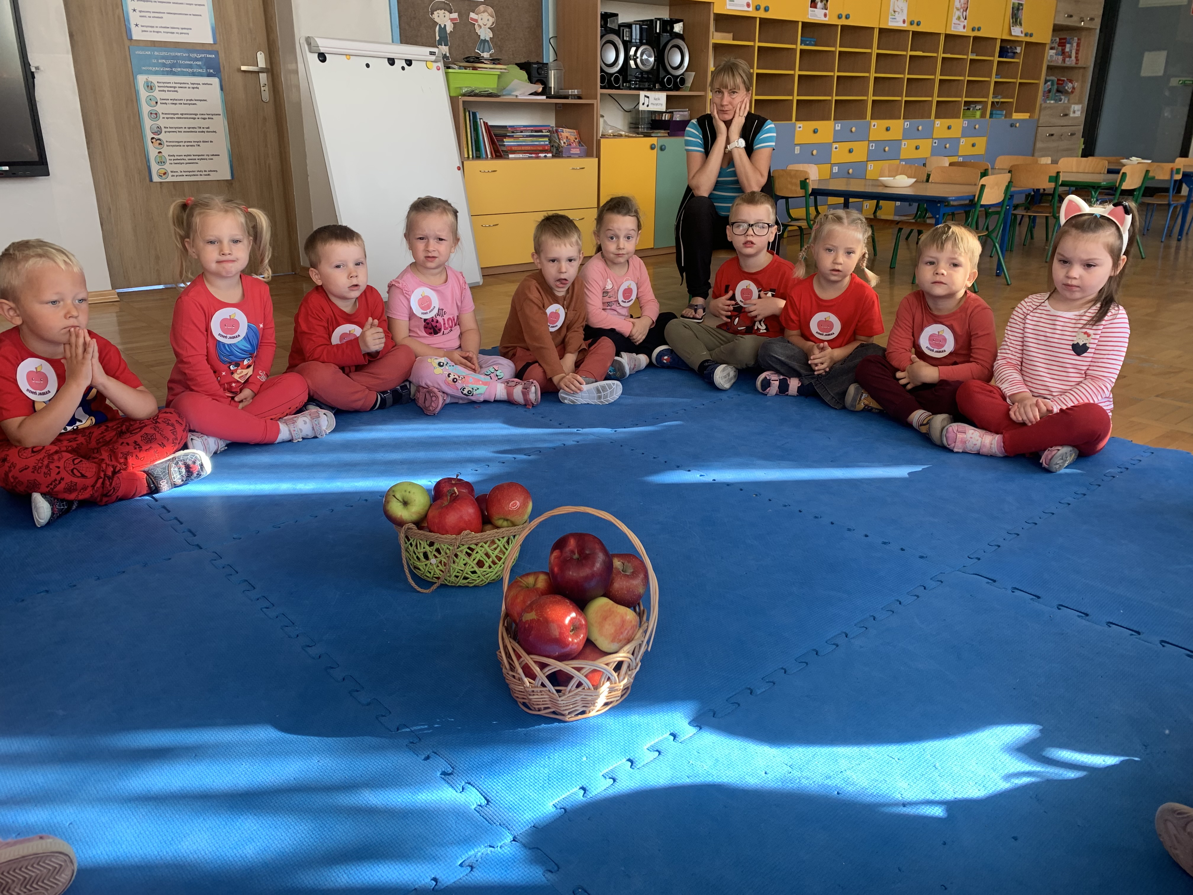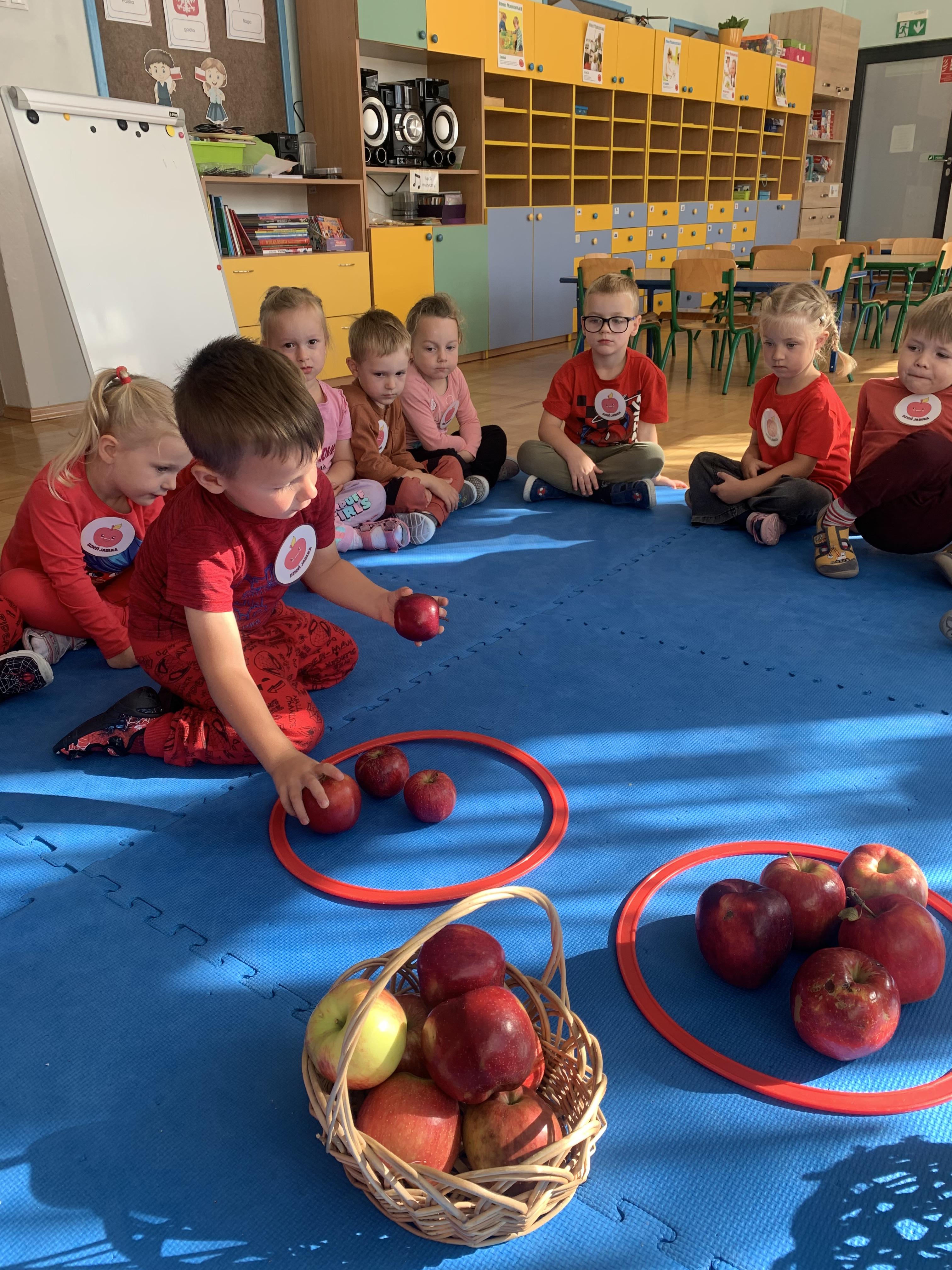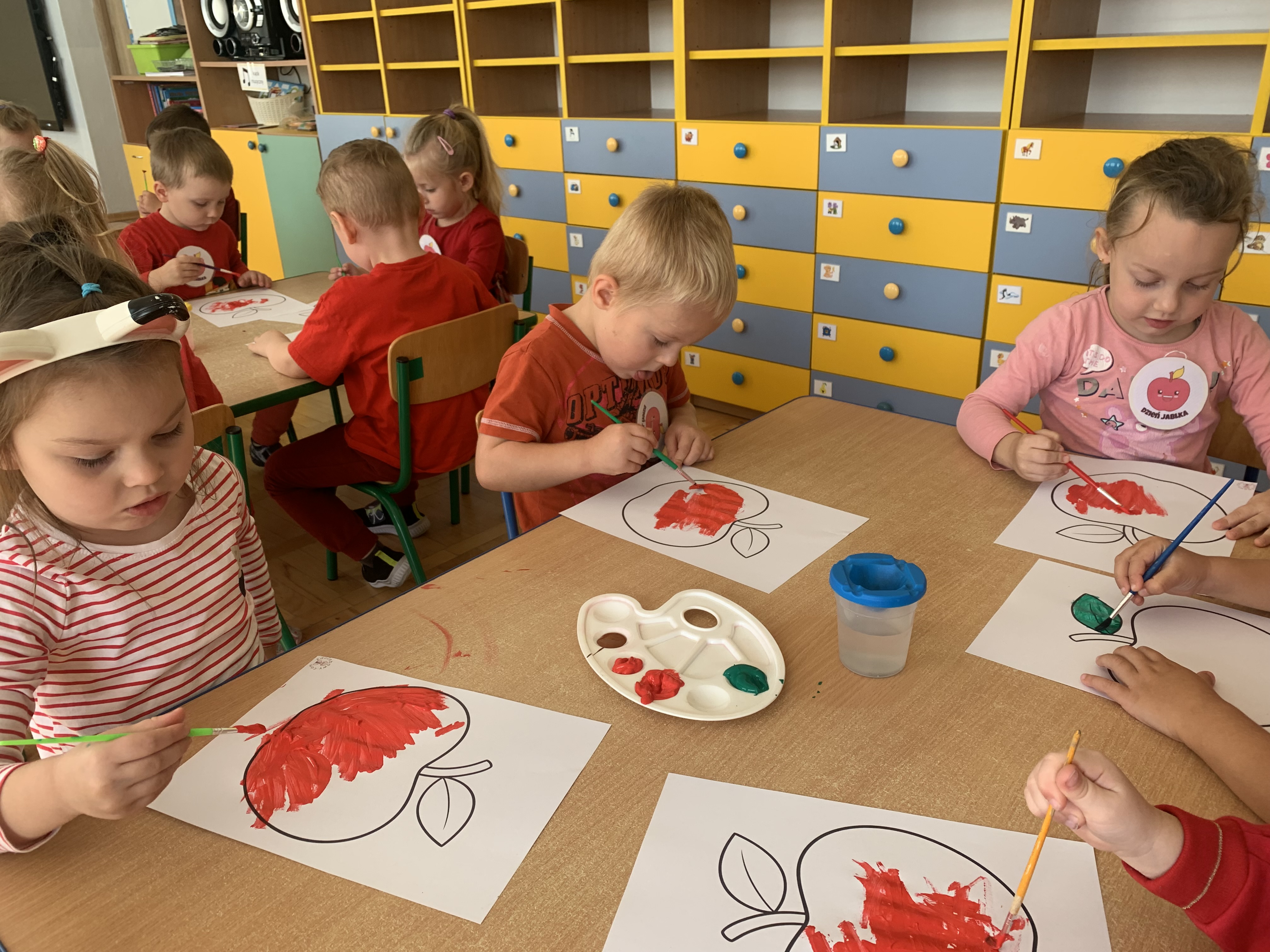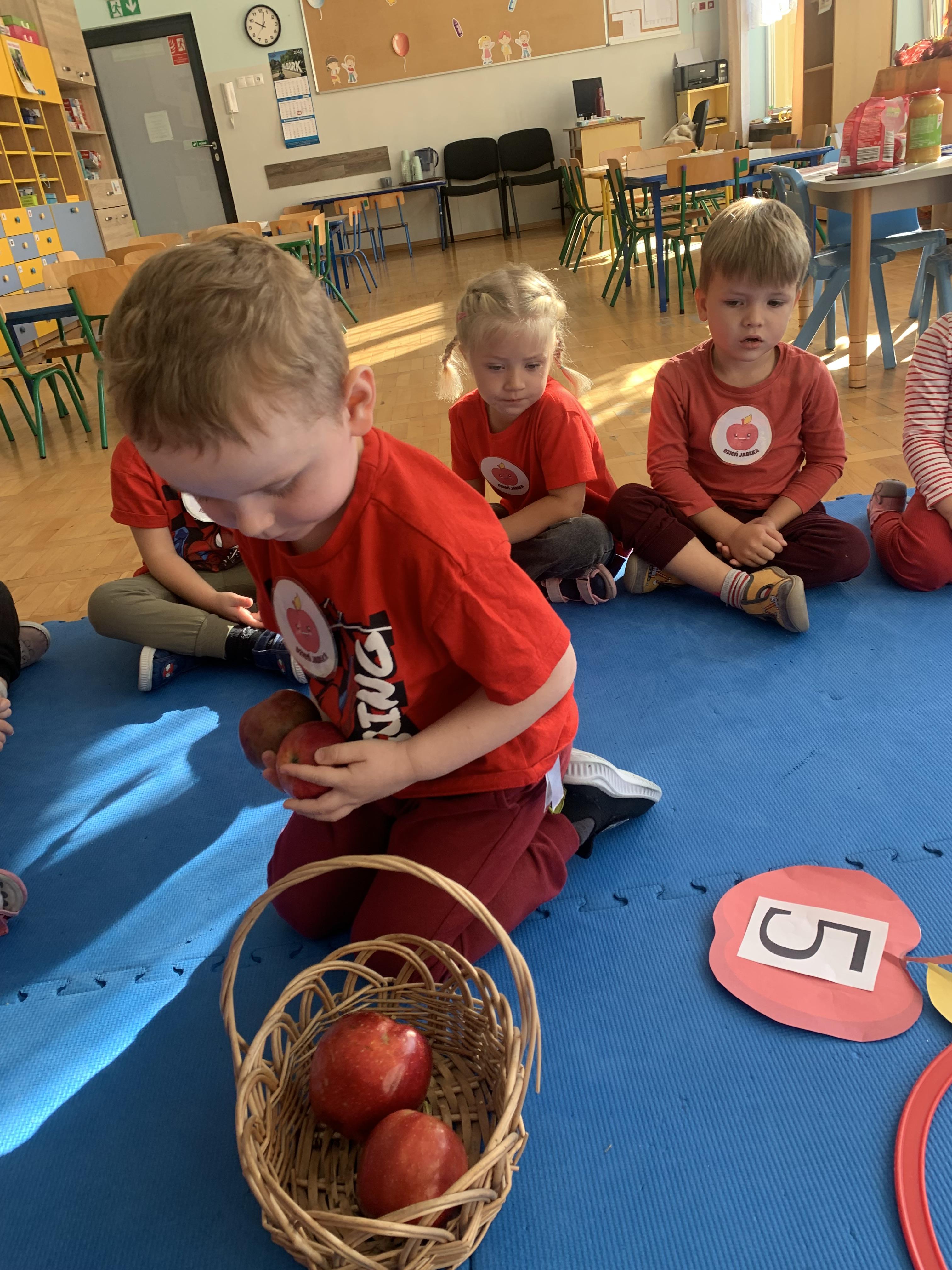 26 września w naszej grupie świętowaliśmy Dzień Jabłka. Podczas zajęć dzieci poznały budowę jabłka, dowiedziały się jakie przetwory można z niego przygotować oraz degustowały różne odmiany jabłek. Spróbowały także suszonych owoców,odkrywając ich wyjątkowy smak. Nie zabrakło również zabaw matematycznych - przeliczaliśmy jabłka oraz układaliśmy owocowe rytmy. Na zakończenie dzieci malowały farbami sylwetę jabłka, rozwijając swoją kreatywność i sprawność manualną. Był to dzień pełen wiedzy, zabawy i smaków!
