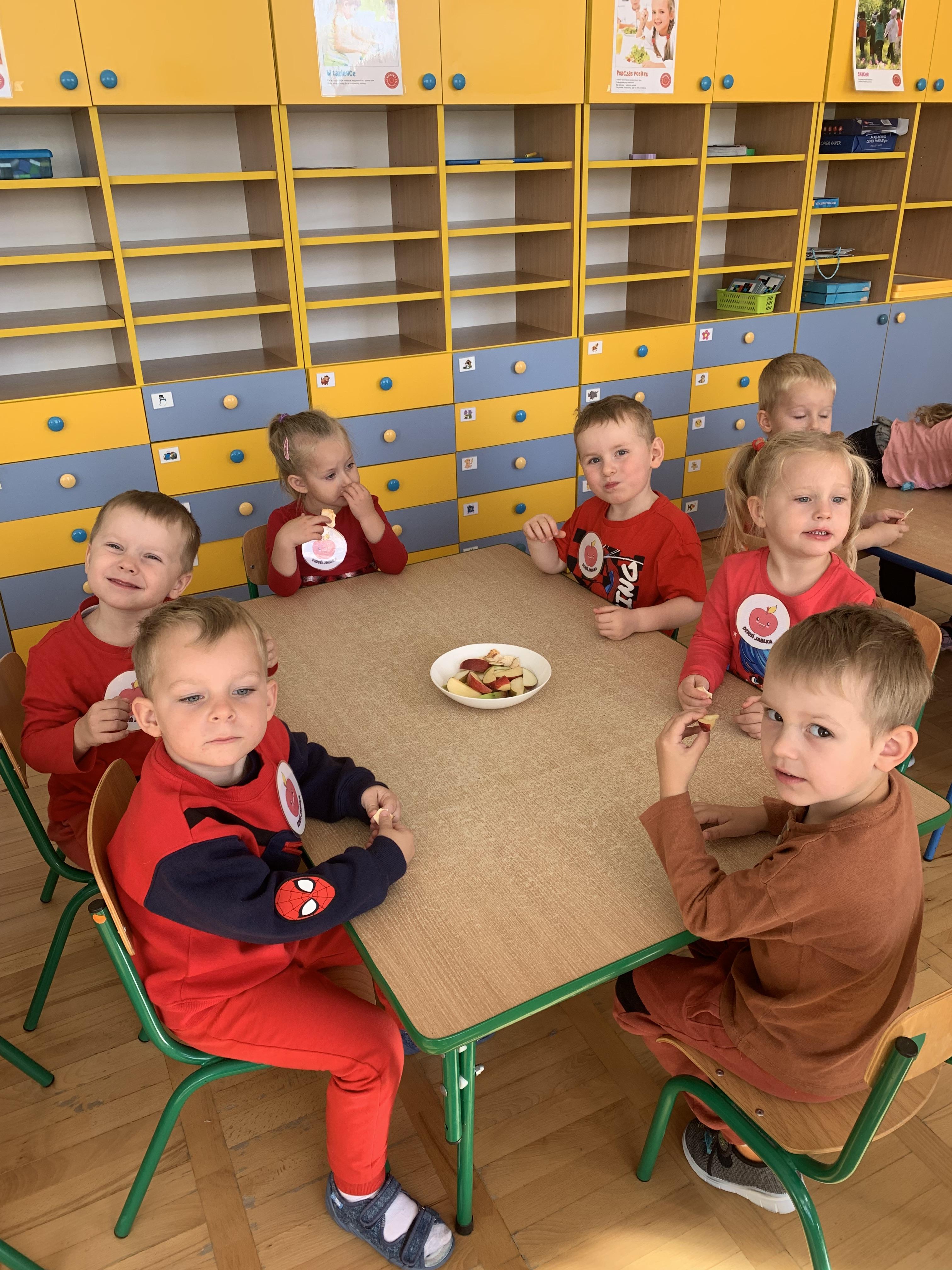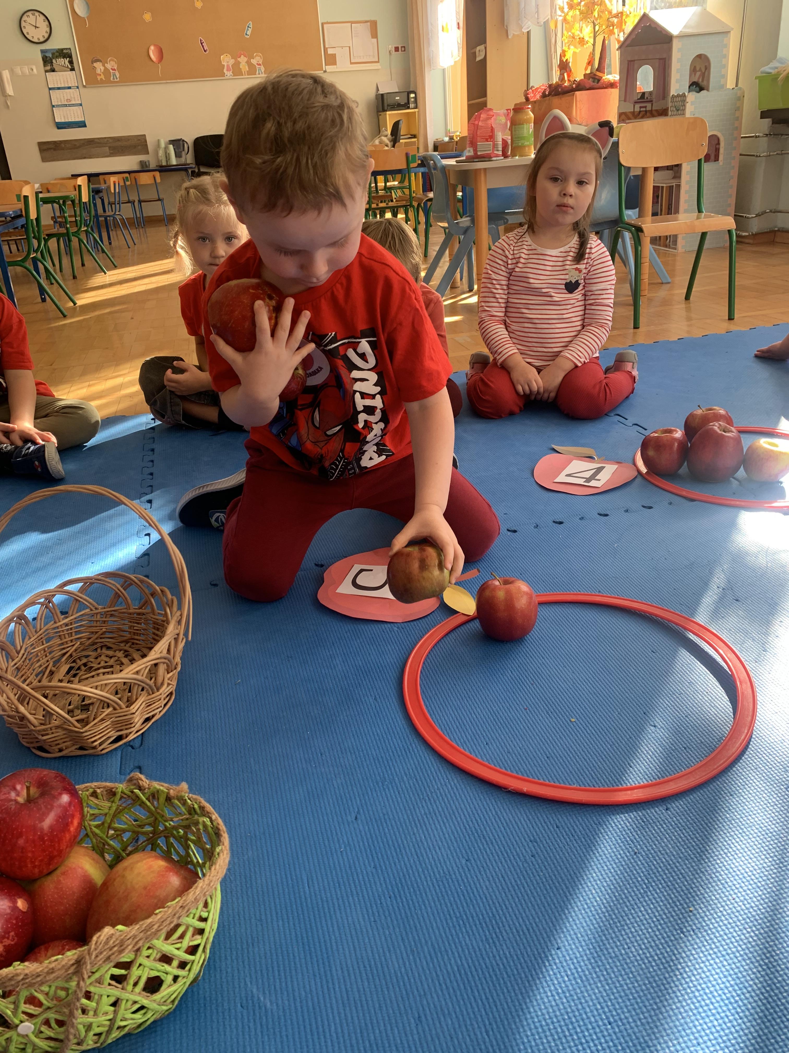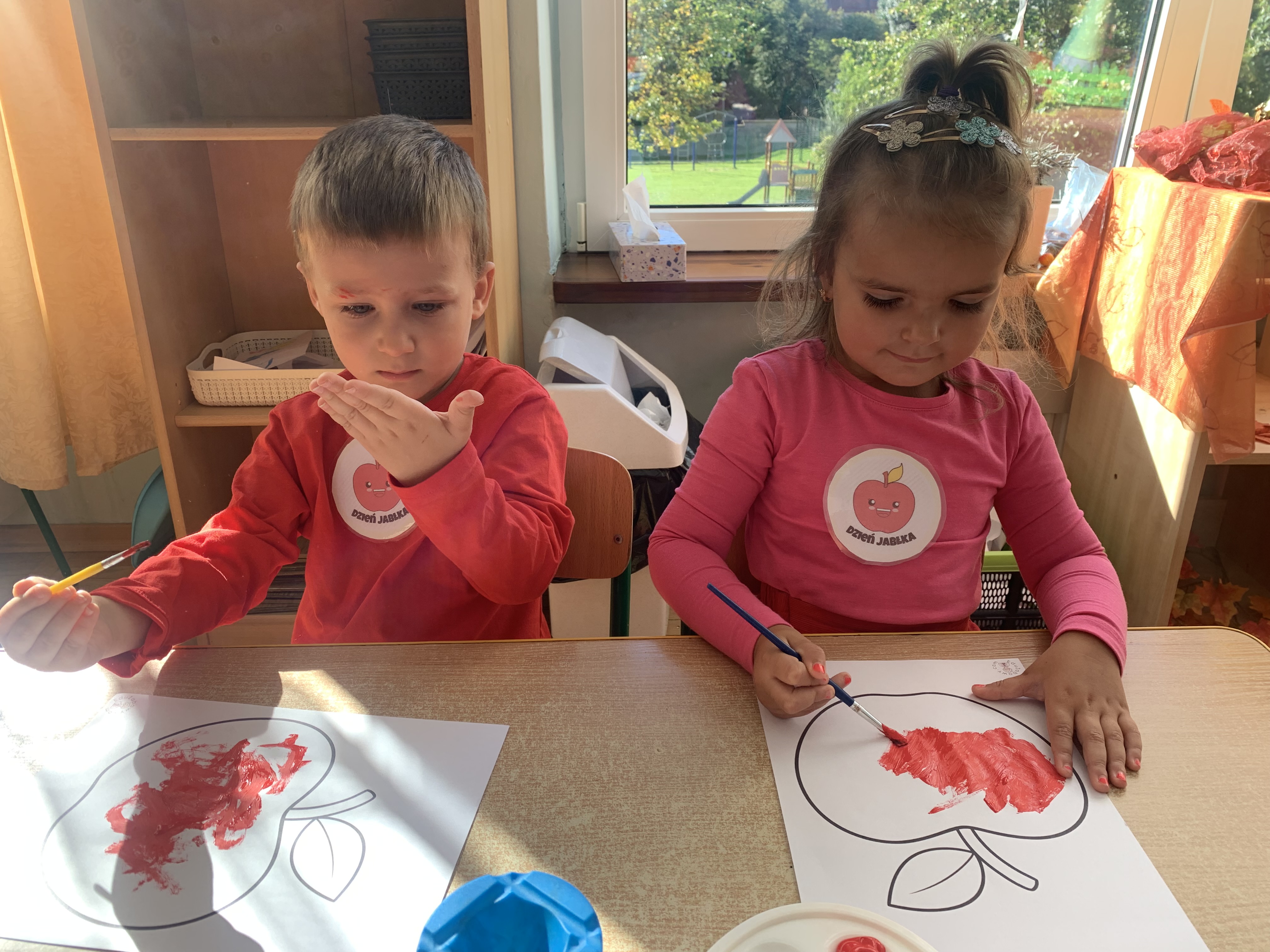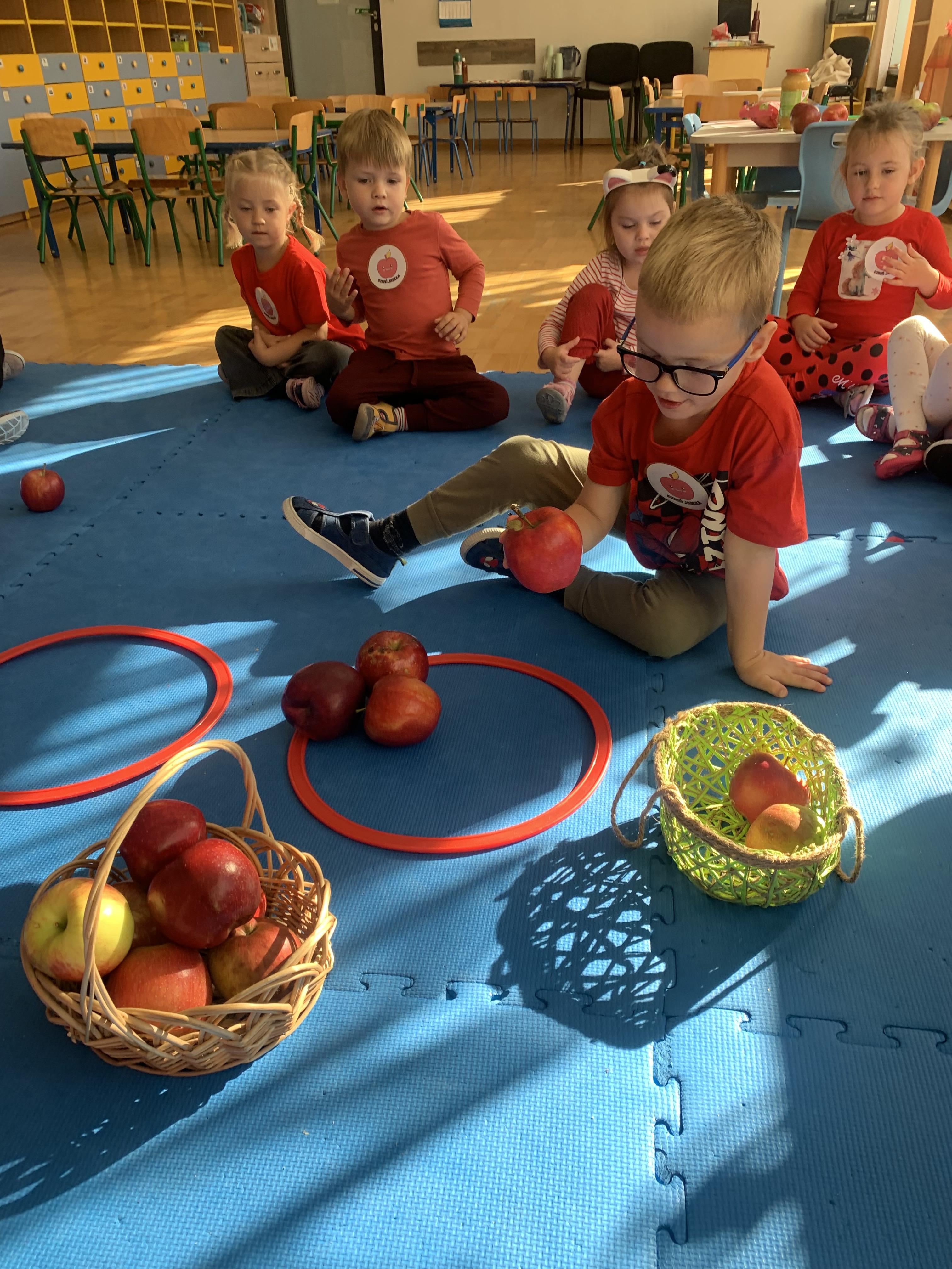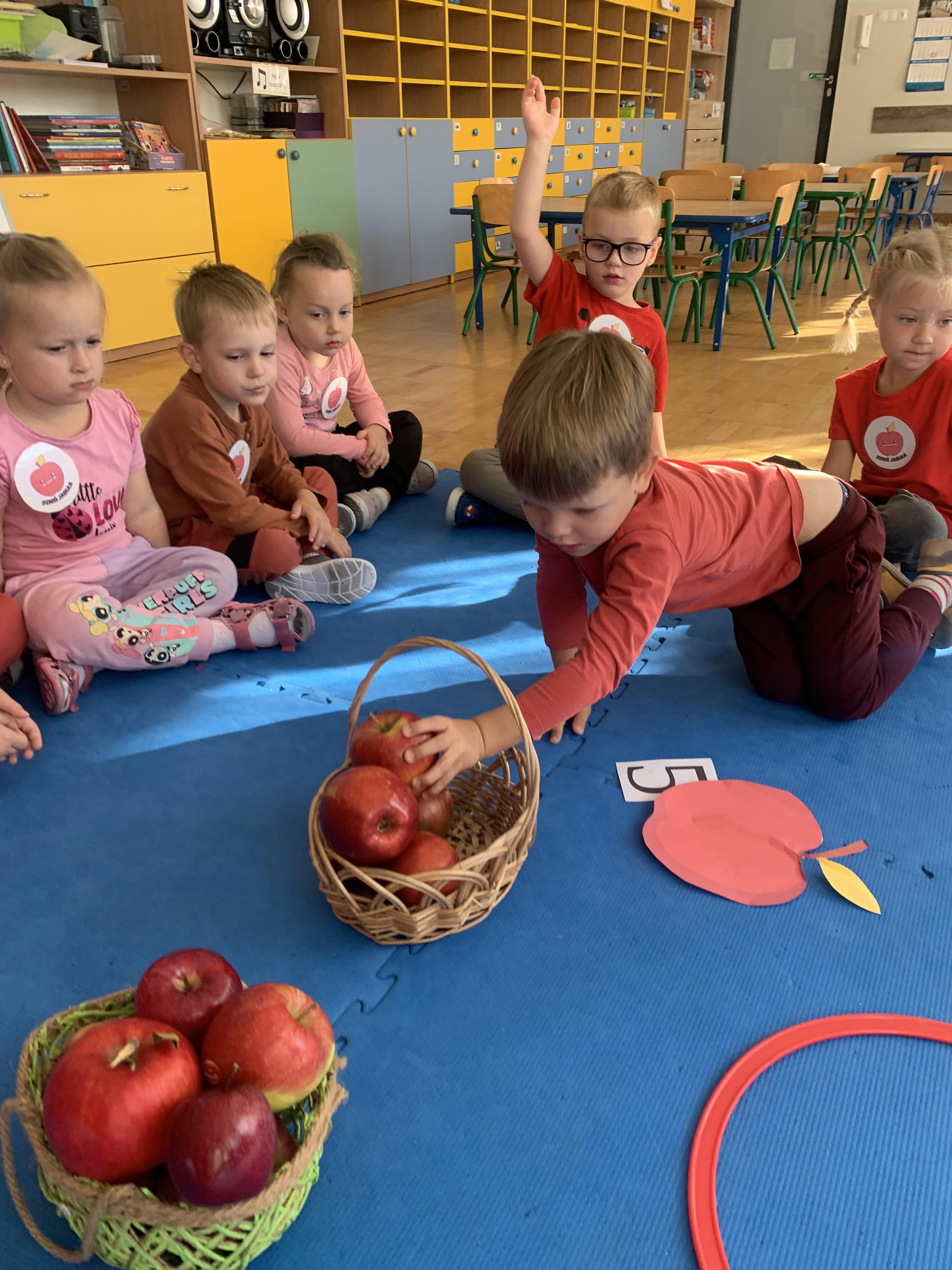 26 września w naszej grupie świętowaliśmy Dzień Jabłka. Podczas zajęć dzieci poznały budowę jabłka, dowiedziały się jakie przetwory można z niego przygotować oraz degustowały różne odmiany jabłek. Spróbowały także suszonych owoców,odkrywając ich wyjątkowy smak. Nie zabrakło również zabaw matematycznych - przeliczaliśmy jabłka oraz układaliśmy owocowe rytmy. Na zakończenie dzieci malowały farbami sylwetę jabłka, rozwijając swoją kreatywność i sprawność manualną. Był to dzień pełen wiedzy, zabawy i smaków!
