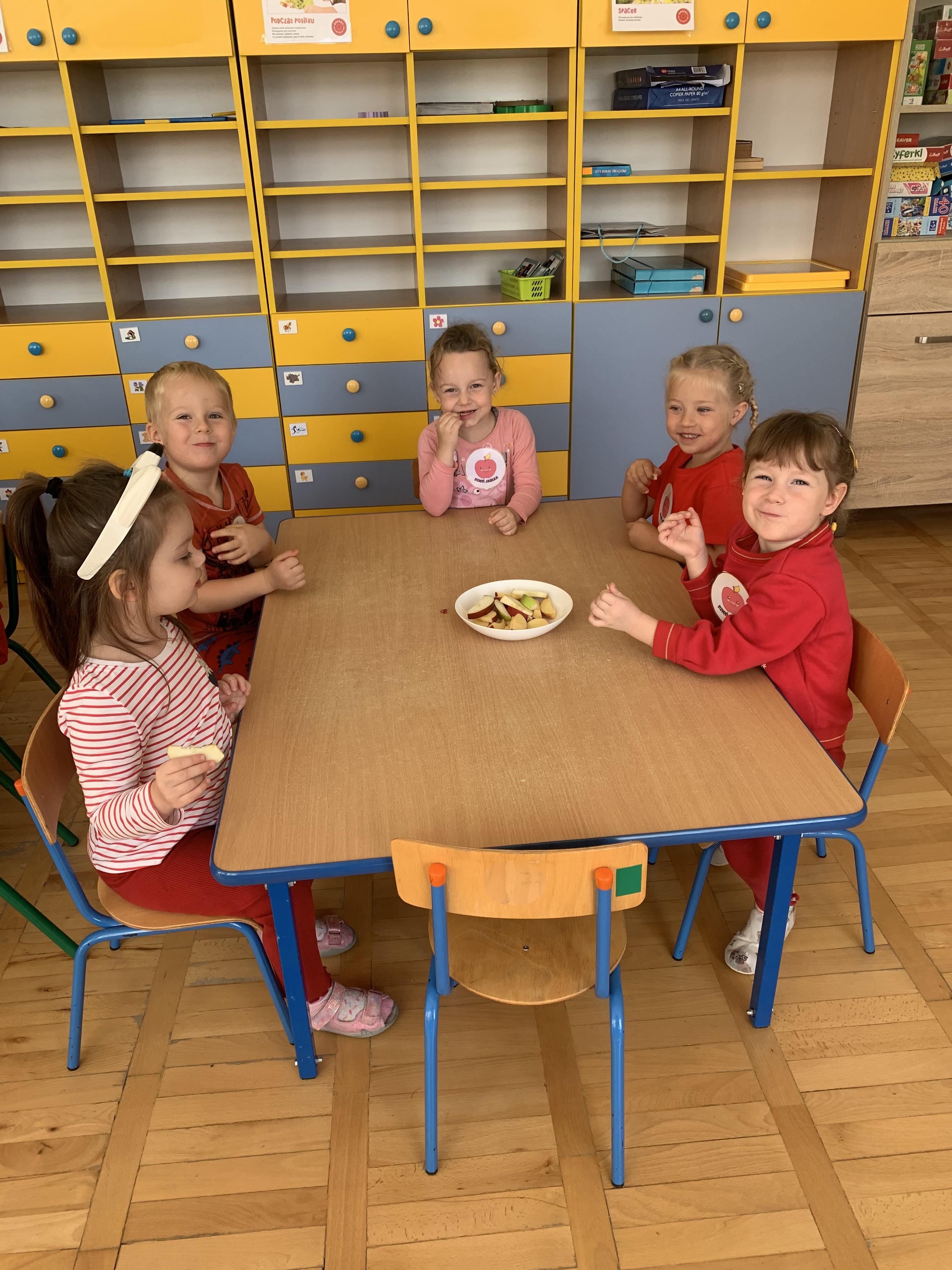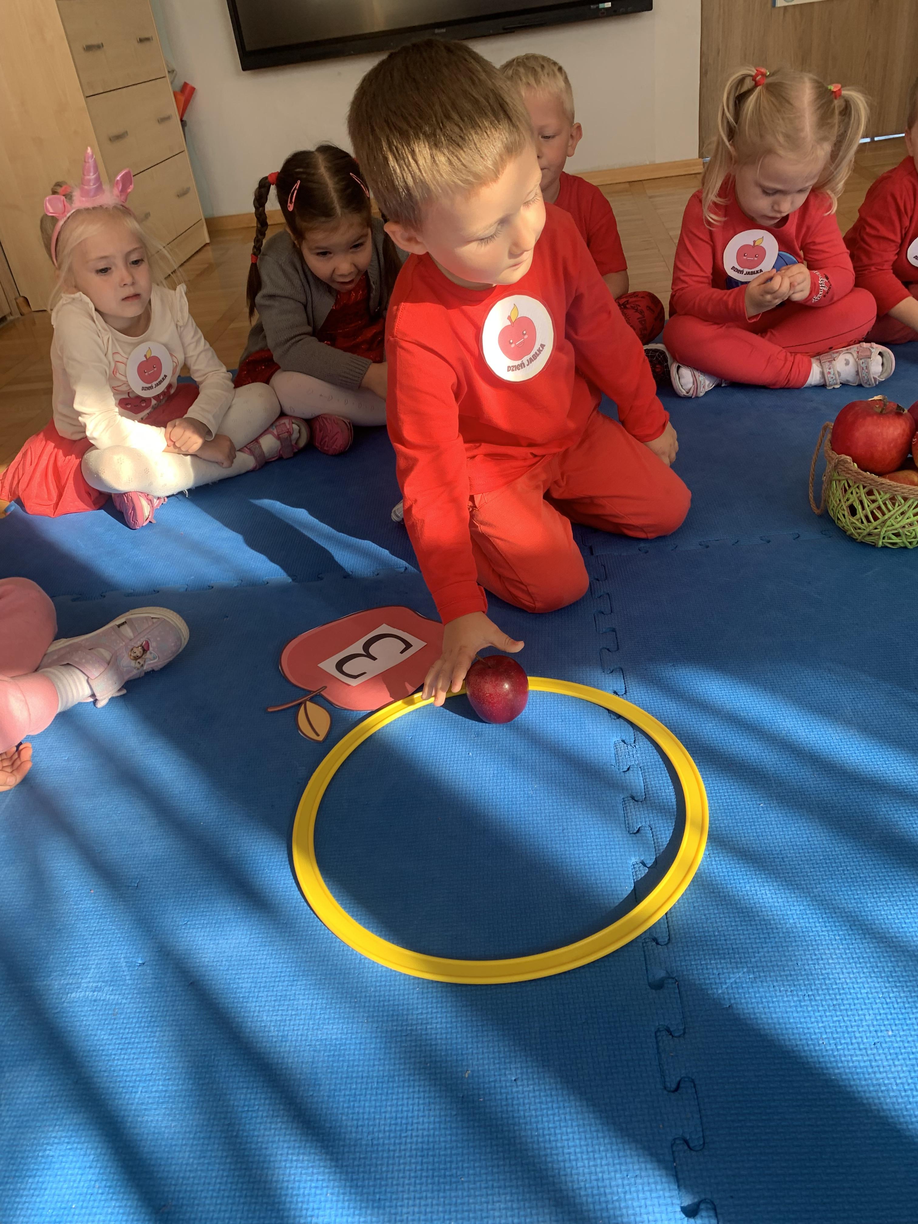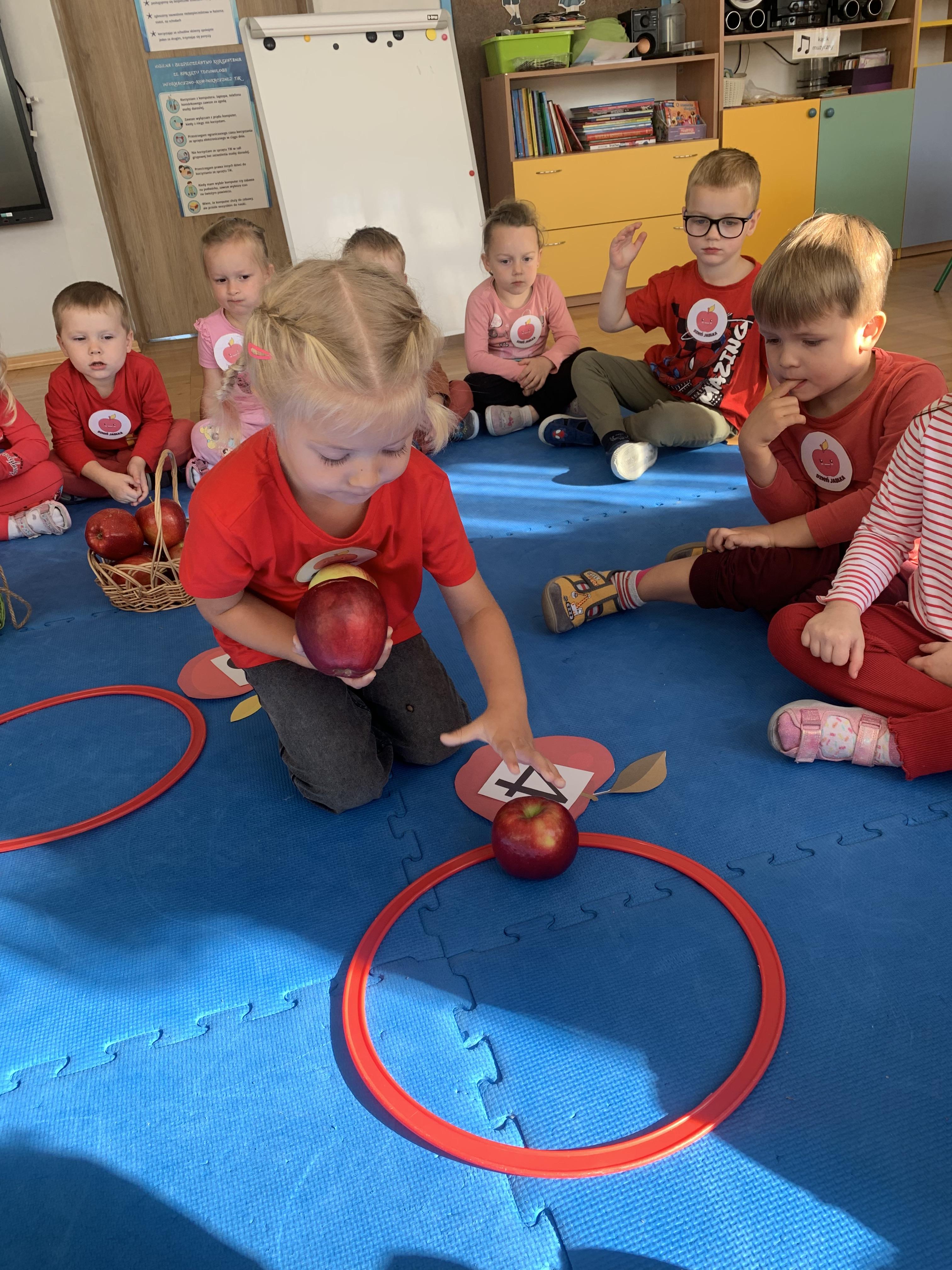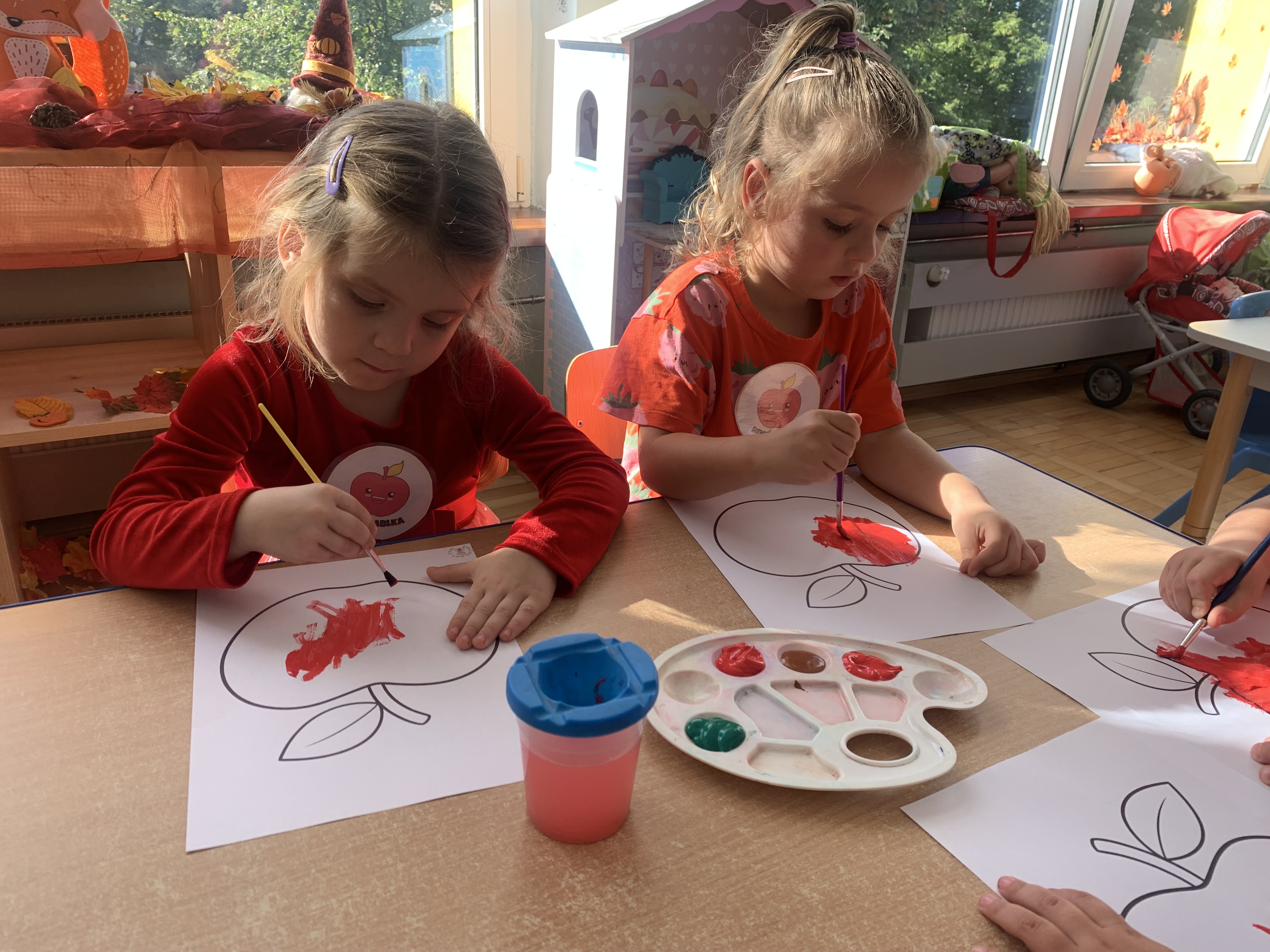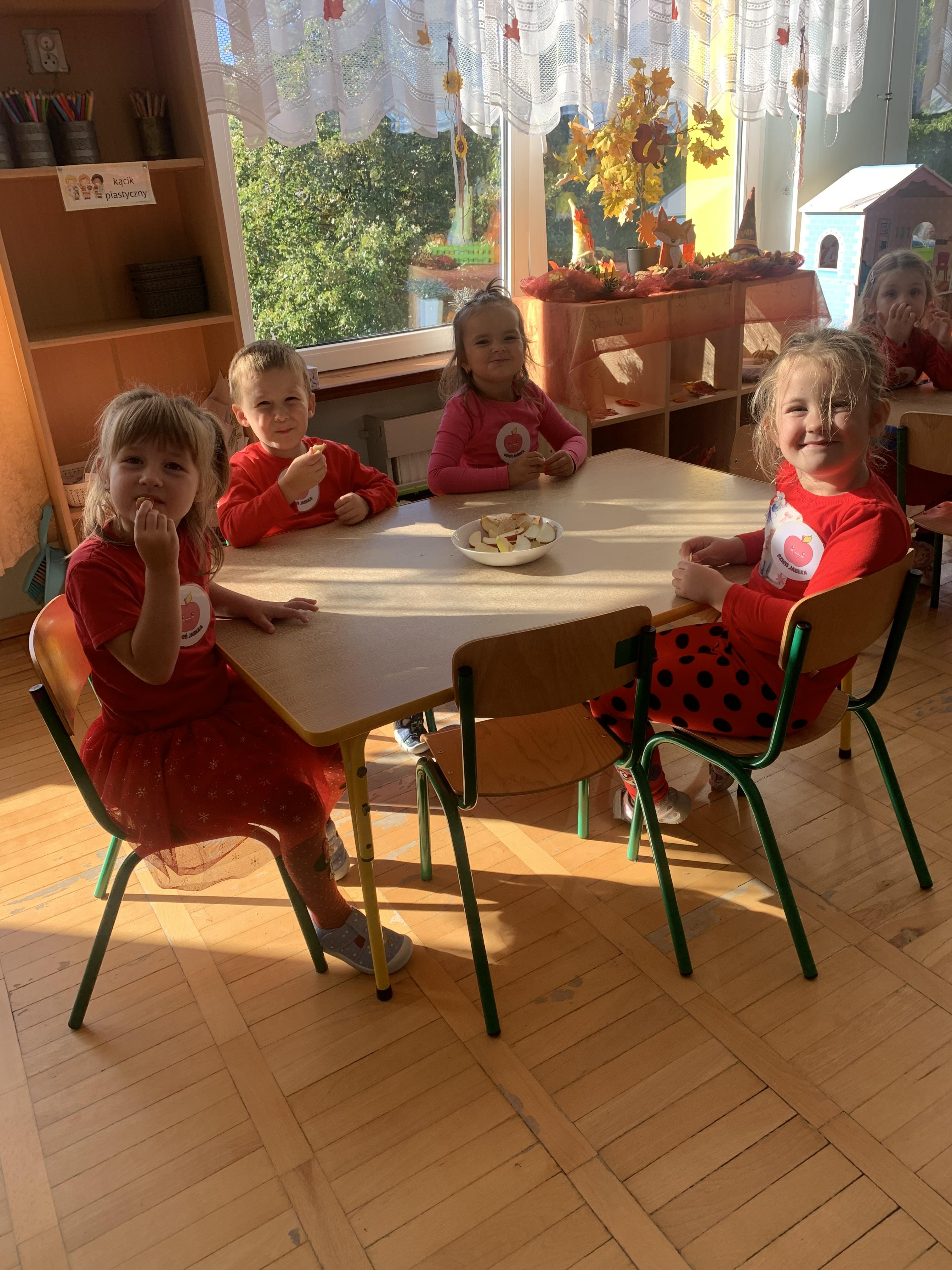 26 września w naszej grupie świętowaliśmy Dzień Jabłka. Podczas zajęć dzieci poznały budowę jabłka, dowiedziały się jakie przetwory można z niego przygotować oraz degustowały różne odmiany jabłek. Spróbowały także suszonych owoców,odkrywając ich wyjątkowy smak. Nie zabrakło również zabaw matematycznych - przeliczaliśmy jabłka oraz układaliśmy owocowe rytmy. Na zakończenie dzieci malowały farbami sylwetę jabłka, rozwijając swoją kreatywność i sprawność manualną. Był to dzień pełen wiedzy, zabawy i smaków!