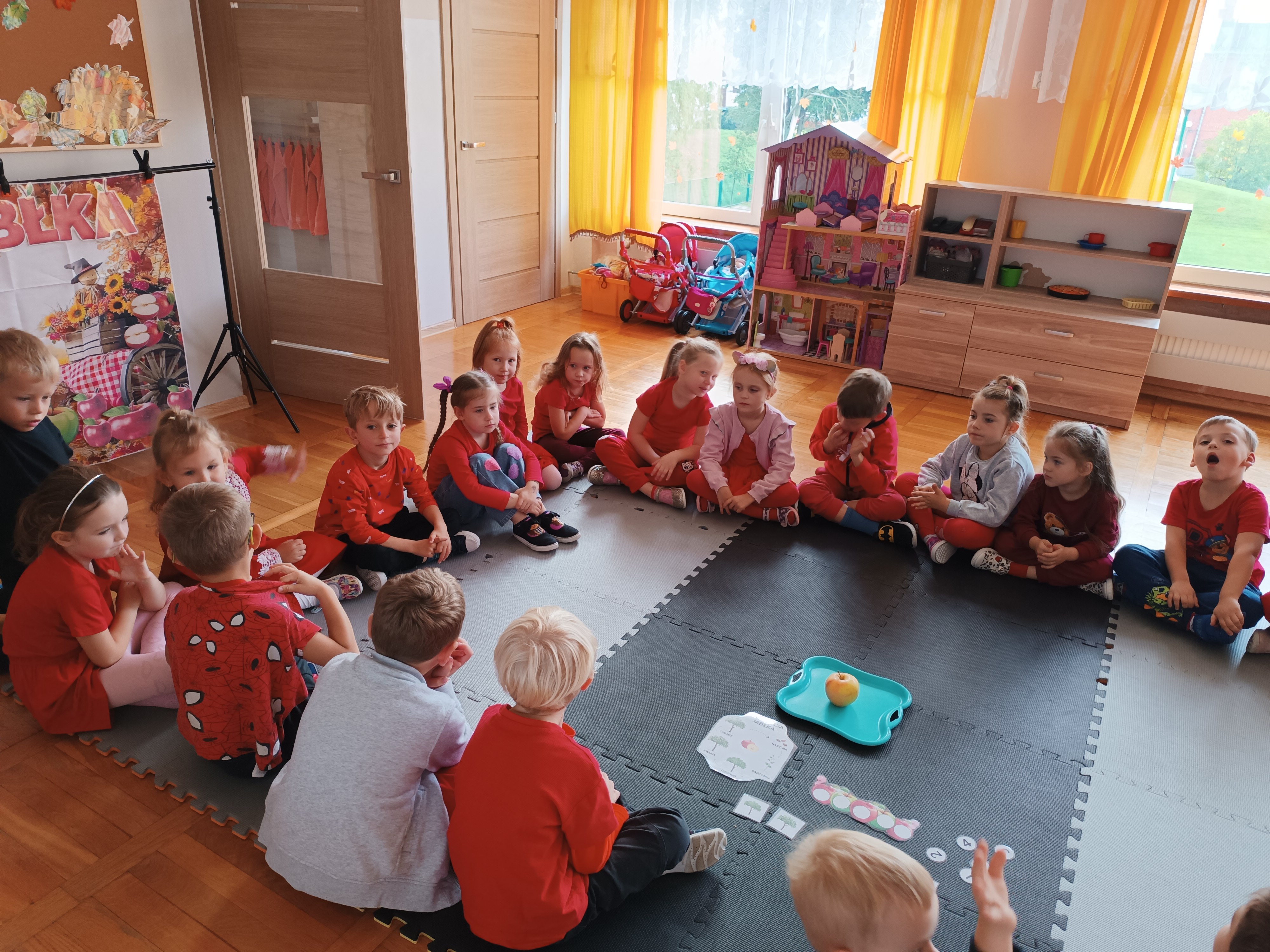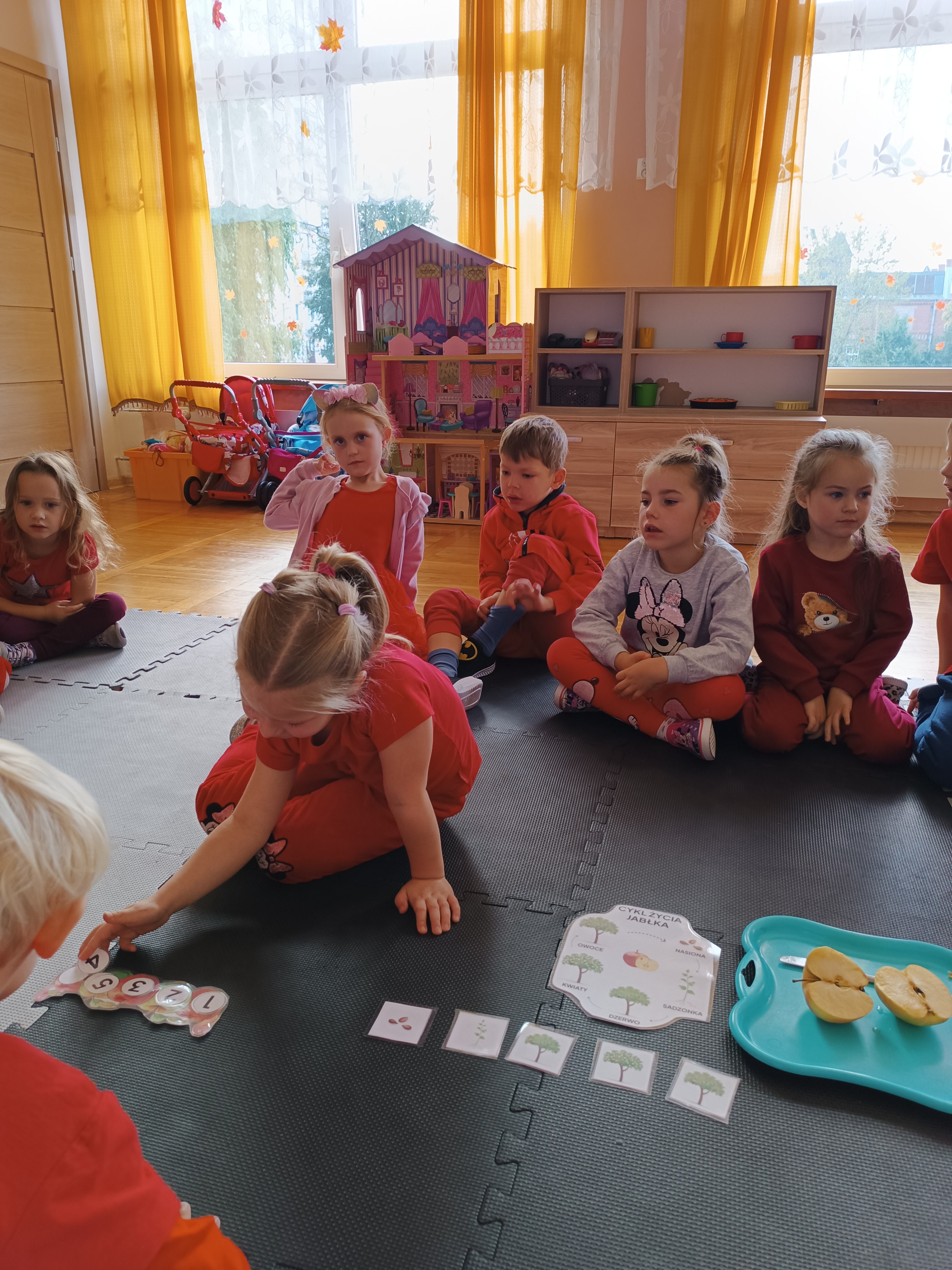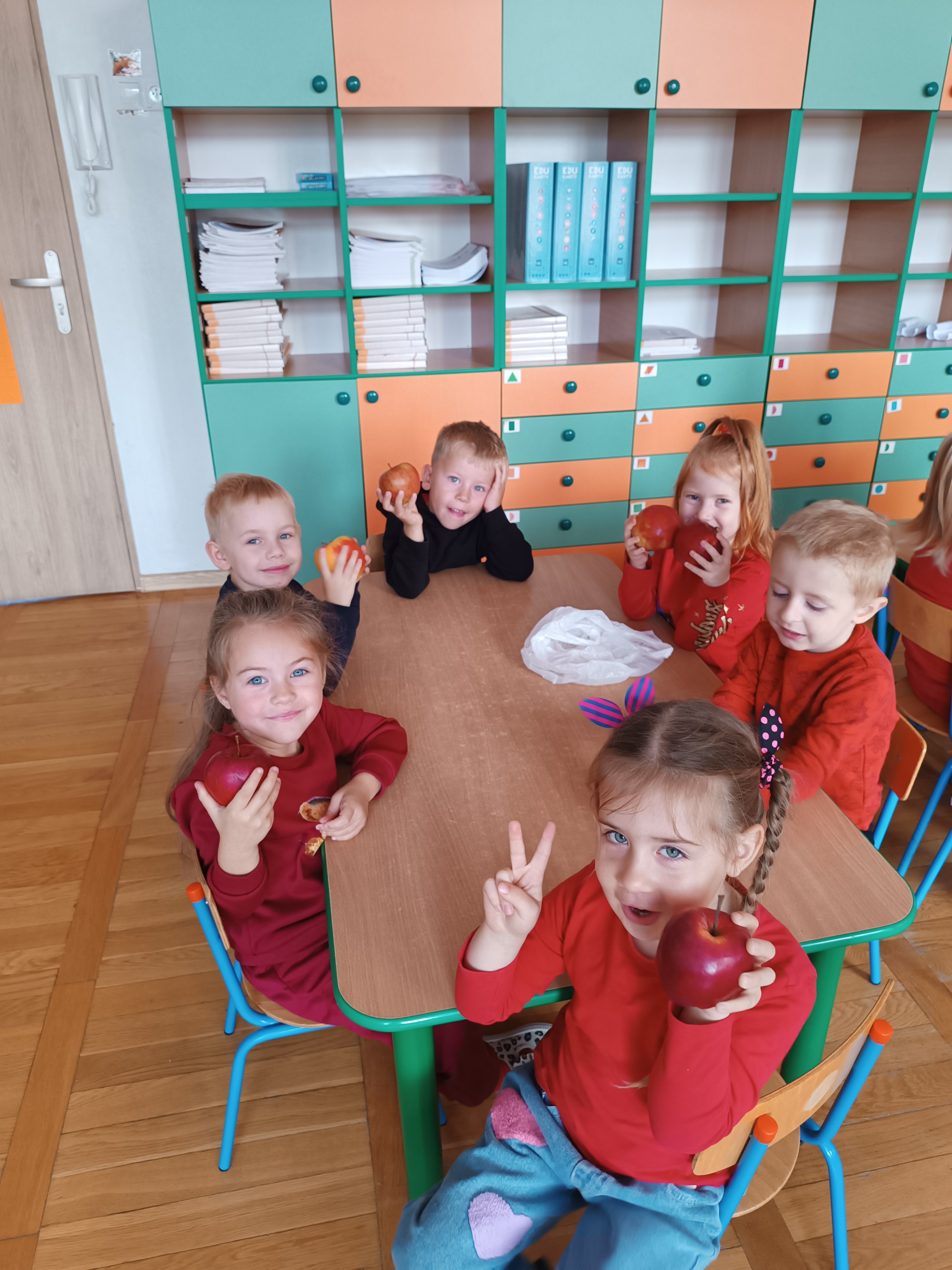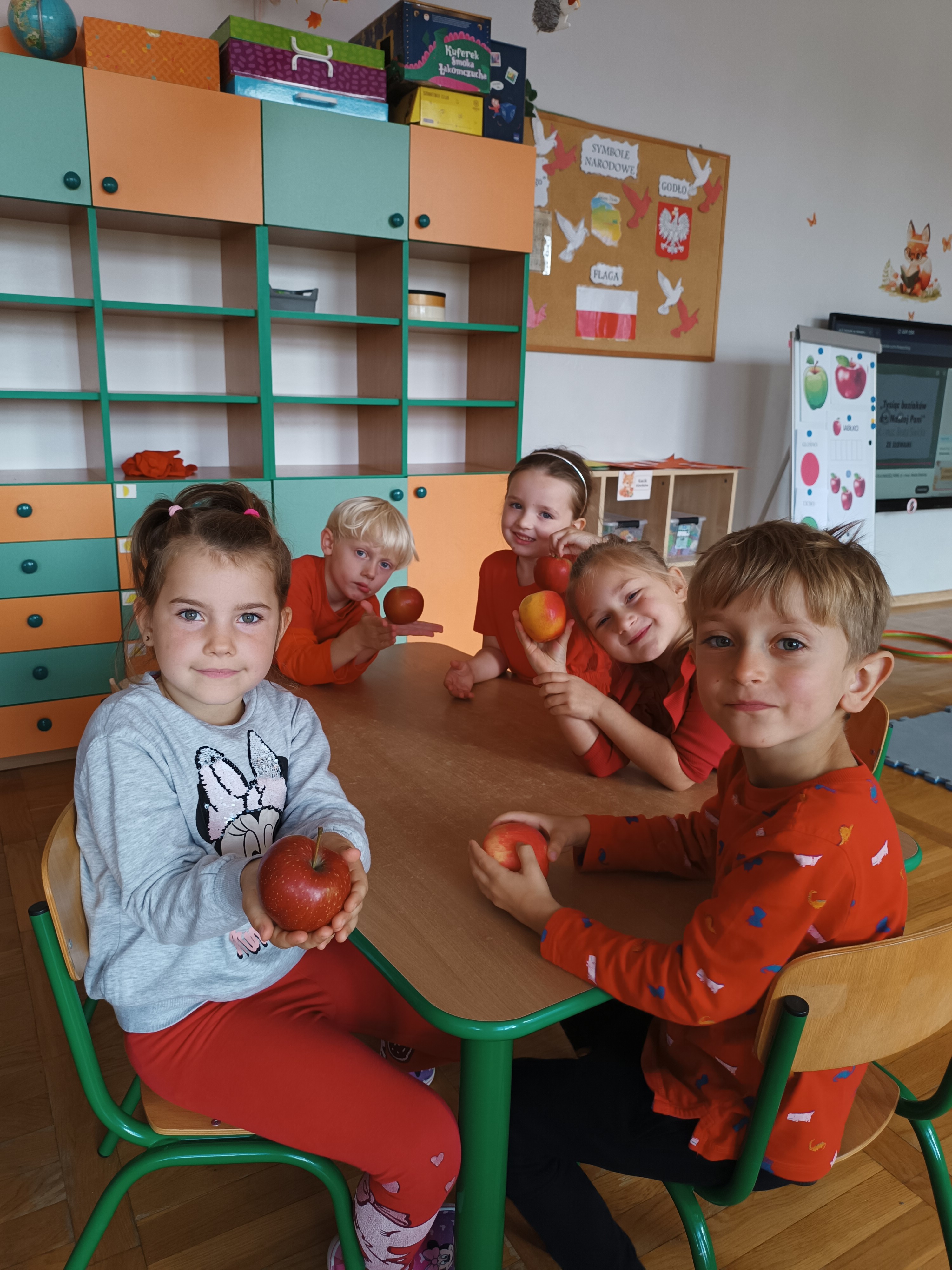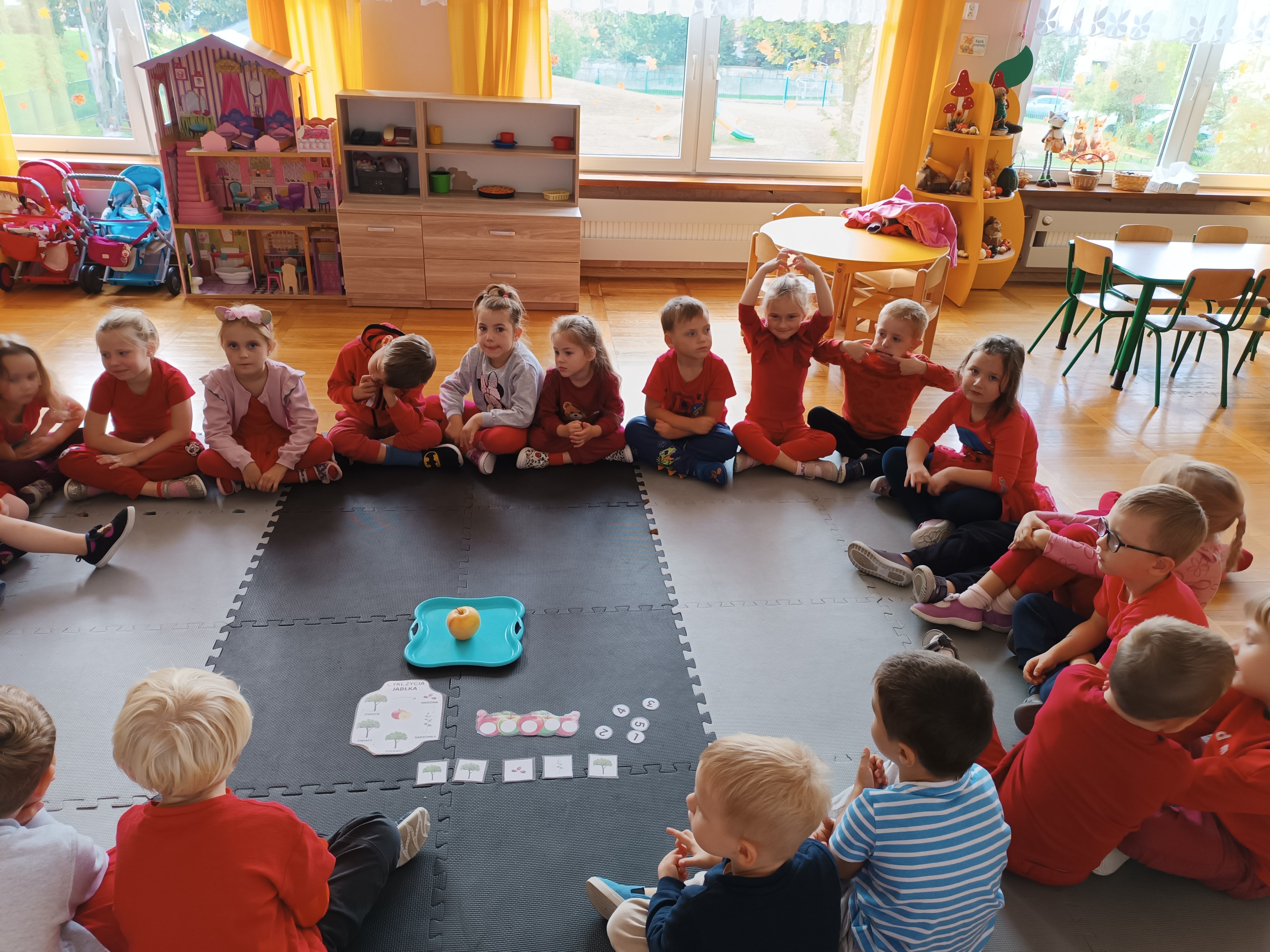 W dniu 29 września dzieci z grupy obchodziły dzień jabłka. Poznały budowę jabłka, jego kształty, kolor- dzieci mogły dotykać, wąchać, smakować. Następnie miały degustację - opowiadały o ich smaku. Poznali cykl powstania jabłka ,,od pesteczki do owocu". Przeliczali i tworzyli działania matematyczne z udziałem jabłek. Na koniec wykonali wspólną zespołową pracę z wykorzystaniem bibuły.
