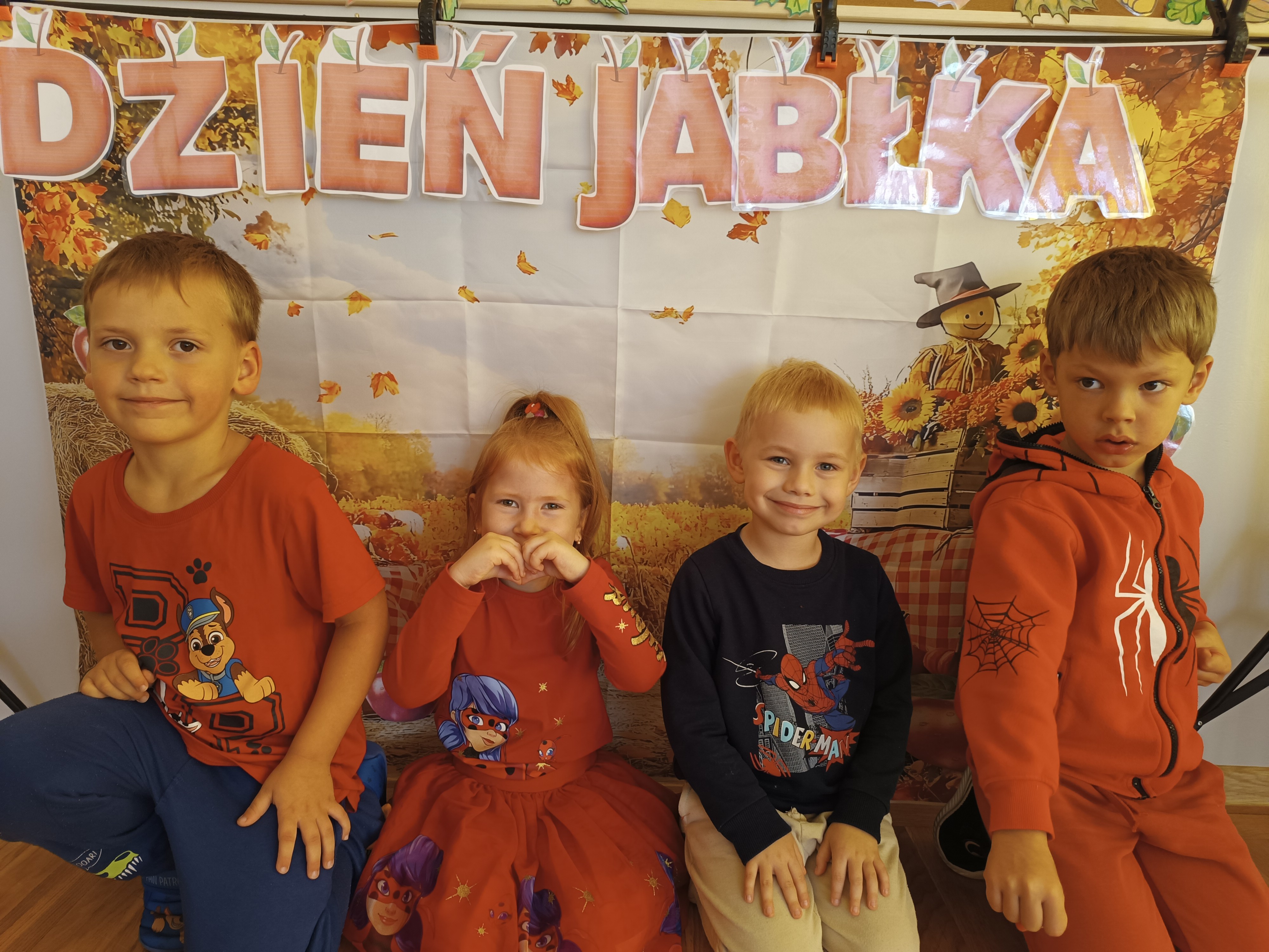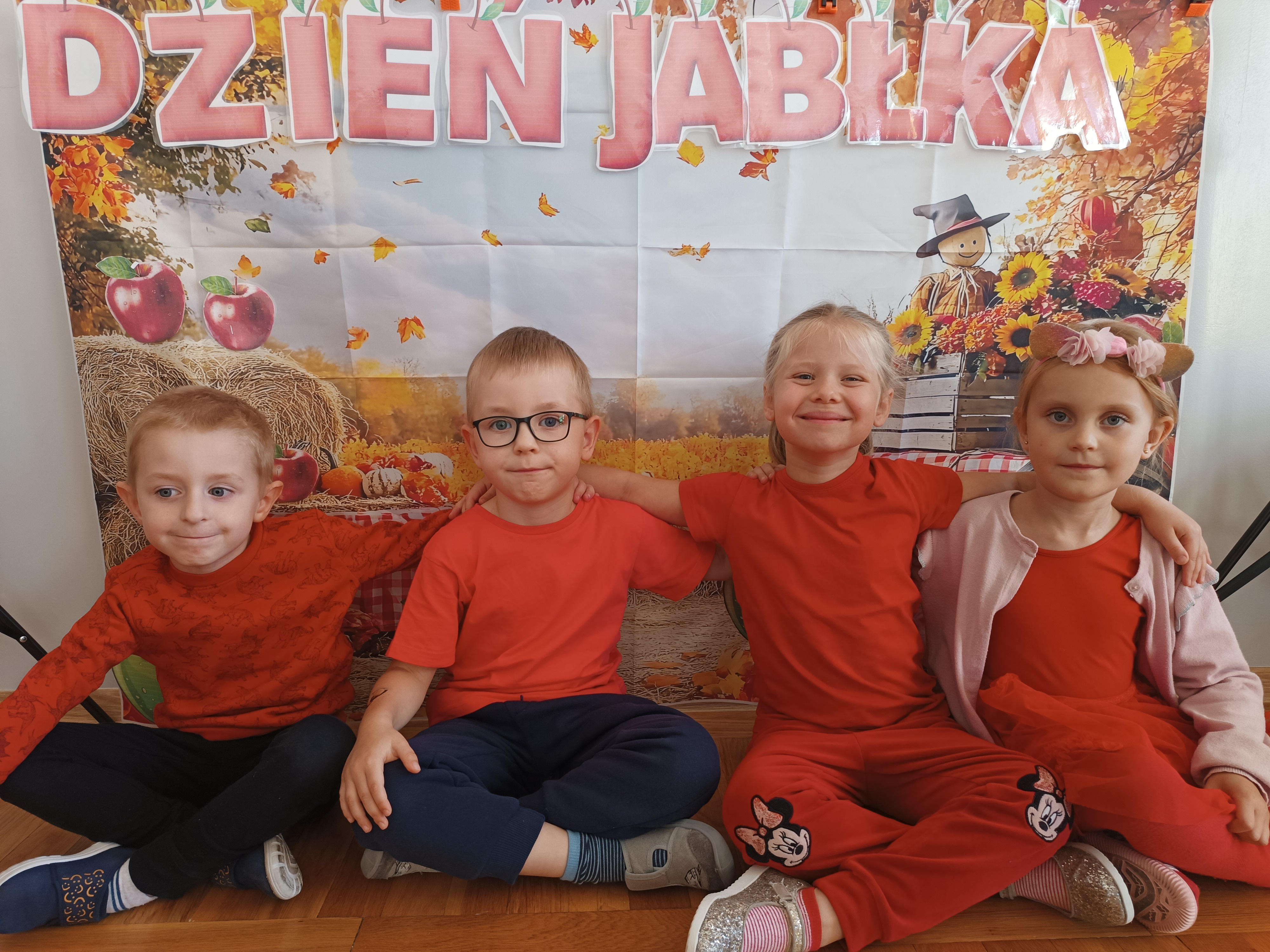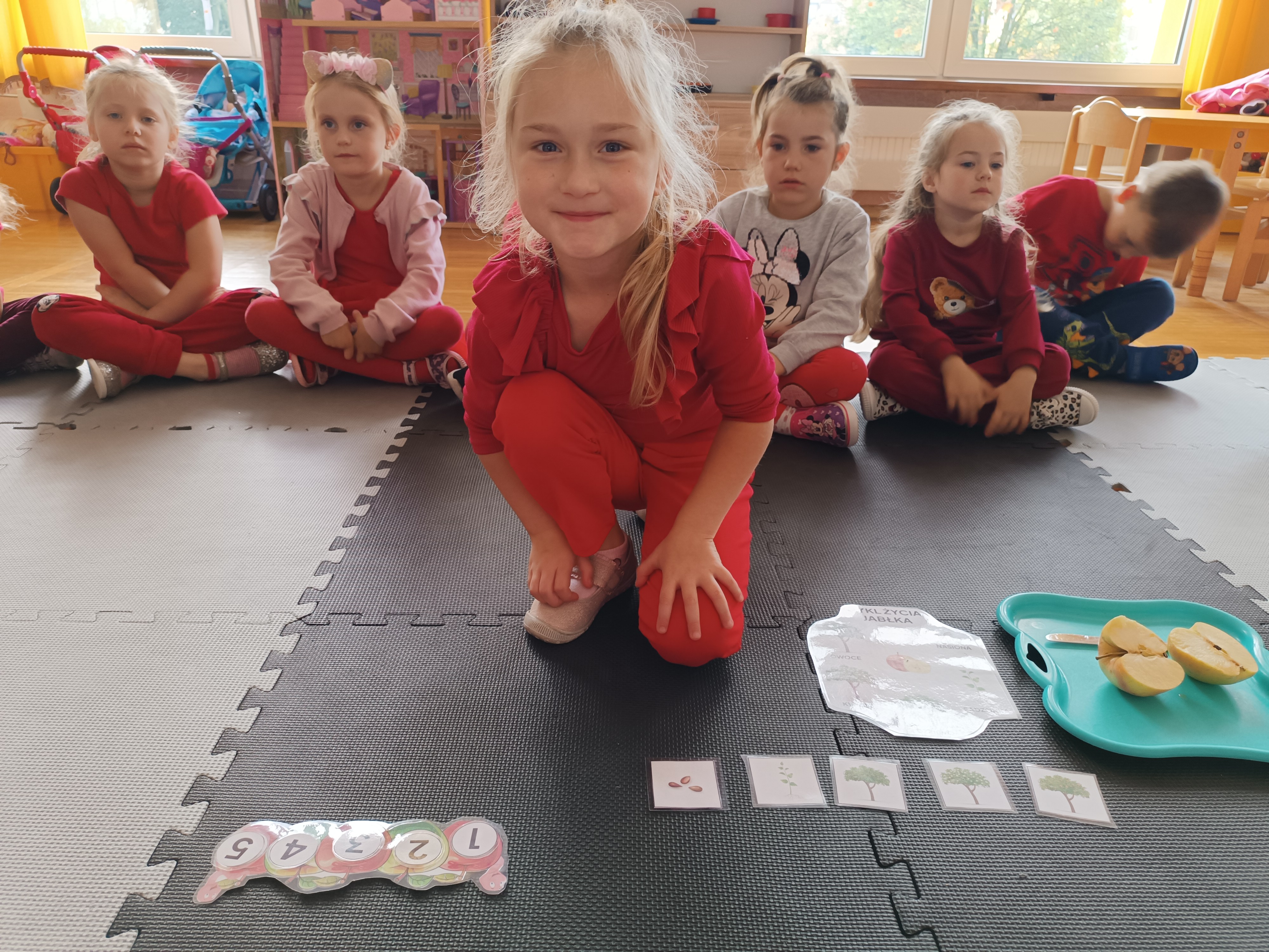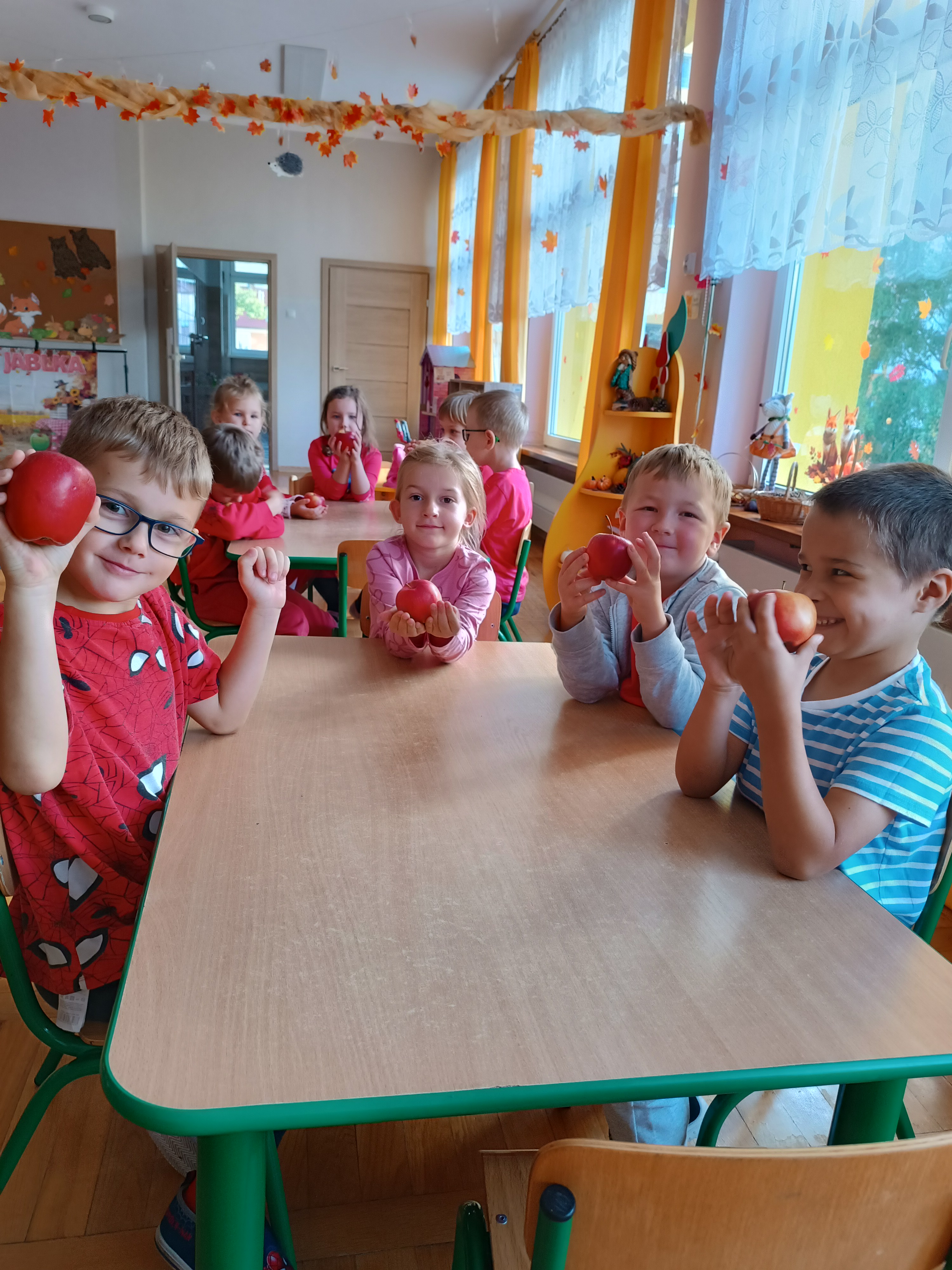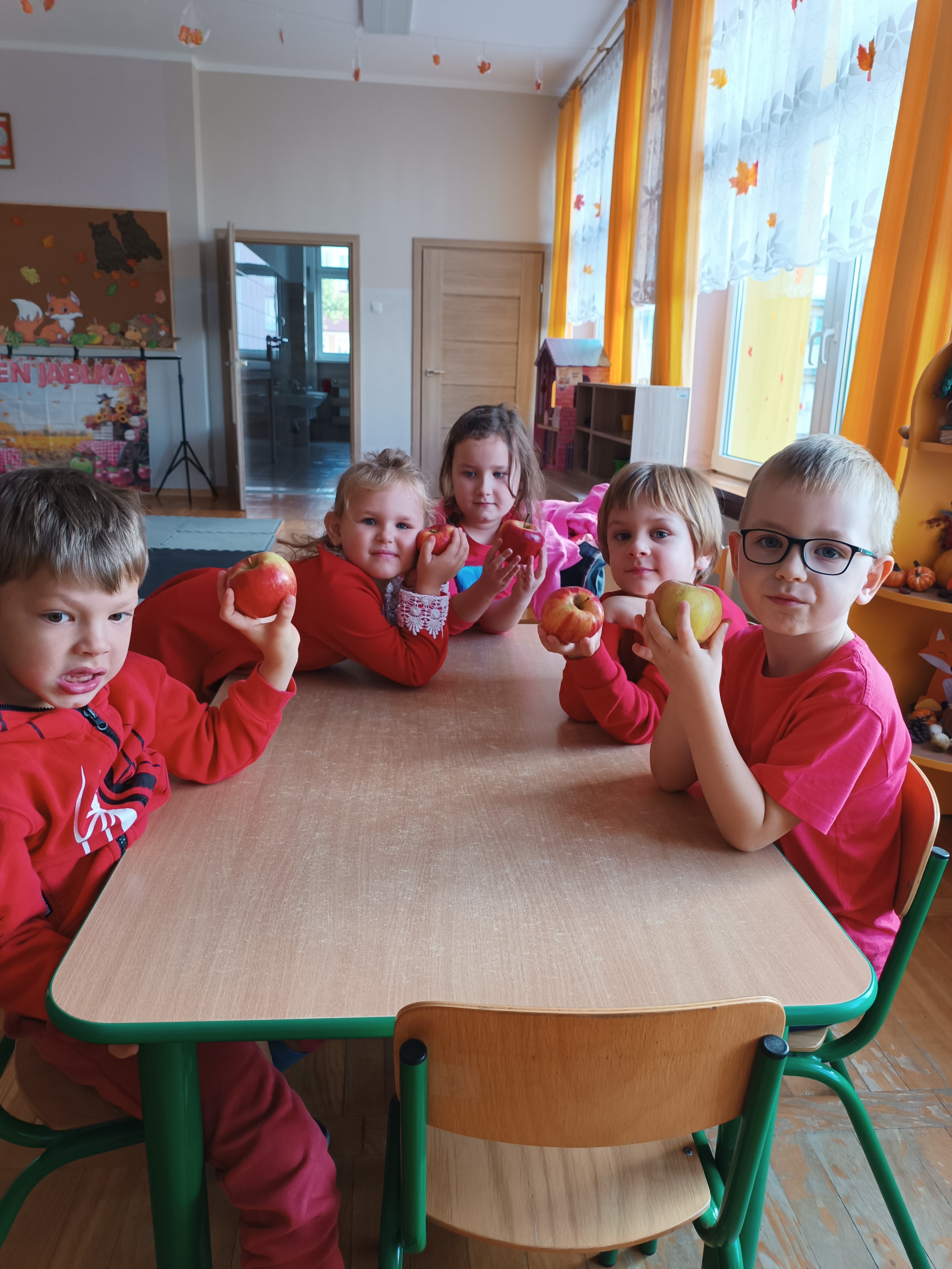 W dniu 29 września dzieci z grupy obchodziły dzień jabłka. Poznały budowę jabłka, jego kształty, kolor- dzieci mogły dotykać, wąchać, smakować. Następnie miały degustację - opowiadały o ich smaku. Poznali cykl powstania jabłka ,,od pesteczki do owocu". Przeliczali i tworzyli działania matematyczne z udziałem jabłek. Na koniec wykonali wspólną zespołową pracę z wykorzystaniem bibuły.