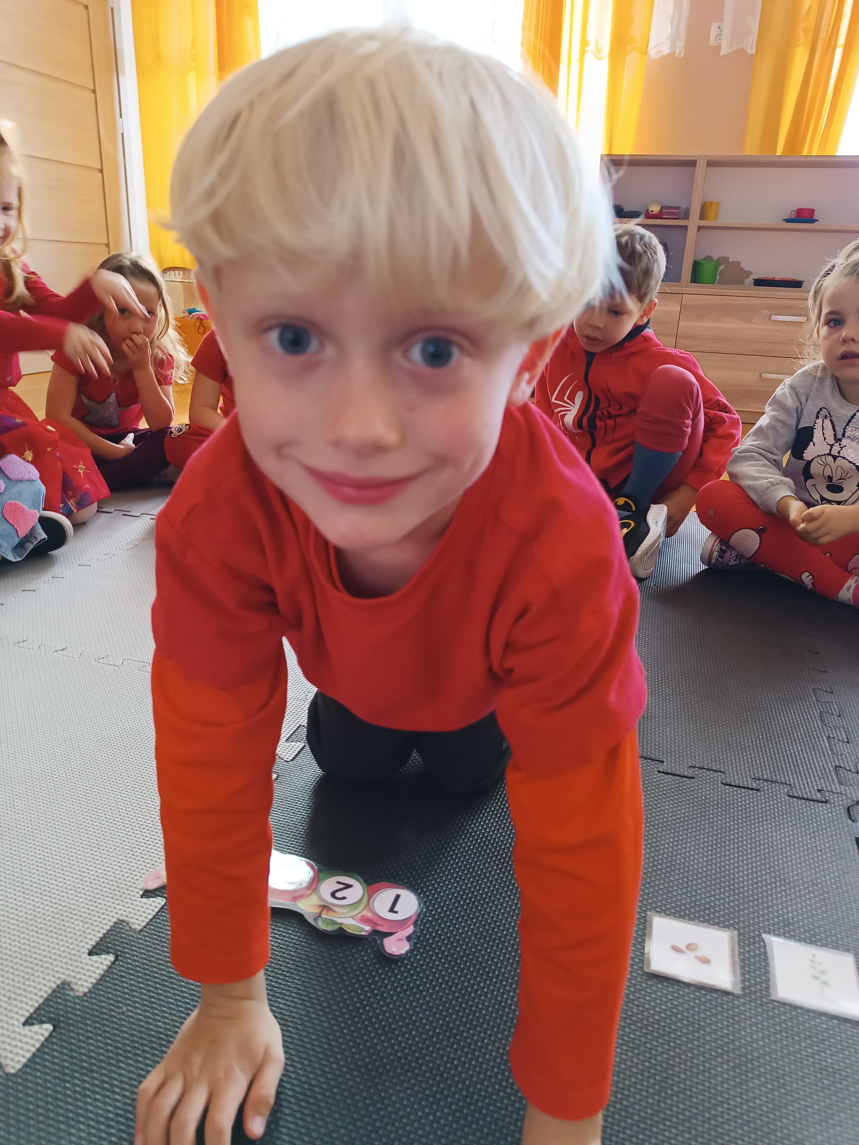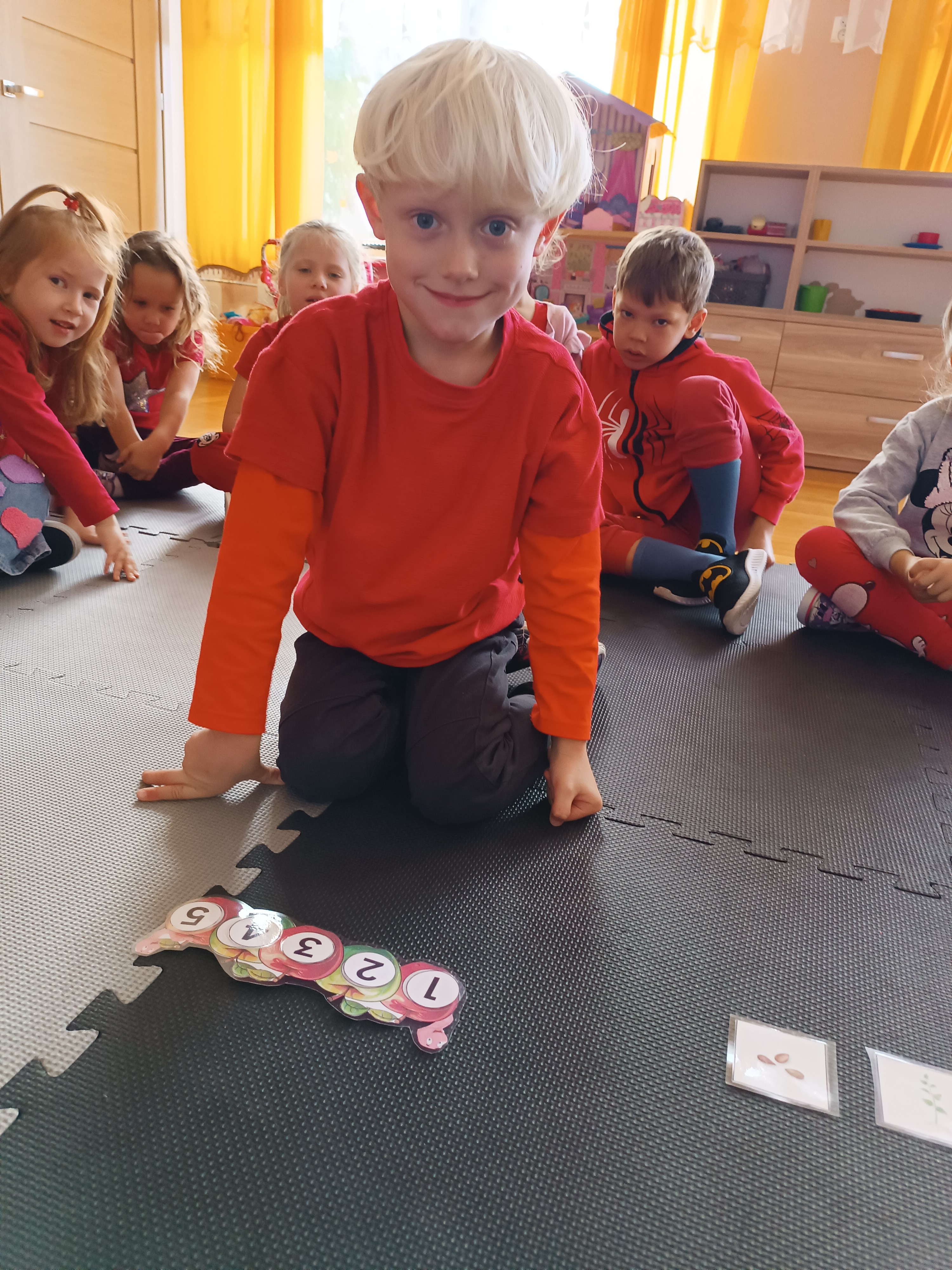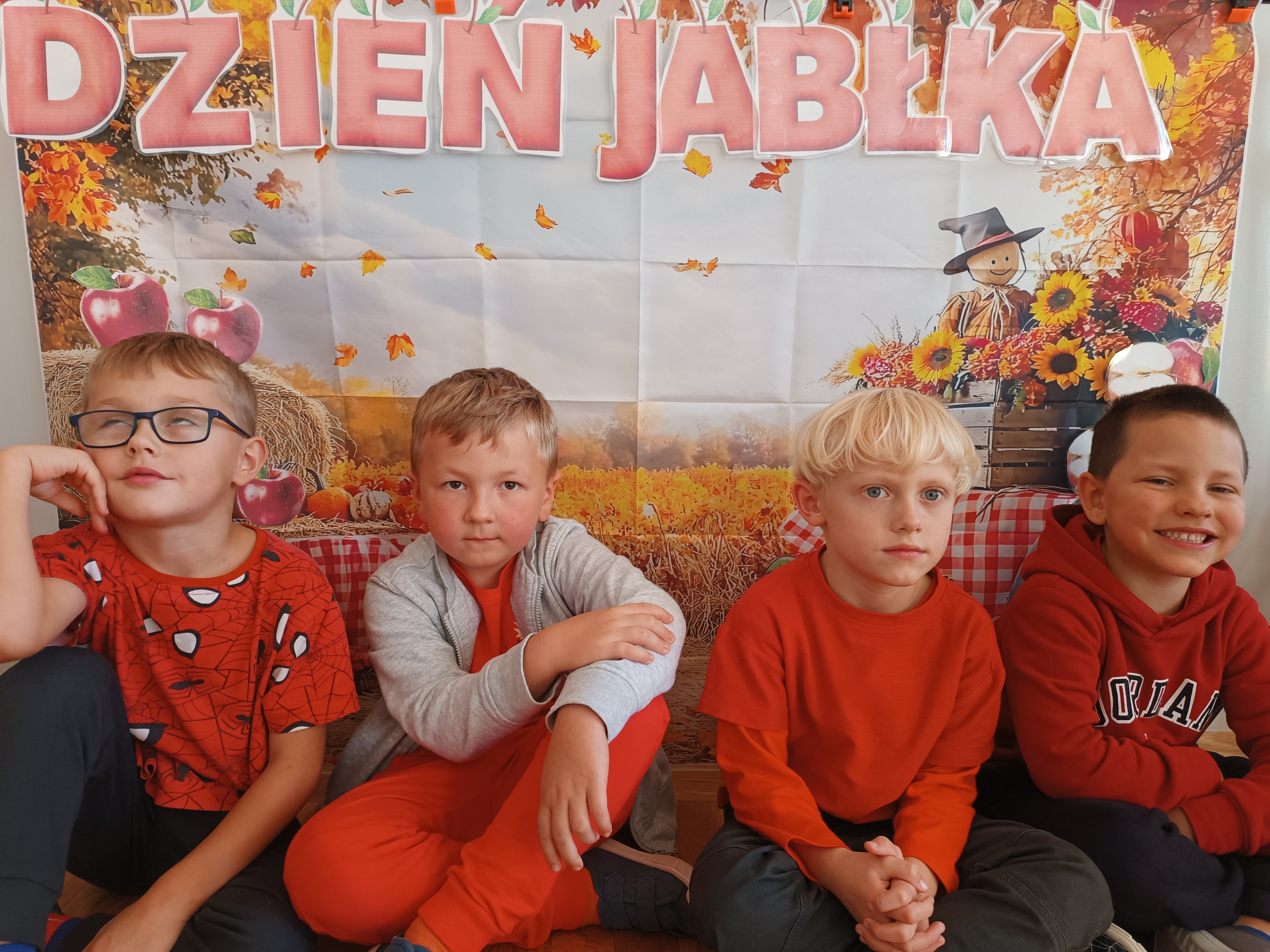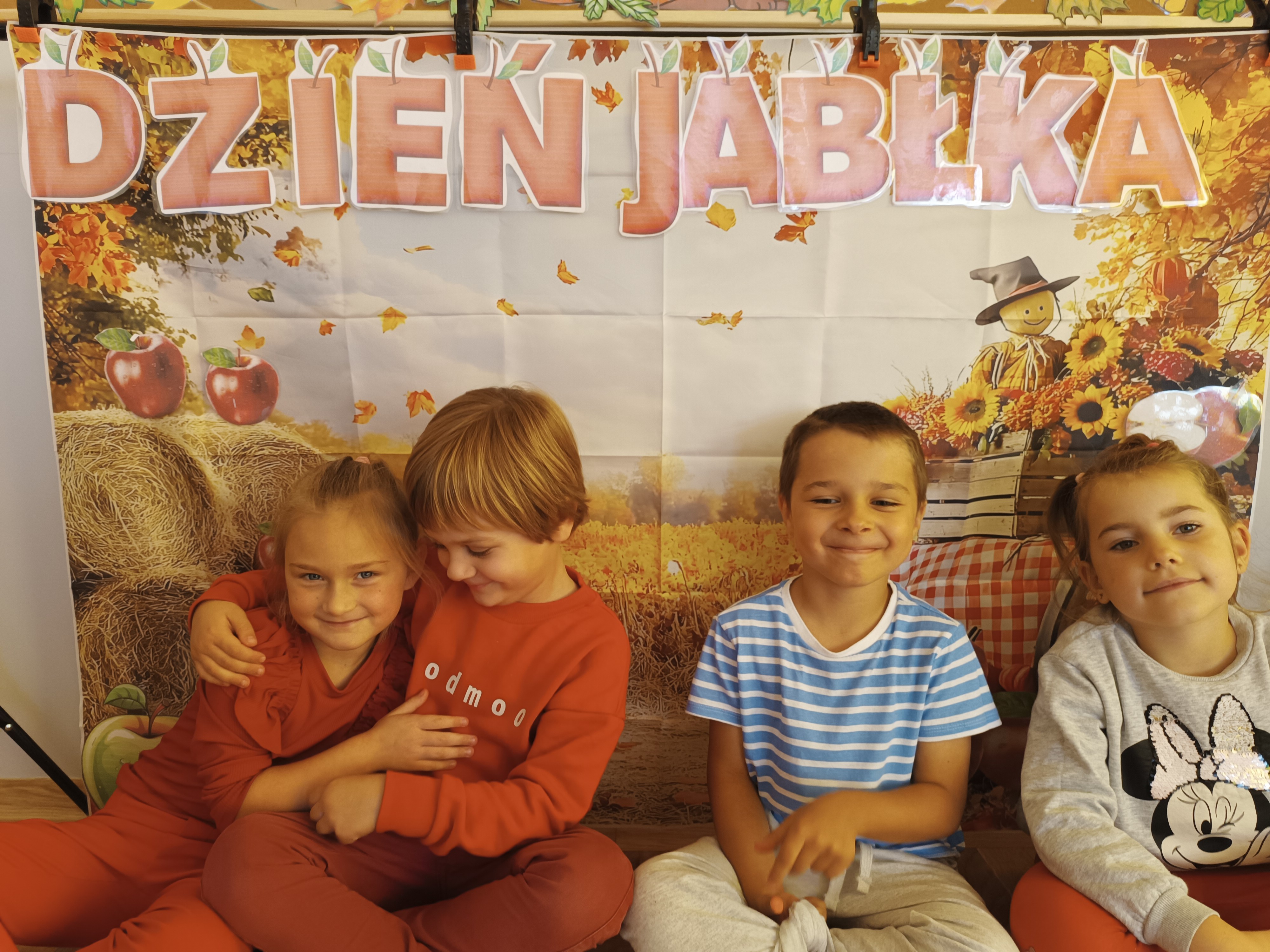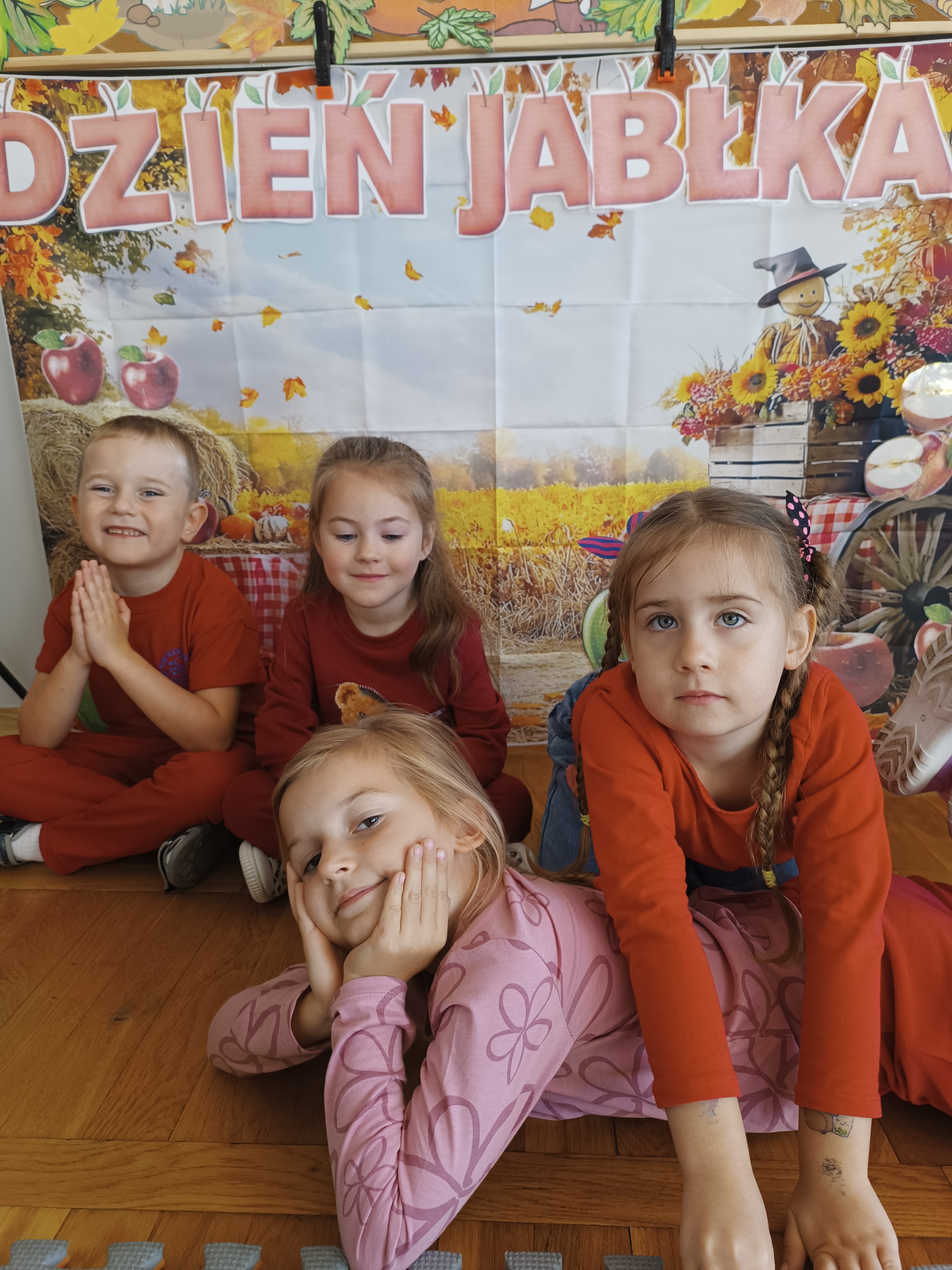 W dniu 29 września dzieci z grupy obchodziły dzień jabłka. Poznały budowę jabłka, jego kształty, kolor- dzieci mogły dotykać, wąchać, smakować. Następnie miały degustację - opowiadały o ich smaku. Poznali cykl powstania jabłka ,,od pesteczki do owocu". Przeliczali i tworzyli działania matematyczne z udziałem jabłek. Na koniec wykonali wspólną zespołową pracę z wykorzystaniem bibuły.