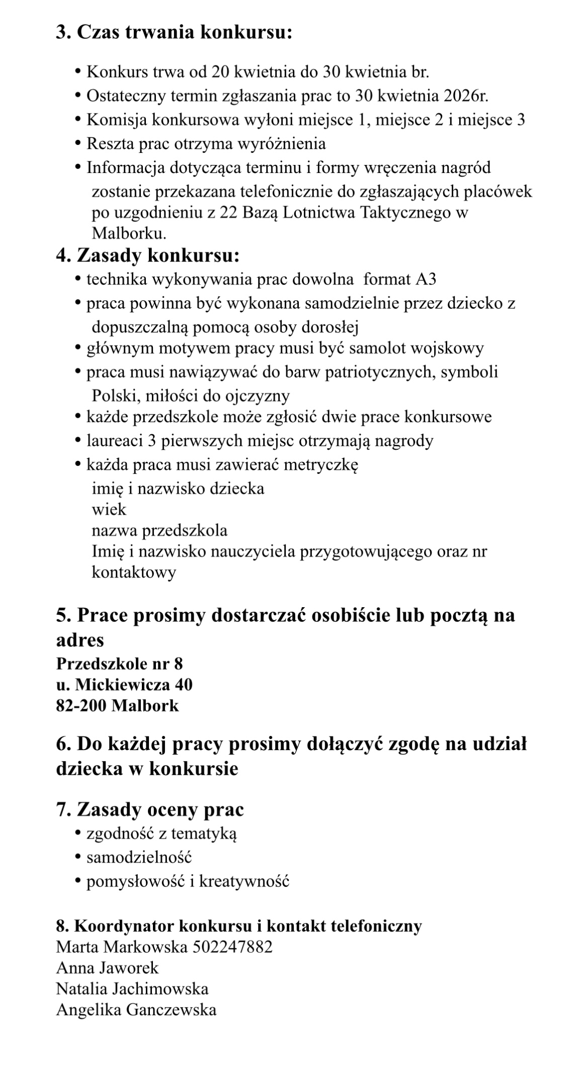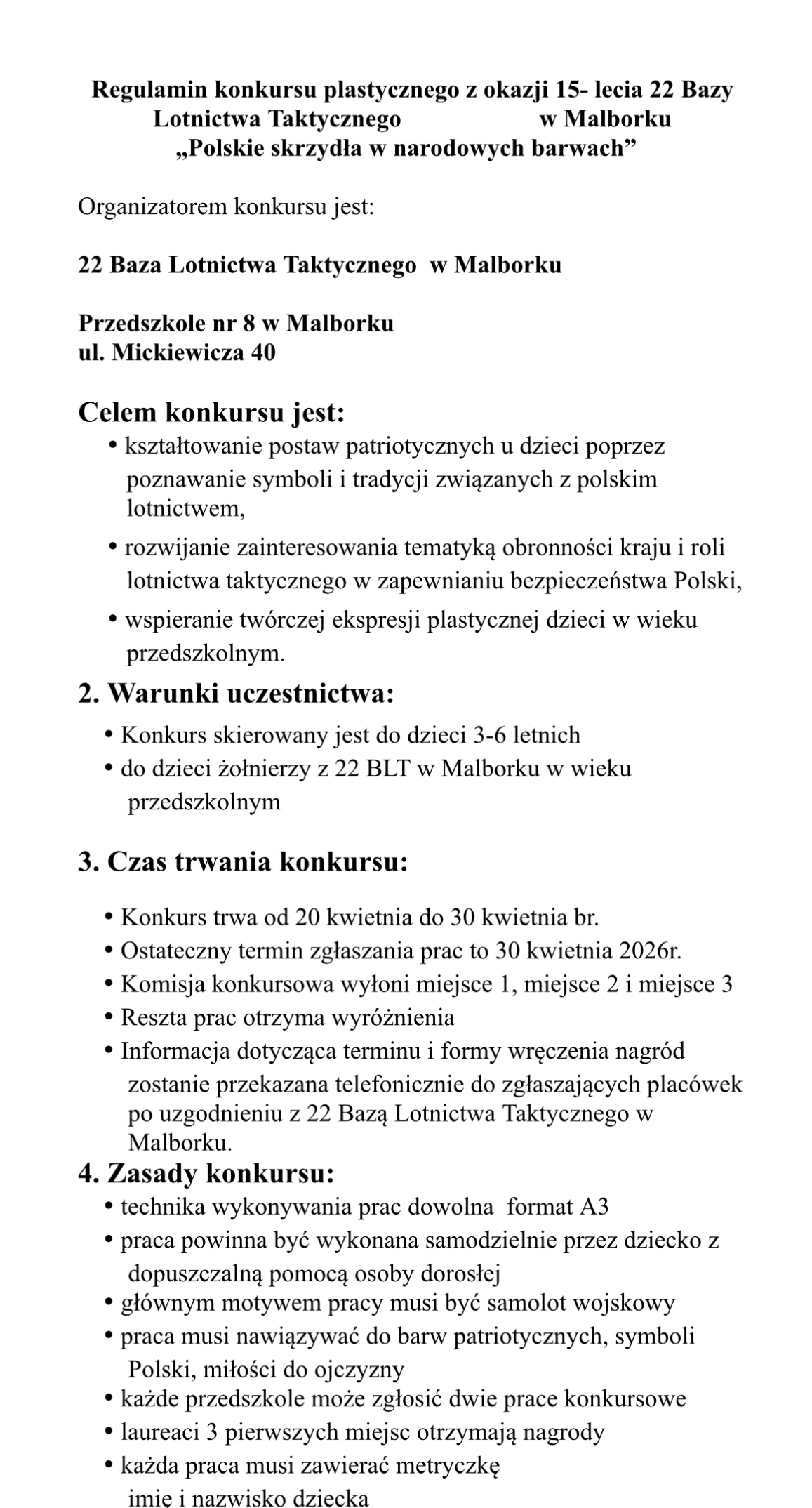 Serdecznie zapraszamy do udziału w konkursie plastycznym organizowanym z okazji 15-lecia 22 Bazy Lotnictwa Taktycznego w Malborku. Organizatorem wydarzenia jest 22 Baza Lotnictwa Taktycznego w Malborku we współpracy z Przedszkolem nr 8 w Malborku.