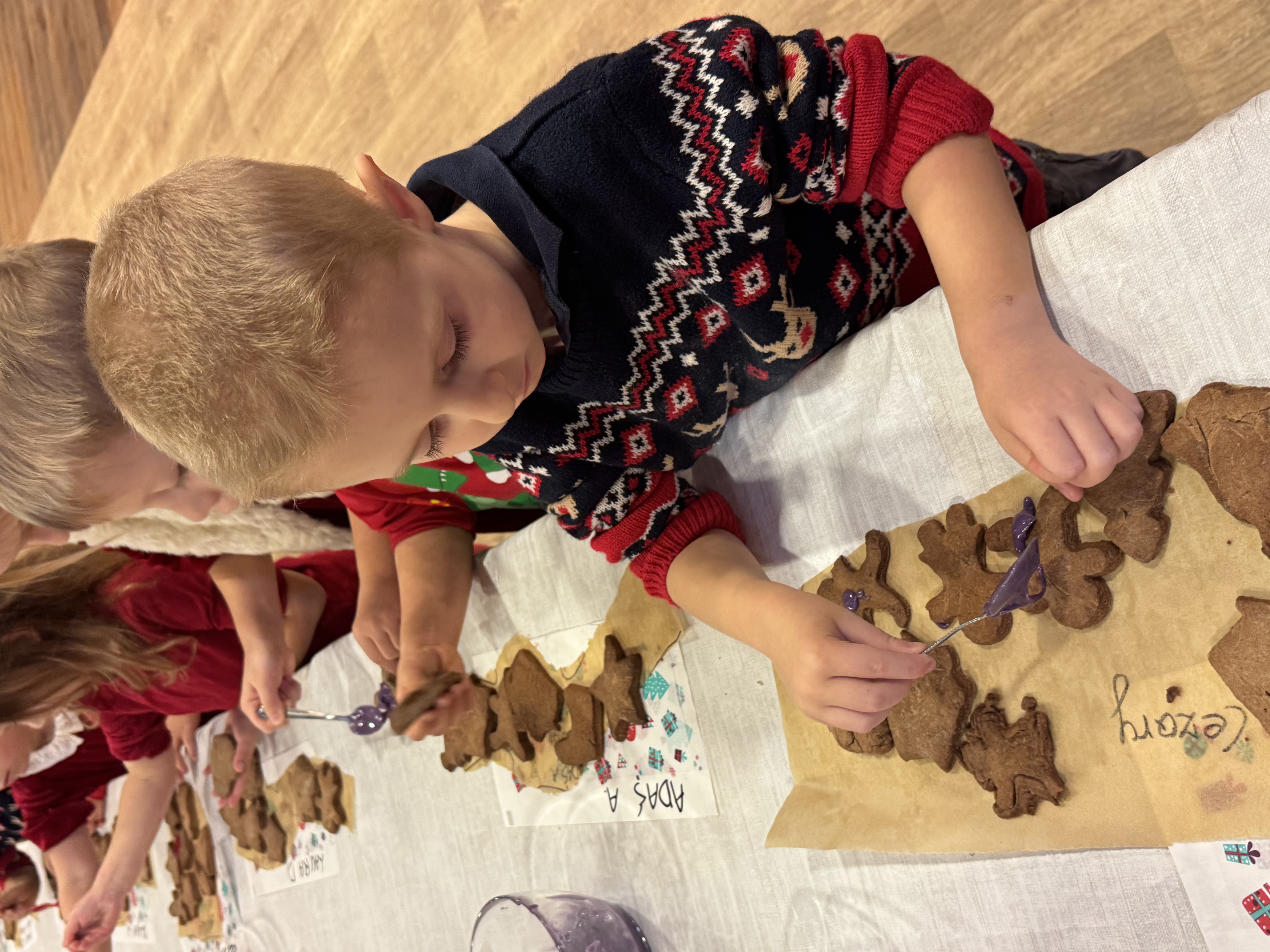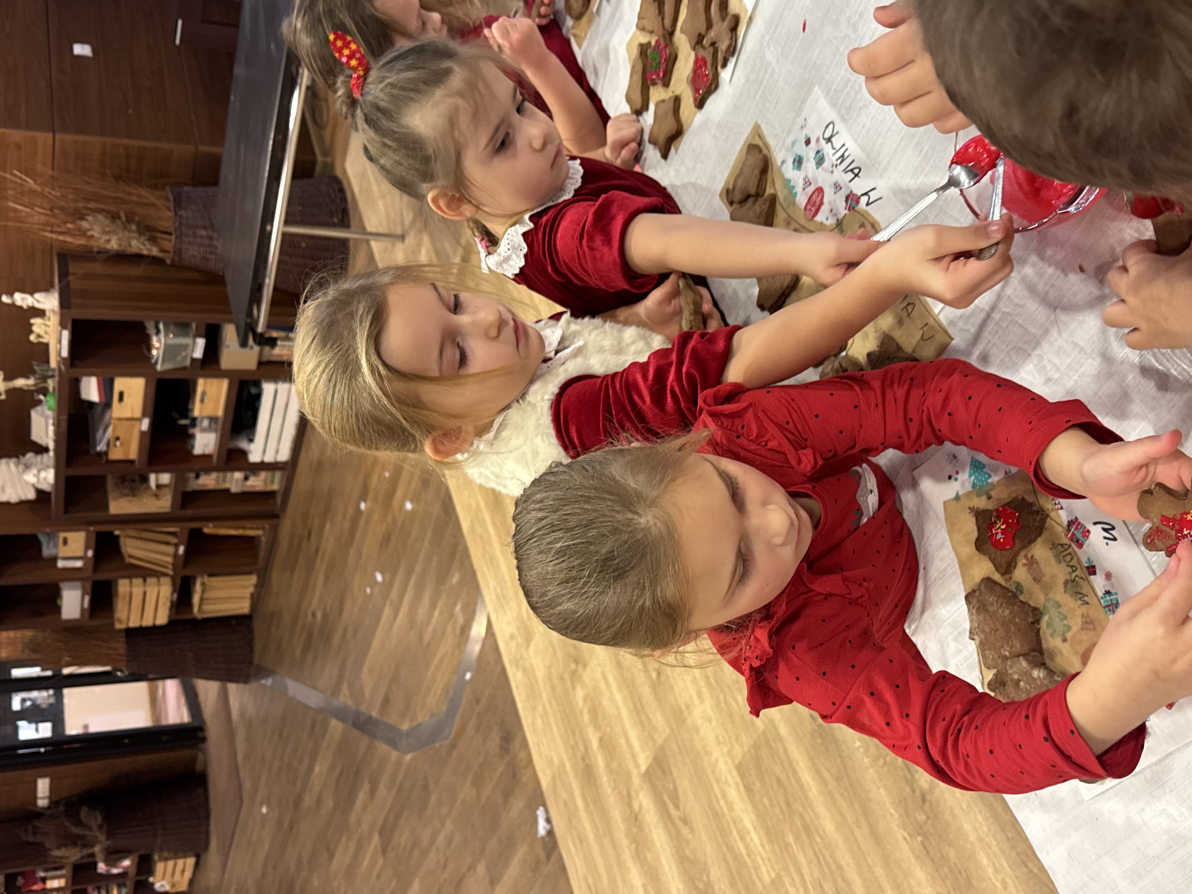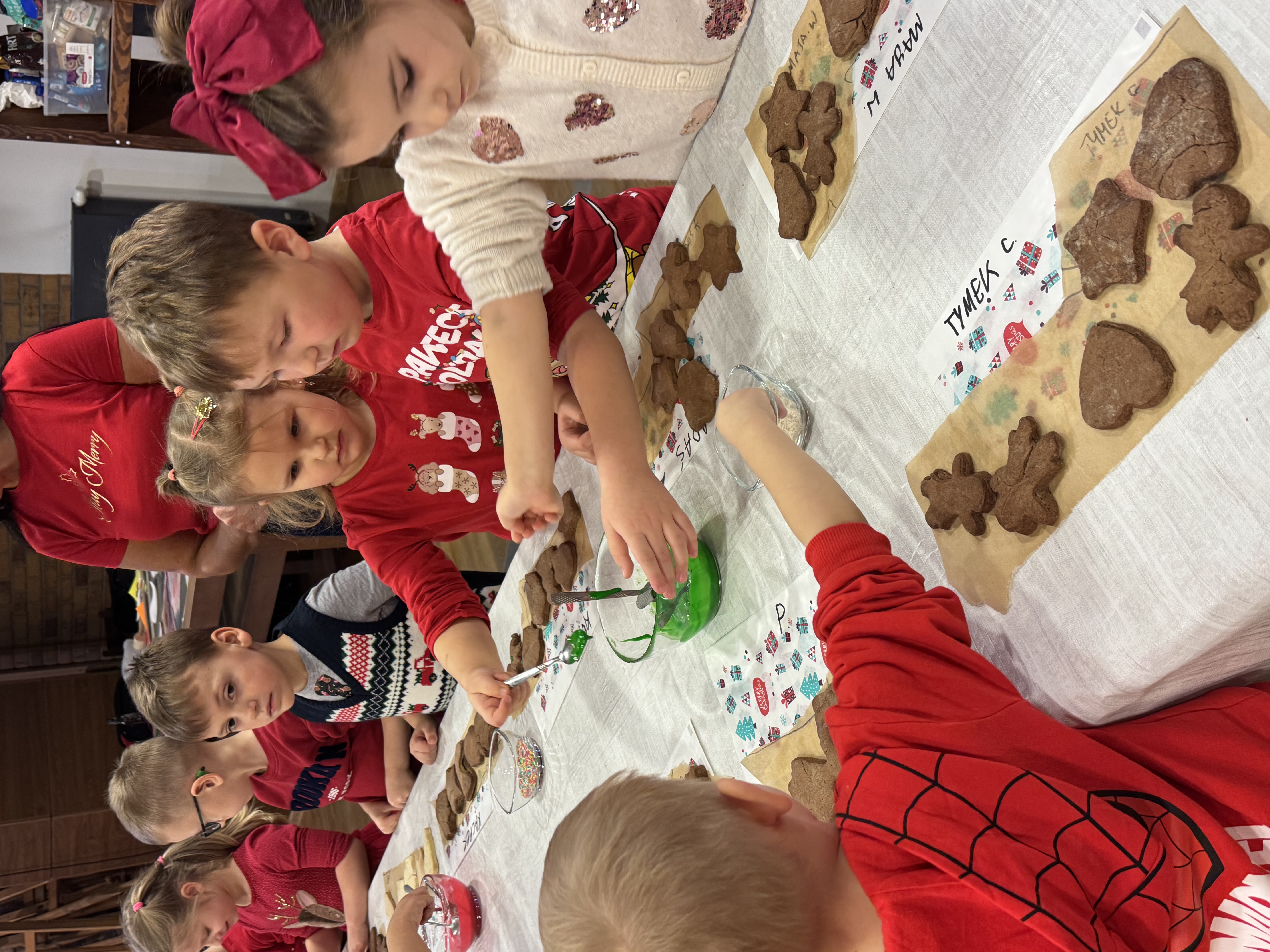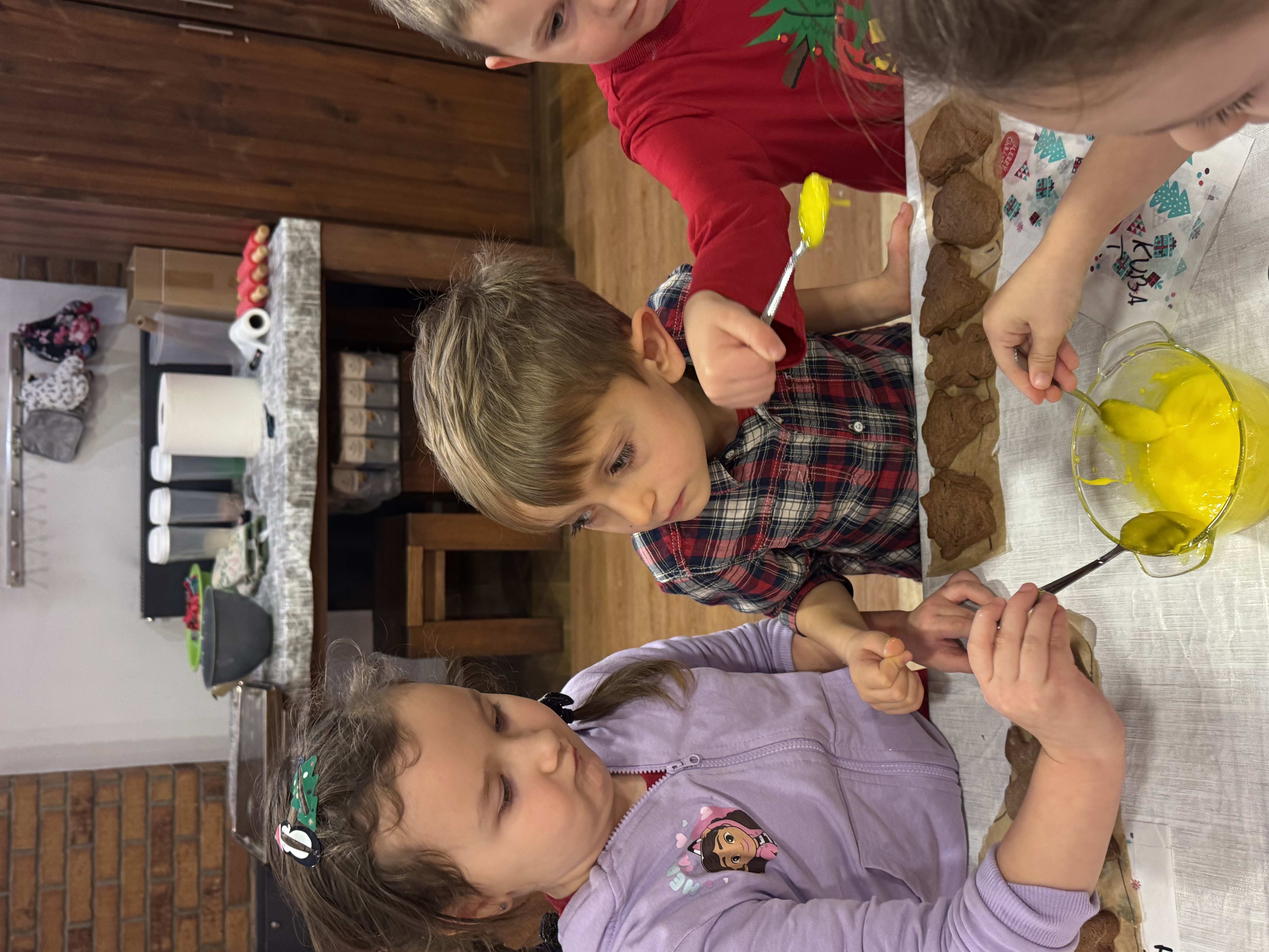 W piątek grupa „Liski” wybrała się na wyjątkową wycieczkę do Szkoły Łacińskiej, gdzie czekały na nas pełne magii warsztaty świąteczne. Dzieci z ogromnym zaangażowaniem piekły i dekorowały pierniki, tworząc piękne i pachnące świąteczne wypieki. Nie zabrakło też kreatywnej zabawy – ozdabialiśmy bombki, a następnie braliśmy udział w zimowej konkurencji, podczas której każdy mógł sprawdzić swoją celność, rzucając śnieżkami do bałwana. Emocji było co niemiara!