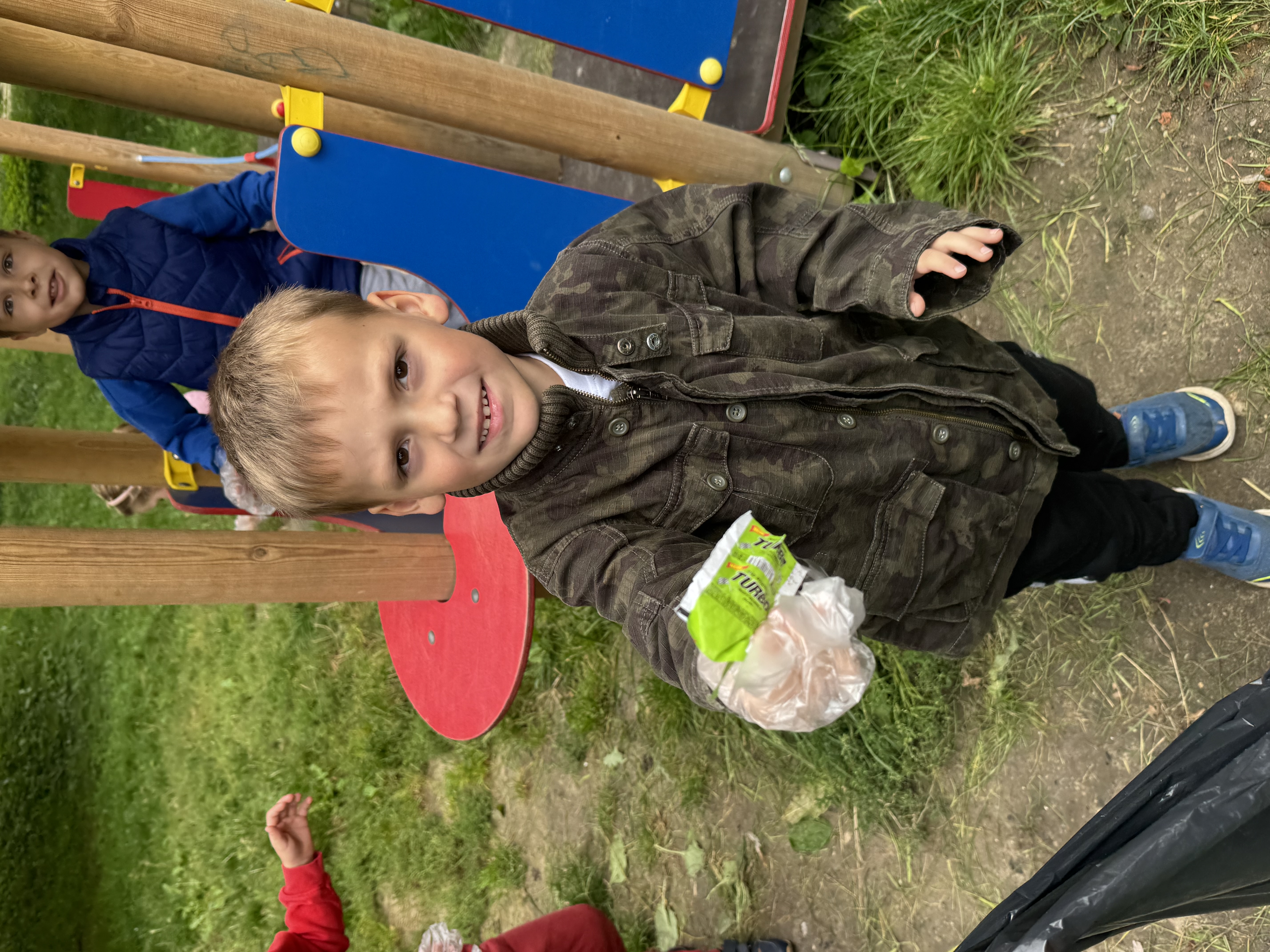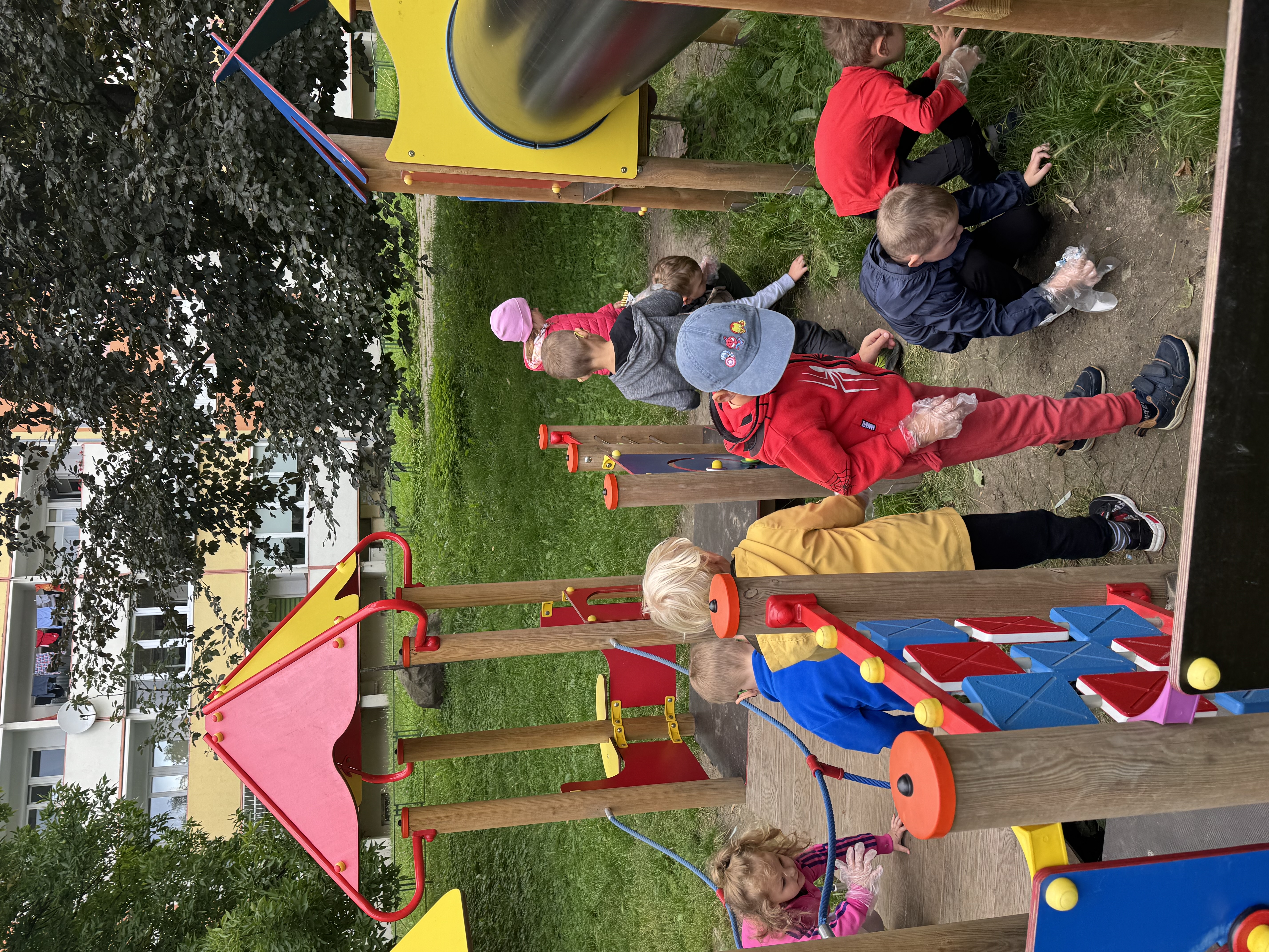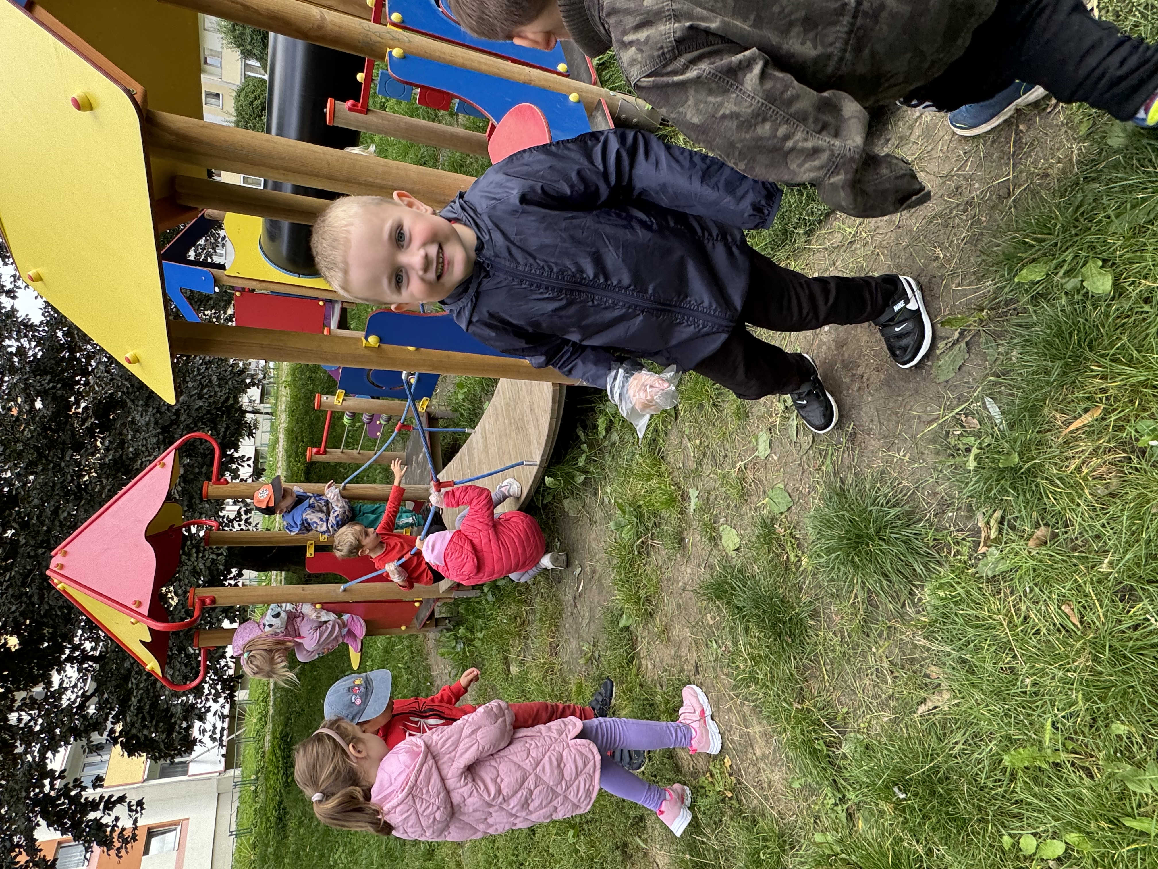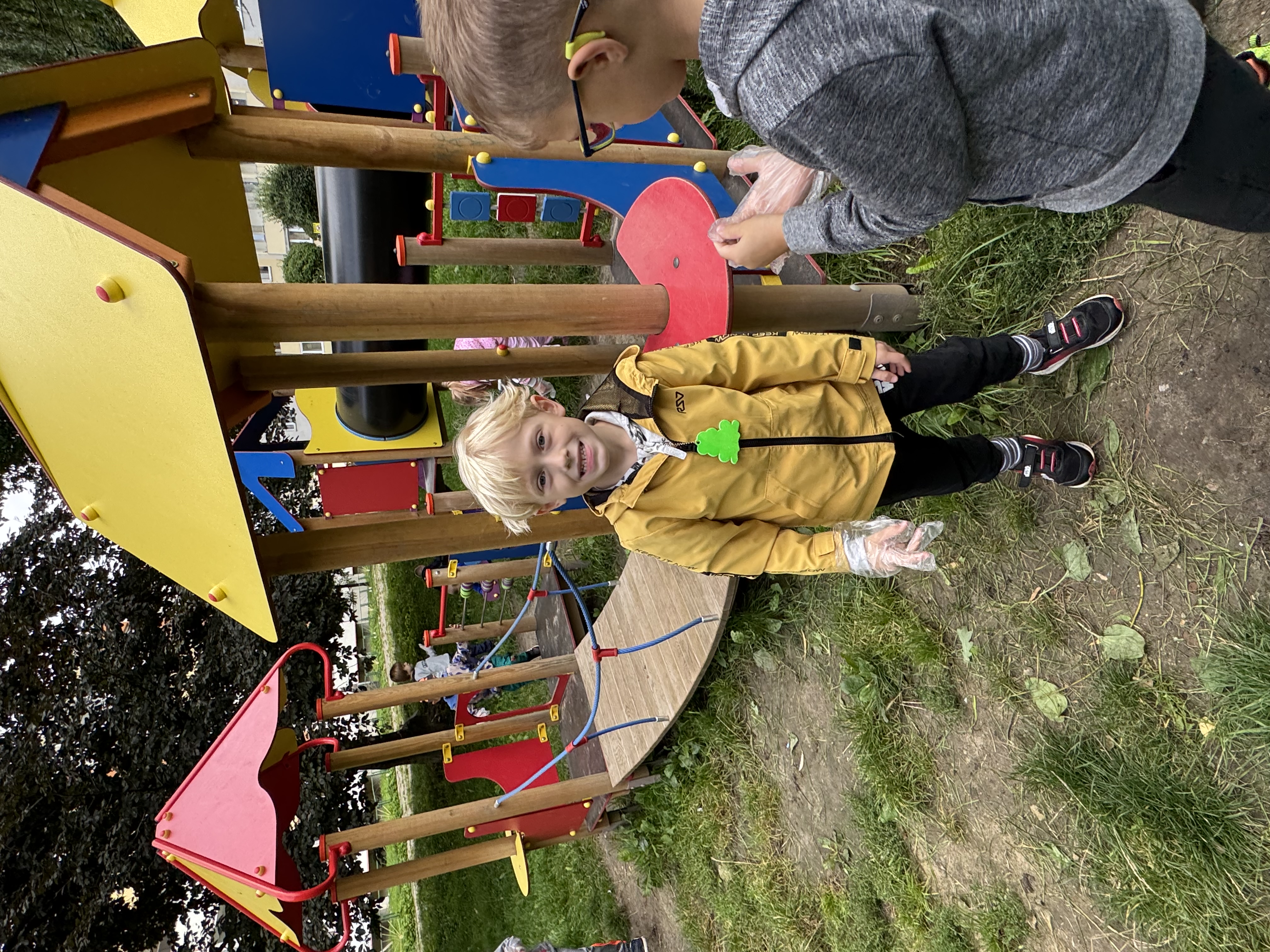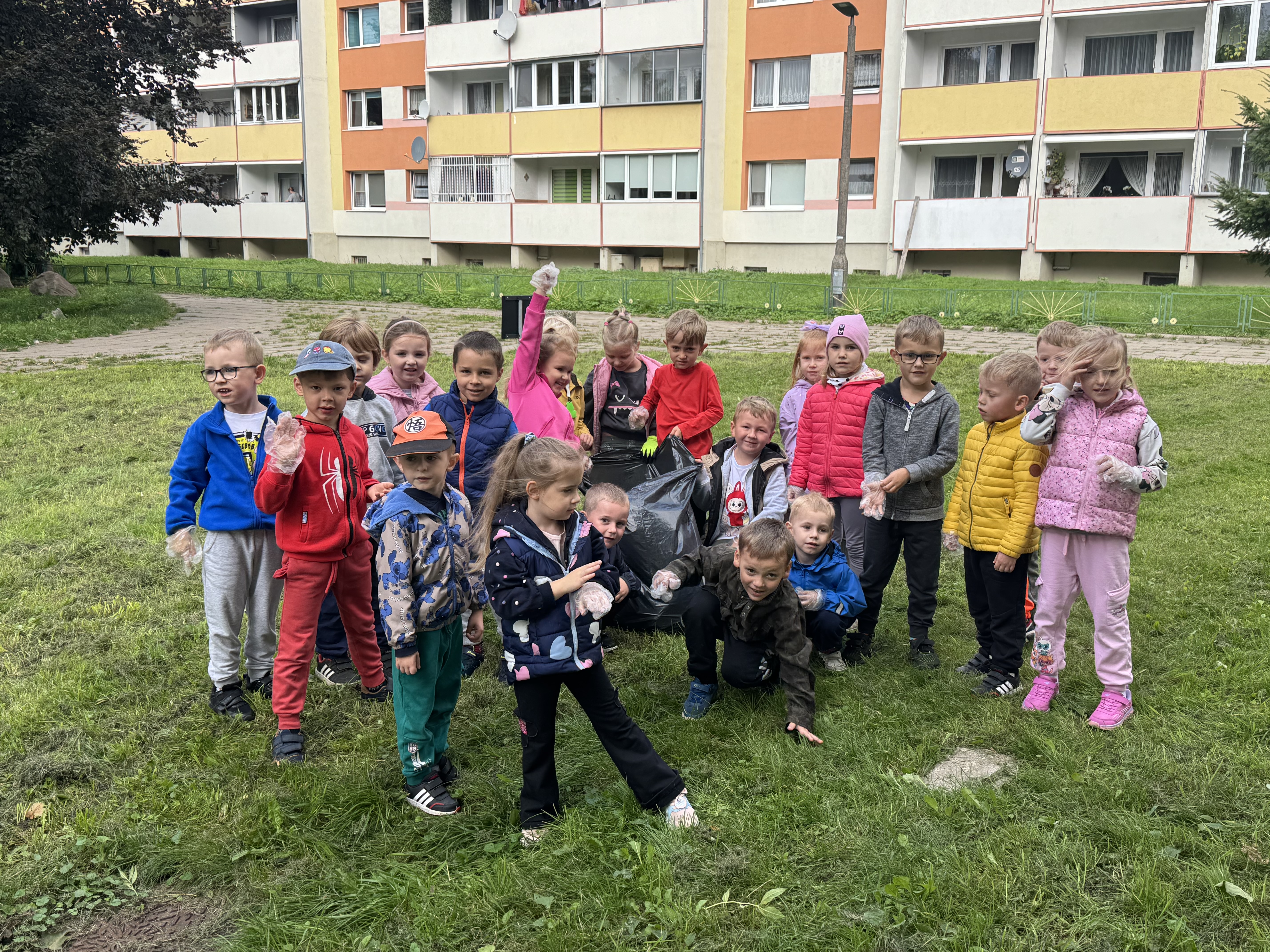 Na zaproszenie Burmistrza Malborka nasi 5-latkowie sprzątali okolice przedszkola, ucząc się dbałości o środowisko i odpowiedzialności za planetę.