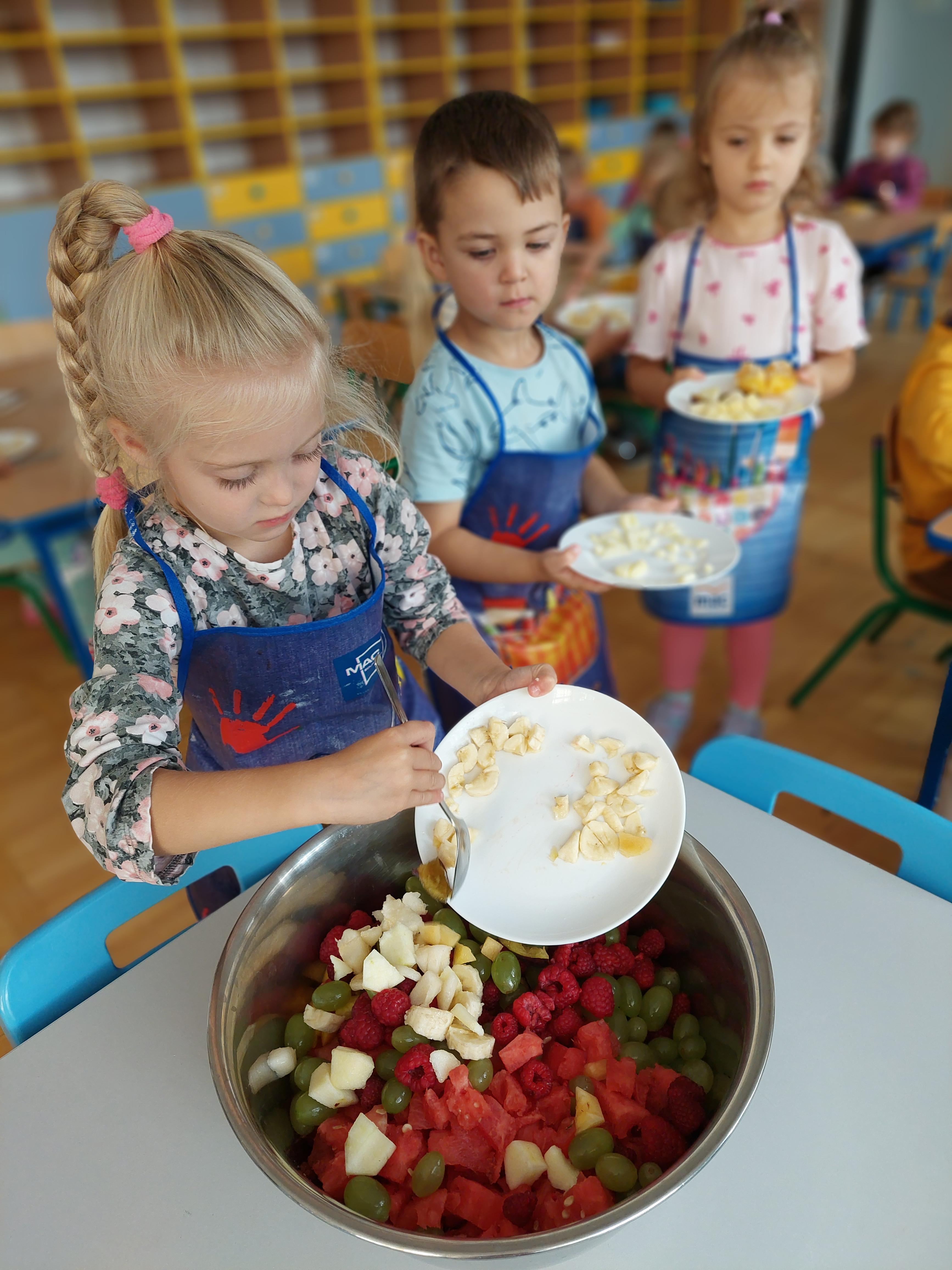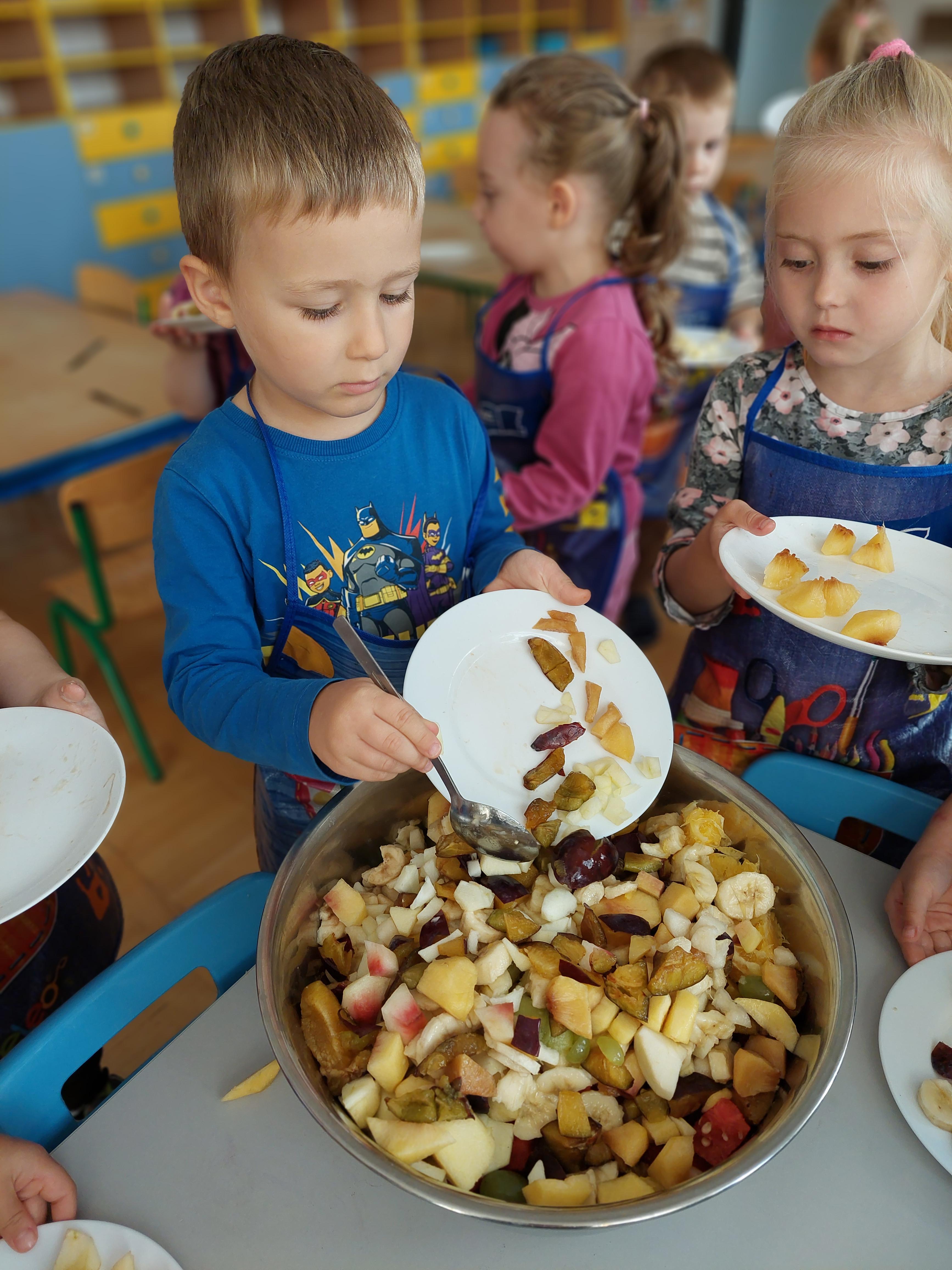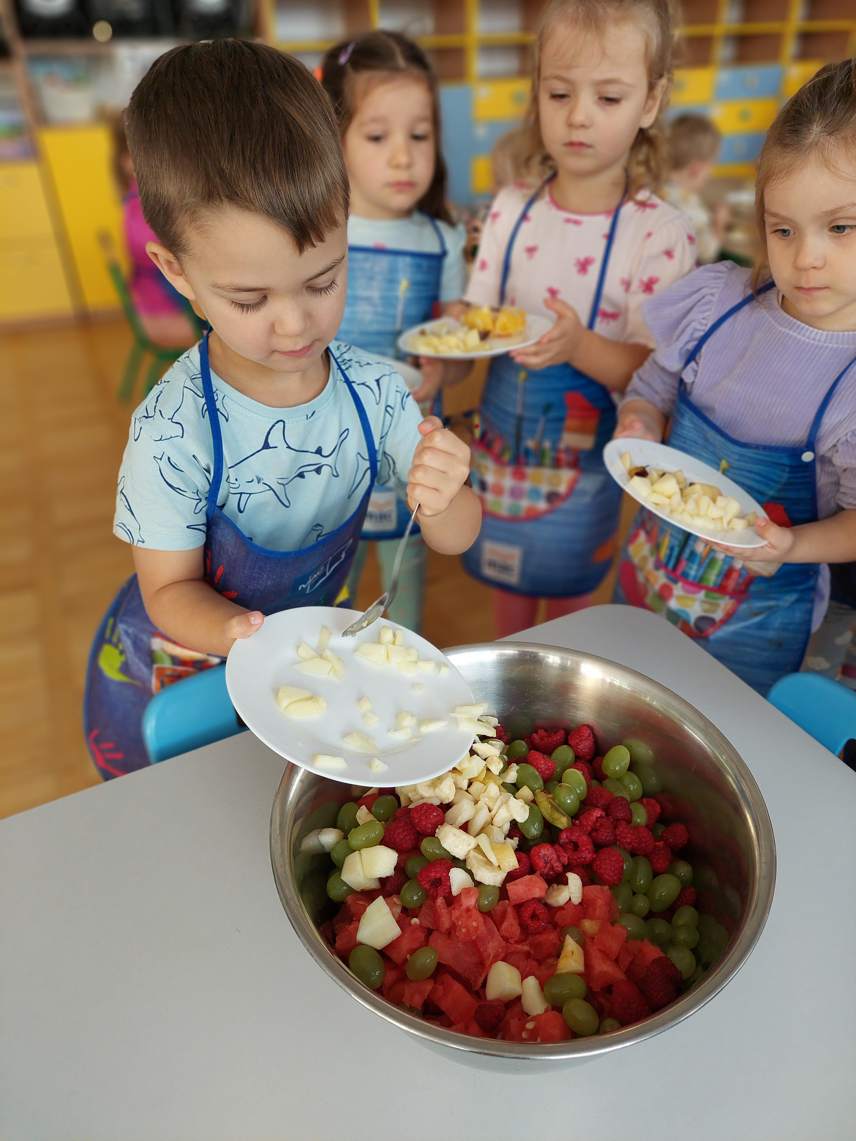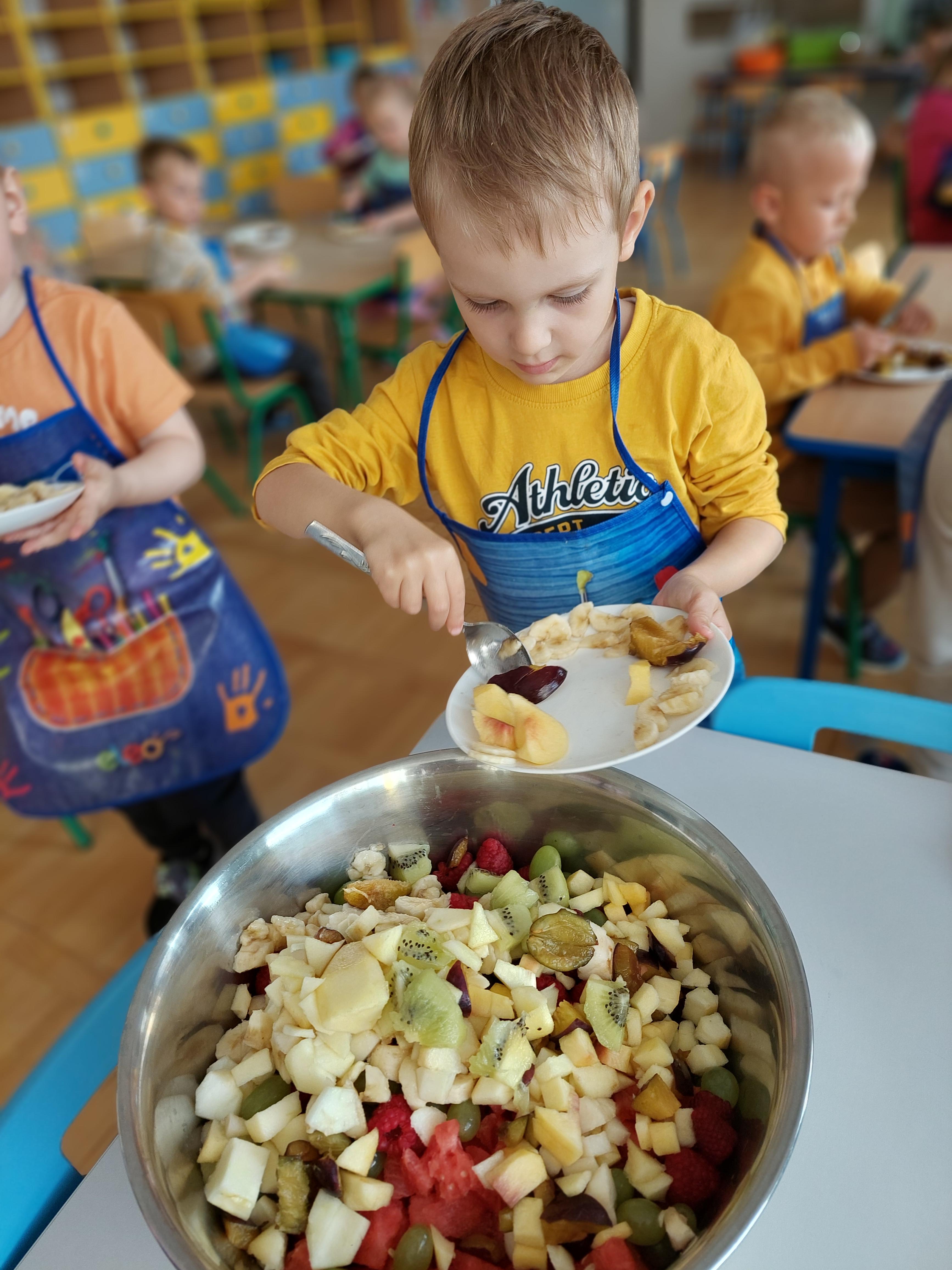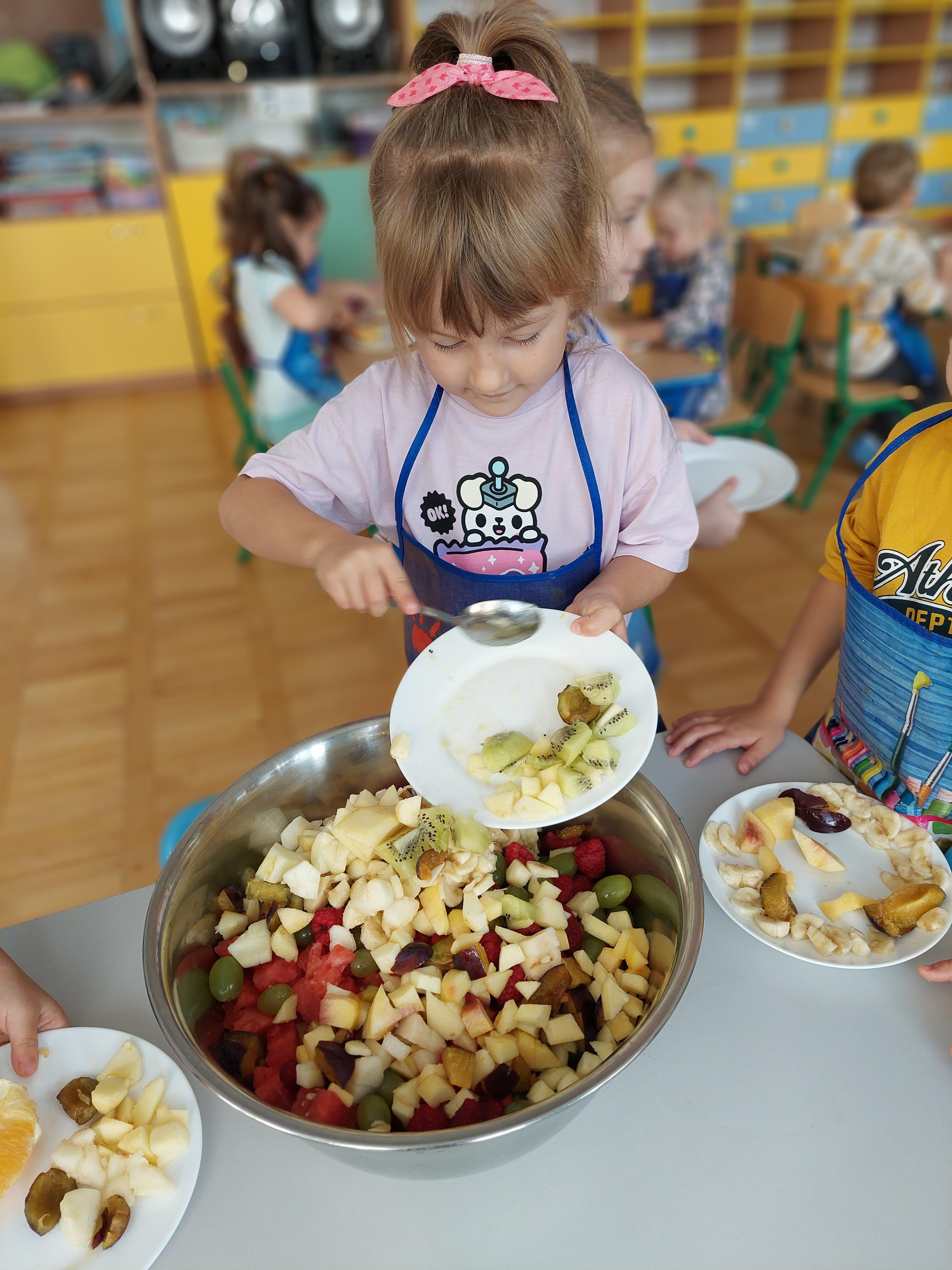 W dniu dzisiejszym dzieci z naszej grupy wspólnie przygotowały pyszną sałatkę owocową. Najpierw umyły ręce i zapoznały się z różnymi owocami, poznając ich kolory, kształty i zapachy. Następnie z pomocą nauczyciela kroiły owoce na małe kawałki i wrzucały je do dużej miski. Na koniec wszystko dokładnie mieszały i spróbowały własnoręcznie przygotowanej sałatki. Zajęcia były świetną okazją do nauki współpracy, rozwijania samodzielności oraz zdrowych nawyków żywieniowych.