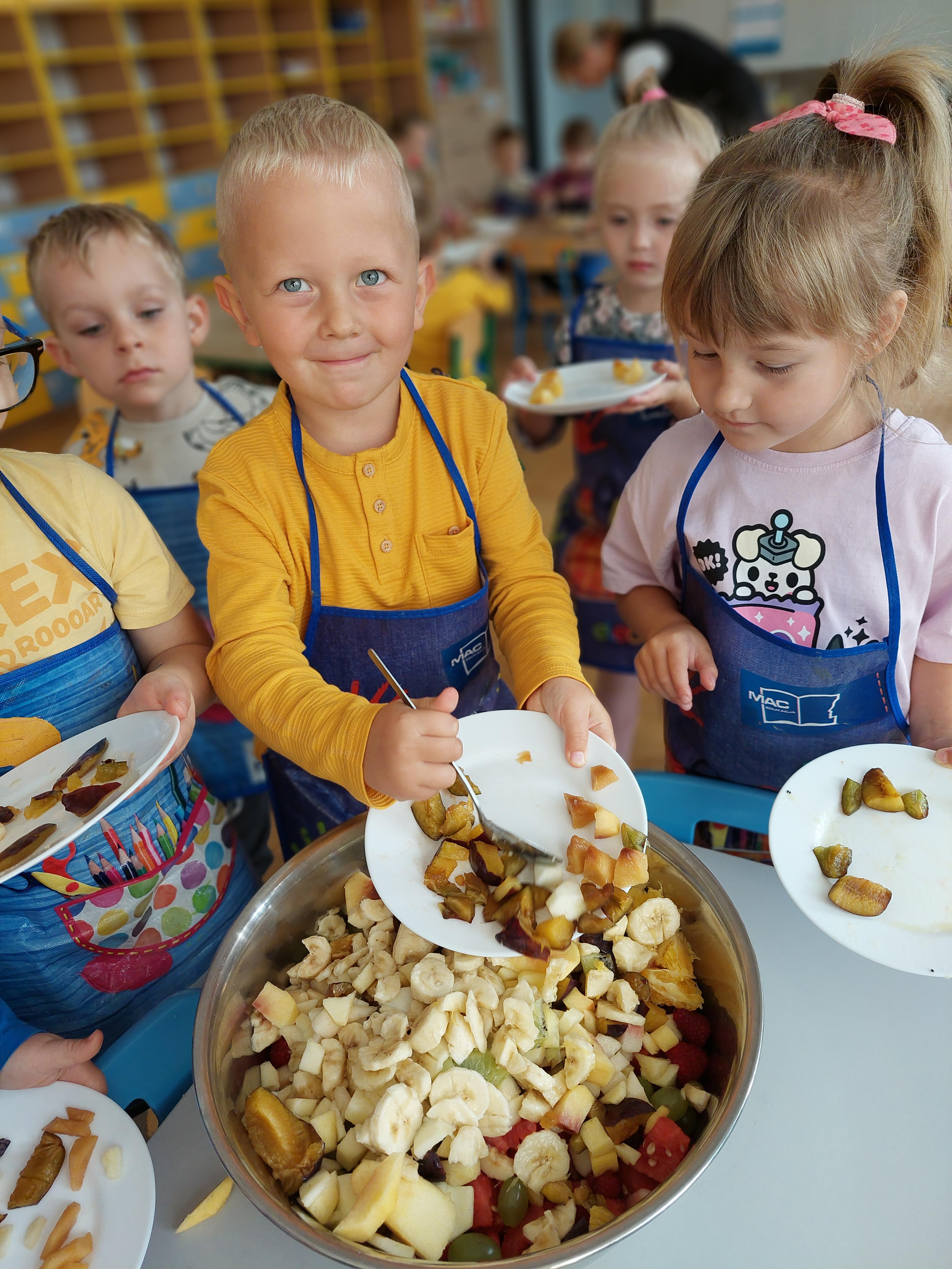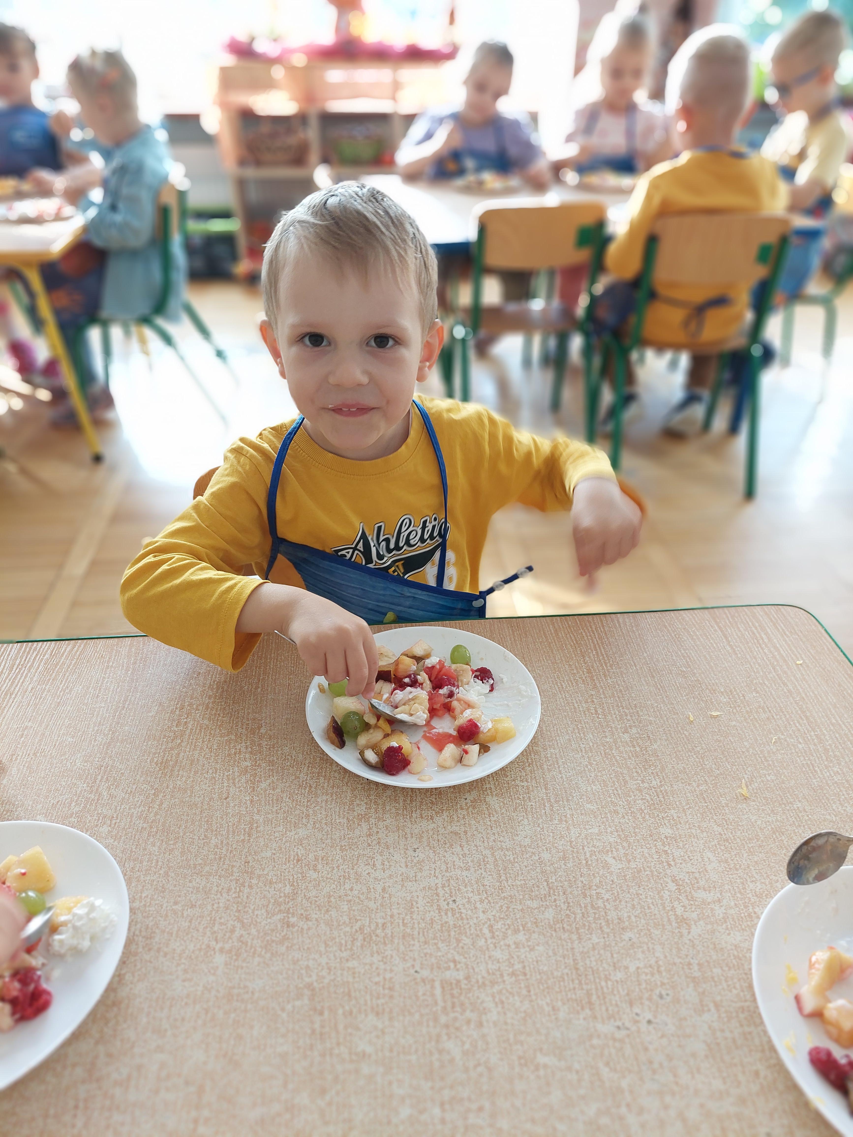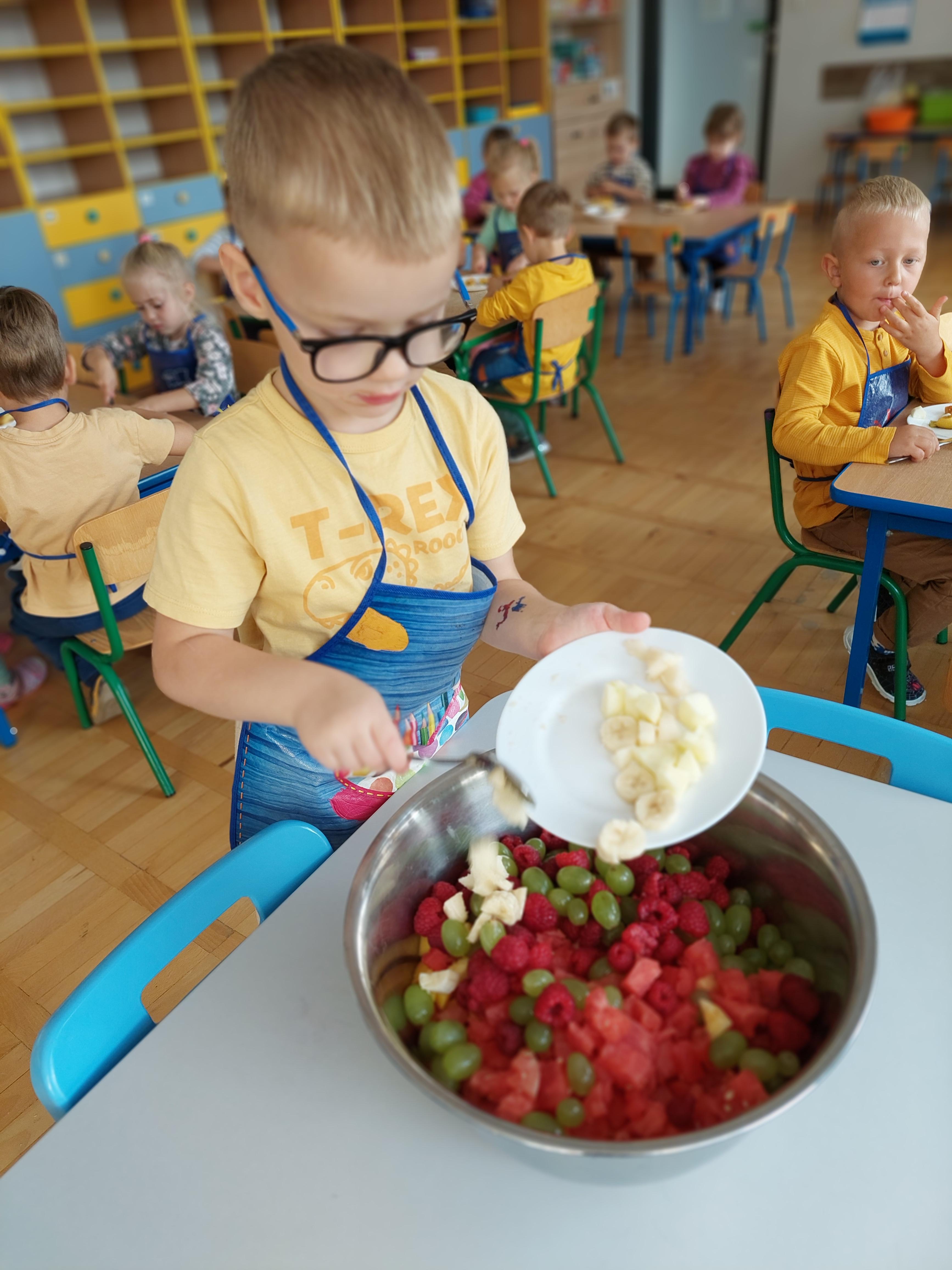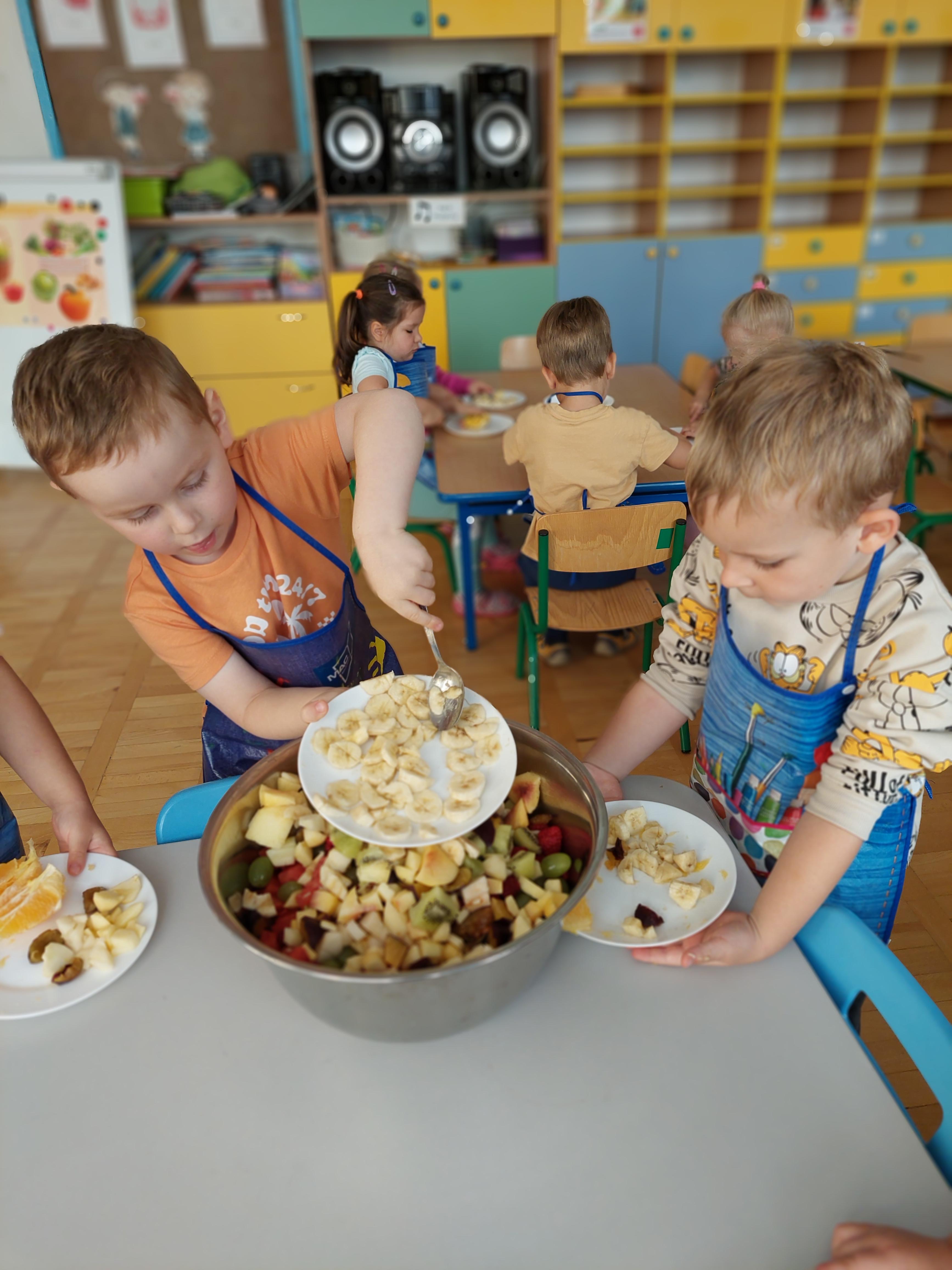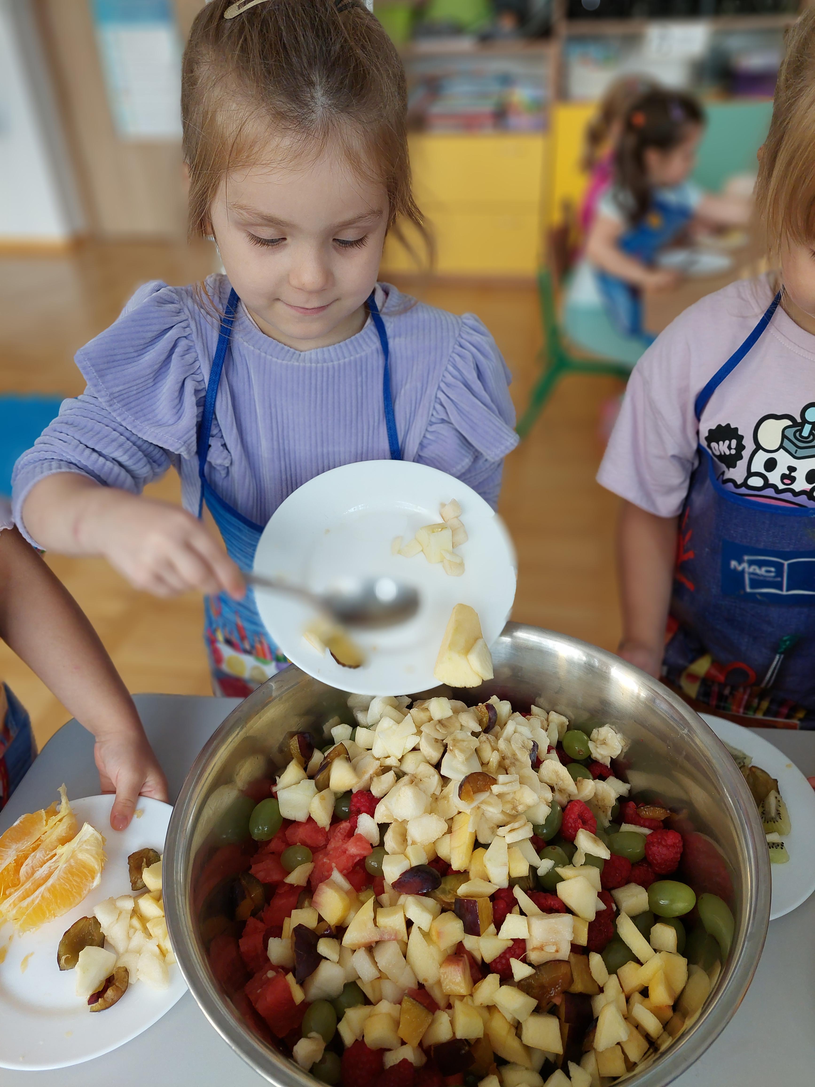 W dniu dzisiejszym dzieci z naszej grupy wspólnie przygotowały pyszną sałatkę owocową. Najpierw umyły ręce i zapoznały się z różnymi owocami, poznając ich kolory, kształty i zapachy. Następnie z pomocą nauczyciela kroiły owoce na małe kawałki i wrzucały je do dużej miski. Na koniec wszystko dokładnie mieszały i spróbowały własnoręcznie przygotowanej sałatki. Zajęcia były świetną okazją do nauki współpracy, rozwijania samodzielności oraz zdrowych nawyków żywieniowych.