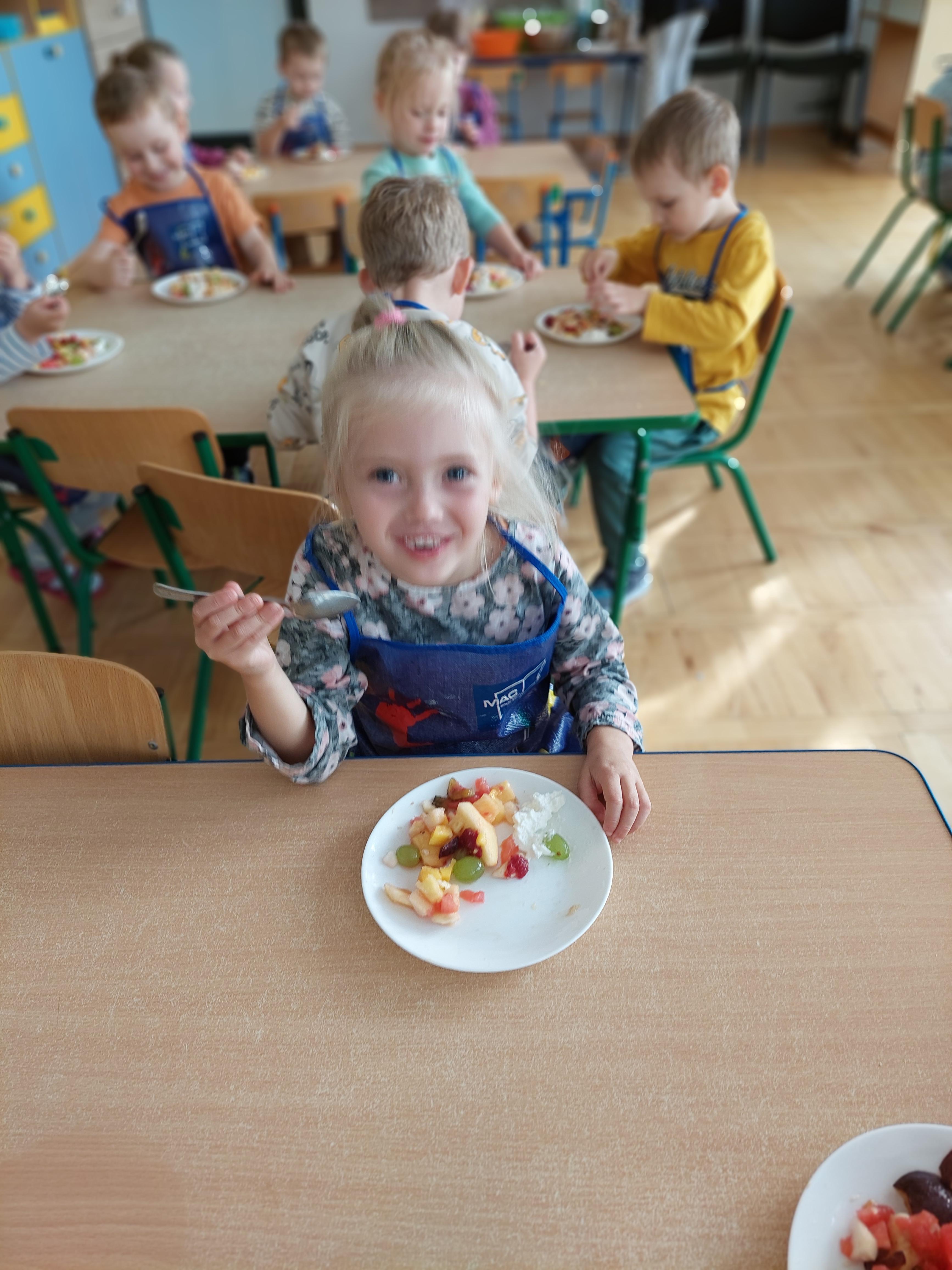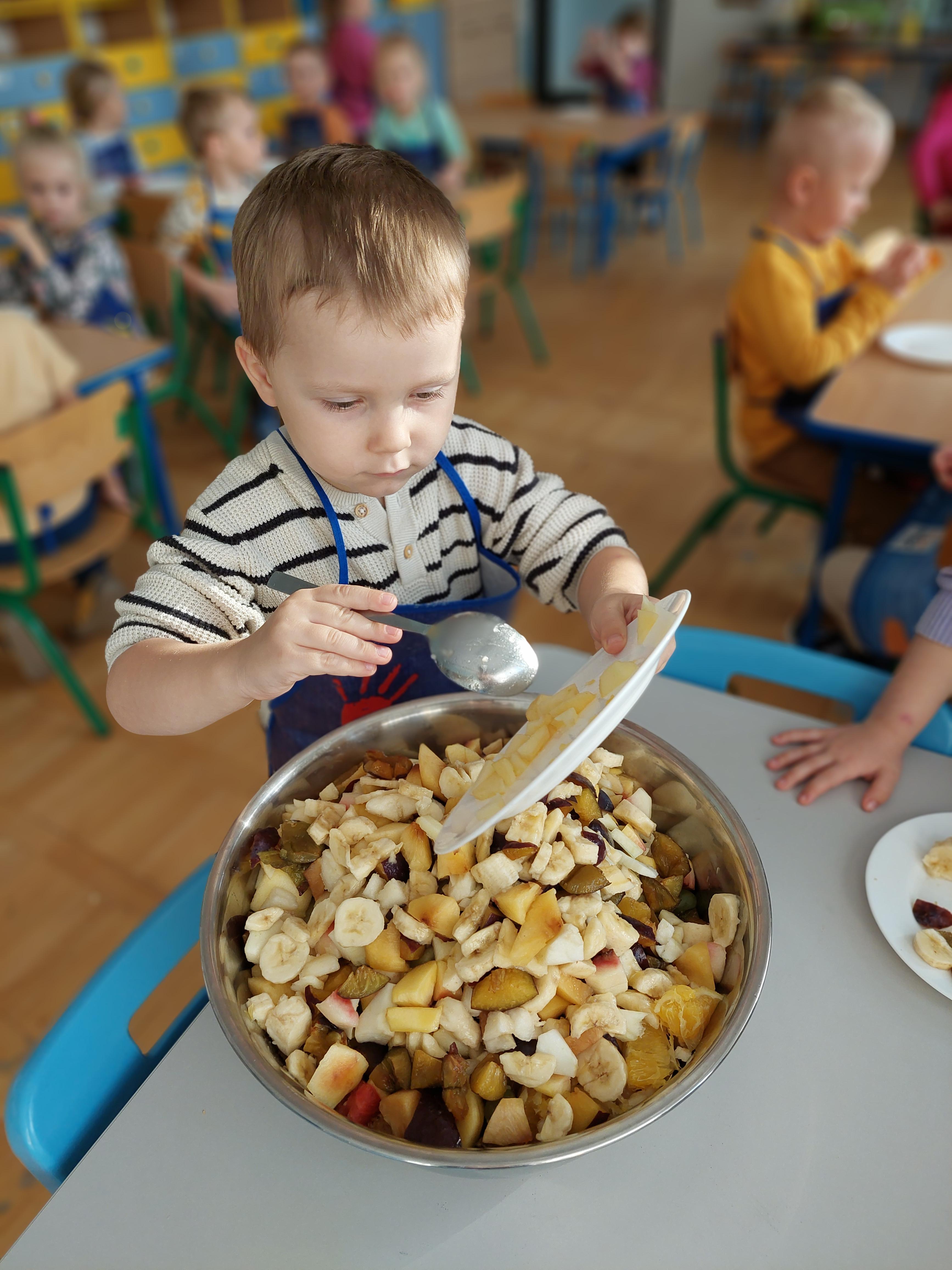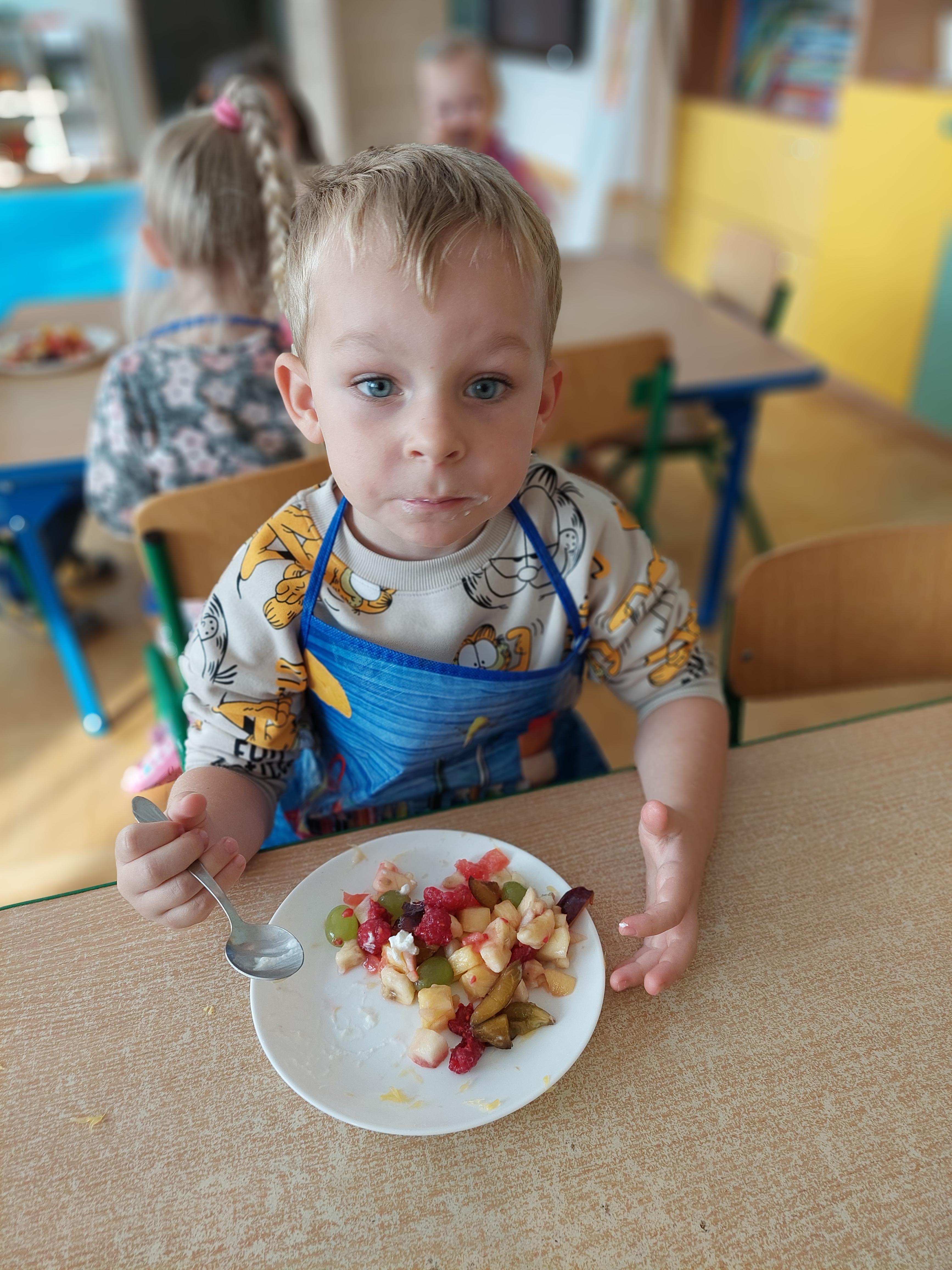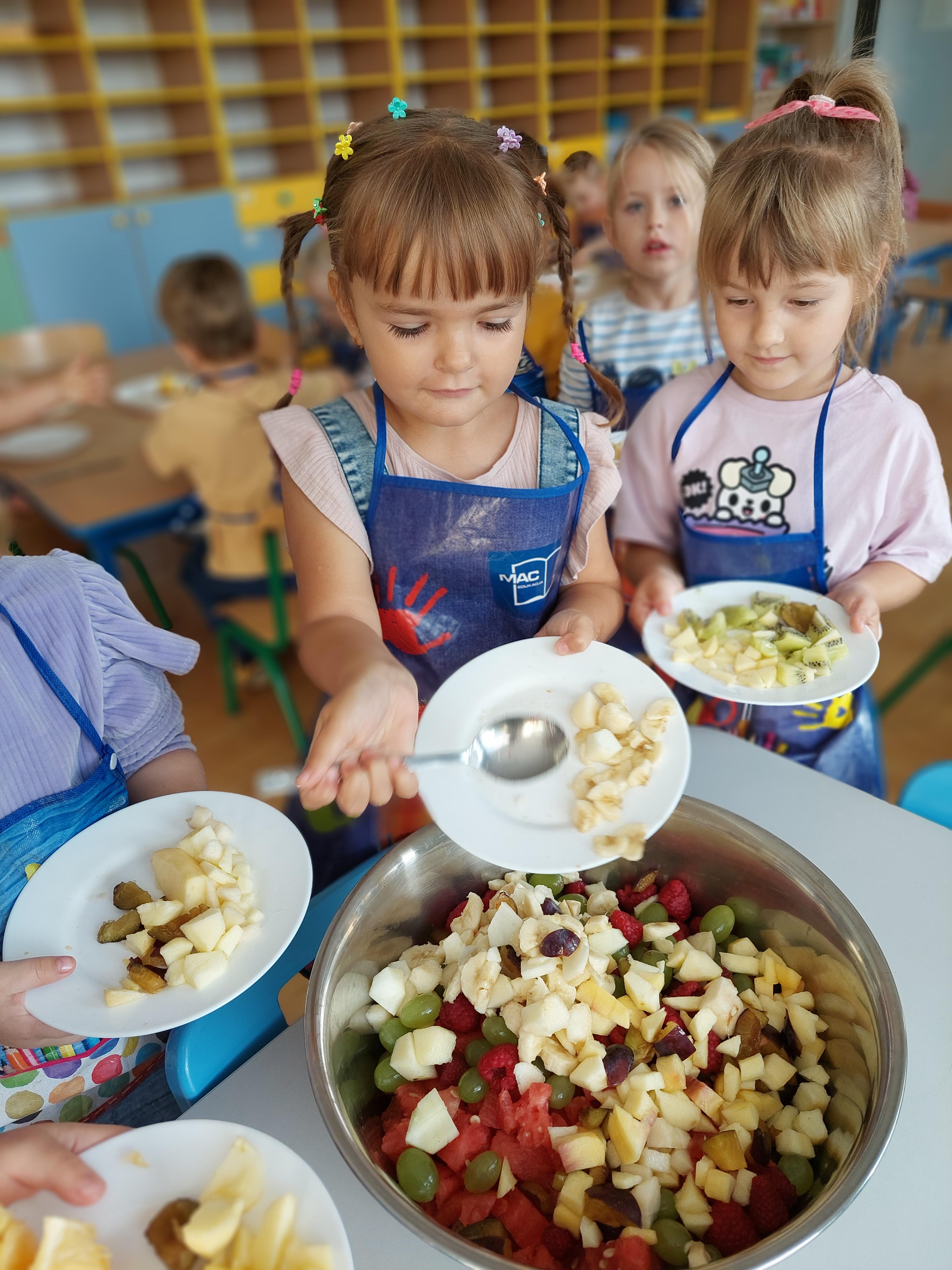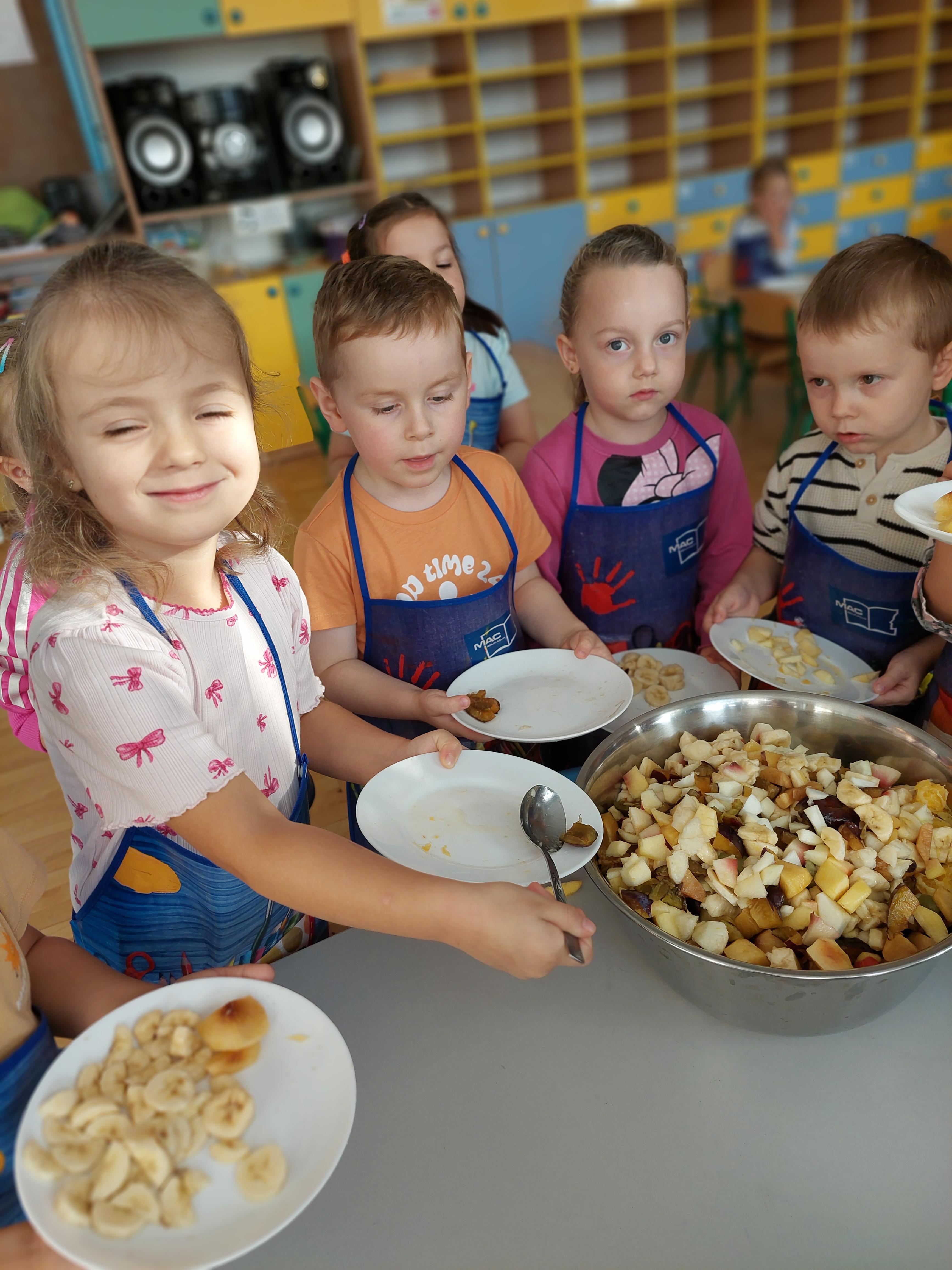 W dniu dzisiejszym dzieci z naszej grupy wspólnie przygotowały pyszną sałatkę owocową. Najpierw umyły ręce i zapoznały się z różnymi owocami, poznając ich kolory, kształty i zapachy. Następnie z pomocą nauczyciela kroiły owoce na małe kawałki i wrzucały je do dużej miski. Na koniec wszystko dokładnie mieszały i spróbowały własnoręcznie przygotowanej sałatki. Zajęcia były świetną okazją do nauki współpracy, rozwijania samodzielności oraz zdrowych nawyków żywieniowych.