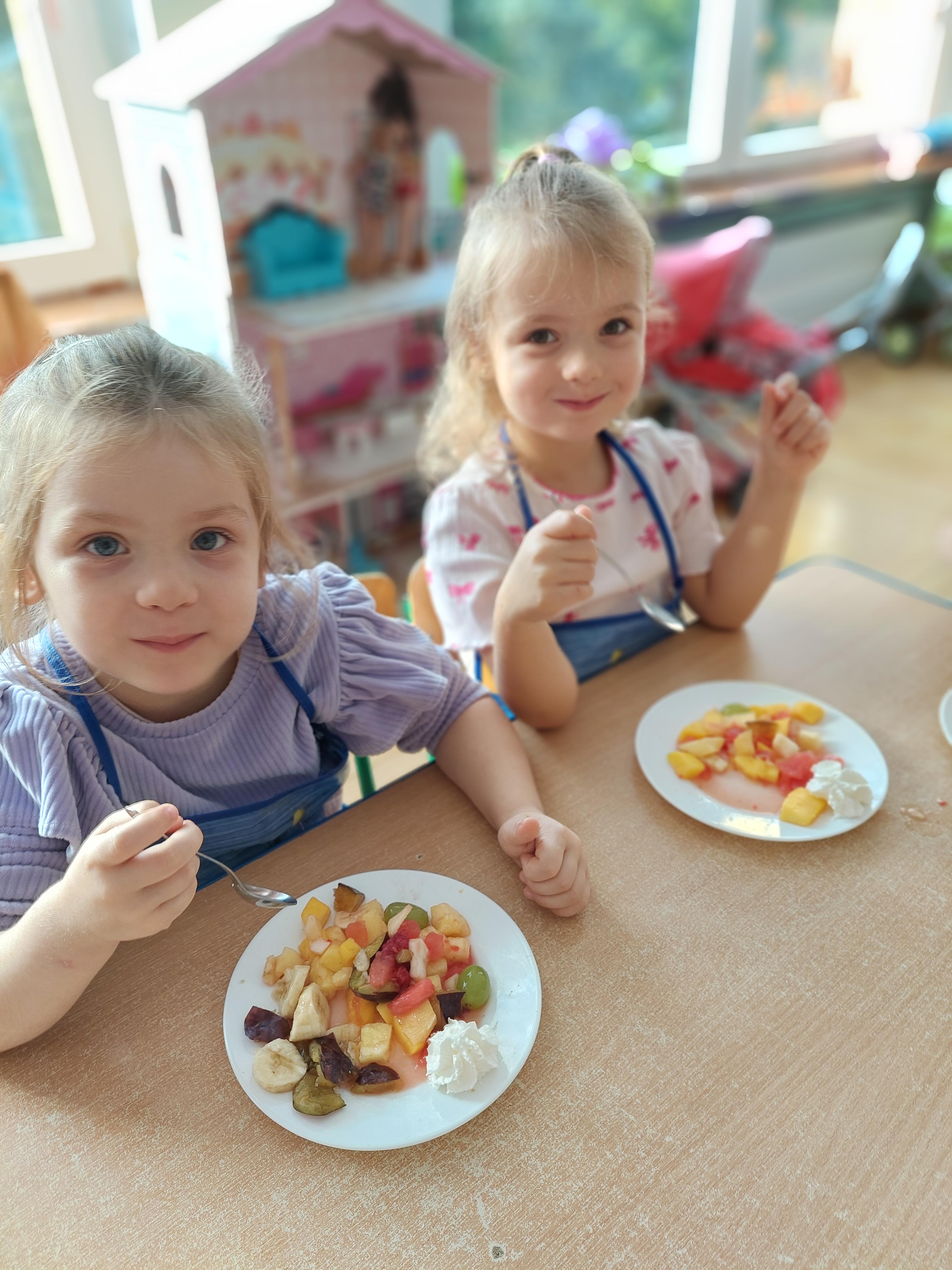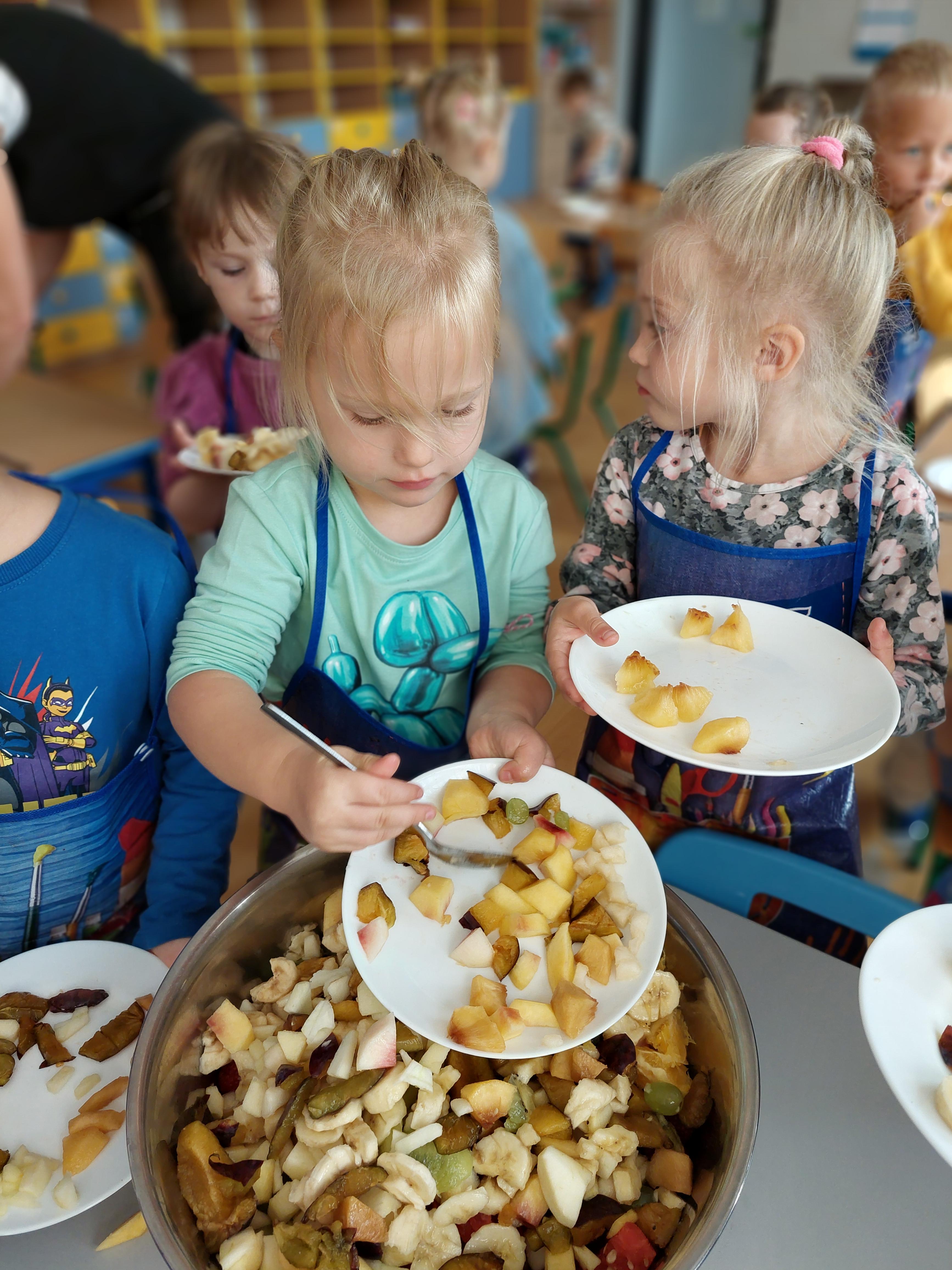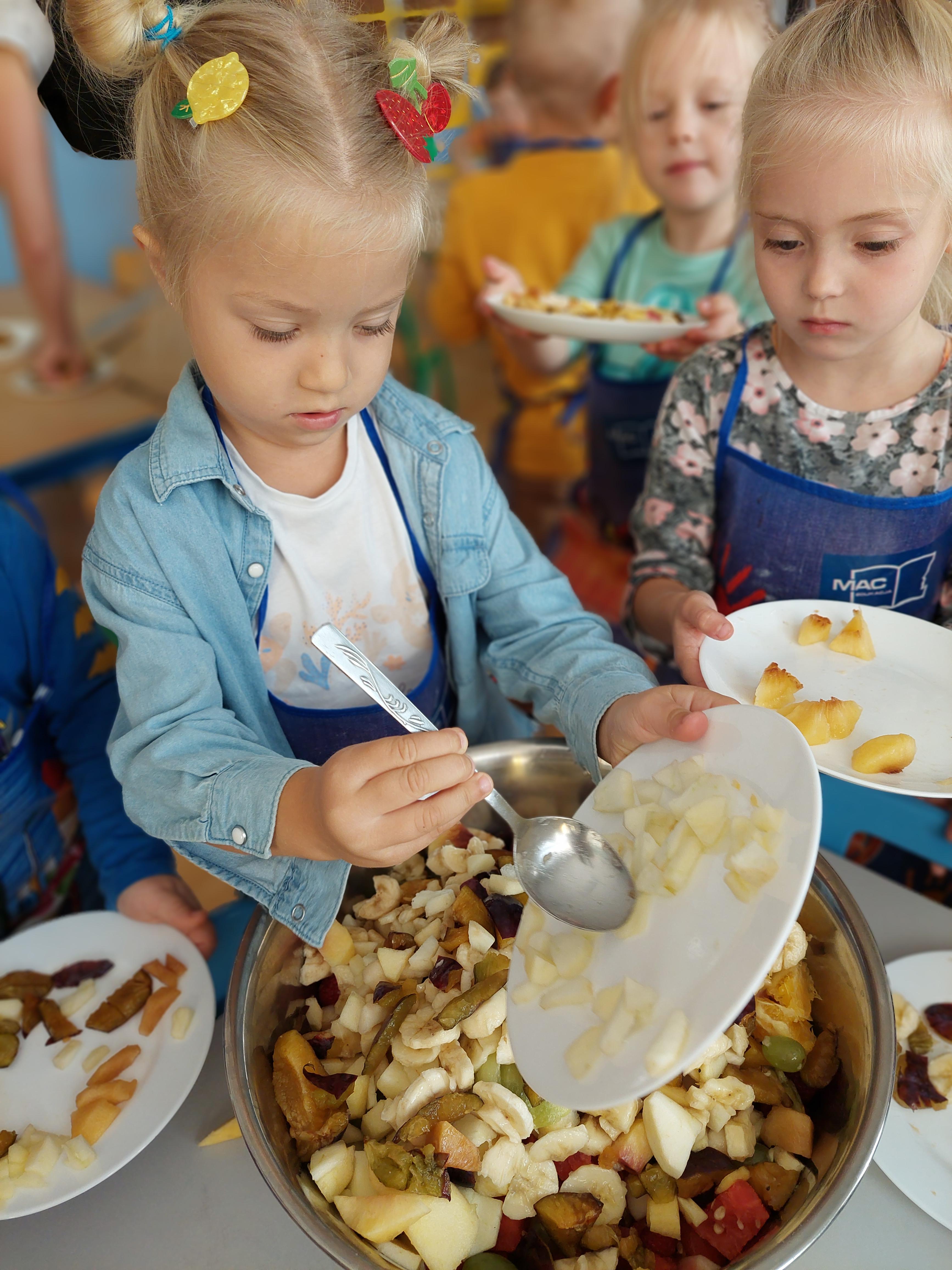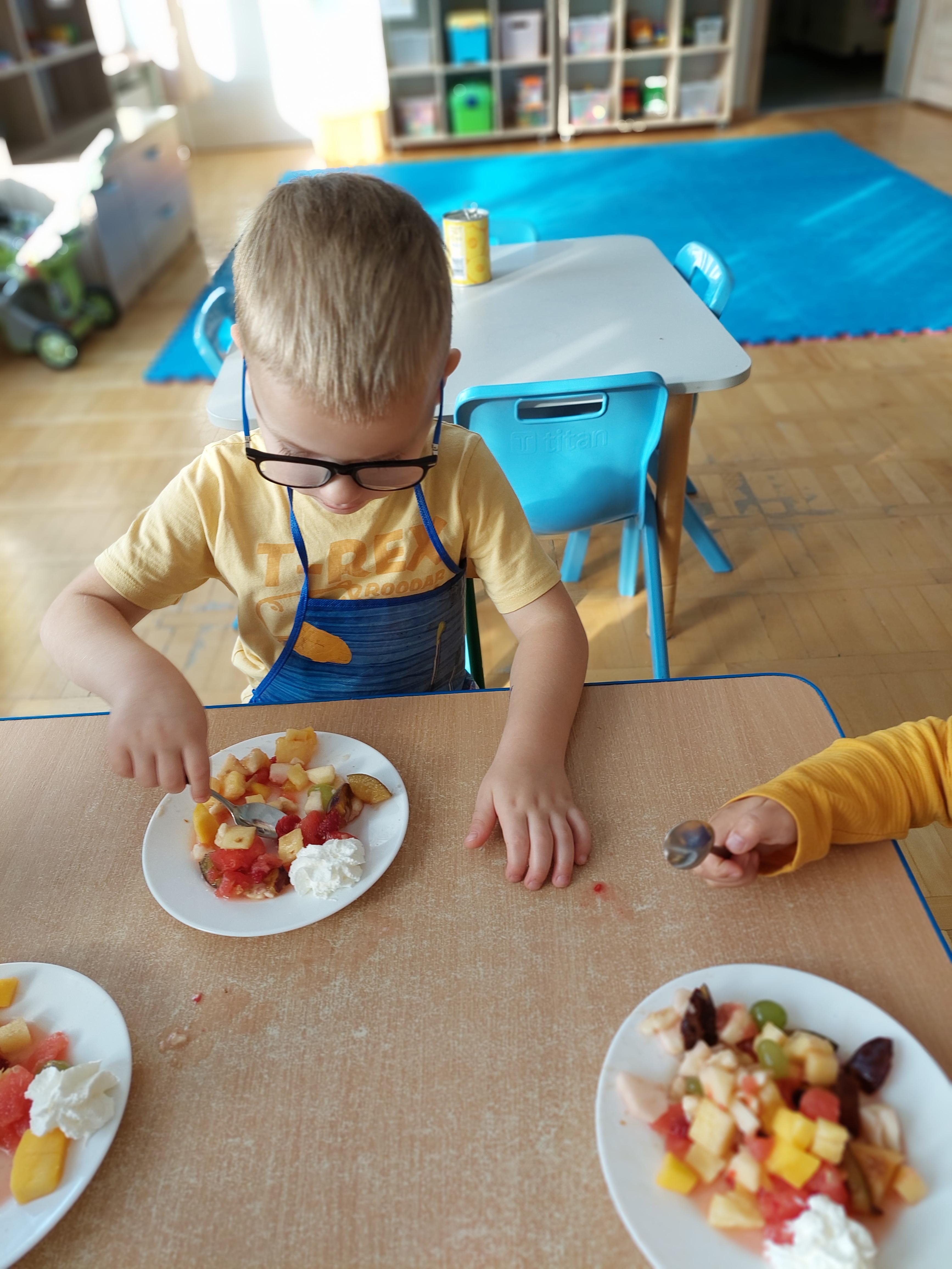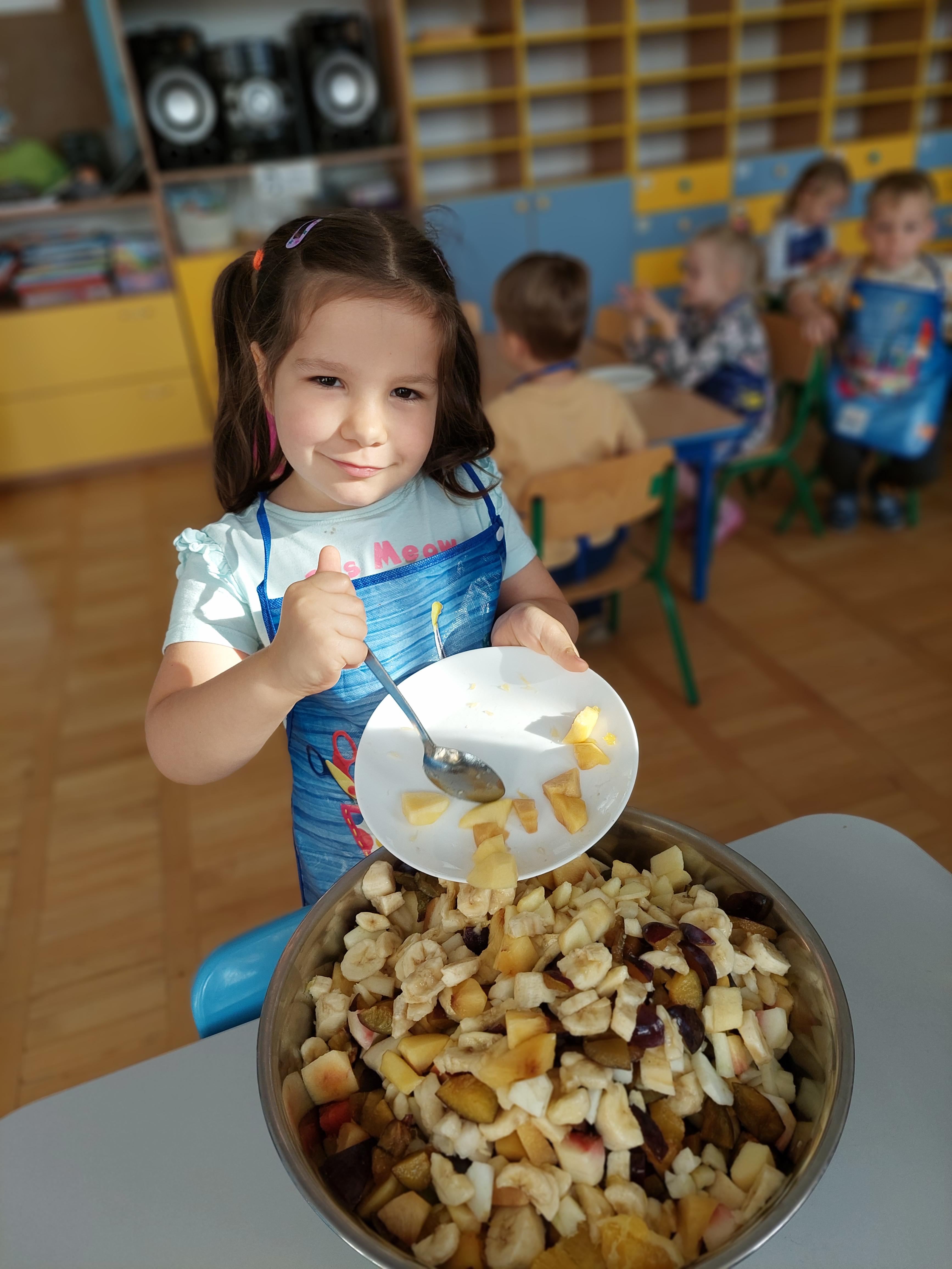 W dniu dzisiejszym dzieci z naszej grupy wspólnie przygotowały pyszną sałatkę owocową. Najpierw umyły ręce i zapoznały się z różnymi owocami, poznając ich kolory, kształty i zapachy. Następnie z pomocą nauczyciela kroiły owoce na małe kawałki i wrzucały je do dużej miski. Na koniec wszystko dokładnie mieszały i spróbowały własnoręcznie przygotowanej sałatki. Zajęcia były świetną okazją do nauki współpracy, rozwijania samodzielności oraz zdrowych nawyków żywieniowych.