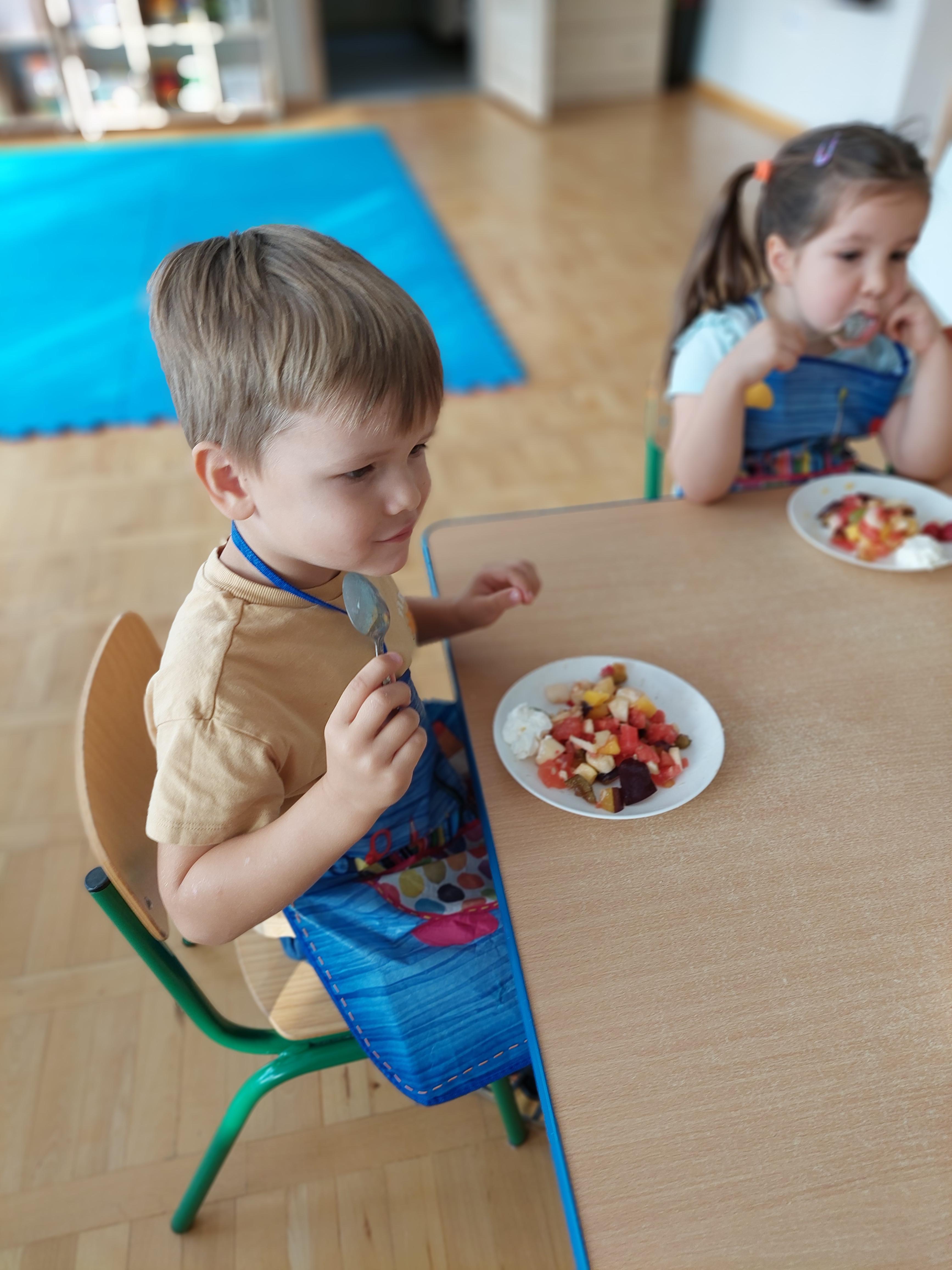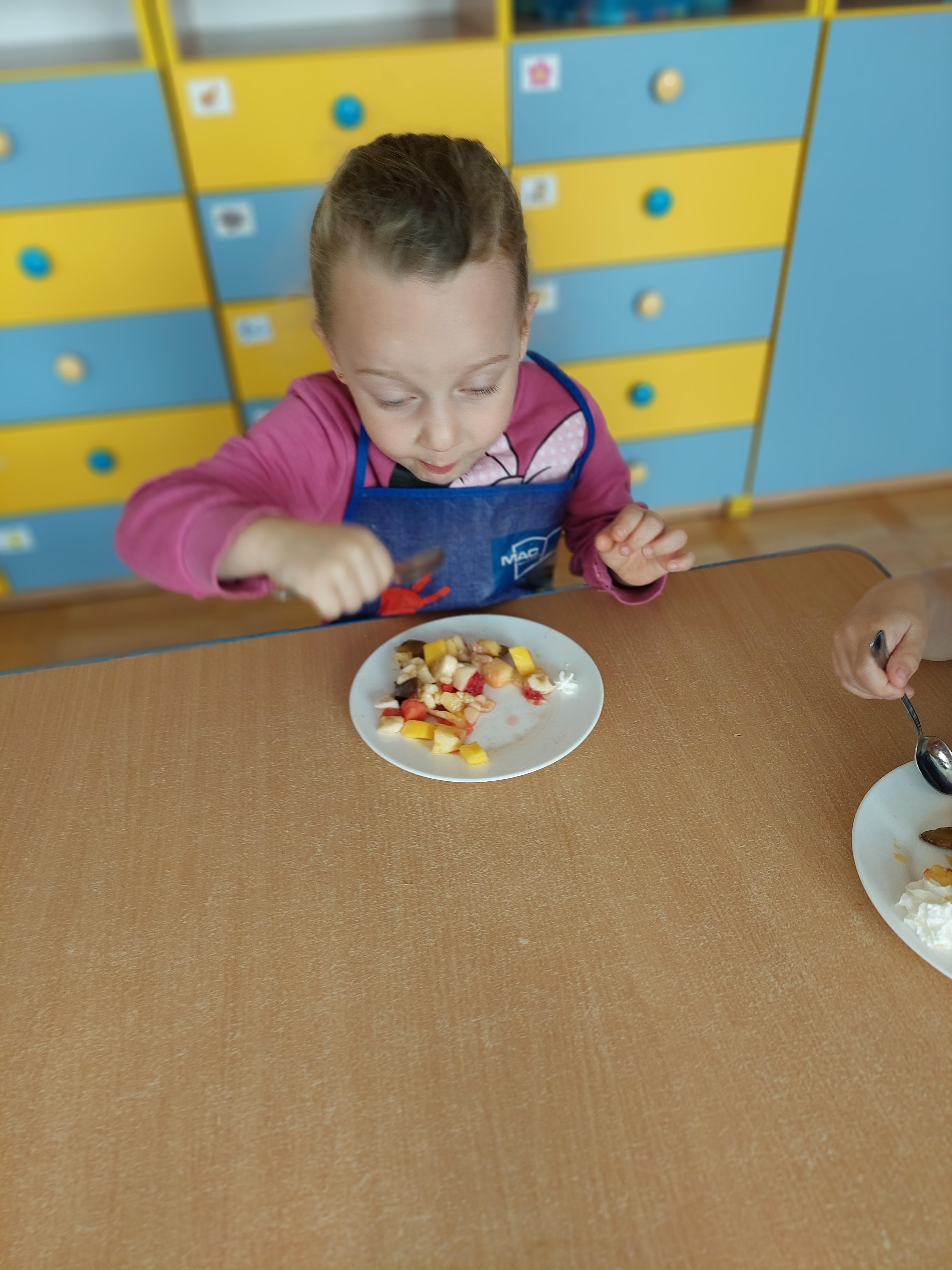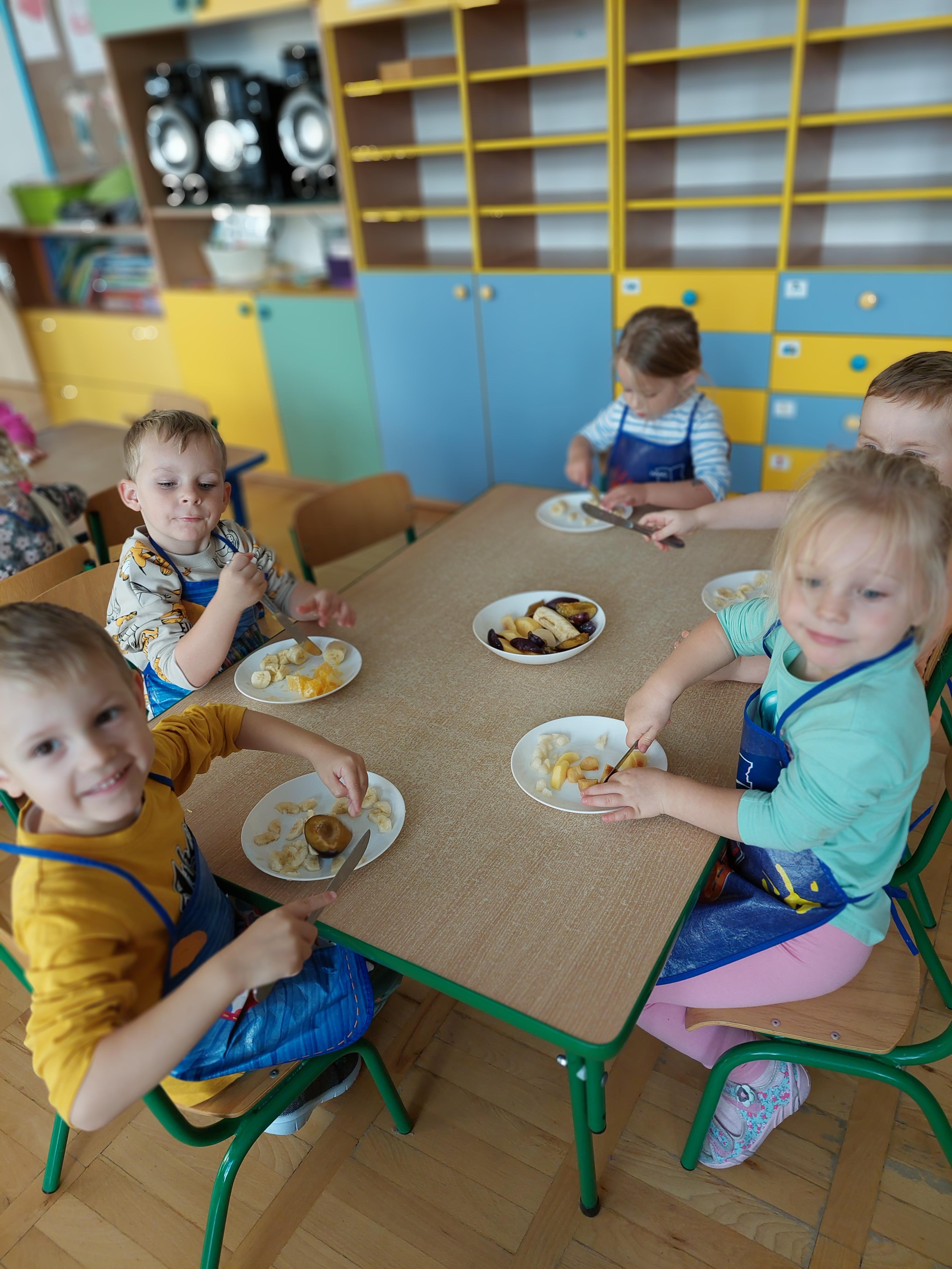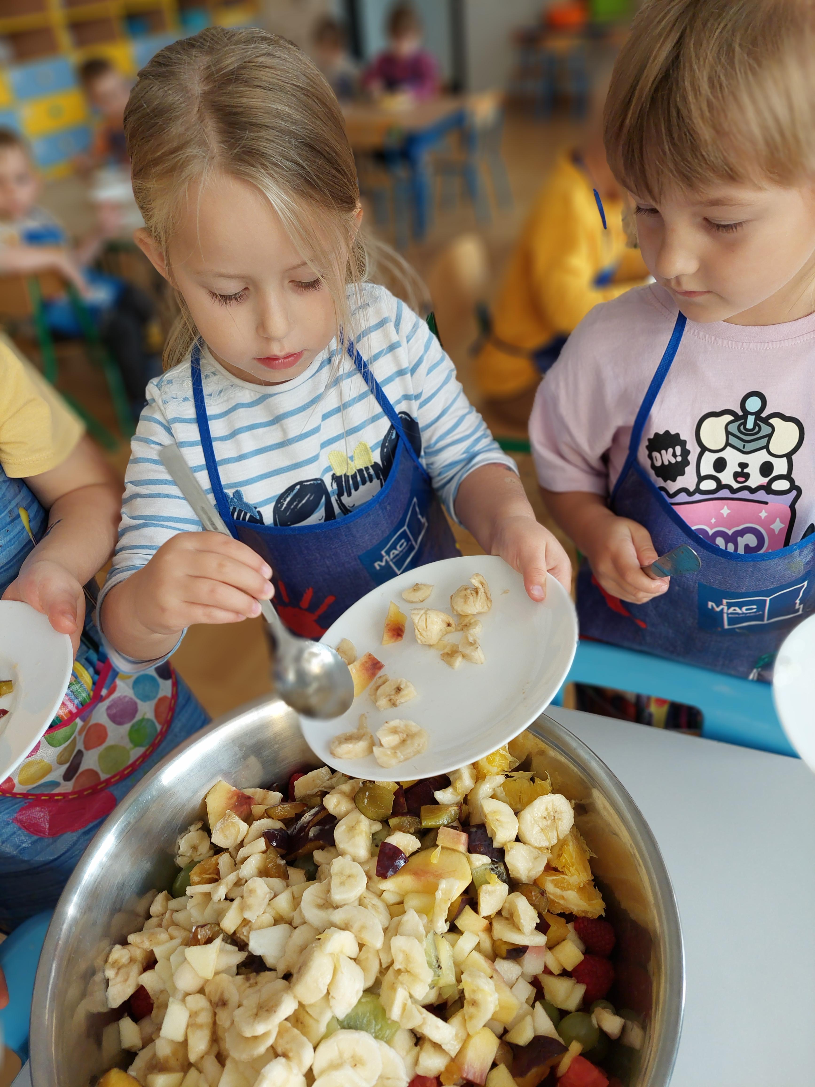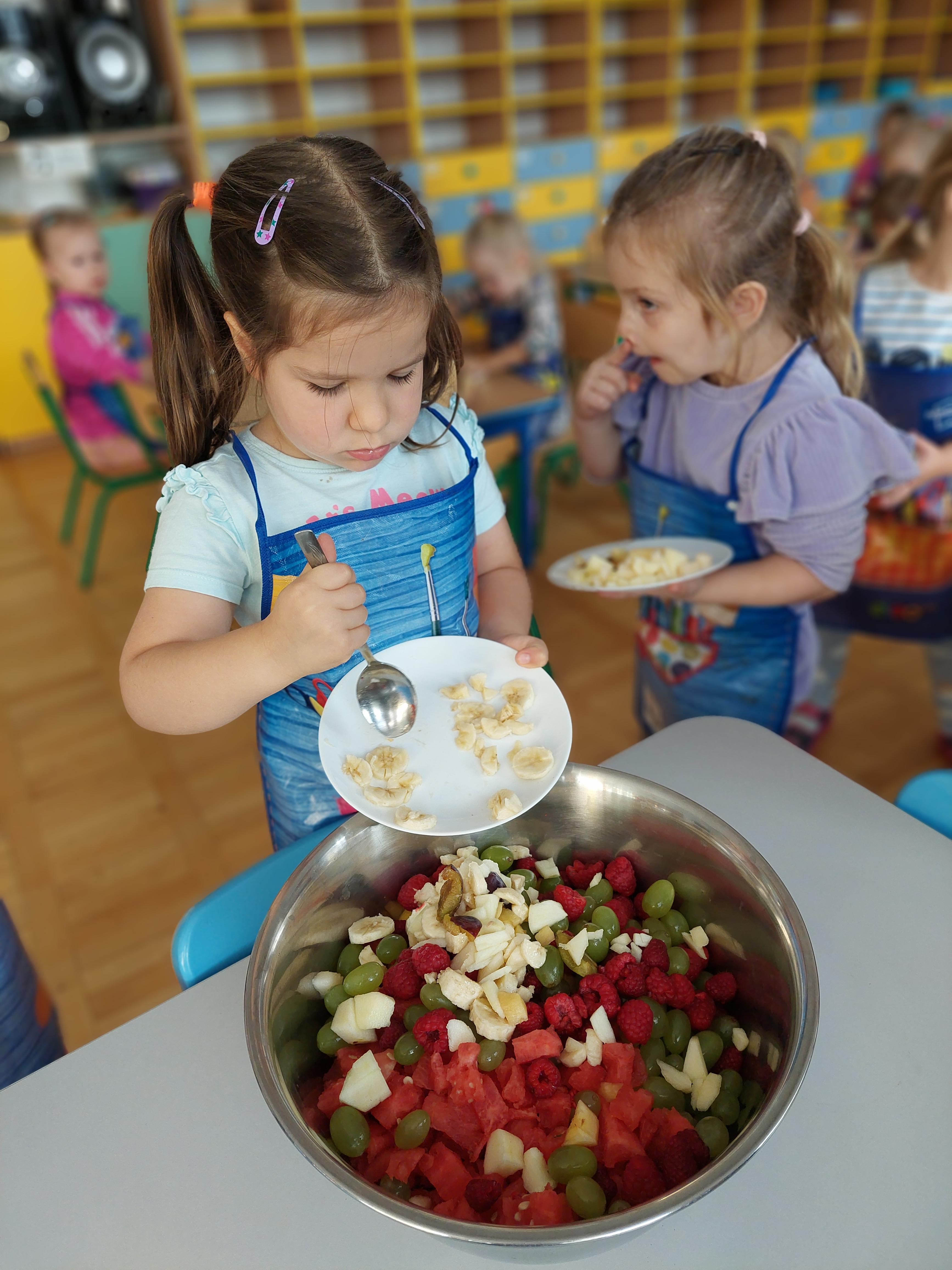 W dniu dzisiejszym dzieci z naszej grupy wspólnie przygotowały pyszną sałatkę owocową. Najpierw umyły ręce i zapoznały się z różnymi owocami, poznając ich kolory, kształty i zapachy. Następnie z pomocą nauczyciela kroiły owoce na małe kawałki i wrzucały je do dużej miski. Na koniec wszystko dokładnie mieszały i spróbowały własnoręcznie przygotowanej sałatki. Zajęcia były świetną okazją do nauki współpracy, rozwijania samodzielności oraz zdrowych nawyków żywieniowych.