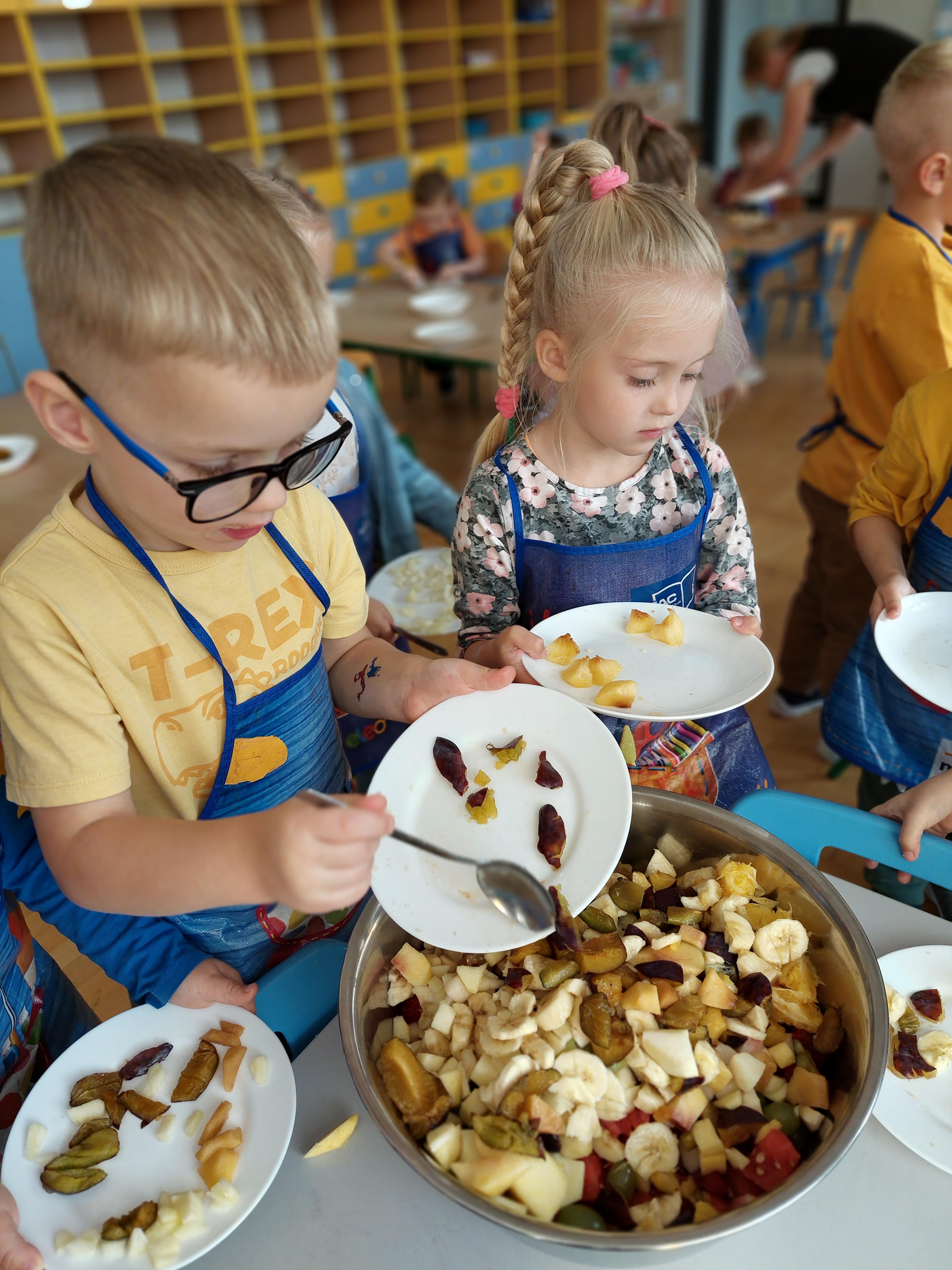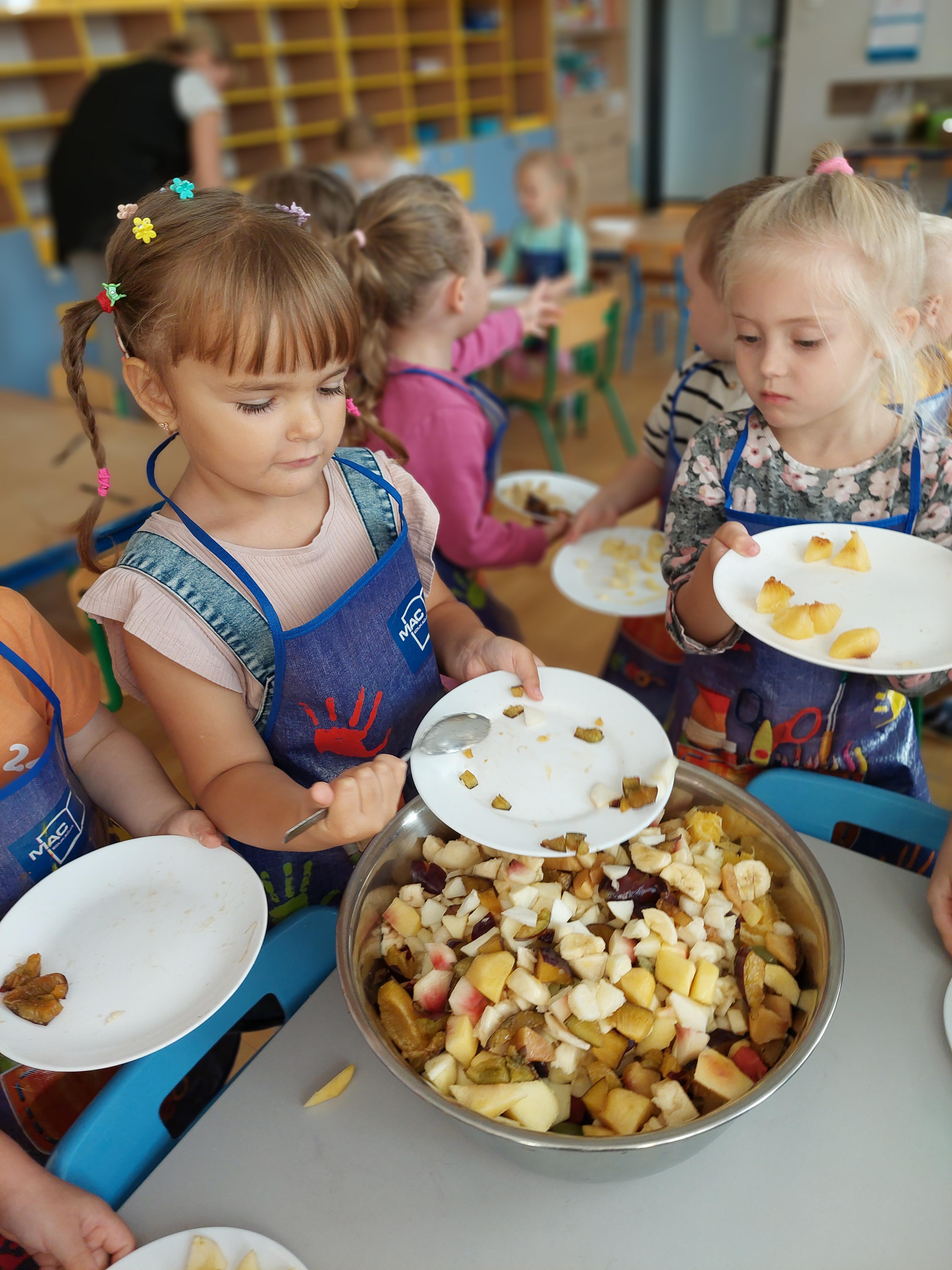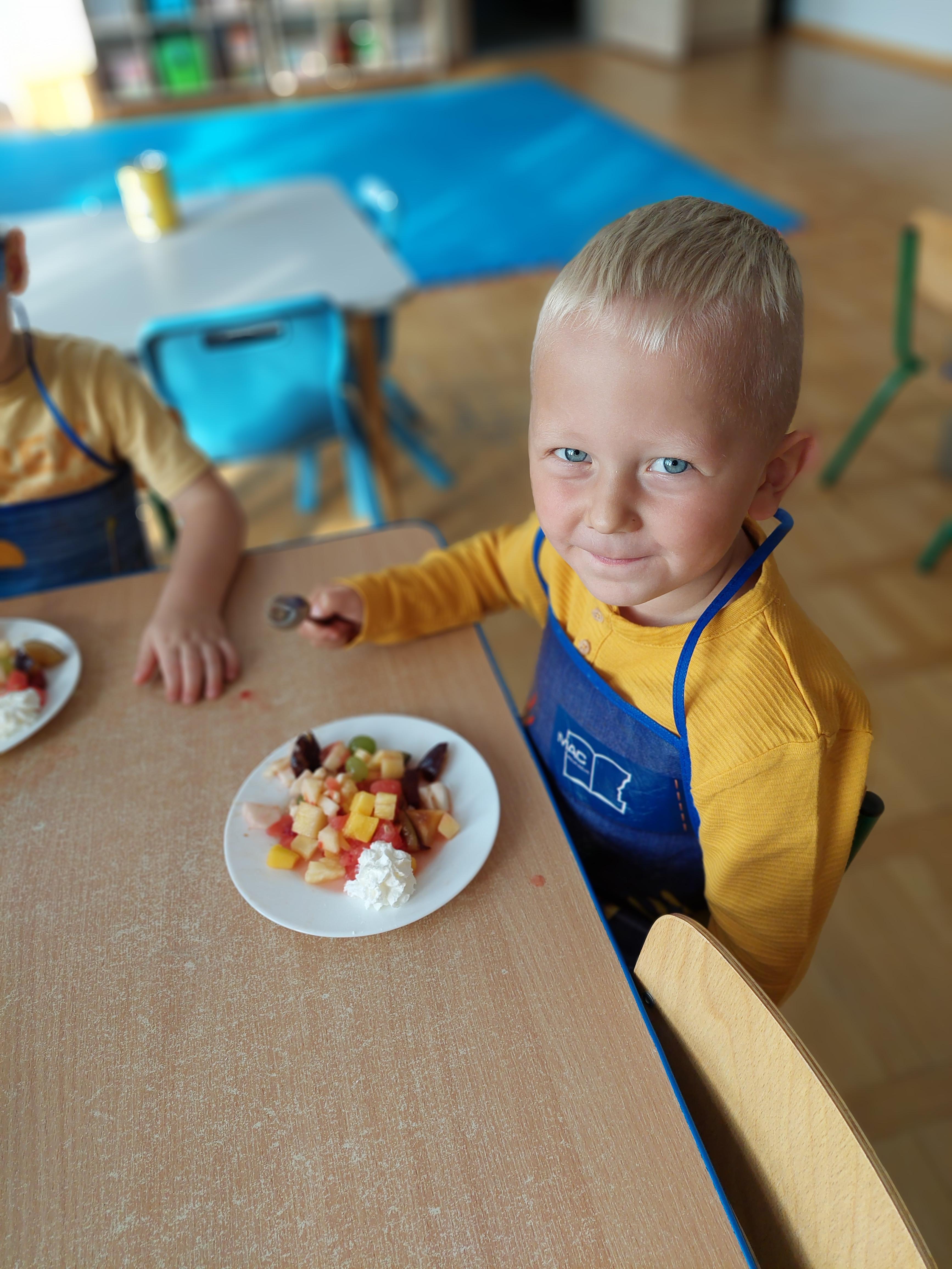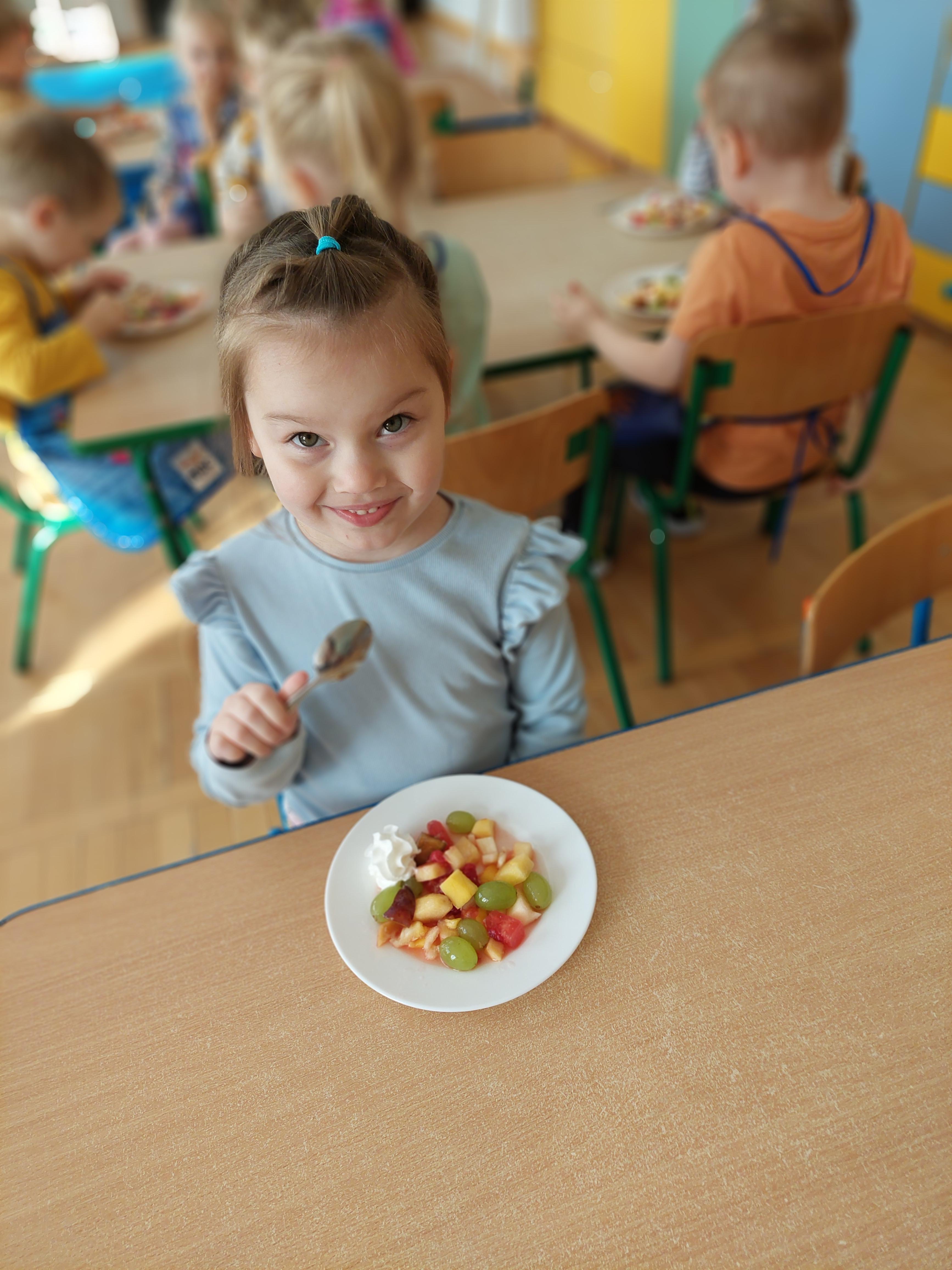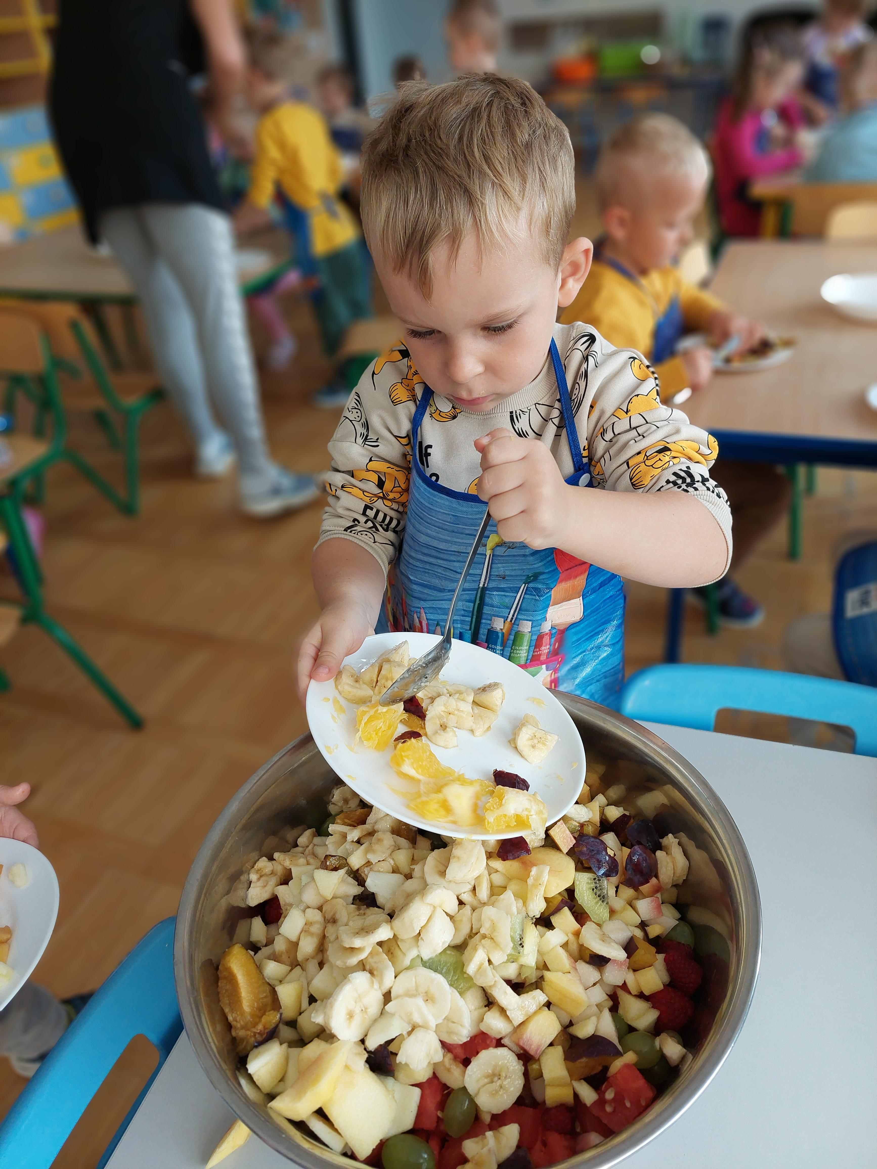 W dniu dzisiejszym dzieci z naszej grupy wspólnie przygotowały pyszną sałatkę owocową. Najpierw umyły ręce i zapoznały się z różnymi owocami, poznając ich kolory, kształty i zapachy. Następnie z pomocą nauczyciela kroiły owoce na małe kawałki i wrzucały je do dużej miski. Na koniec wszystko dokładnie mieszały i spróbowały własnoręcznie przygotowanej sałatki. Zajęcia były świetną okazją do nauki współpracy, rozwijania samodzielności oraz zdrowych nawyków żywieniowych.