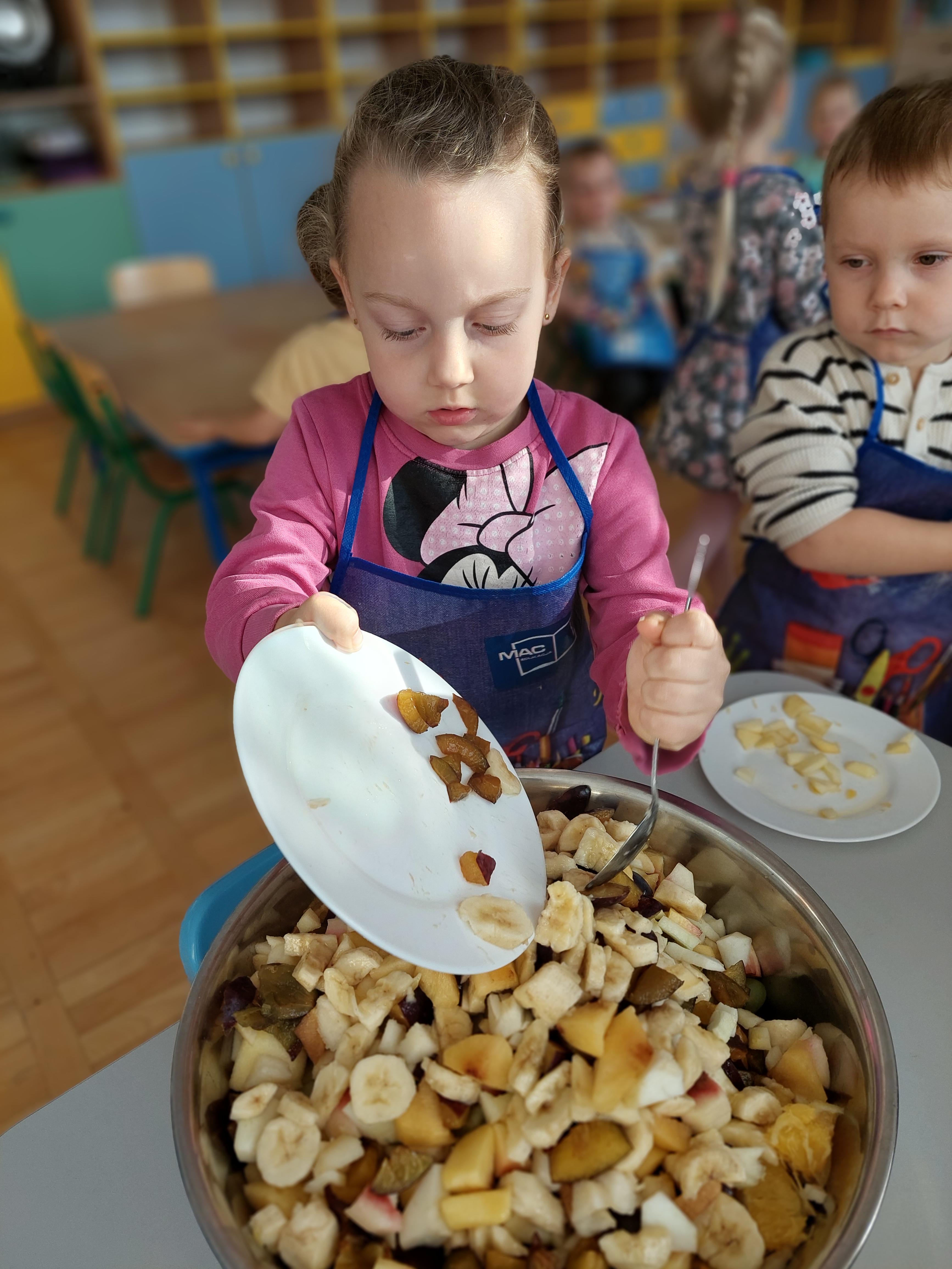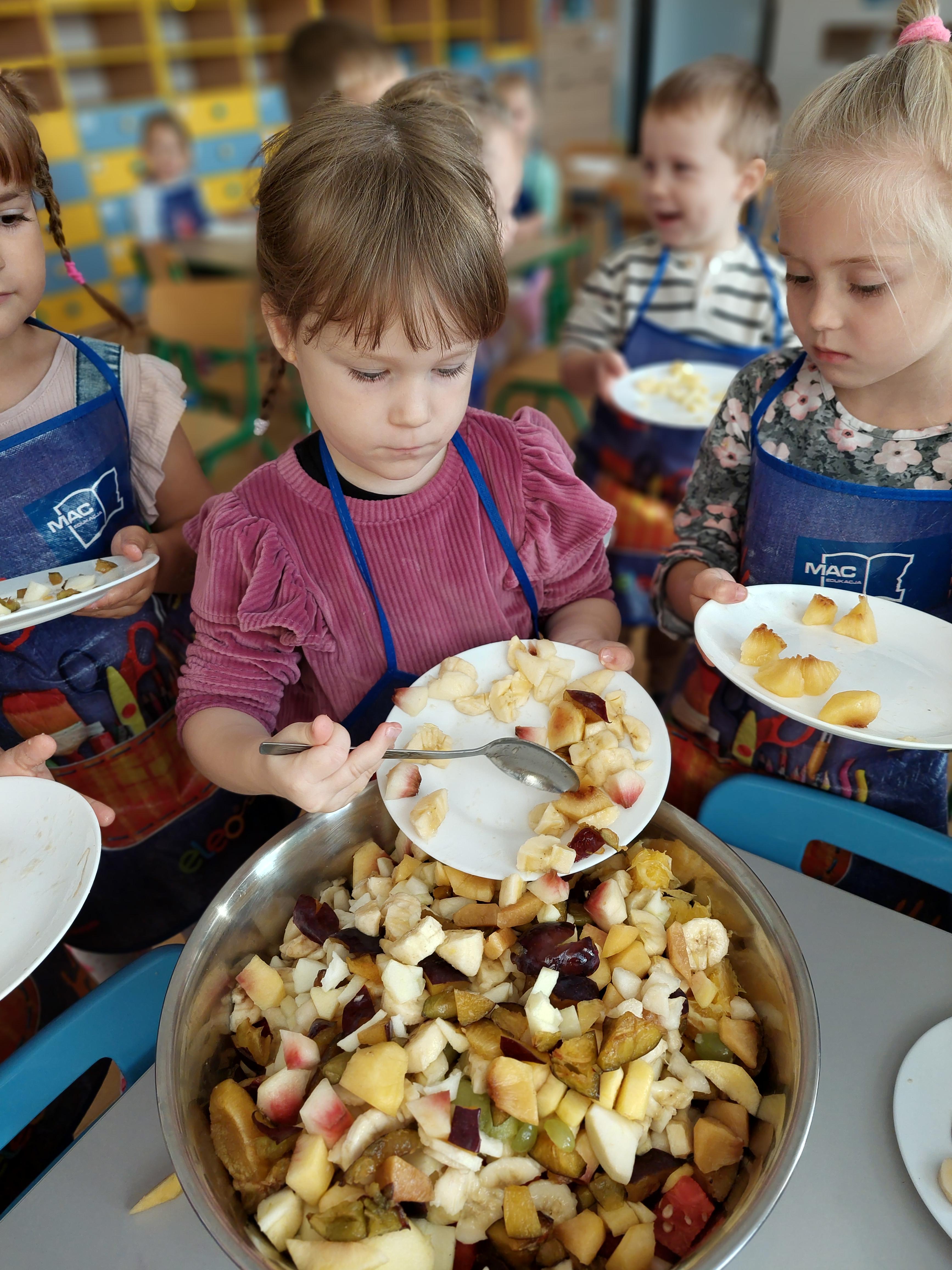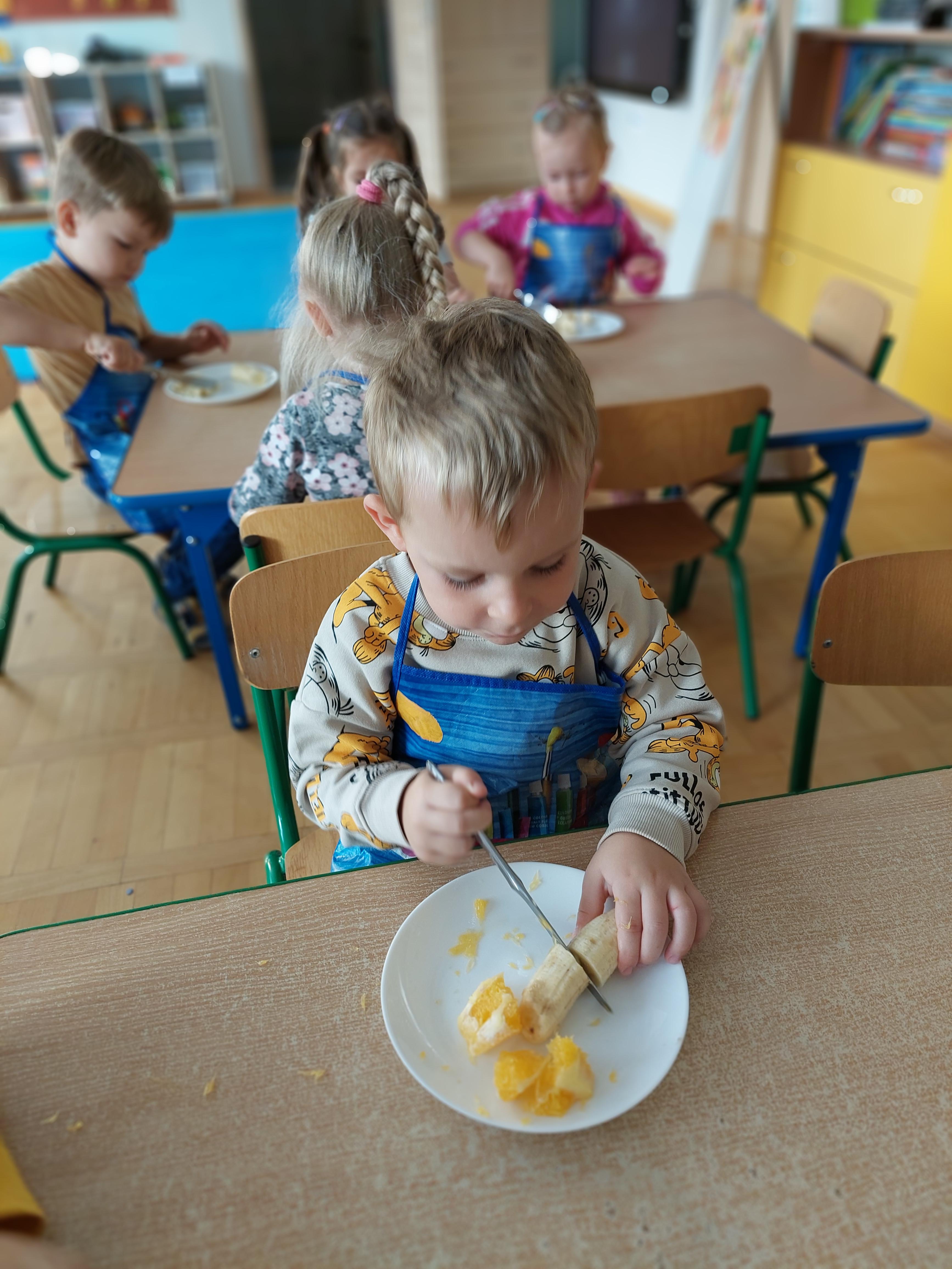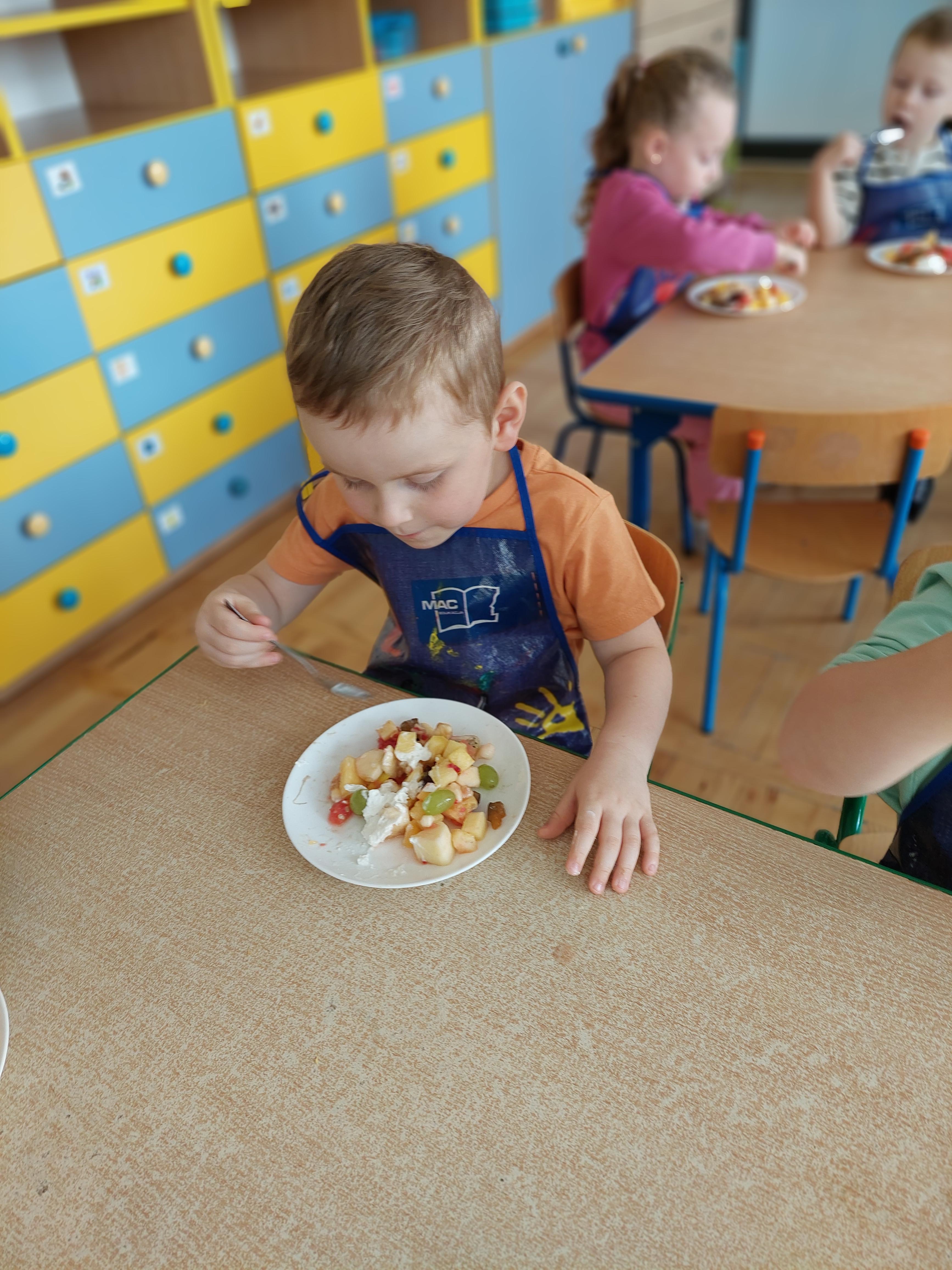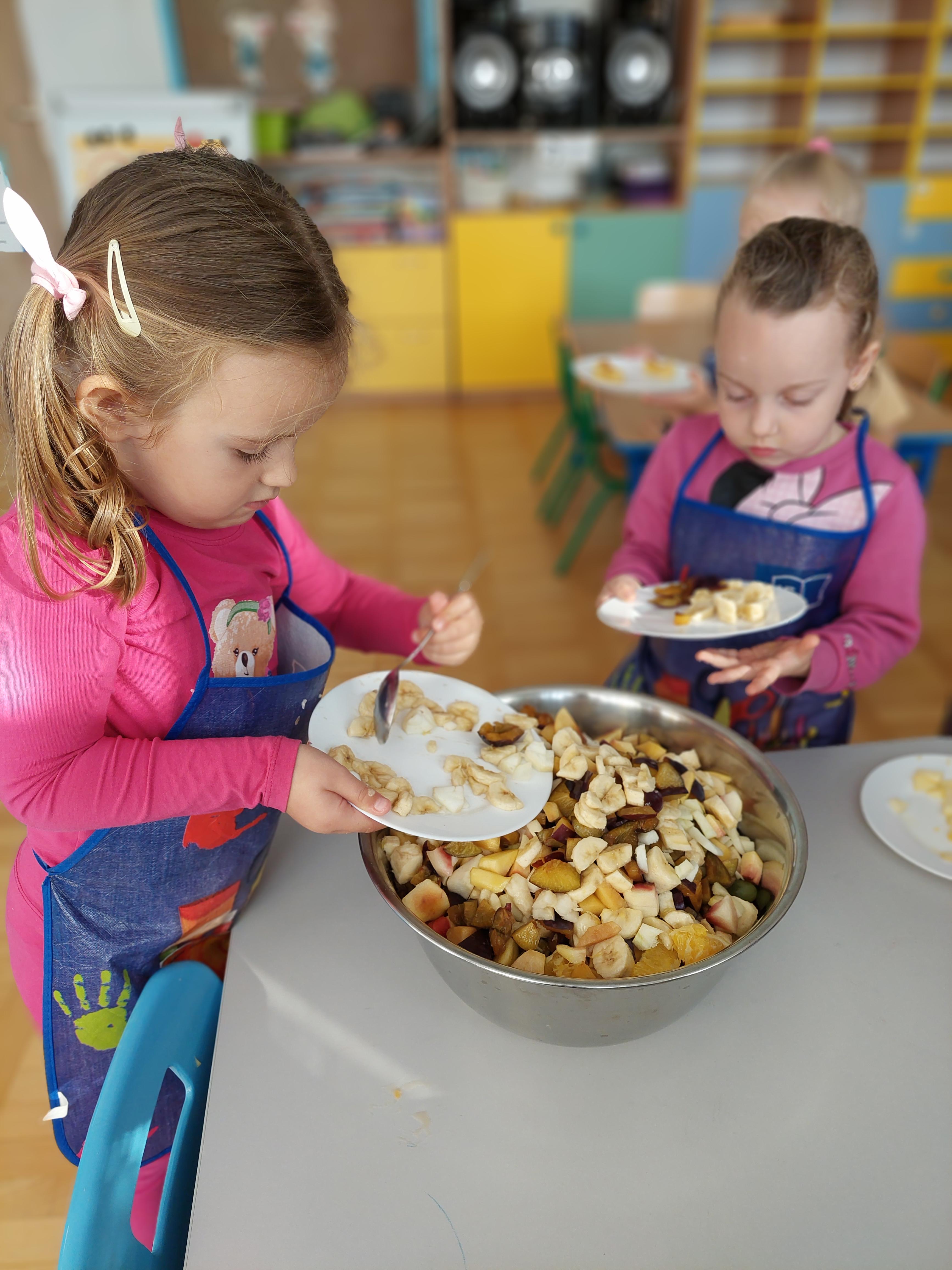 W dniu dzisiejszym dzieci z naszej grupy wspólnie przygotowały pyszną sałatkę owocową. Najpierw umyły ręce i zapoznały się z różnymi owocami, poznając ich kolory, kształty i zapachy. Następnie z pomocą nauczyciela kroiły owoce na małe kawałki i wrzucały je do dużej miski. Na koniec wszystko dokładnie mieszały i spróbowały własnoręcznie przygotowanej sałatki. Zajęcia były świetną okazją do nauki współpracy, rozwijania samodzielności oraz zdrowych nawyków żywieniowych.