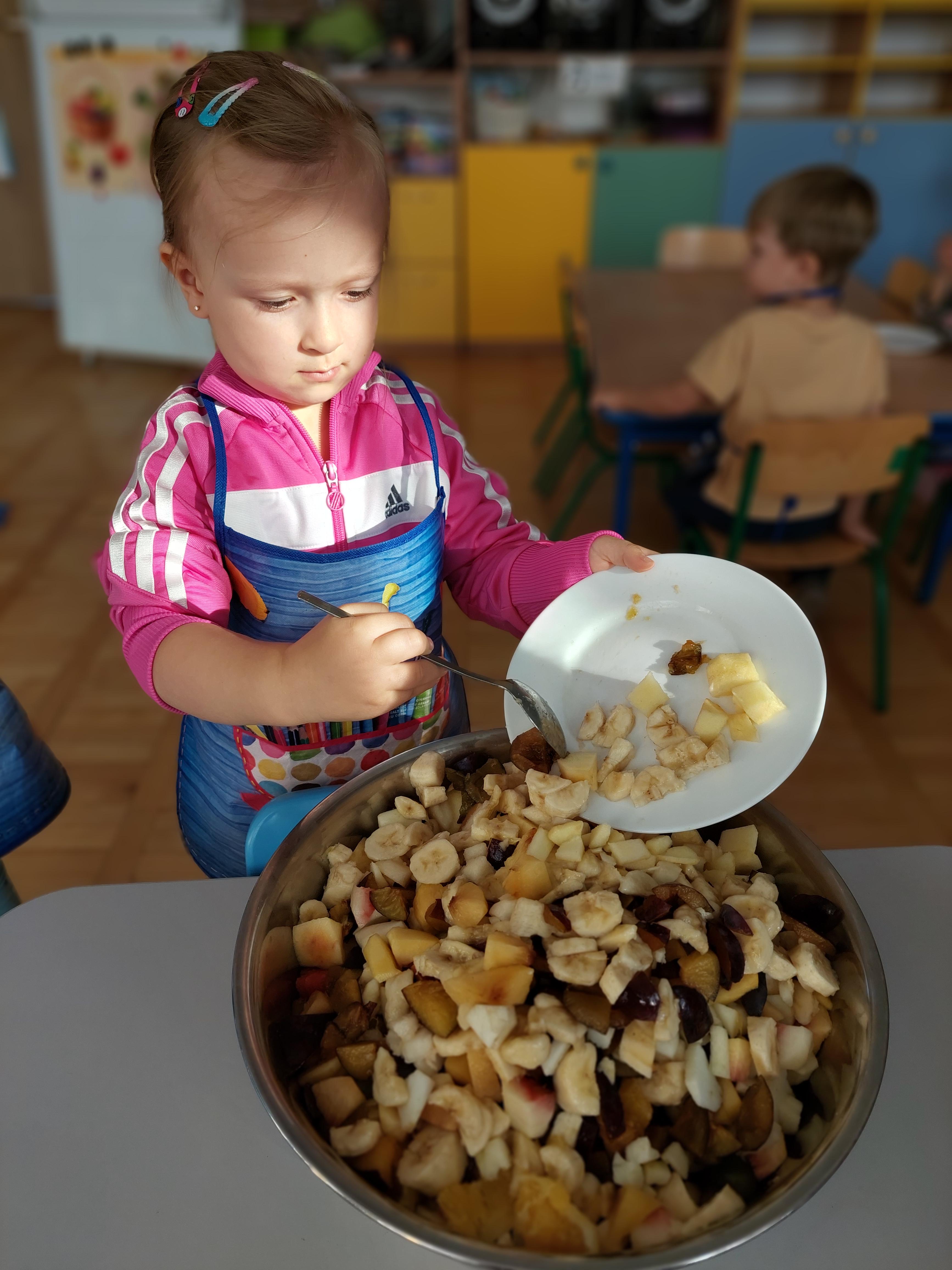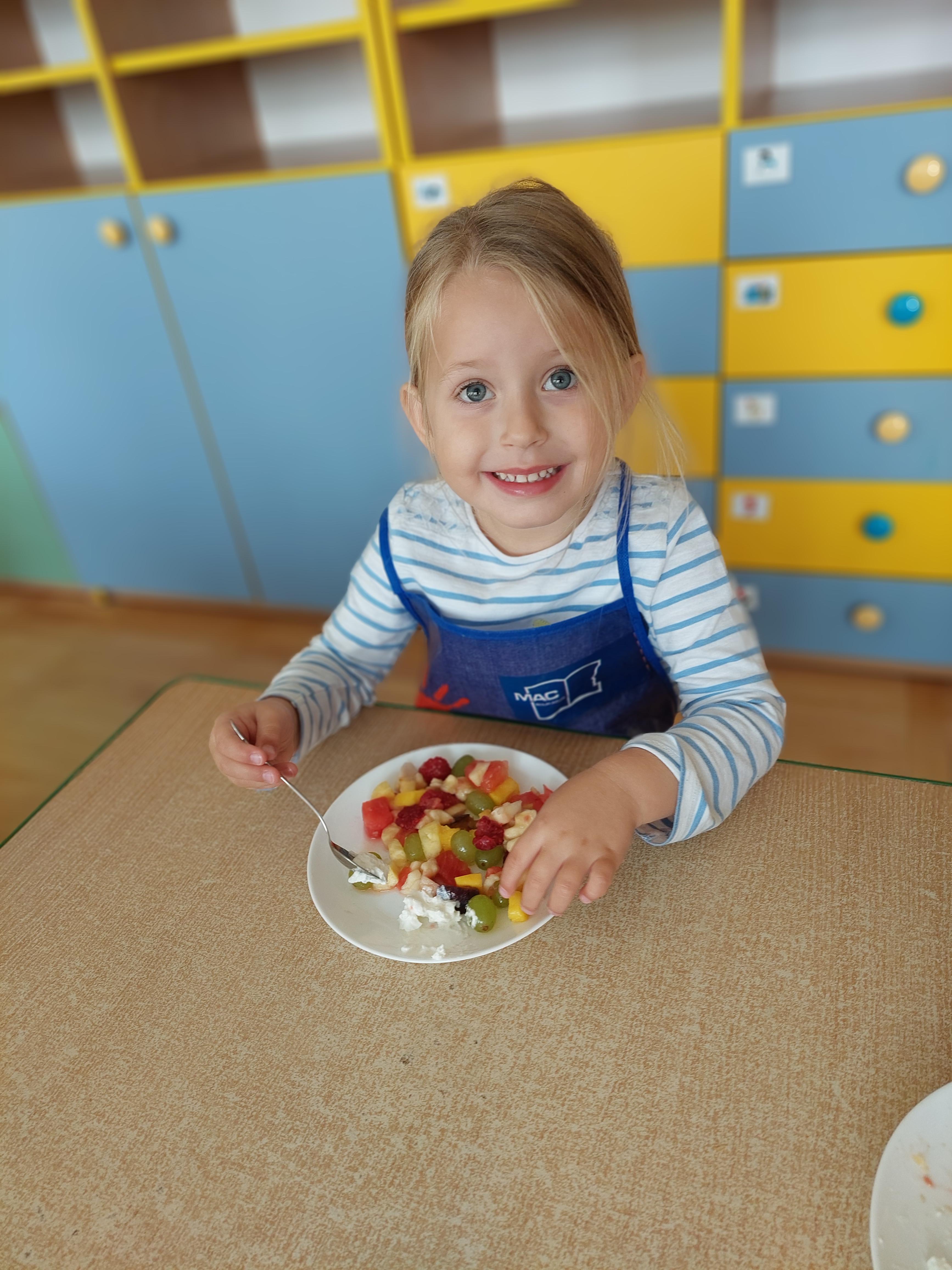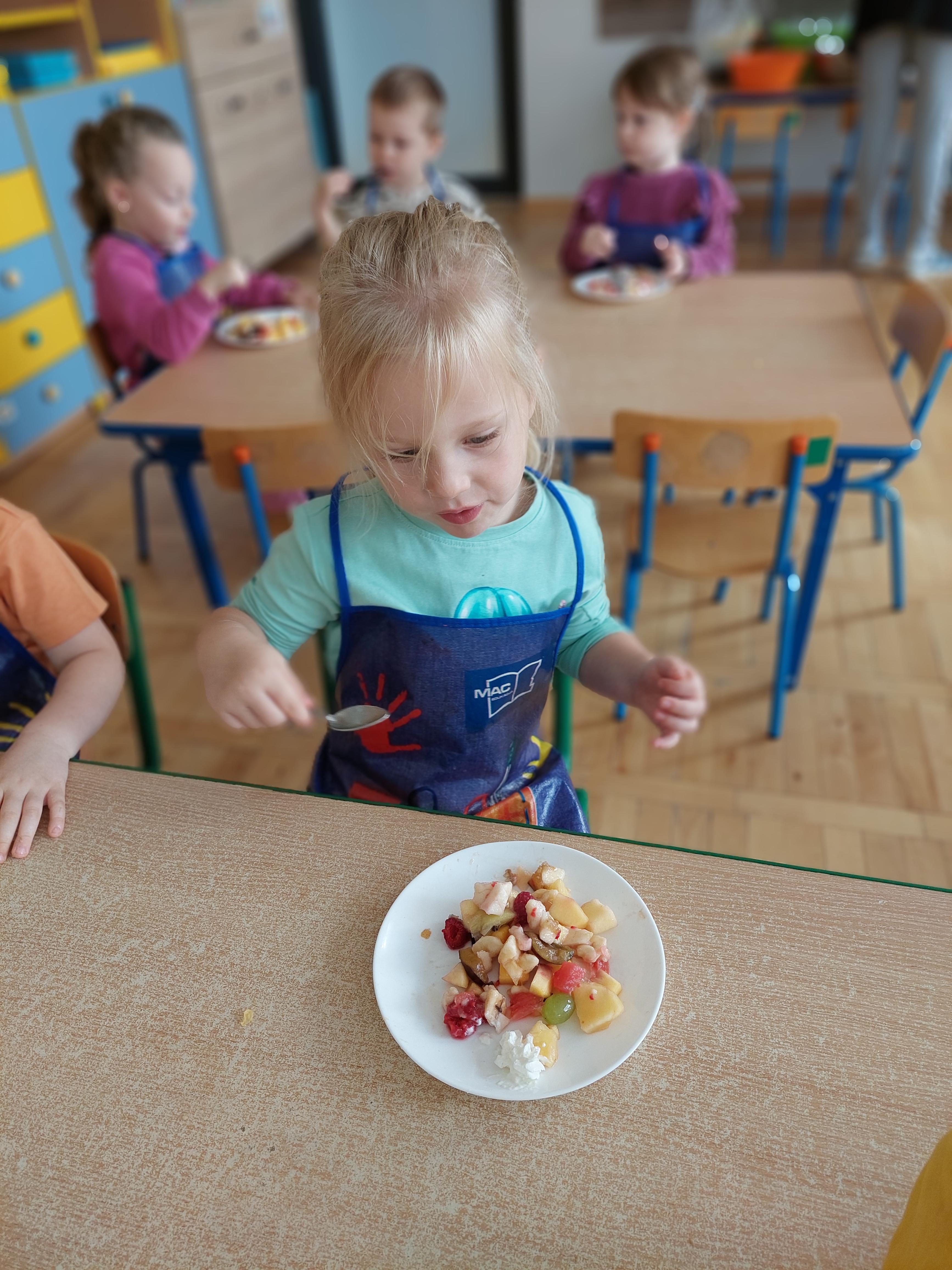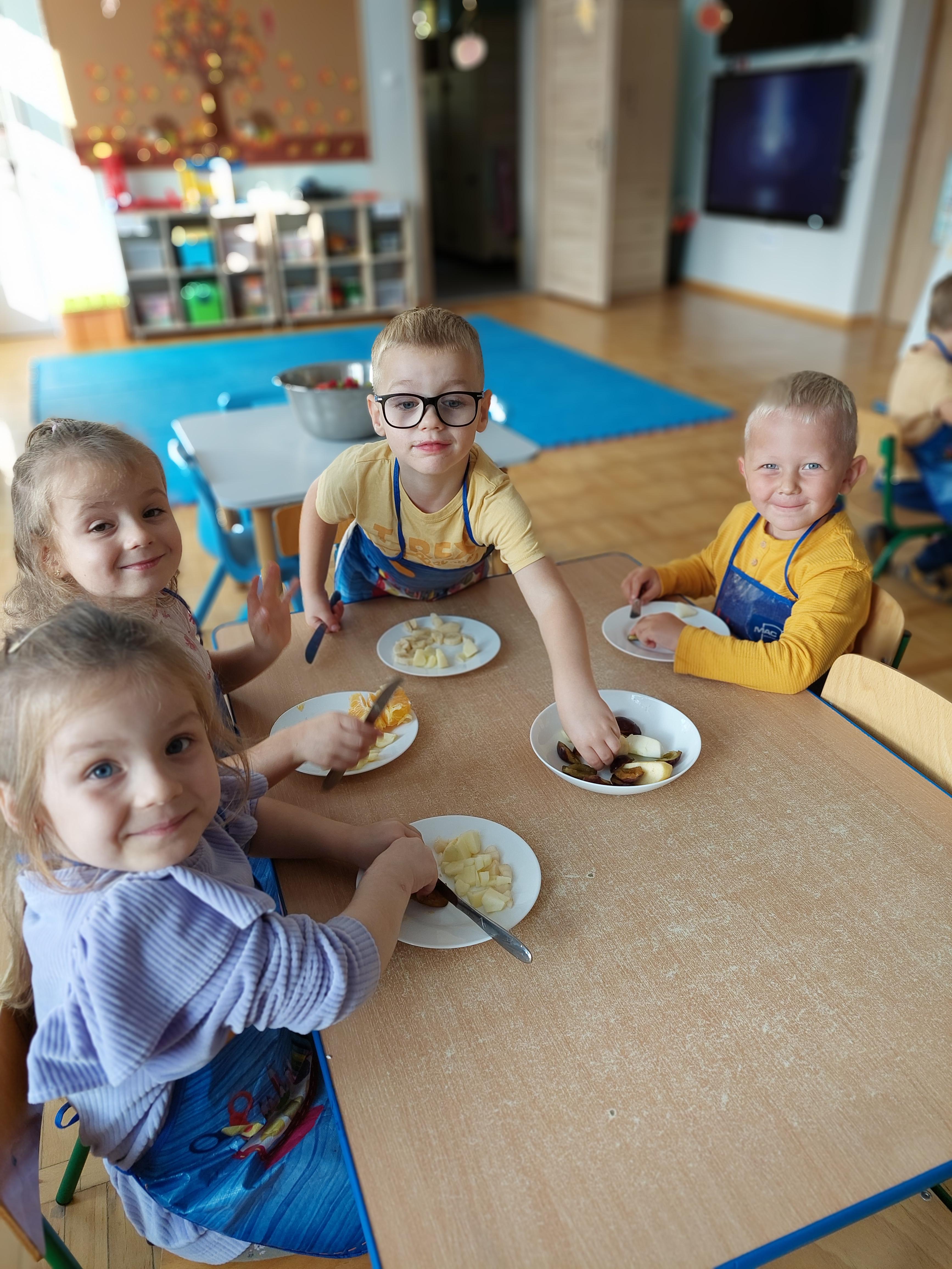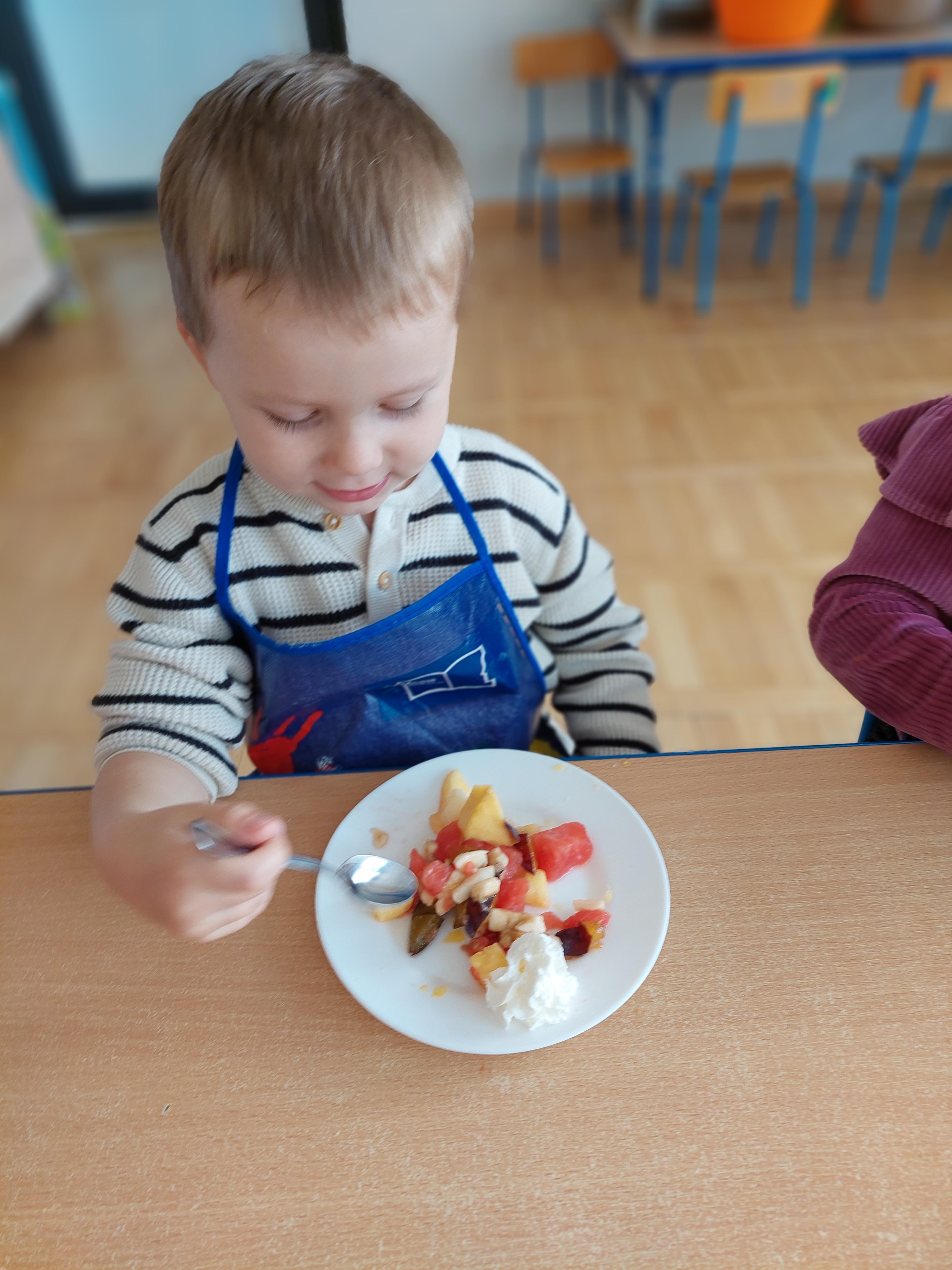 W dniu dzisiejszym dzieci z naszej grupy wspólnie przygotowały pyszną sałatkę owocową. Najpierw umyły ręce i zapoznały się z różnymi owocami, poznając ich kolory, kształty i zapachy. Następnie z pomocą nauczyciela kroiły owoce na małe kawałki i wrzucały je do dużej miski. Na koniec wszystko dokładnie mieszały i spróbowały własnoręcznie przygotowanej sałatki. Zajęcia były świetną okazją do nauki współpracy, rozwijania samodzielności oraz zdrowych nawyków żywieniowych.
