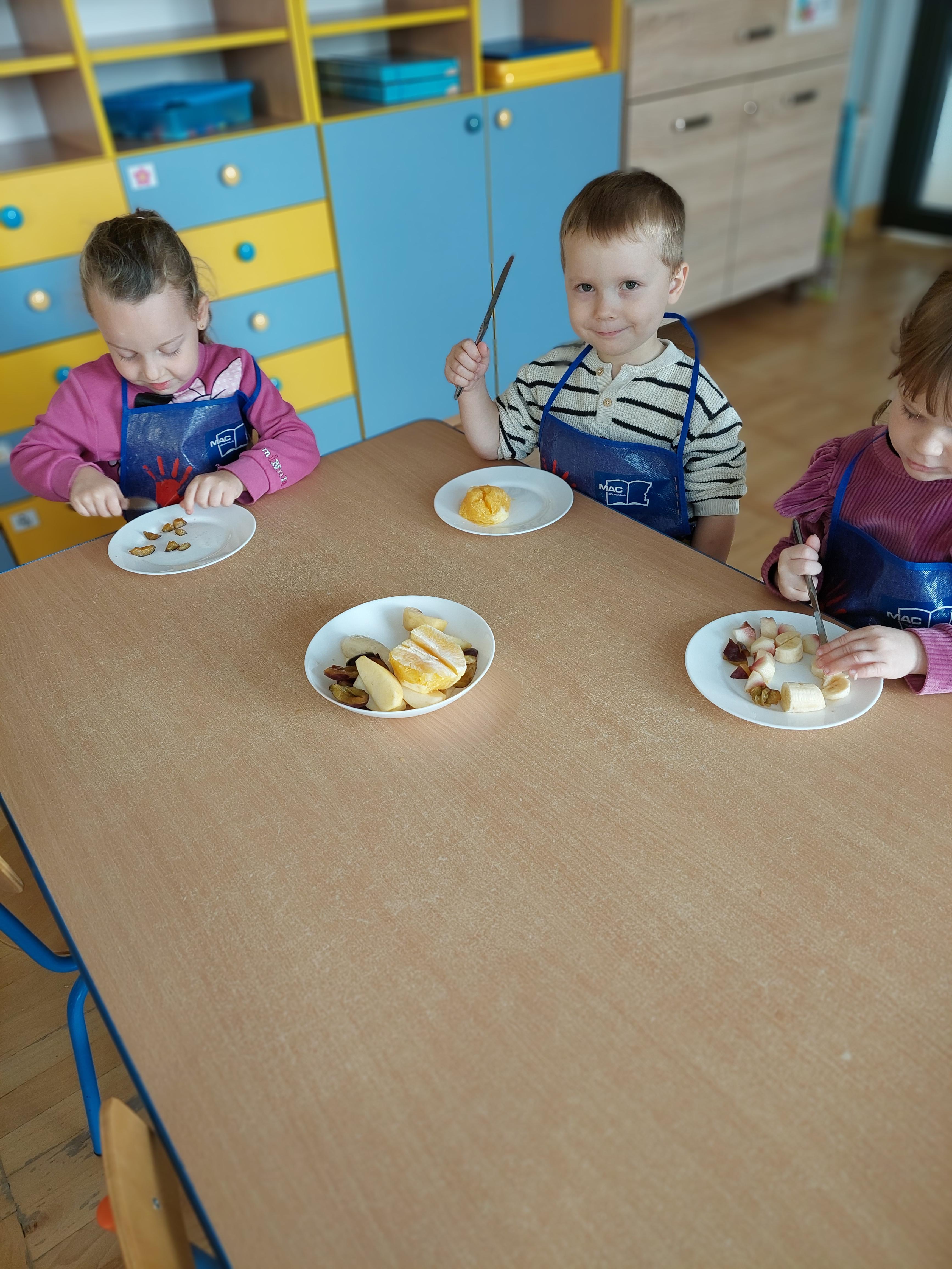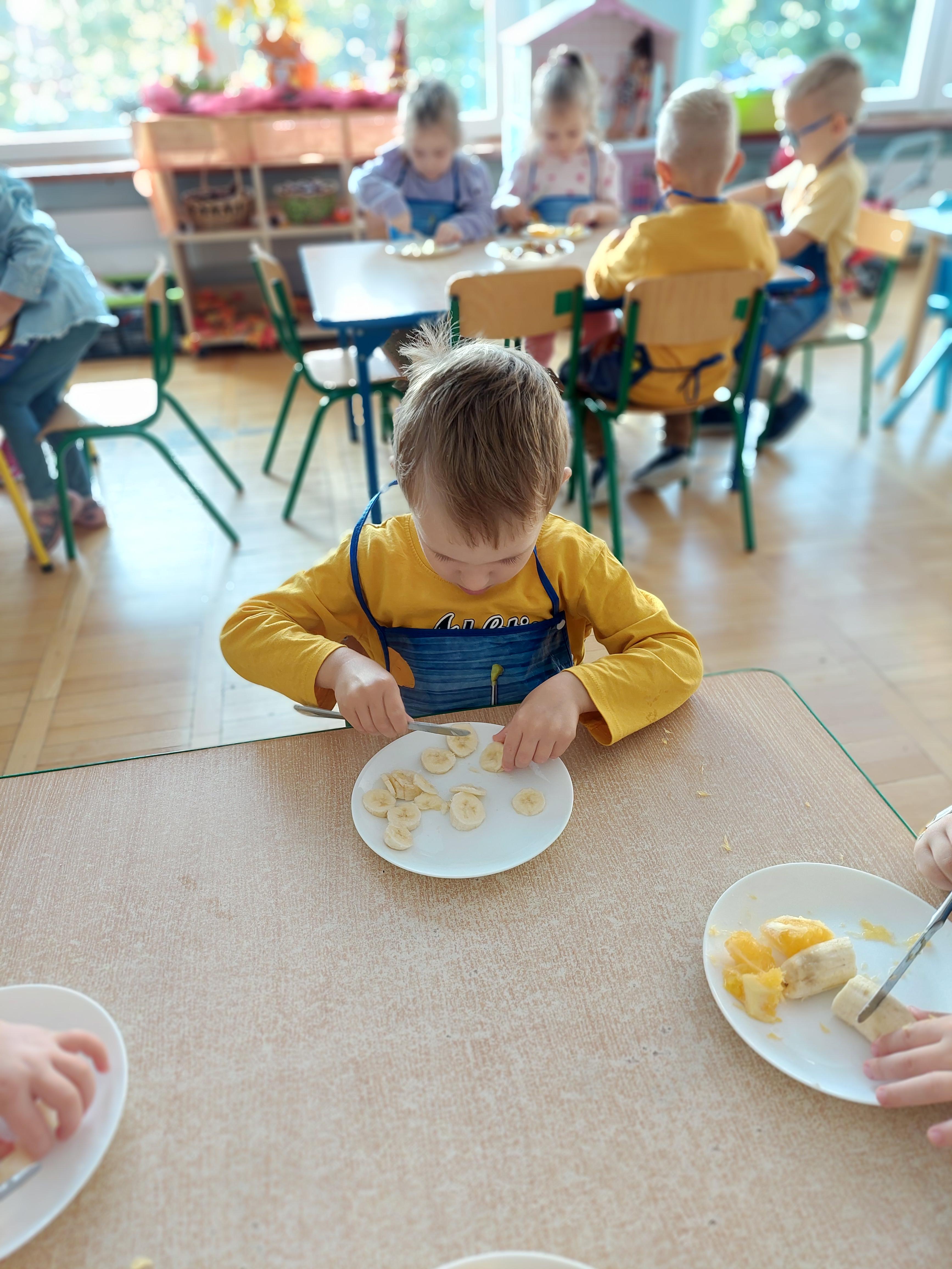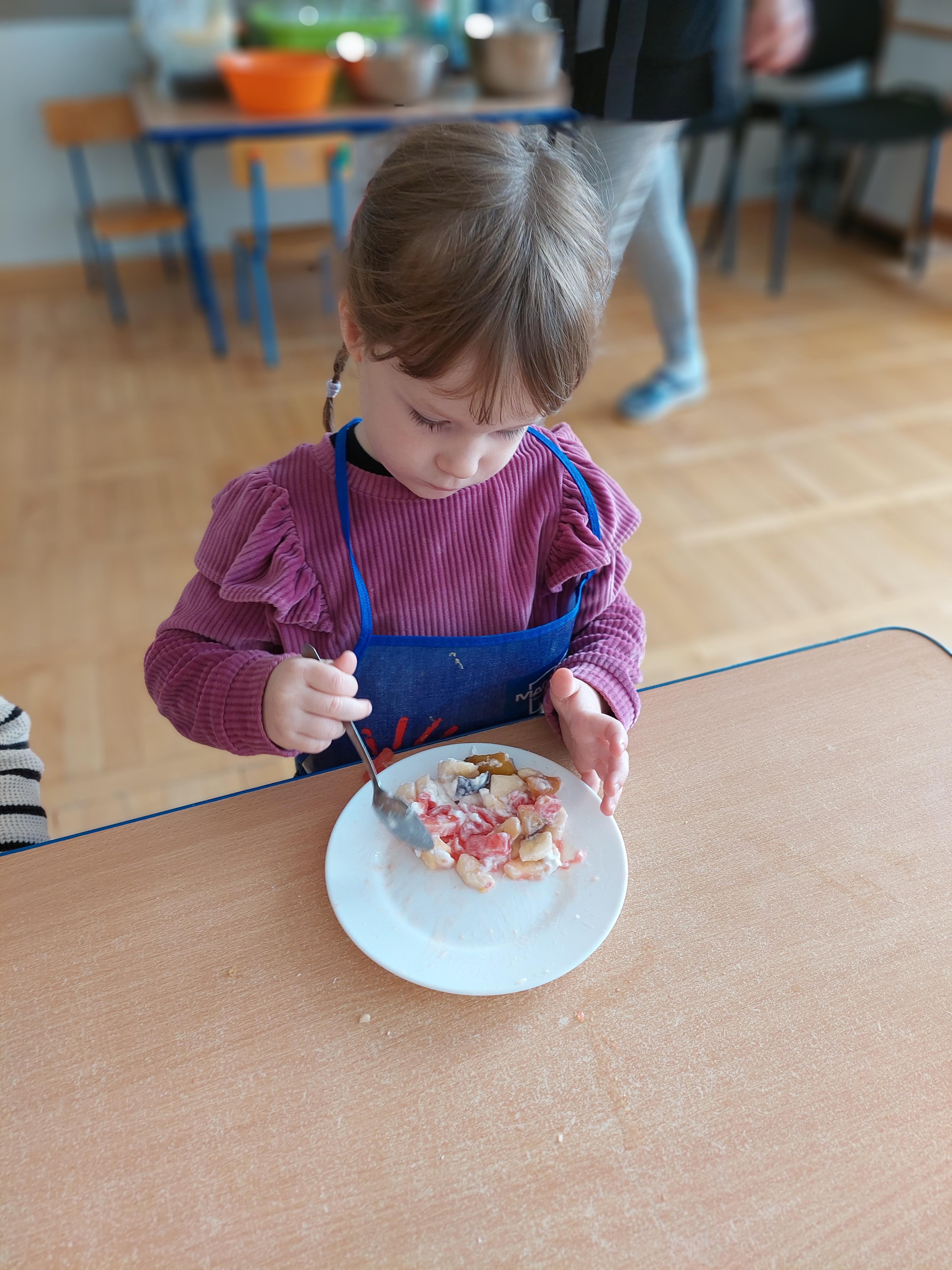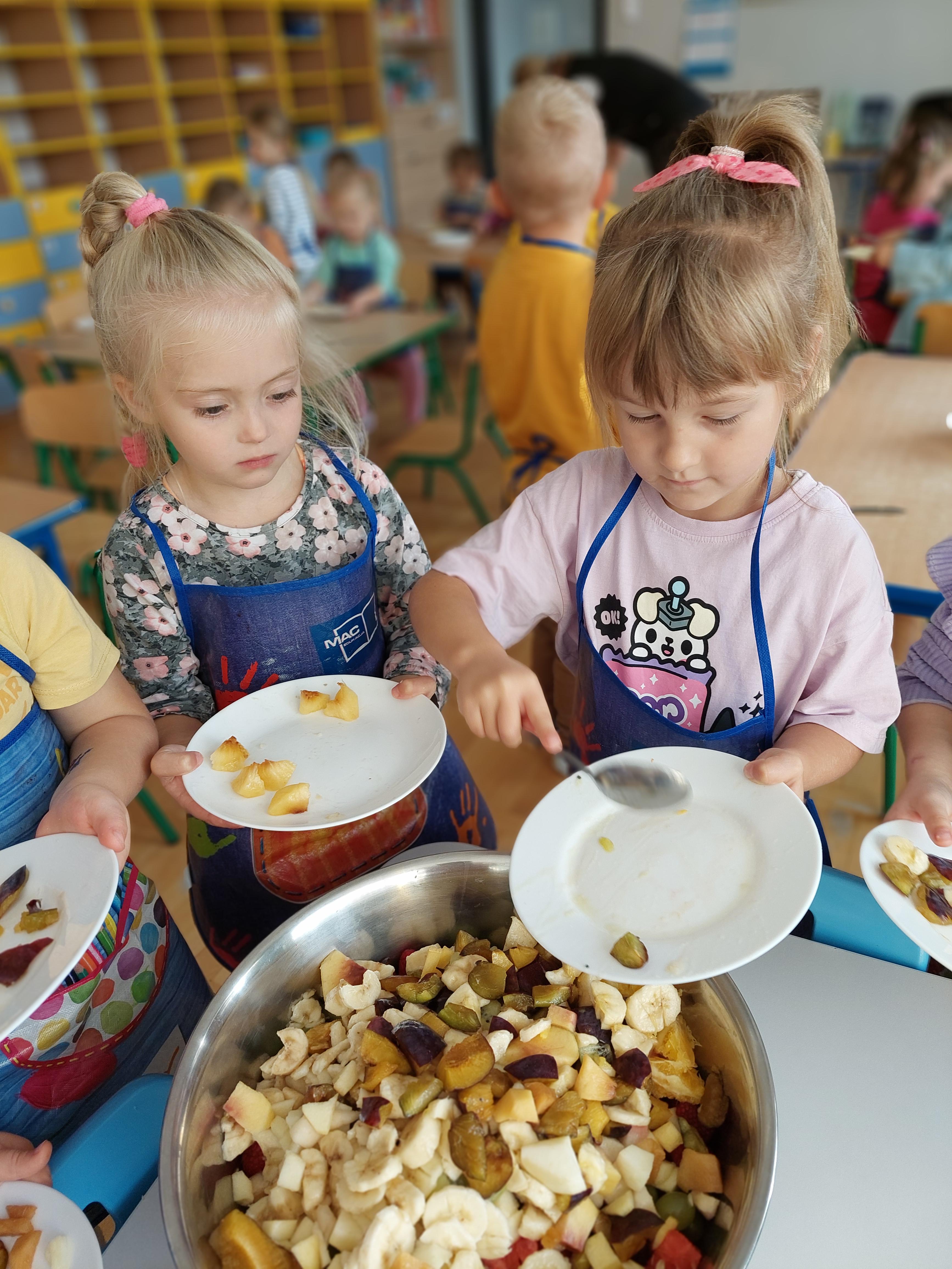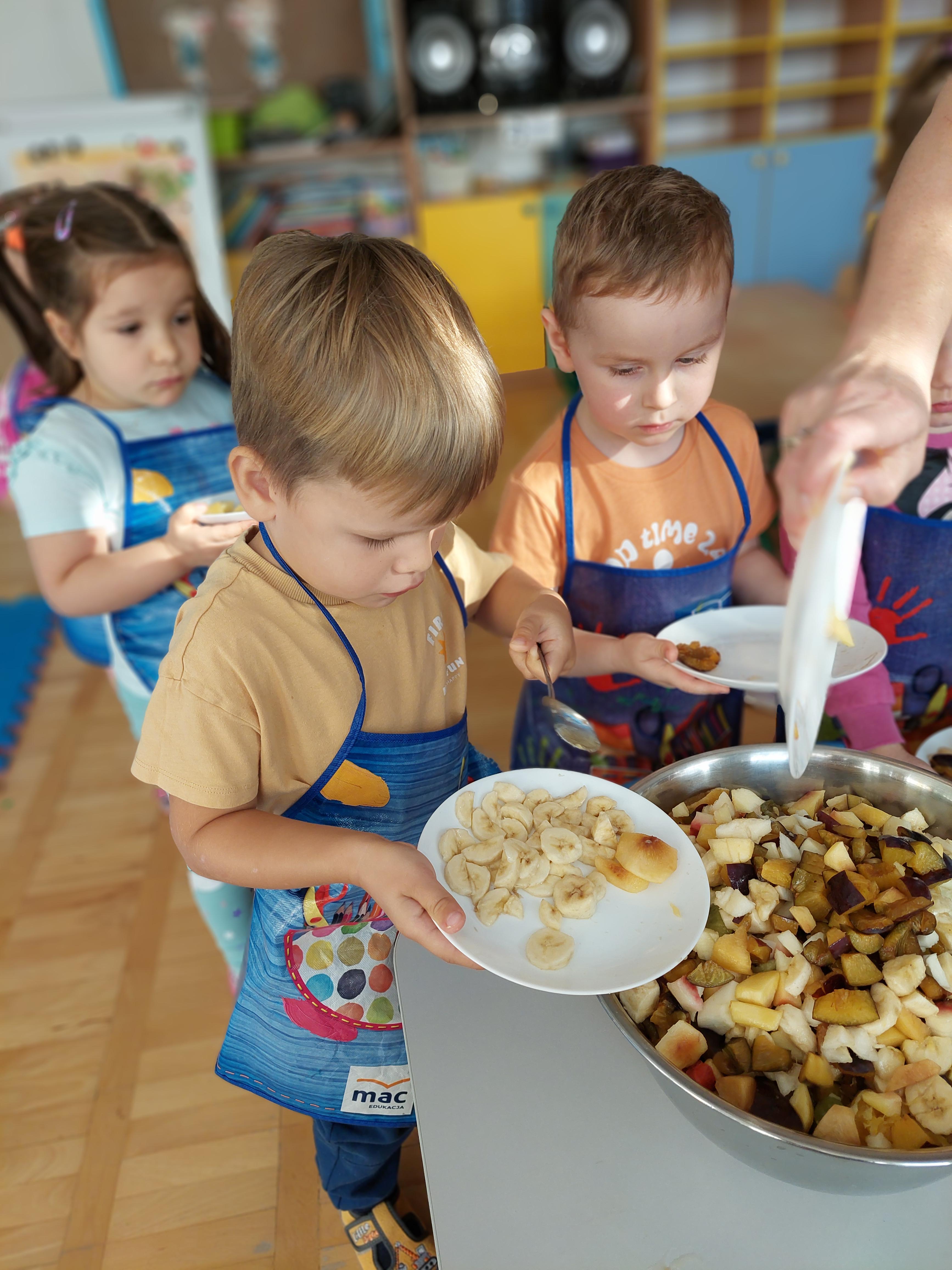 W dniu dzisiejszym dzieci z naszej grupy wspólnie przygotowały pyszną sałatkę owocową. Najpierw umyły ręce i zapoznały się z różnymi owocami, poznając ich kolory, kształty i zapachy. Następnie z pomocą nauczyciela kroiły owoce na małe kawałki i wrzucały je do dużej miski. Na koniec wszystko dokładnie mieszały i spróbowały własnoręcznie przygotowanej sałatki. Zajęcia były świetną okazją do nauki współpracy, rozwijania samodzielności oraz zdrowych nawyków żywieniowych.