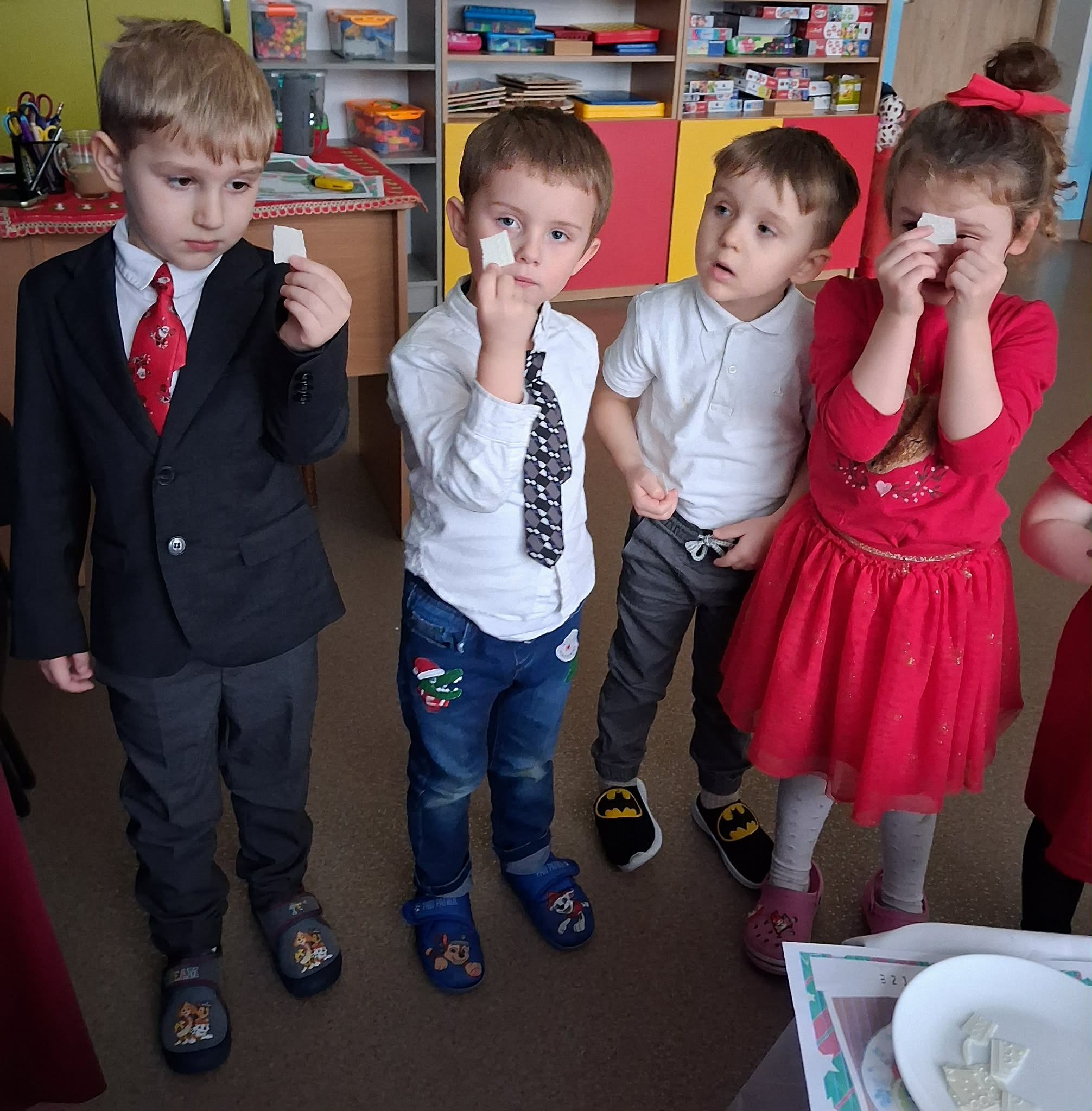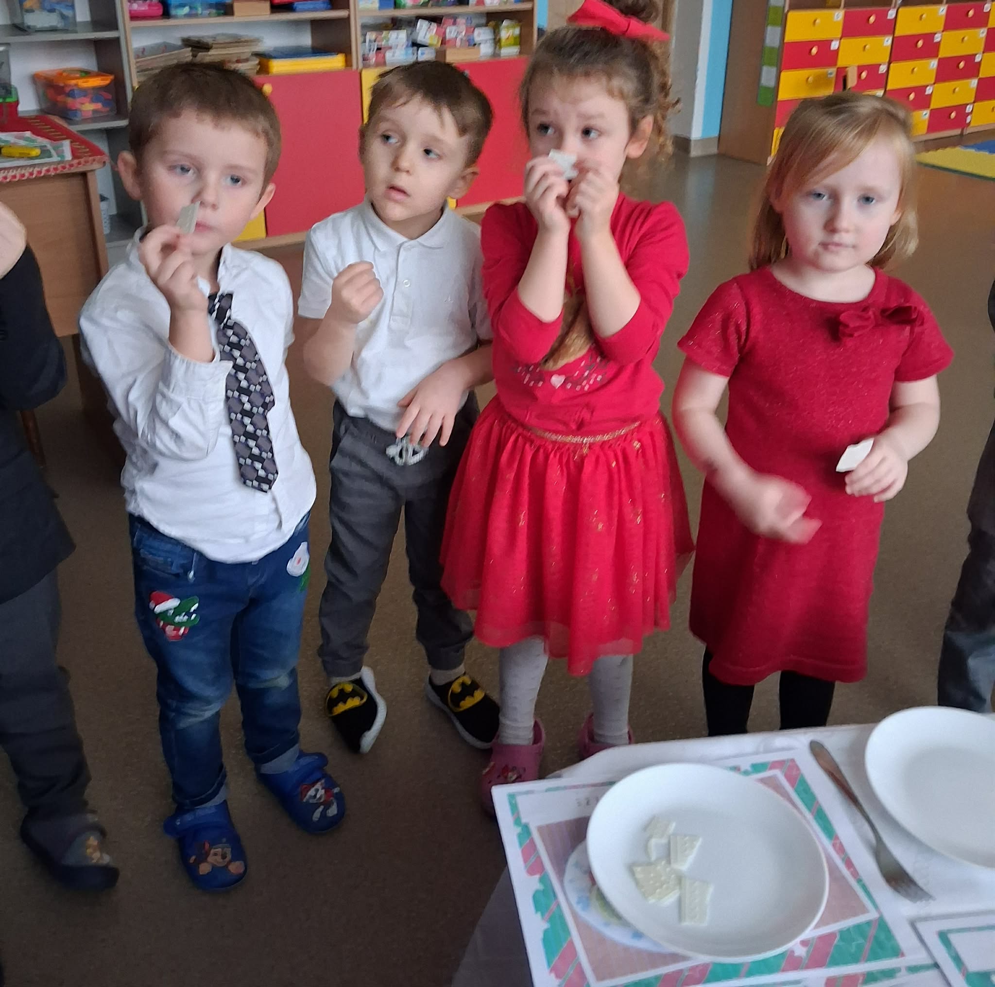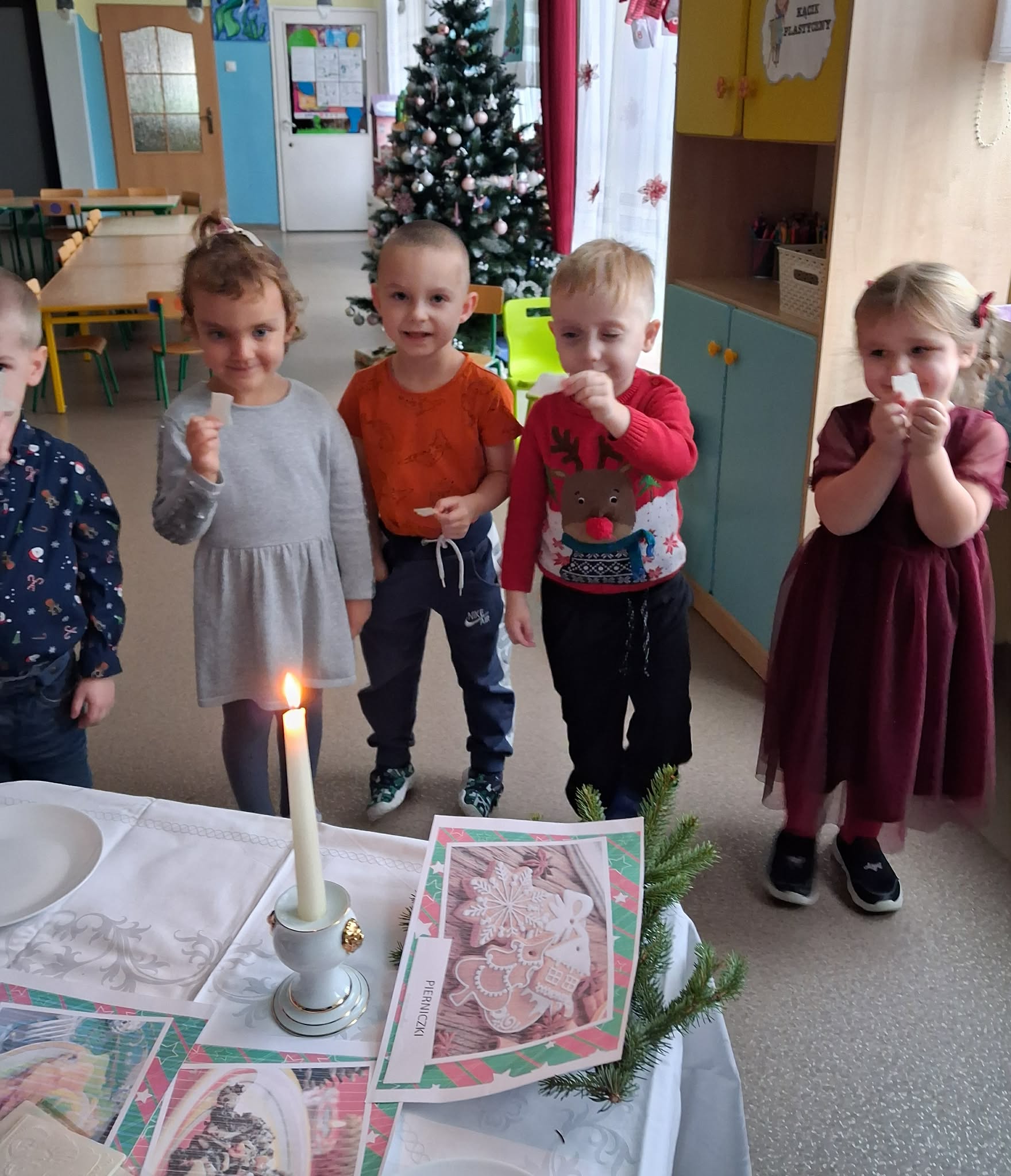Dzisiejszy dzień dla dzieci był wyjątkowy. Poznały bożonarodzeniowe tradycje począwszy od przygotowania domów, udekorowania ich błyszczącymi ozdobami gwiazdek, bombek, kokard, a przede wszystkim ubraniem drzewka iglastego przemieniając je w choinkę. Dowiedziały się, jakie potrawy stanowią podstawę wigilijnej wieczerzy, a także dowiedziały się o zwyczaju przygotowania dodatkowego nakrycia na świątecznym stole dla niespodziewanego gościa. W odświętnych ubrankach dzieci I panie złożyły sobie życzenia i połamali się opłatkiem.