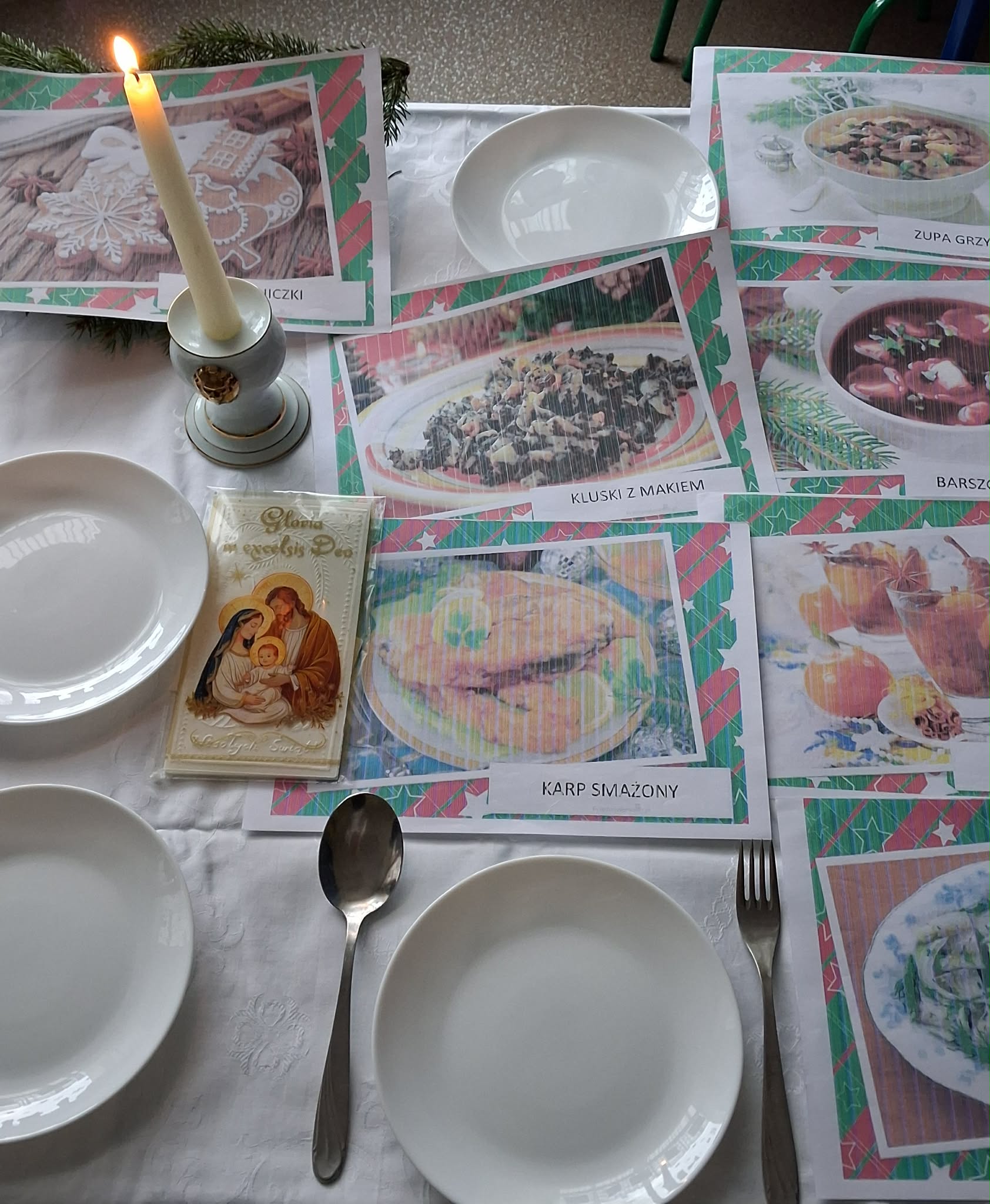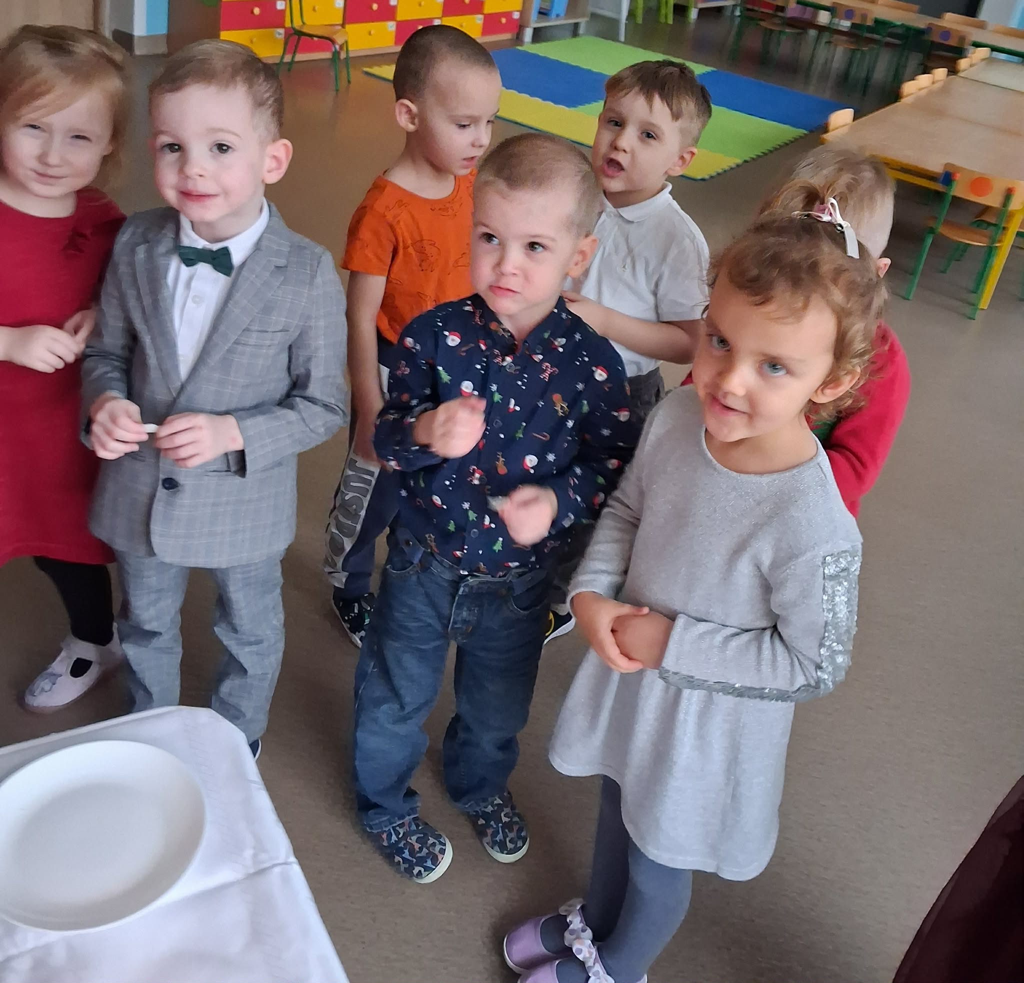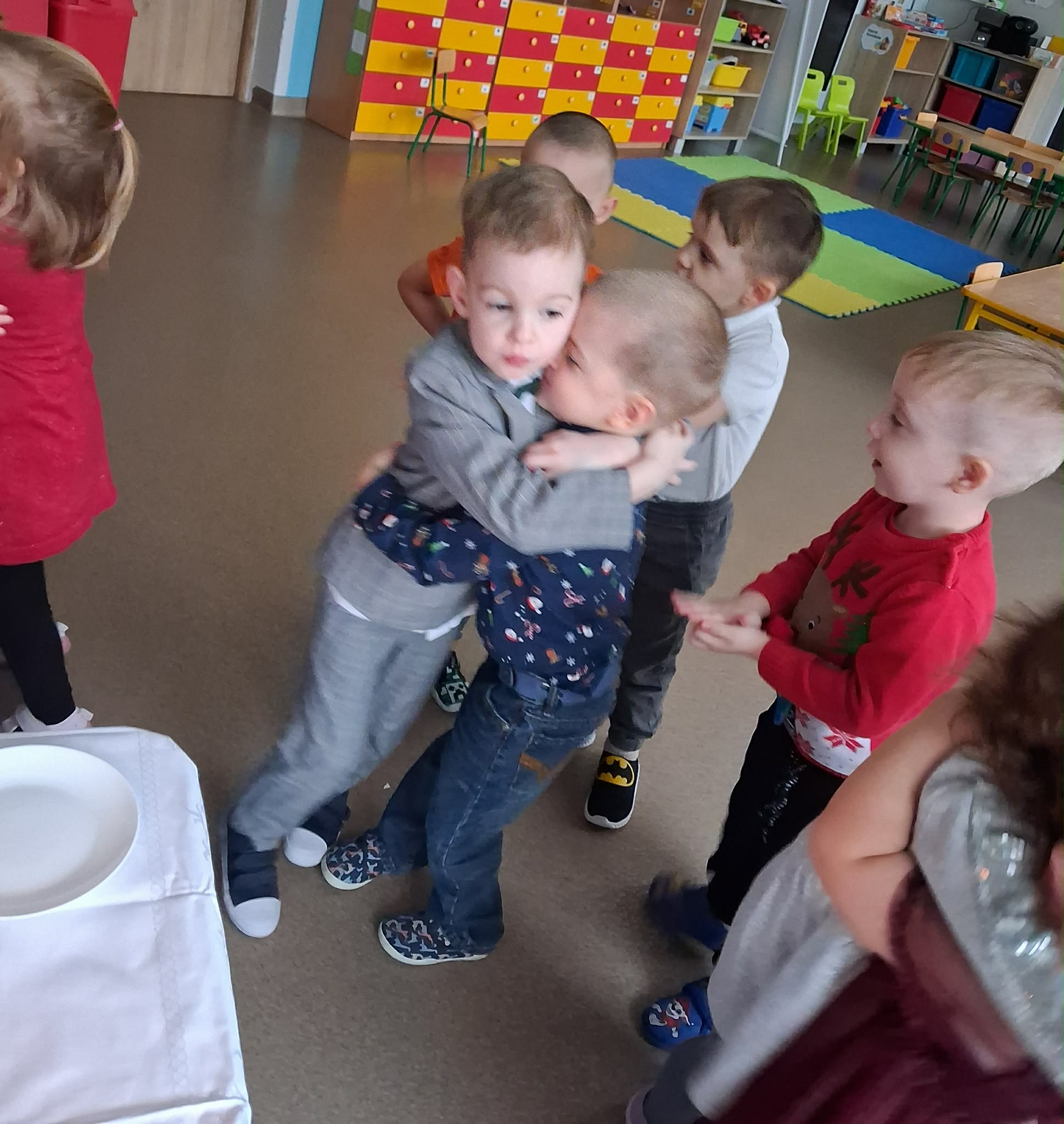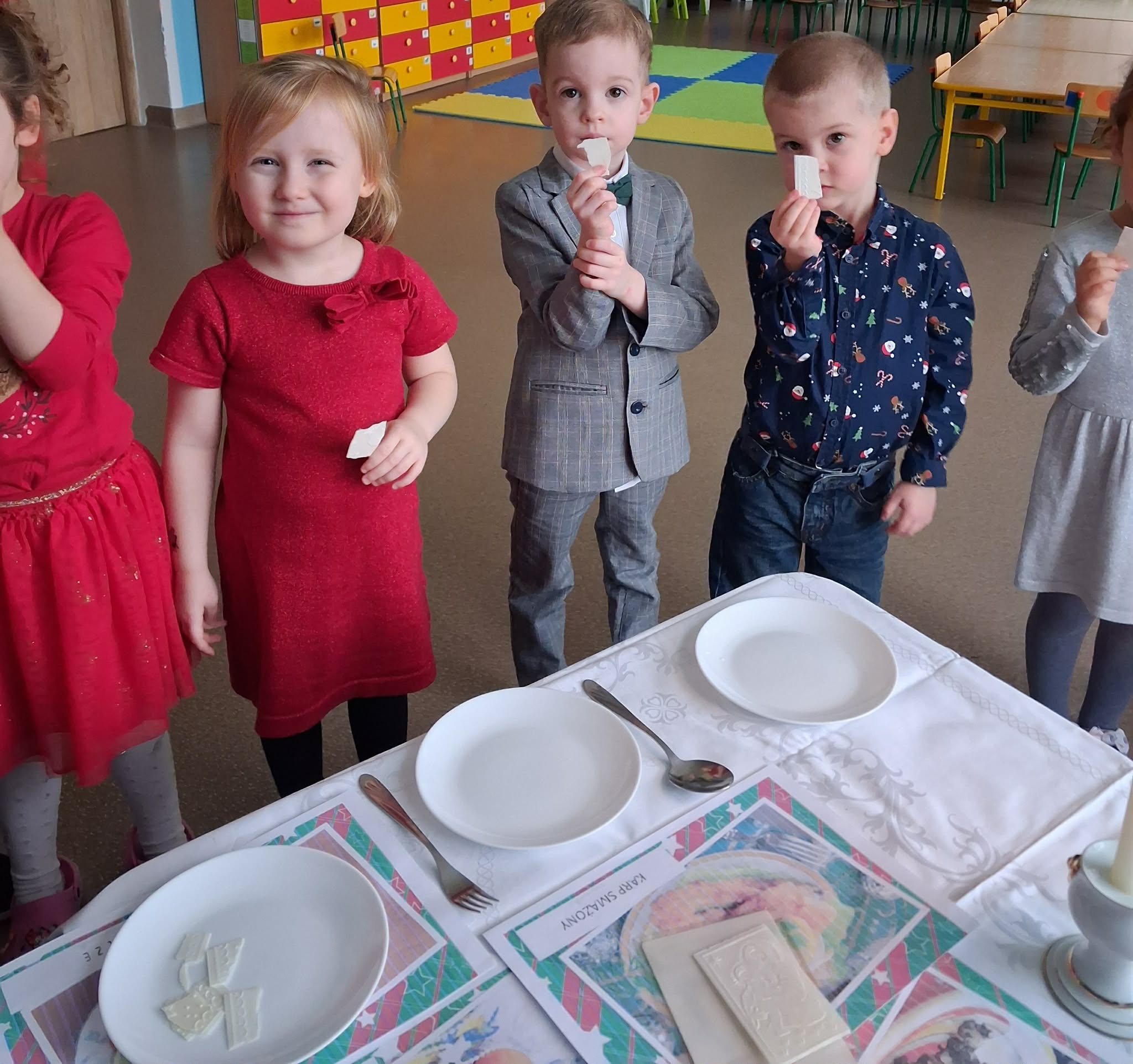 Dzisiejszy dzień dla dzieci był wyjątkowy. Poznały bożonarodzeniowe tradycje począwszy od przygotowania domów, udekorowania ich błyszczącymi ozdobami gwiazdek, bombek, kokard, a przede wszystkim ubraniem drzewka iglastego przemieniając je w choinkę. Dowiedziały się, jakie potrawy stanowią podstawę wigilijnej wieczerzy, a także dowiedziały się o zwyczaju przygotowania dodatkowego nakrycia na świątecznym stole dla niespodziewanego gościa. W odświętnych ubrankach dzieci I panie złożyły sobie życzenia i połamali się opłatkiem.