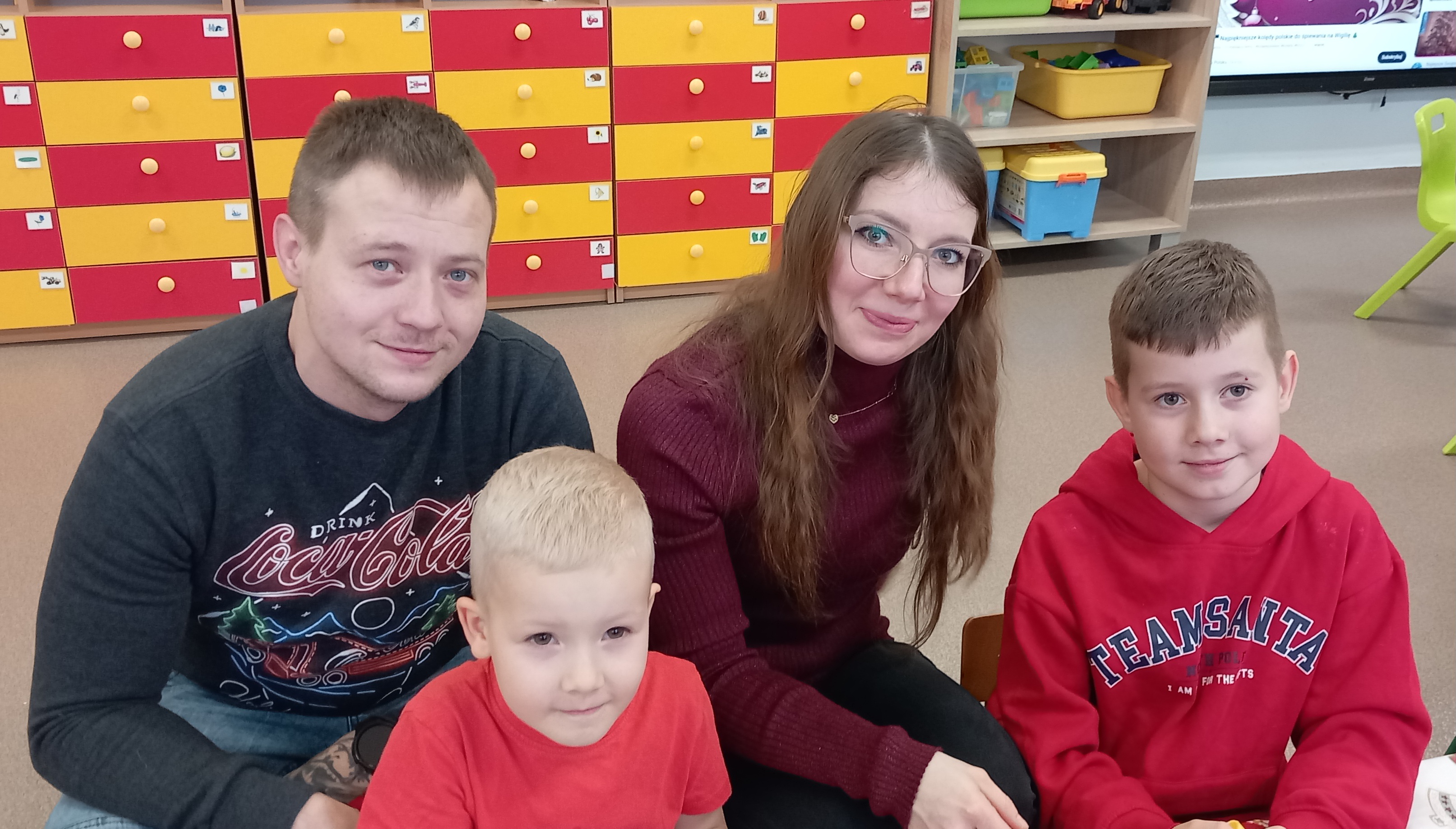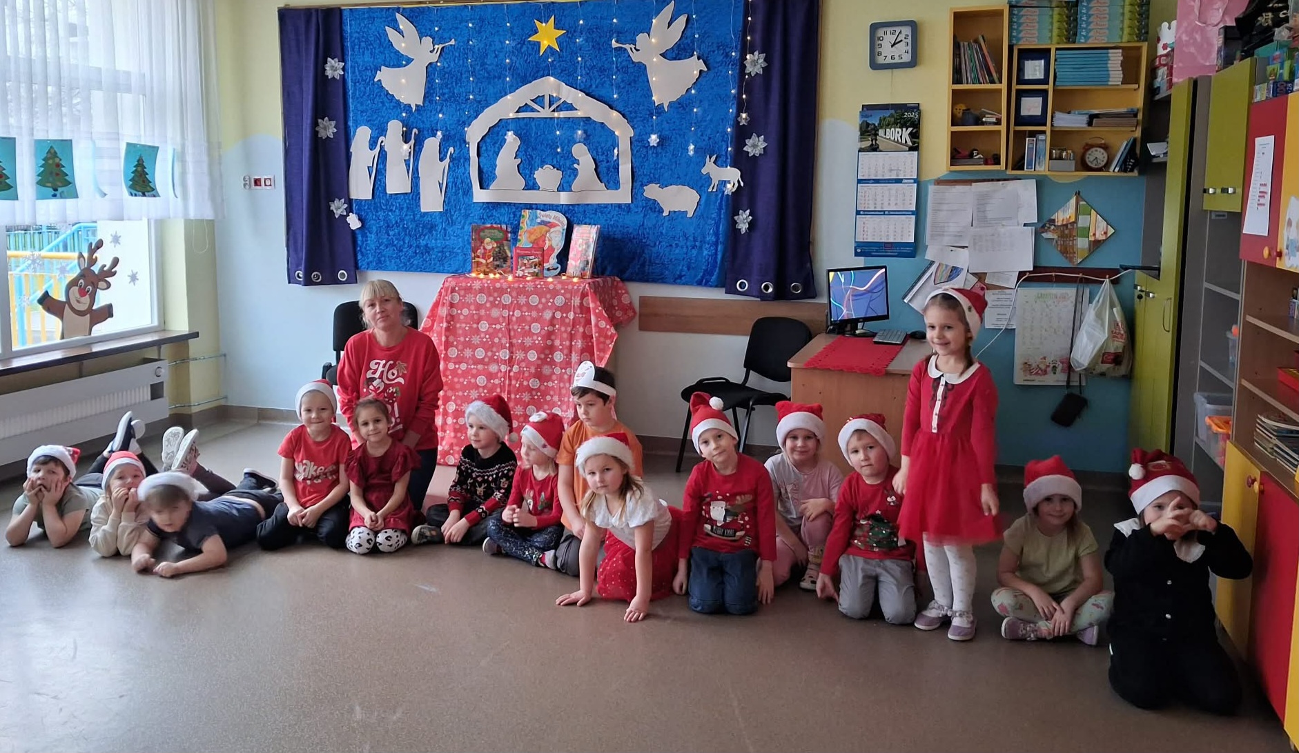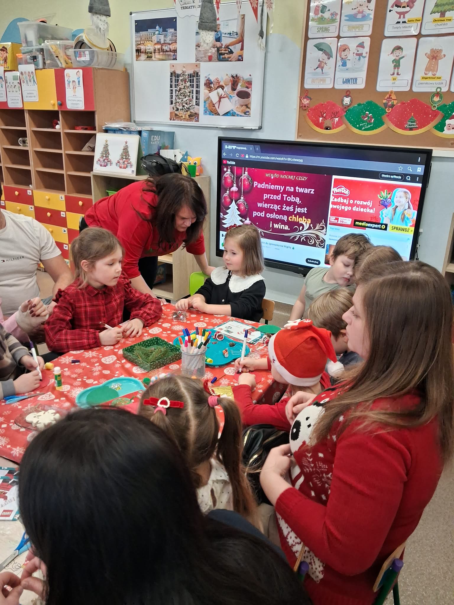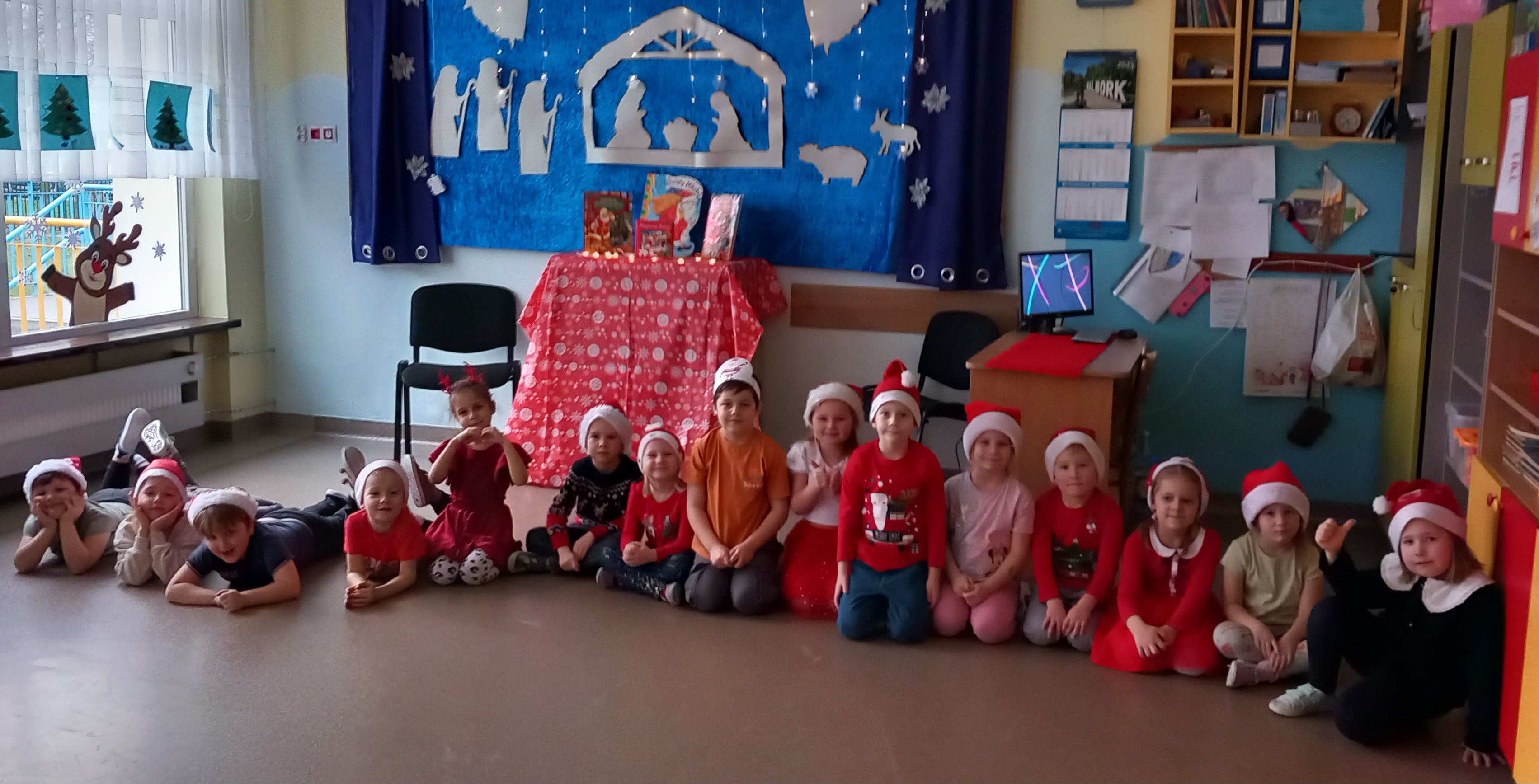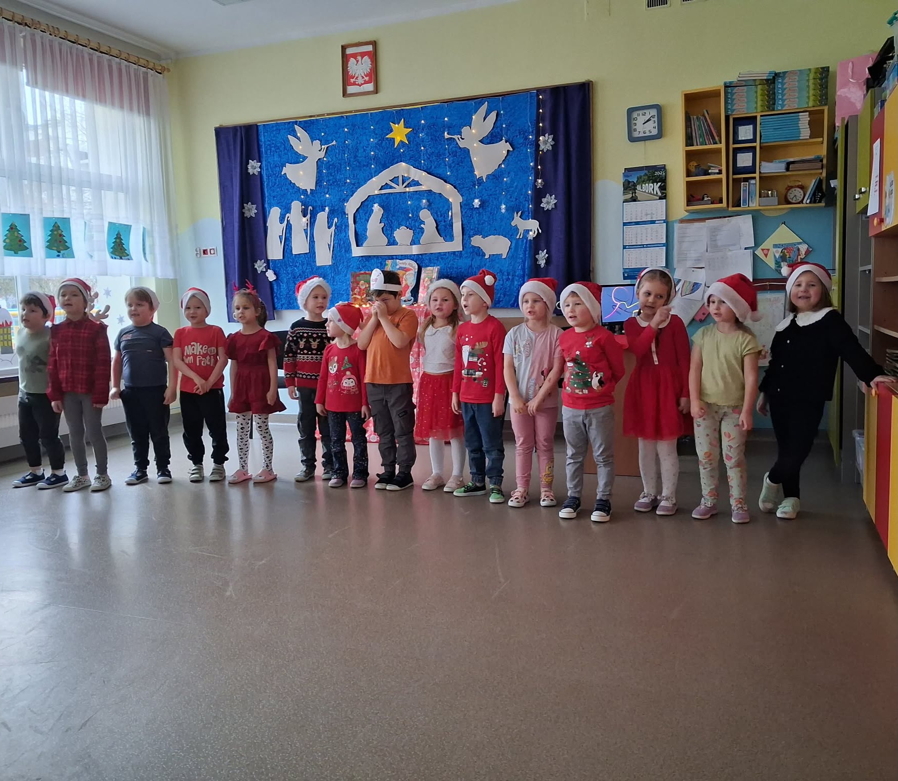 Dzieci przygotowały dla rodziców krótki występ artystyczny: Piosenkę o Świętym Mikołaju, piosenkę w języku angielskim pt.,, Santa Claus", wiersz pt.,,Wigilia" oraz wspólnie zaśpiewały z rodzicami kolędę.