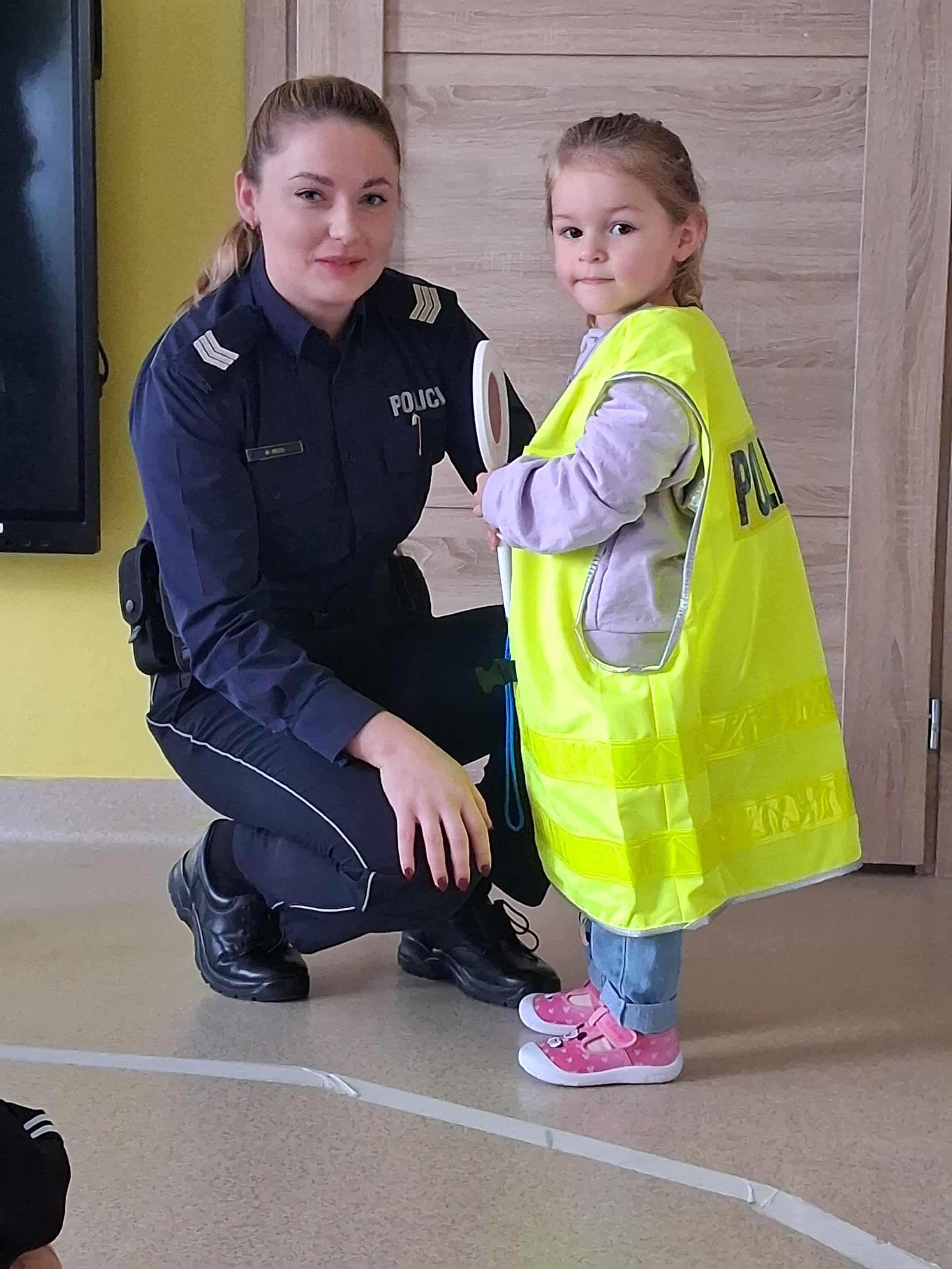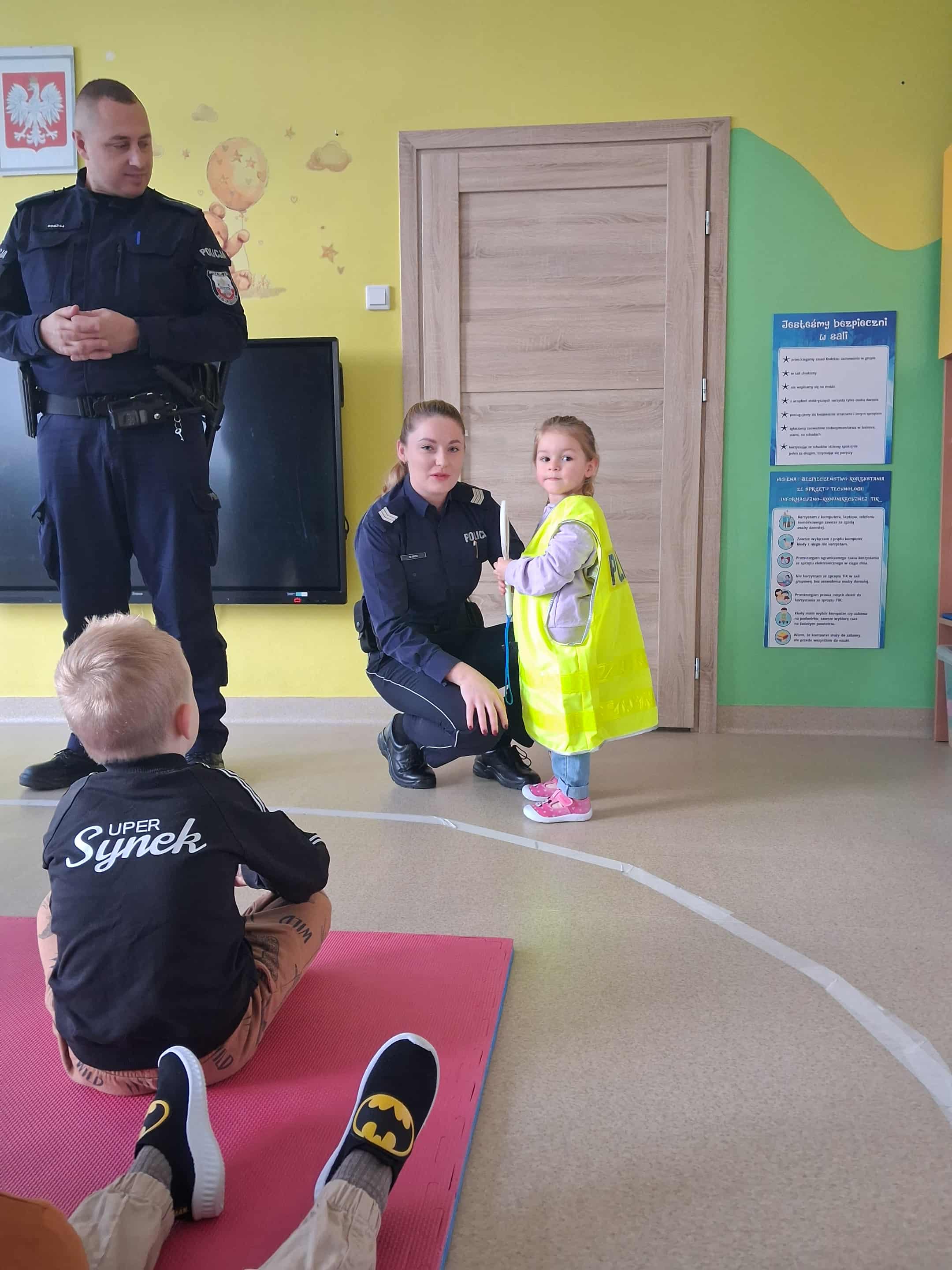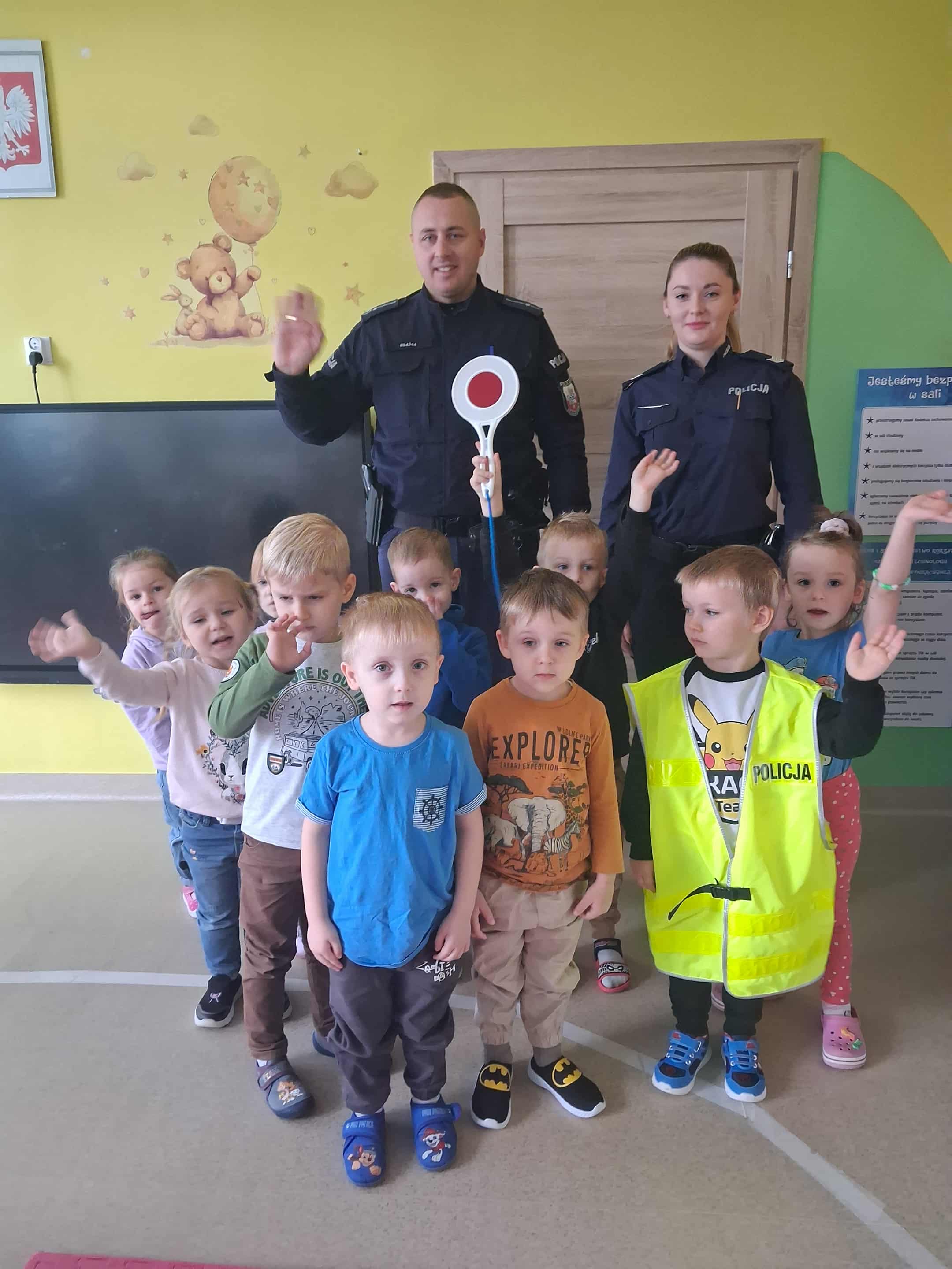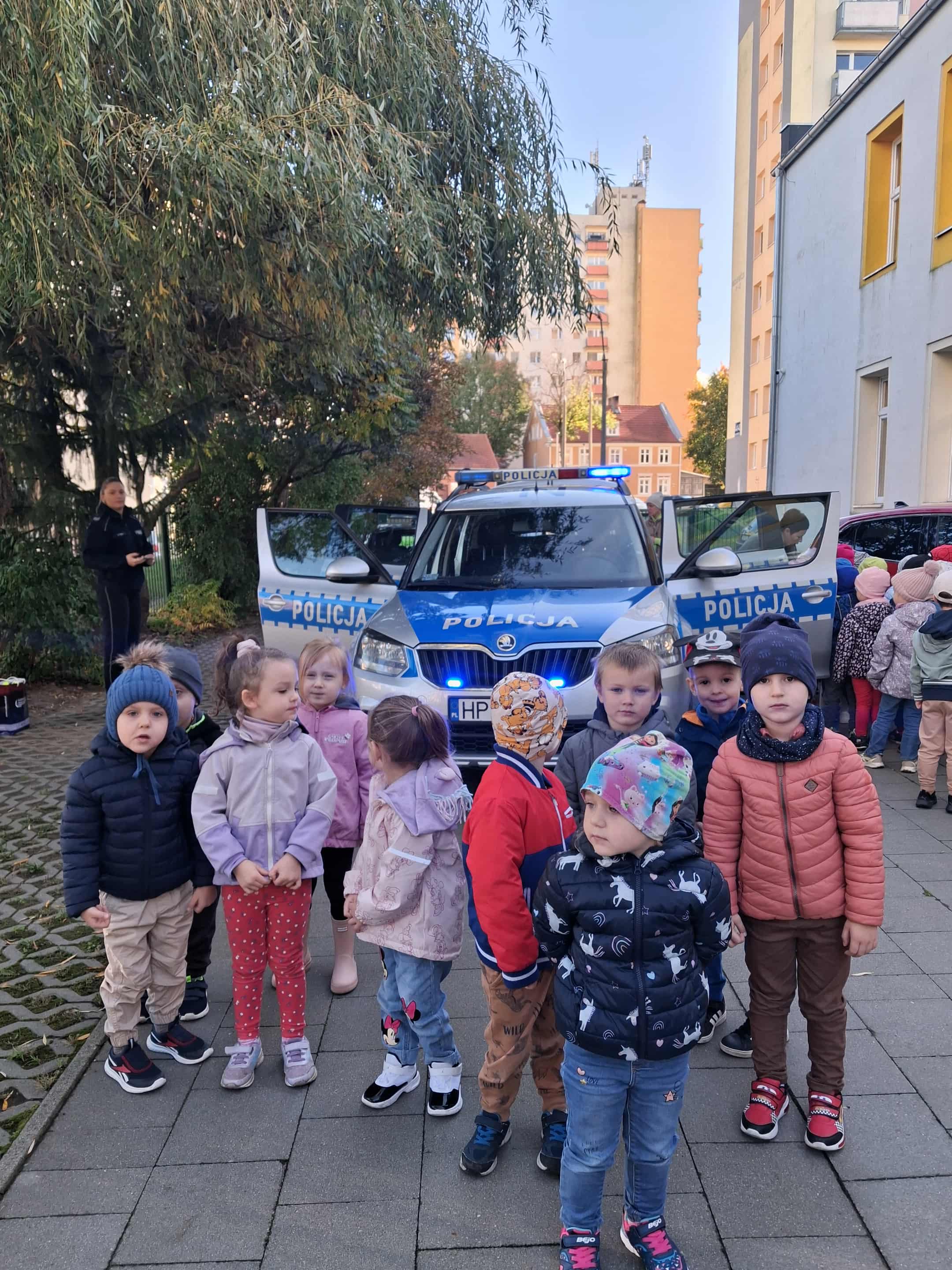 W dniu dzisiejszym przedszkole odwiedzili malborscy policjanci. Przypomnieli dzieciom jak bezpiecznie poruszać się pieszo ulicami miasta. Wspólnie z przedszkolakami ustalili, że przejść można w miejscu bezpiecznym, tj. „po zebrze”, ale najpierw trzeba podejść do przejścia, zatrzymać się, rozejrzeć najpierw w lewo, potem w prawo, następnie podnieść rękę i zachowując czujność przejść na drugą stronę jezdni. Dzieci dowiedziały się, że ważnym elementem w zachowaniu bezpieczeństwa jest stosowanie odblasków na odzieży, bucikach lub plecaczku. Oglądały radiowóz policyjny i słuchały sygnału policyjnego. To była miła wizyta. Dziękujemy:)
