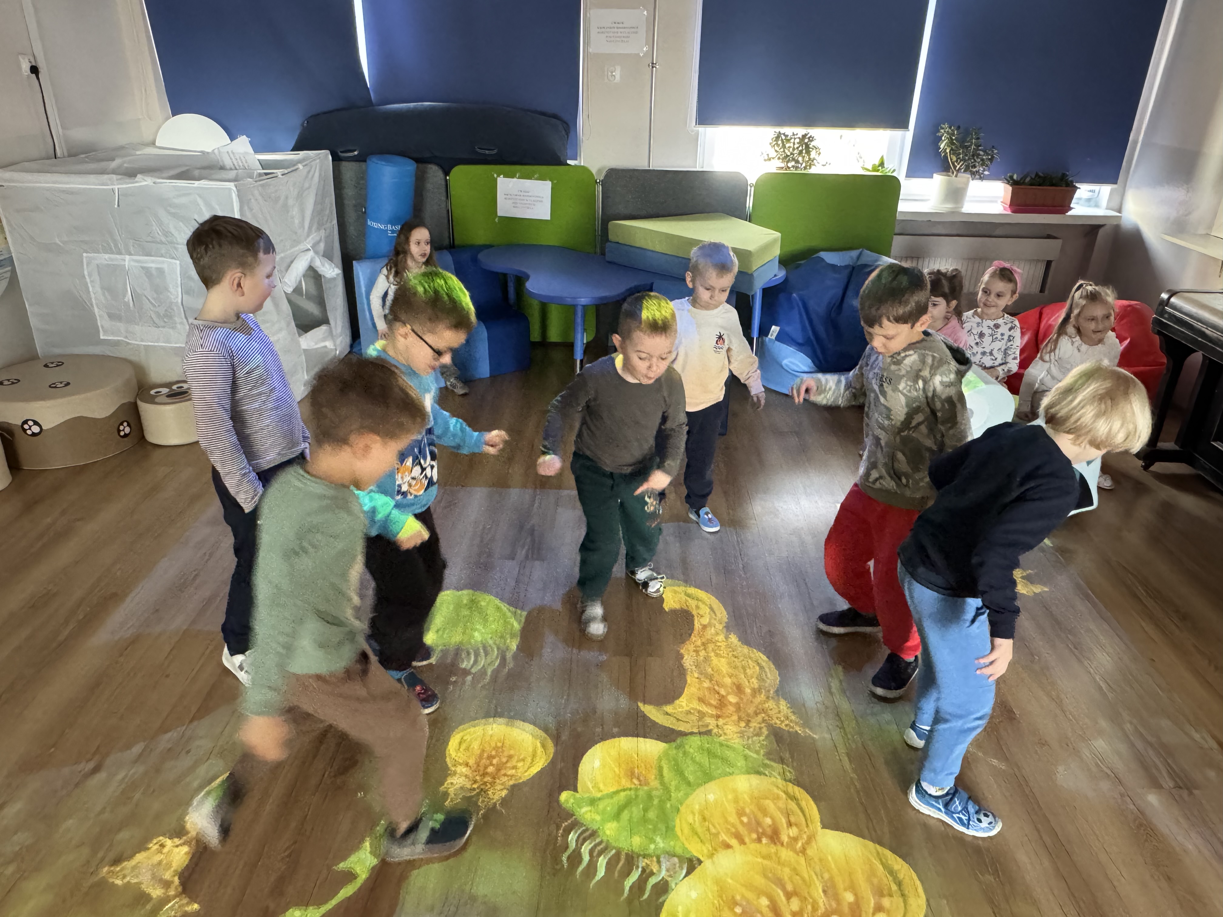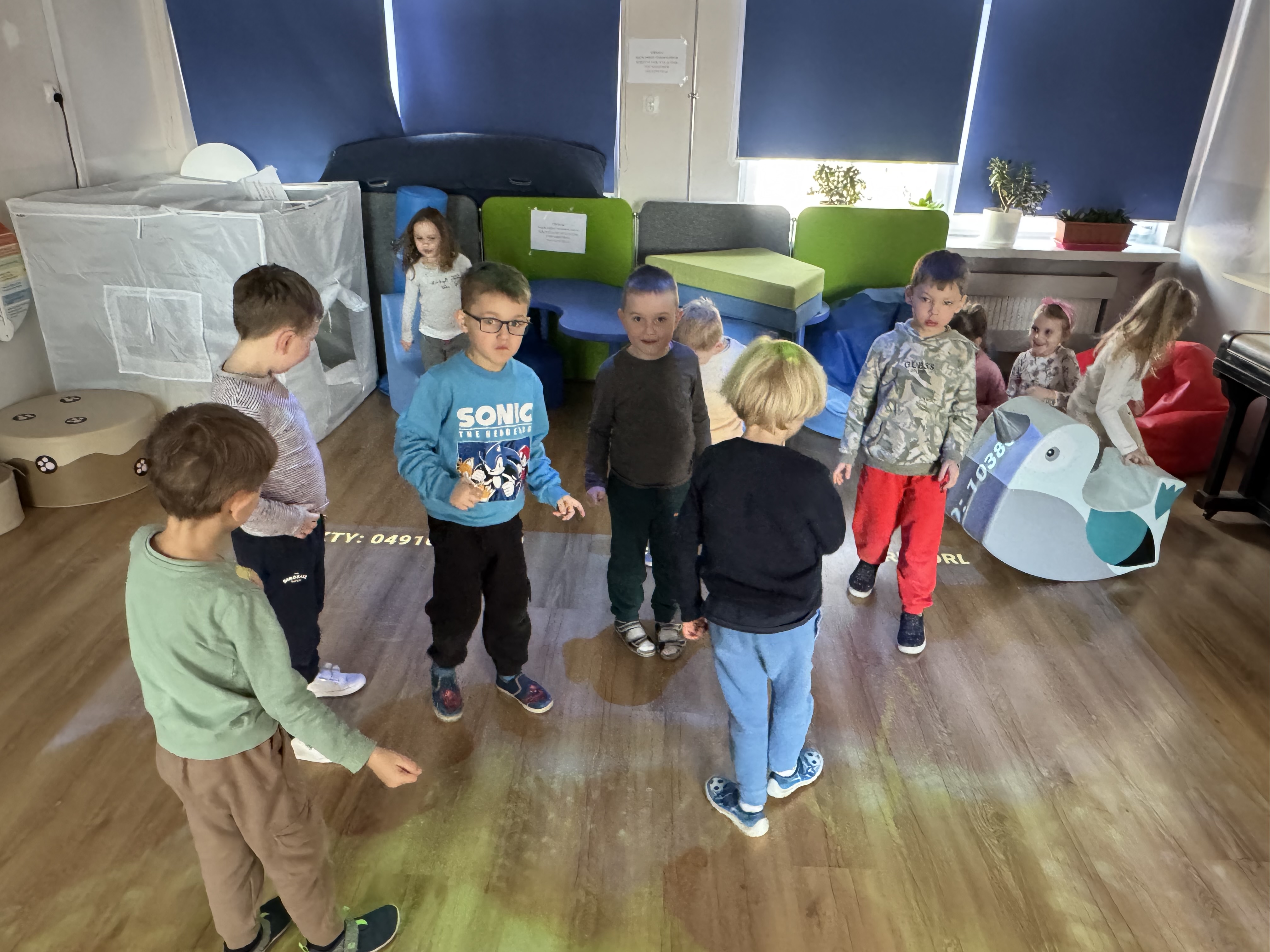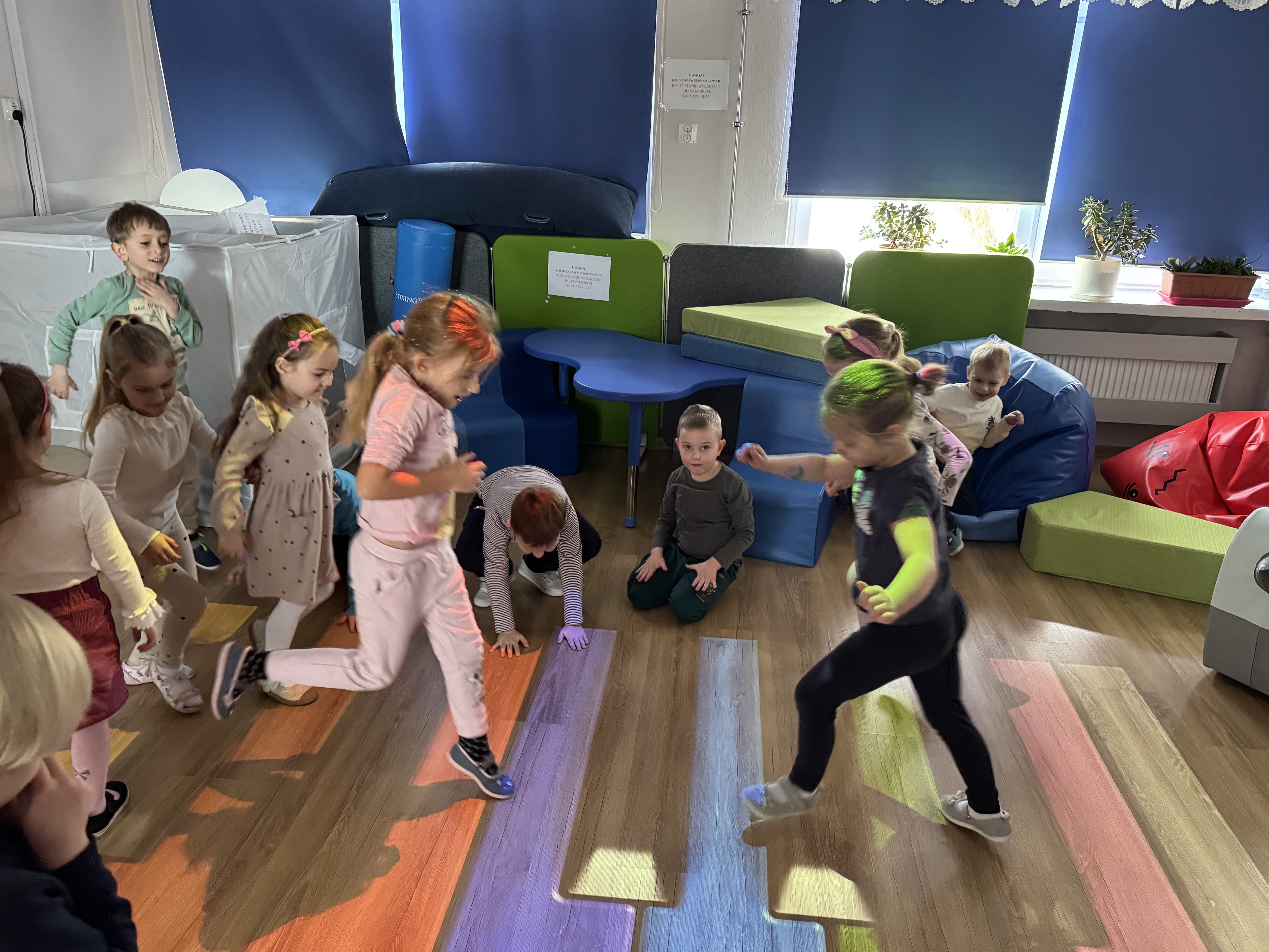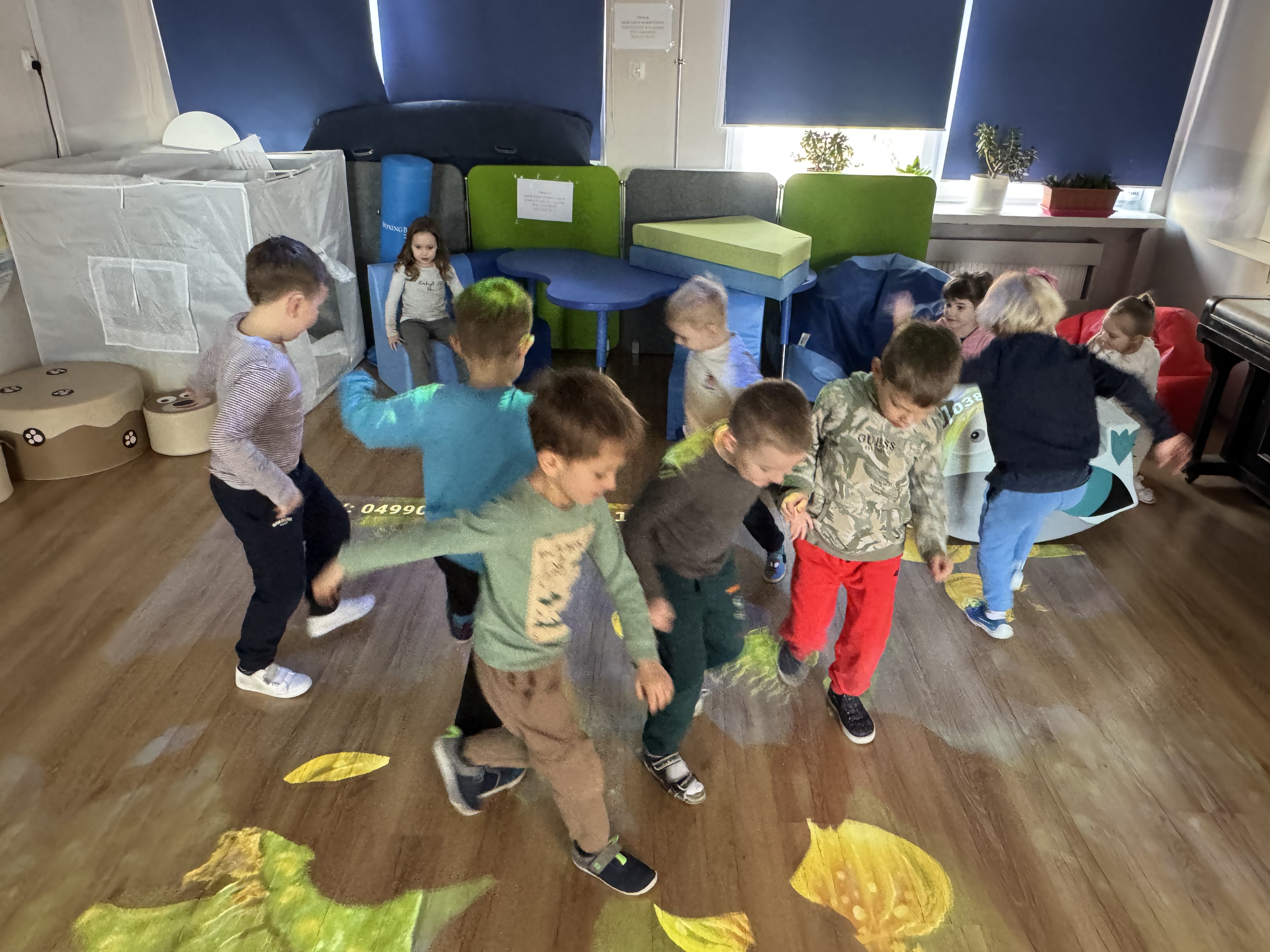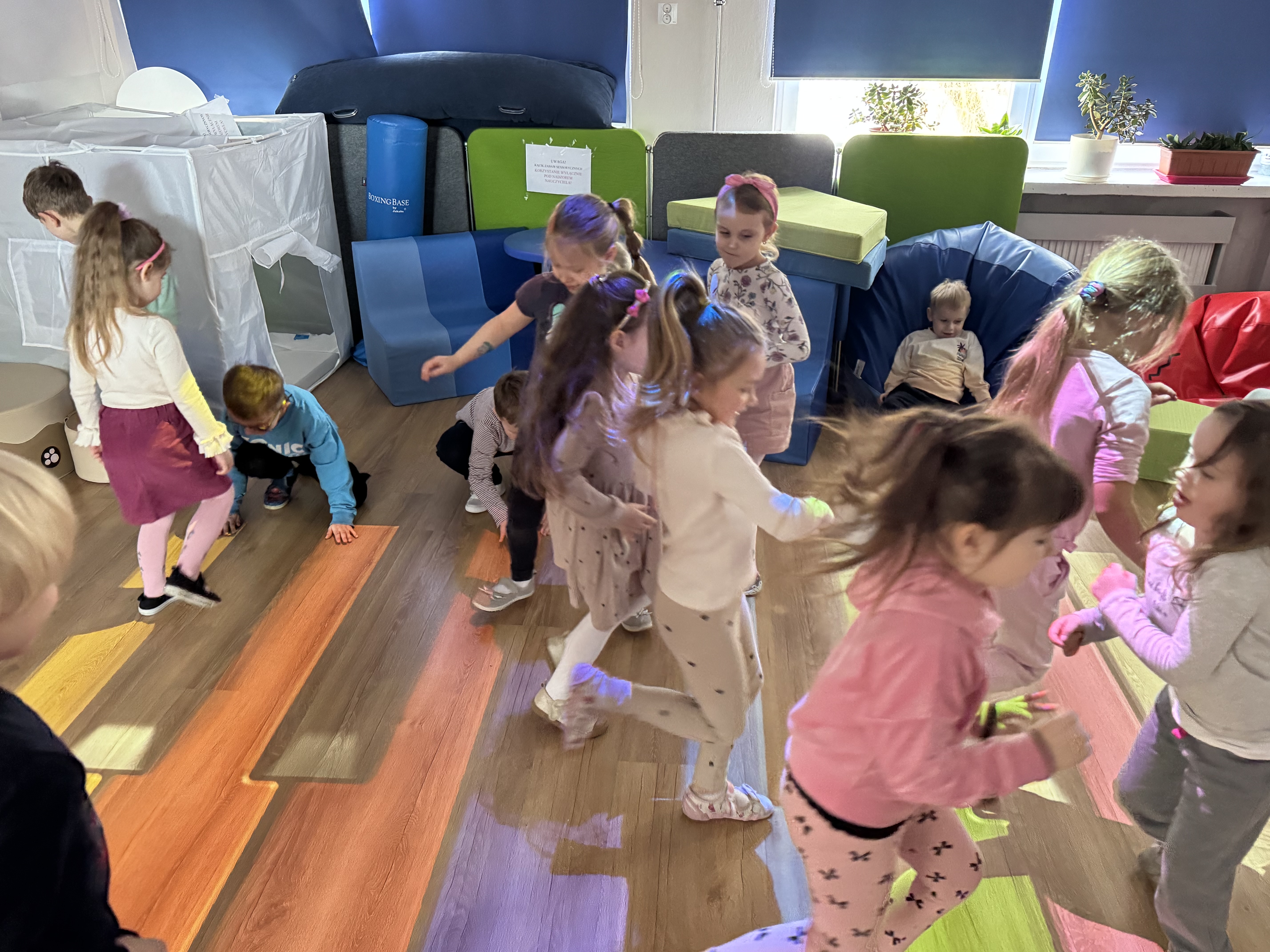 Dziś dzieci bawiły się na magicznym dywanie, korzystając z interaktywnych gier i zabaw ruchowych. Wspólnie spędziły miło czas, ćwicząc refleks i współpracę w grupie.